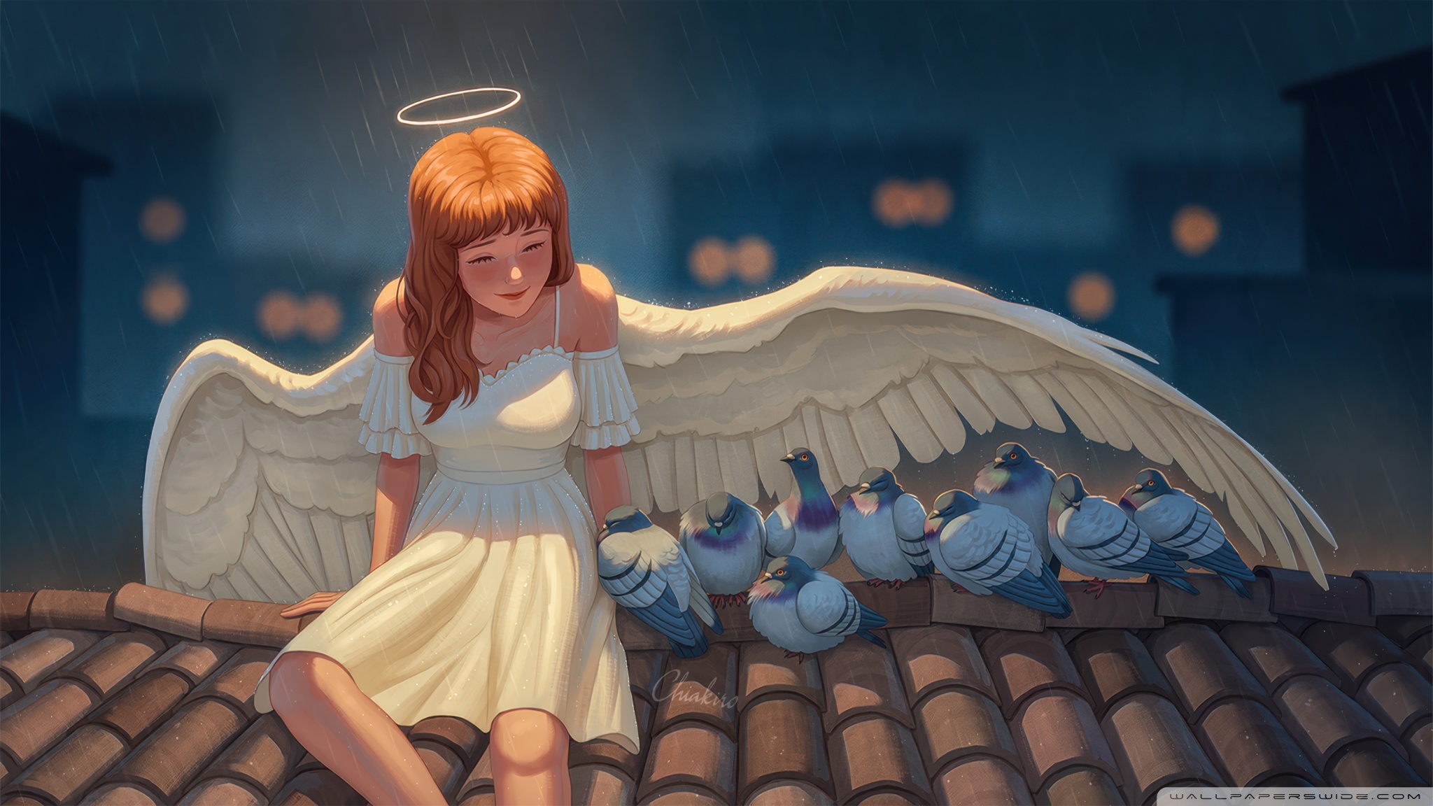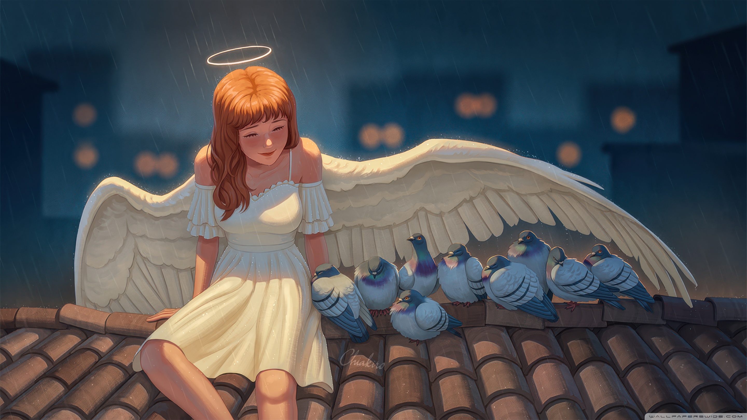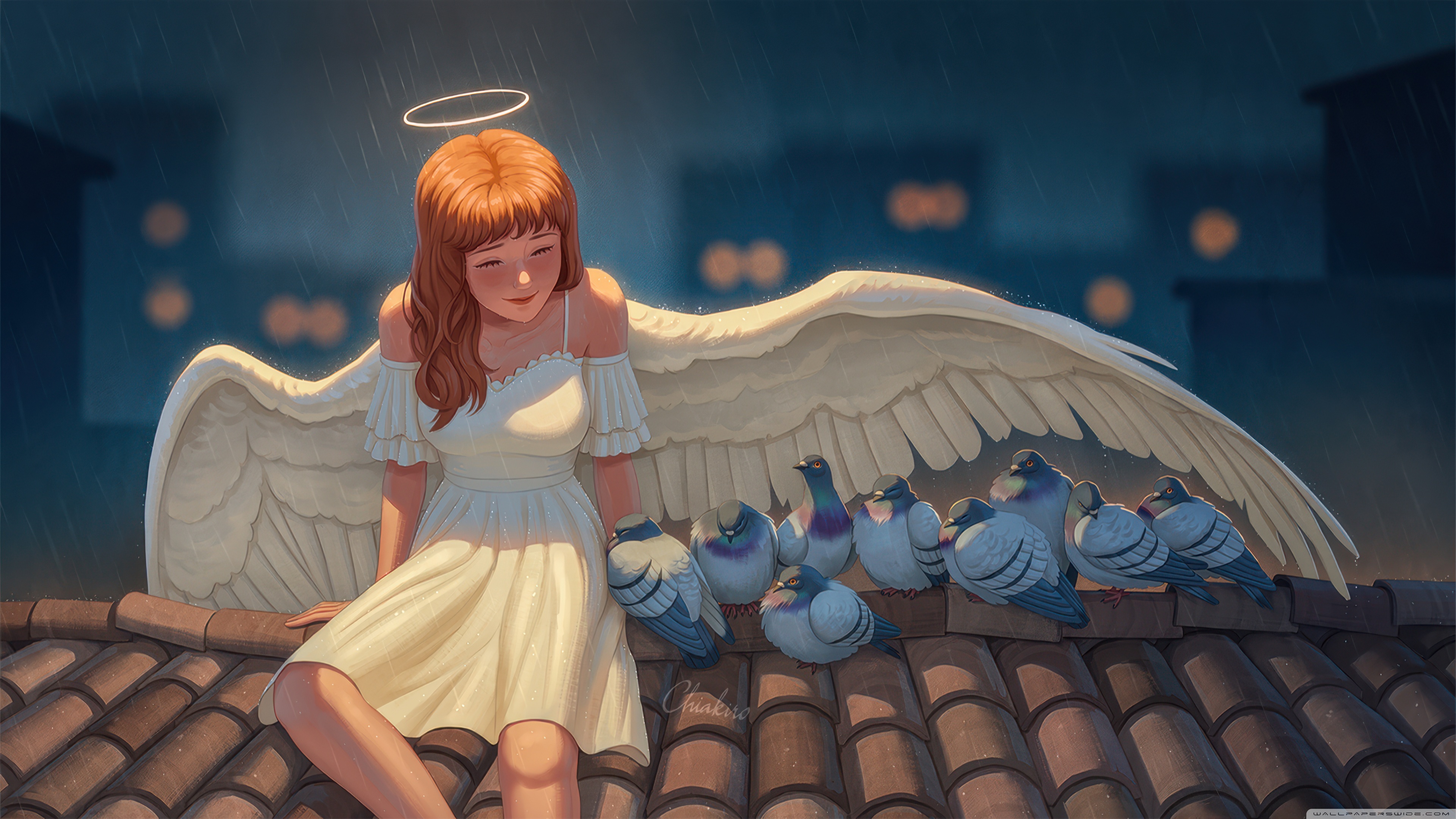 Download Angel Girl On Rooftop Savings Birds From Rain 4K UHD Wallpaper