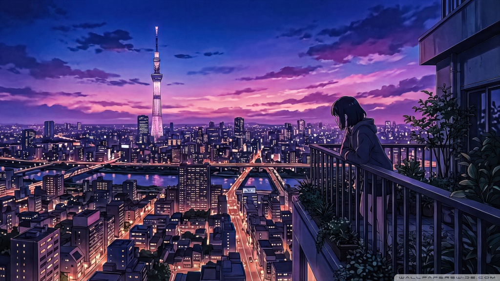 Download Anime Girl Looking At Violet Hour Tokyo 4K UHD Wallpaper