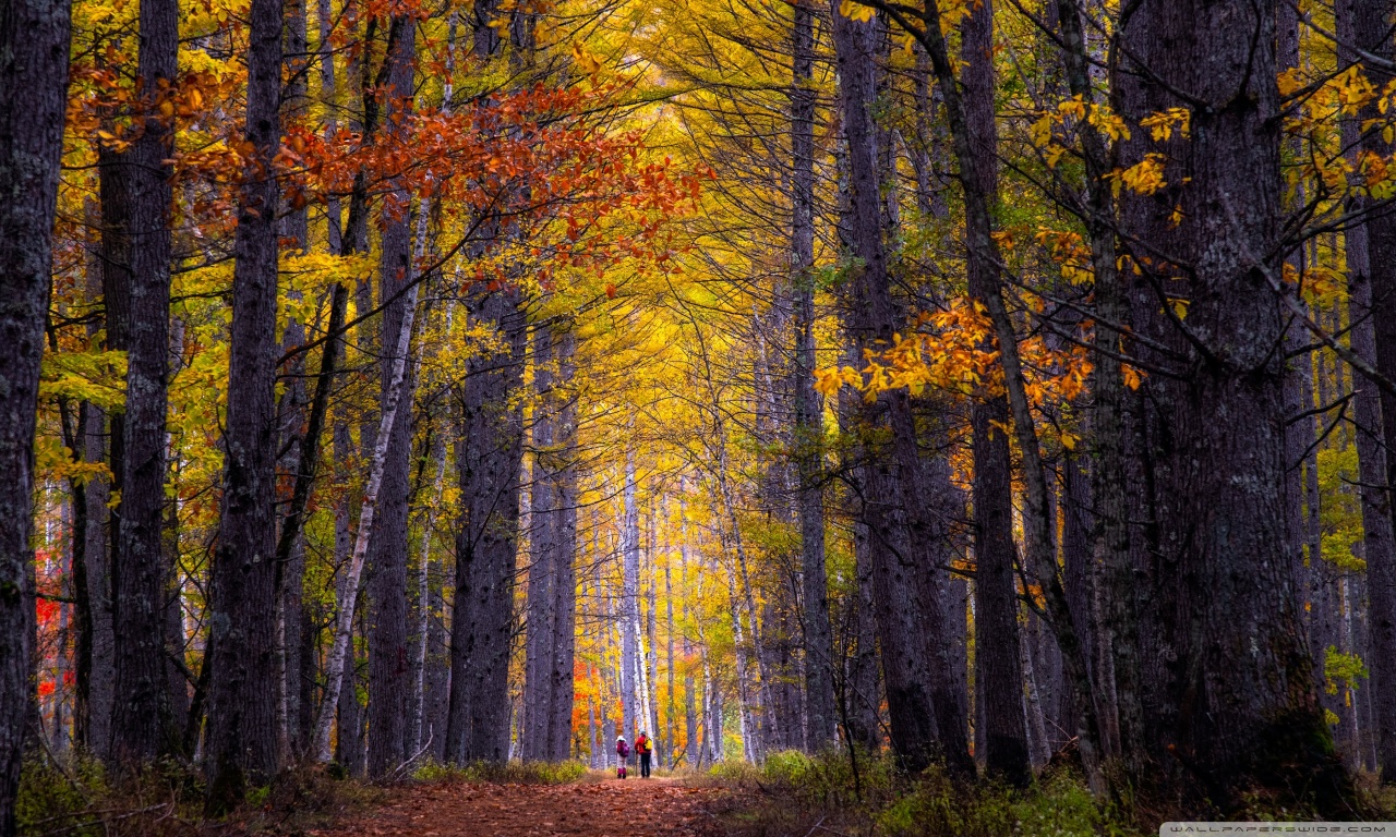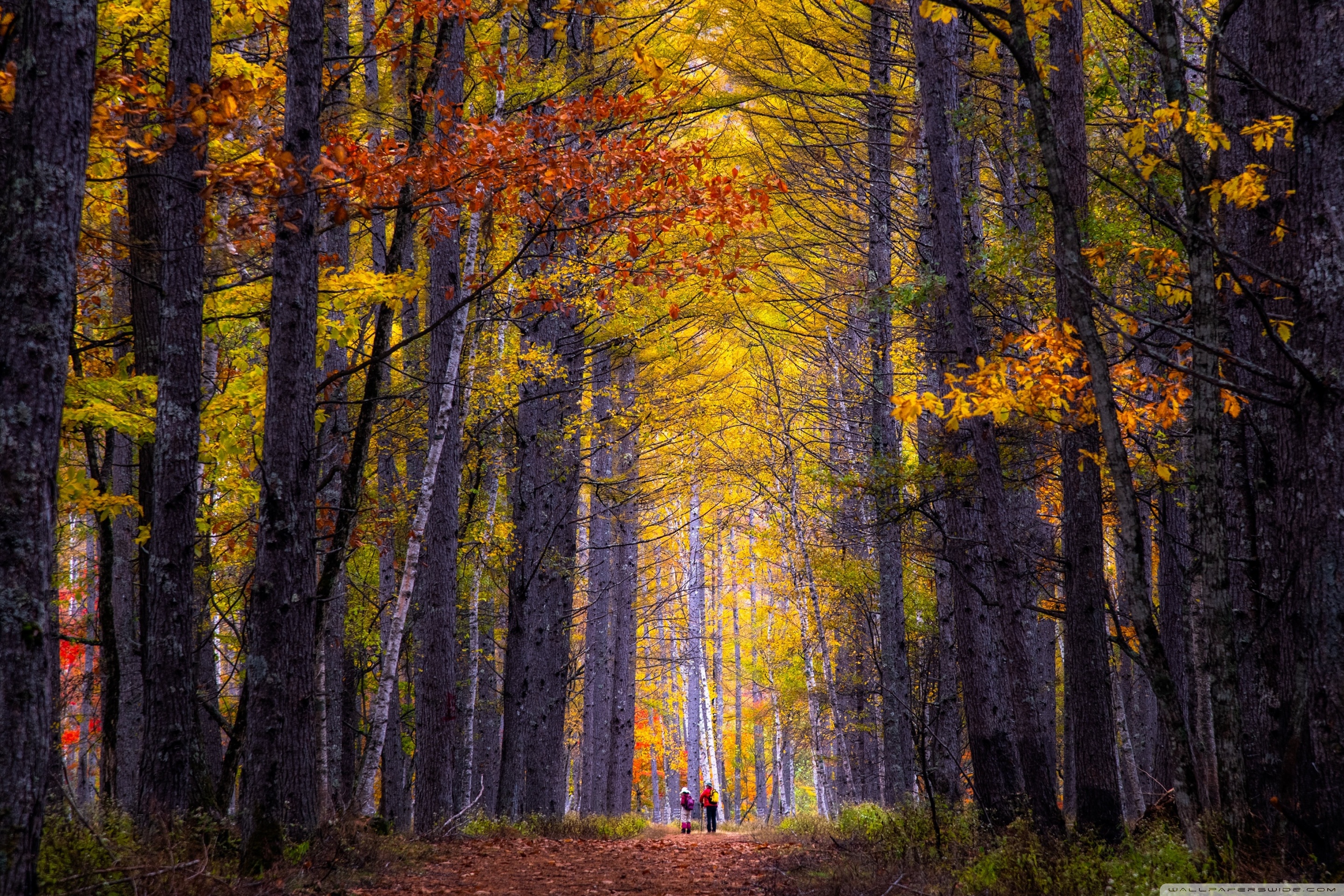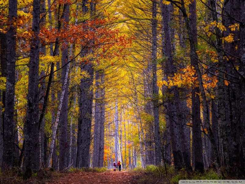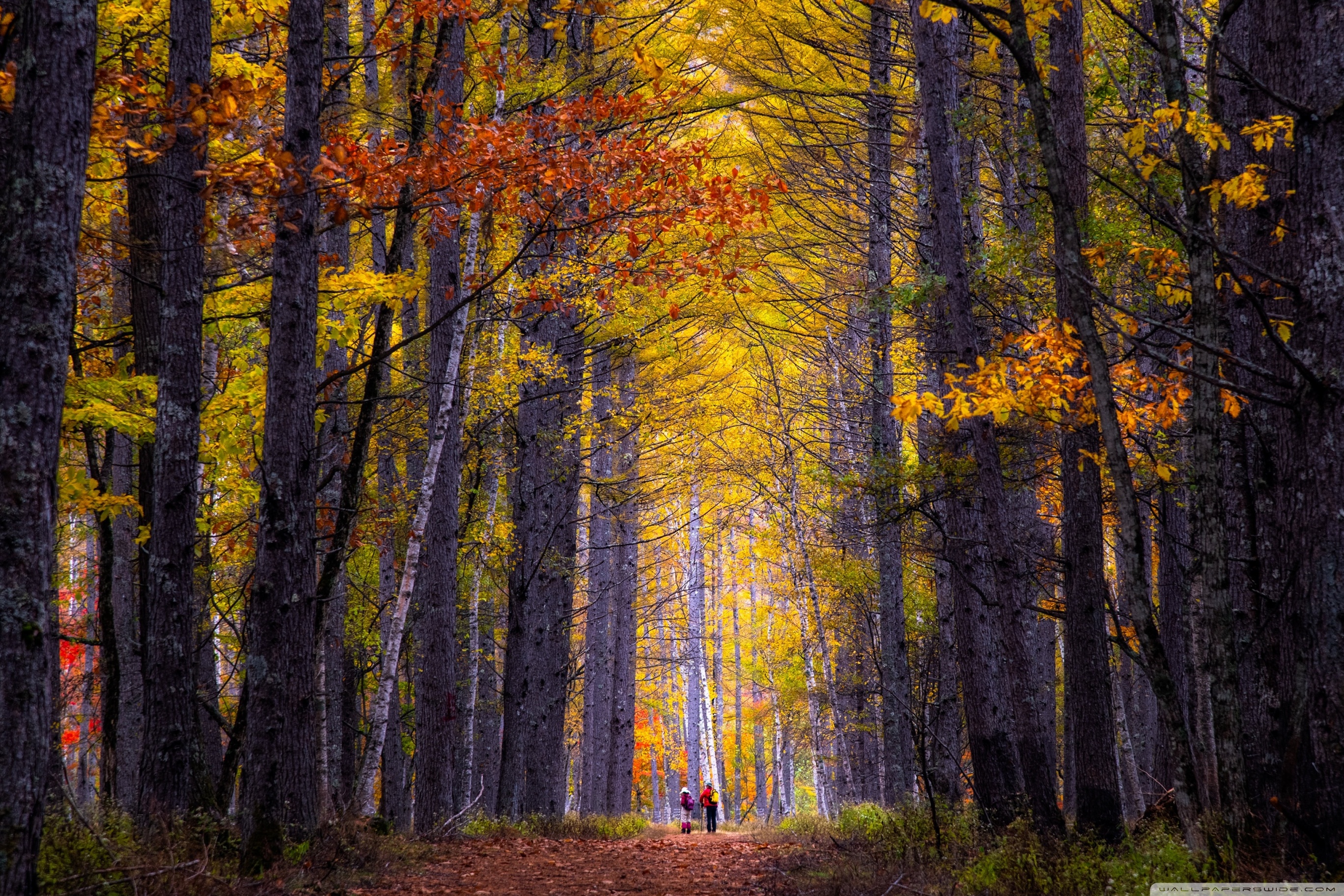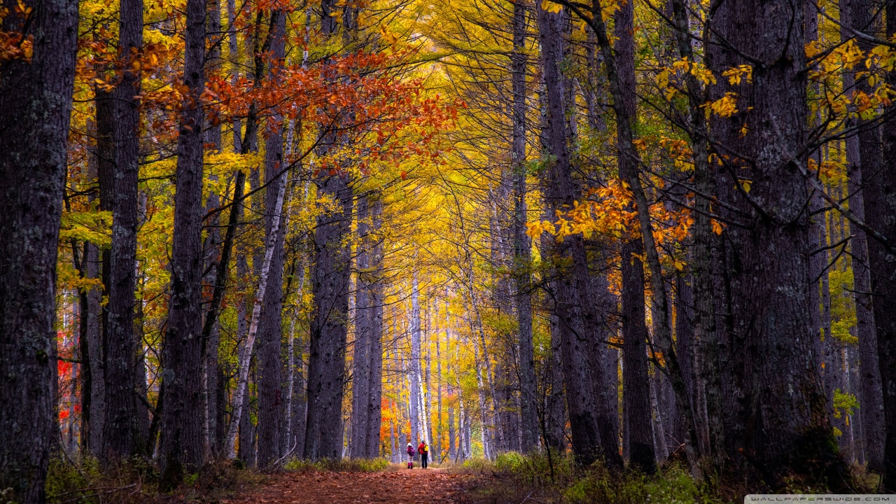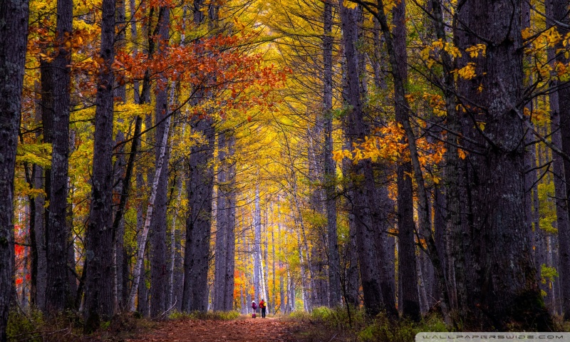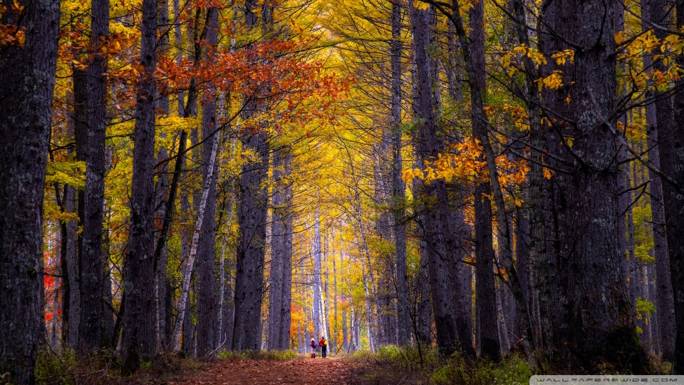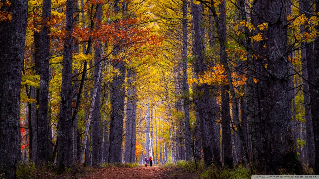 Download Autumn, Hike, Tall Trees, Forest 4K UHD Wallpaper