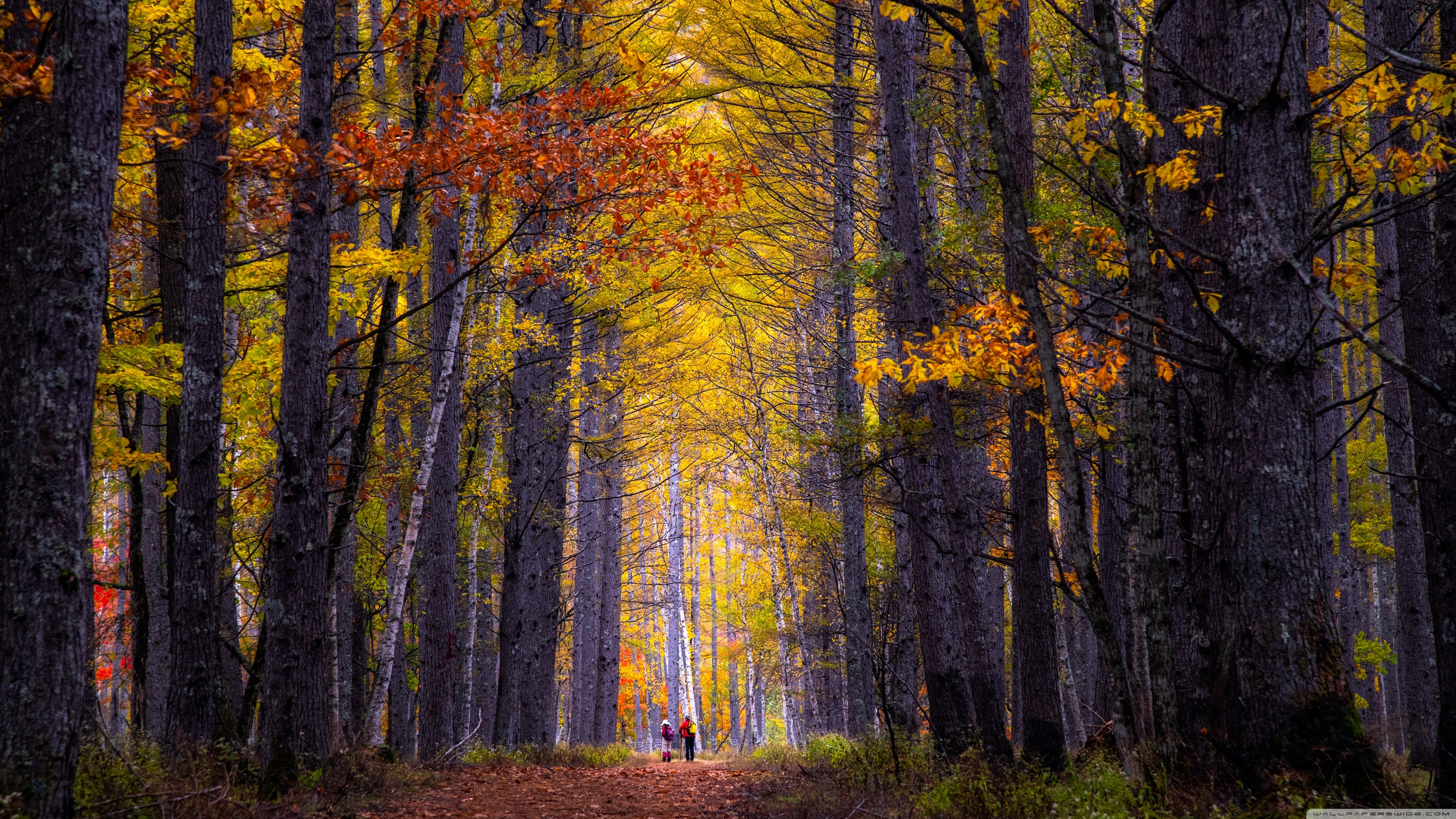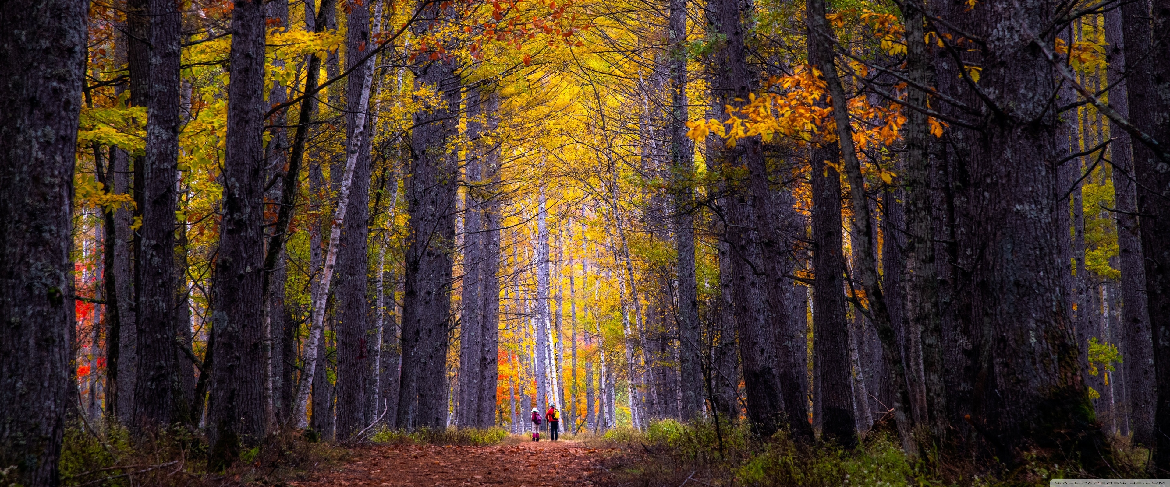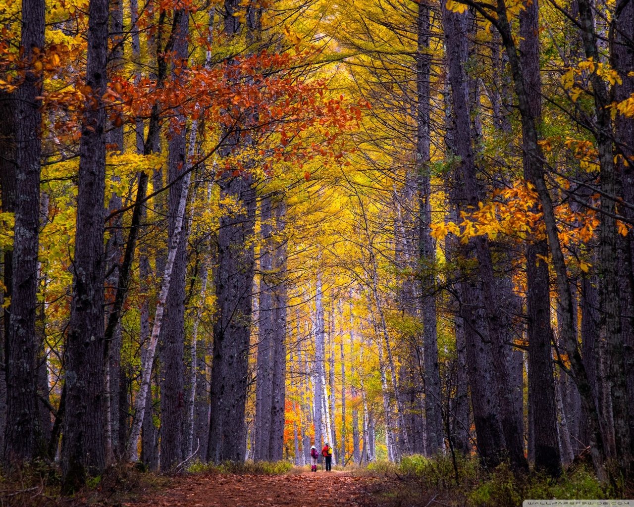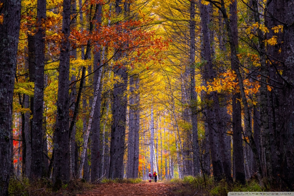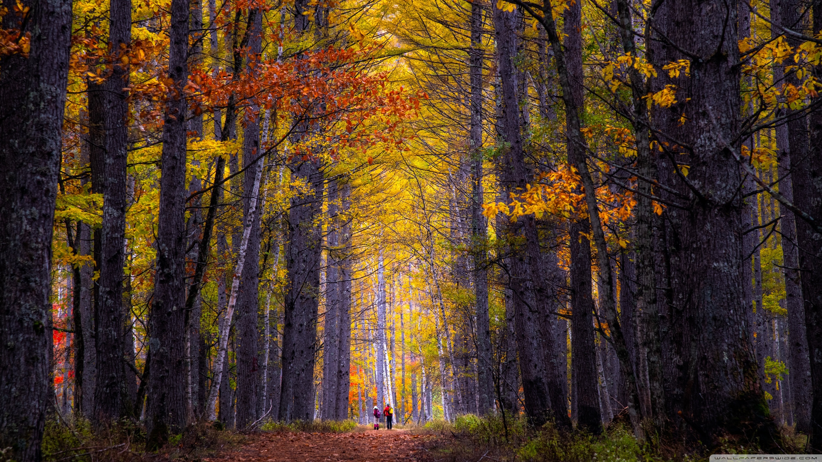Download Autumn, Hike, Tall Trees, Forest 4K UHD Wallpaper