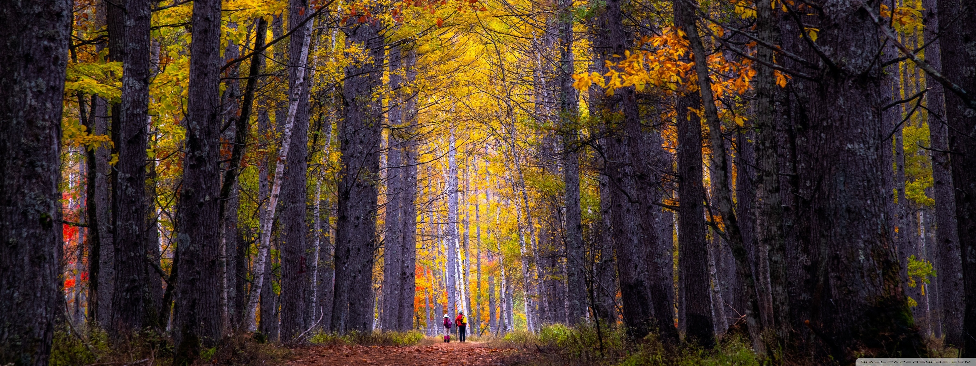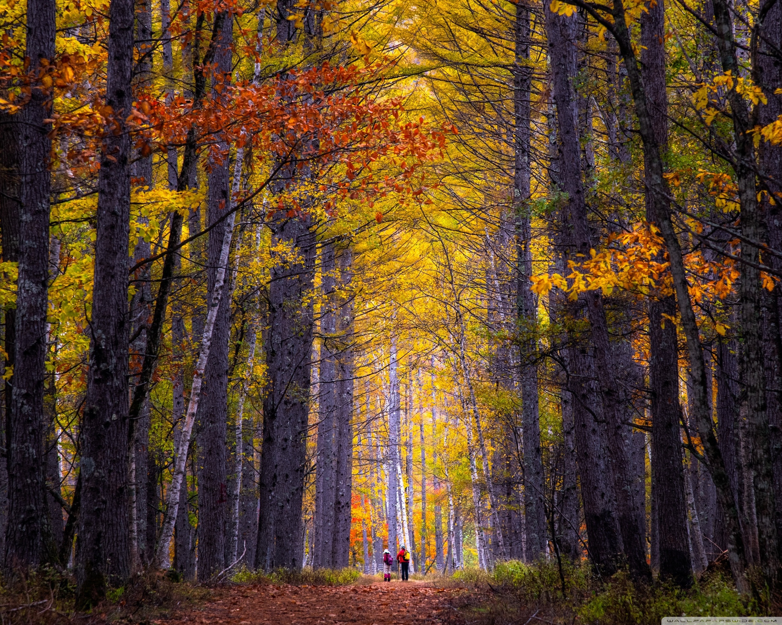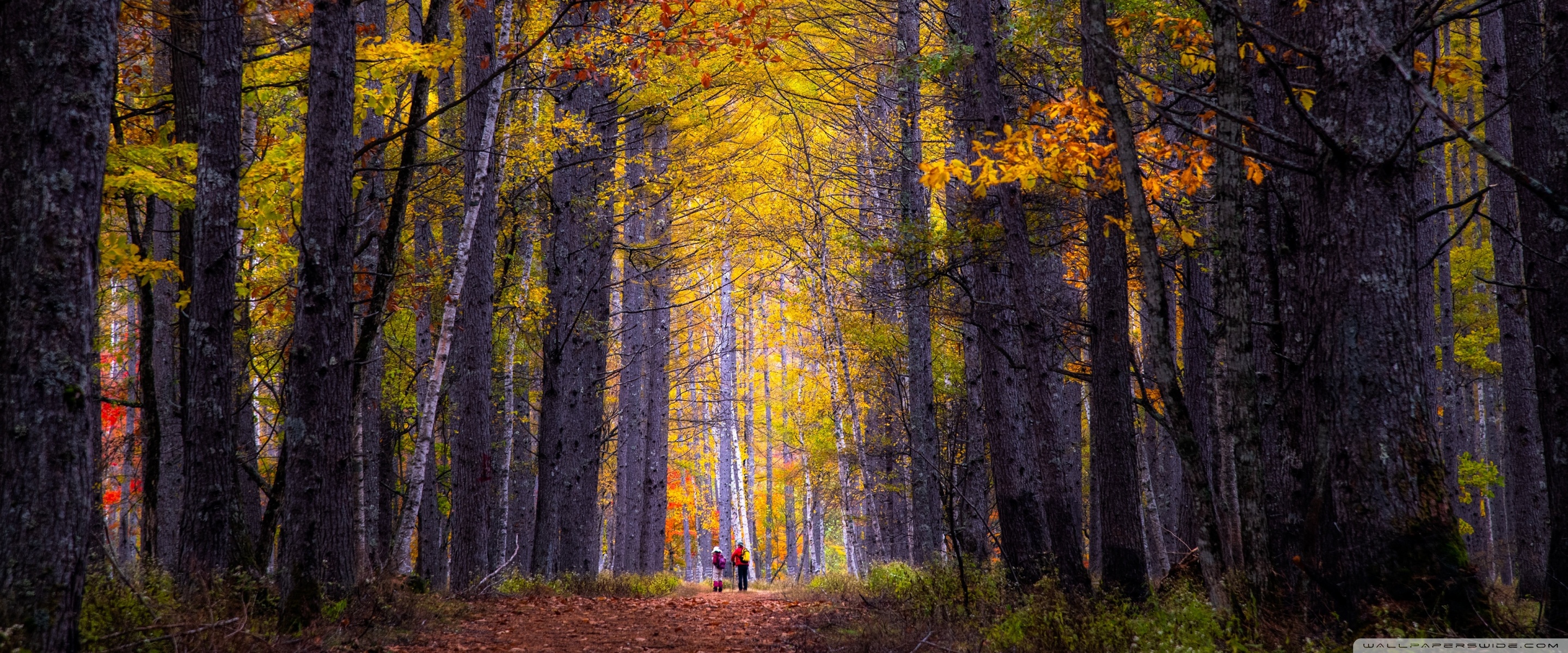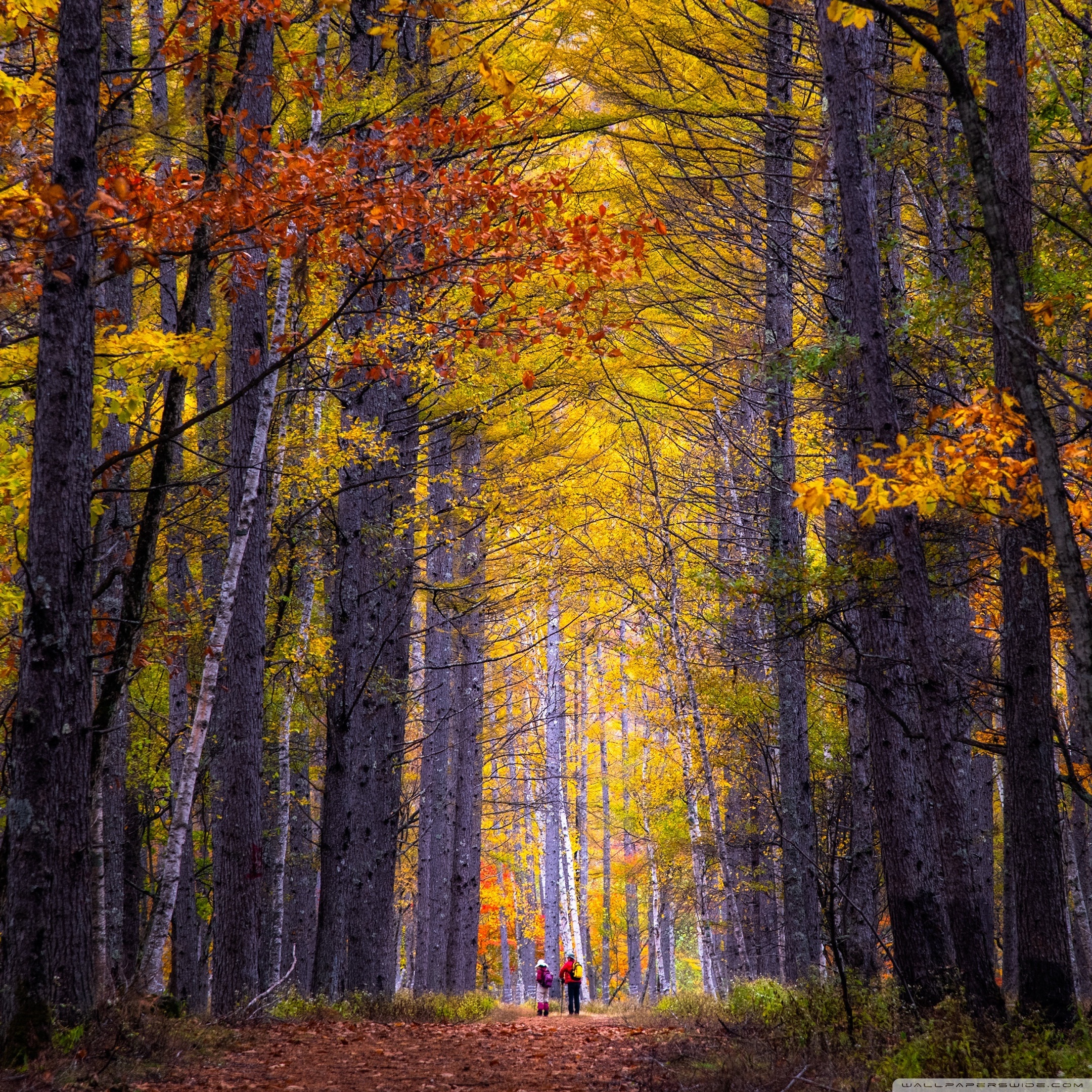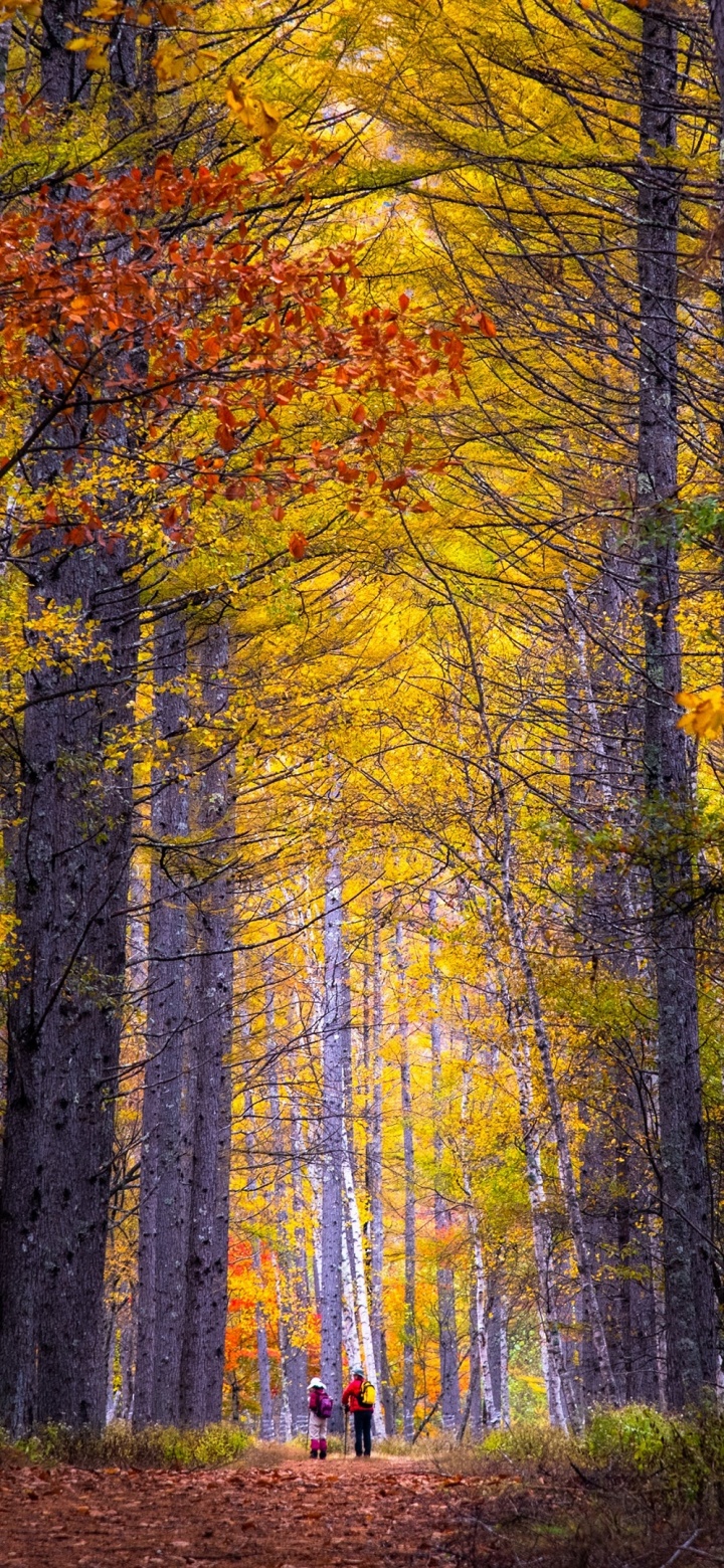 Download Autumn, Hike, Tall Trees, Forest 4K UHD Wallpaper