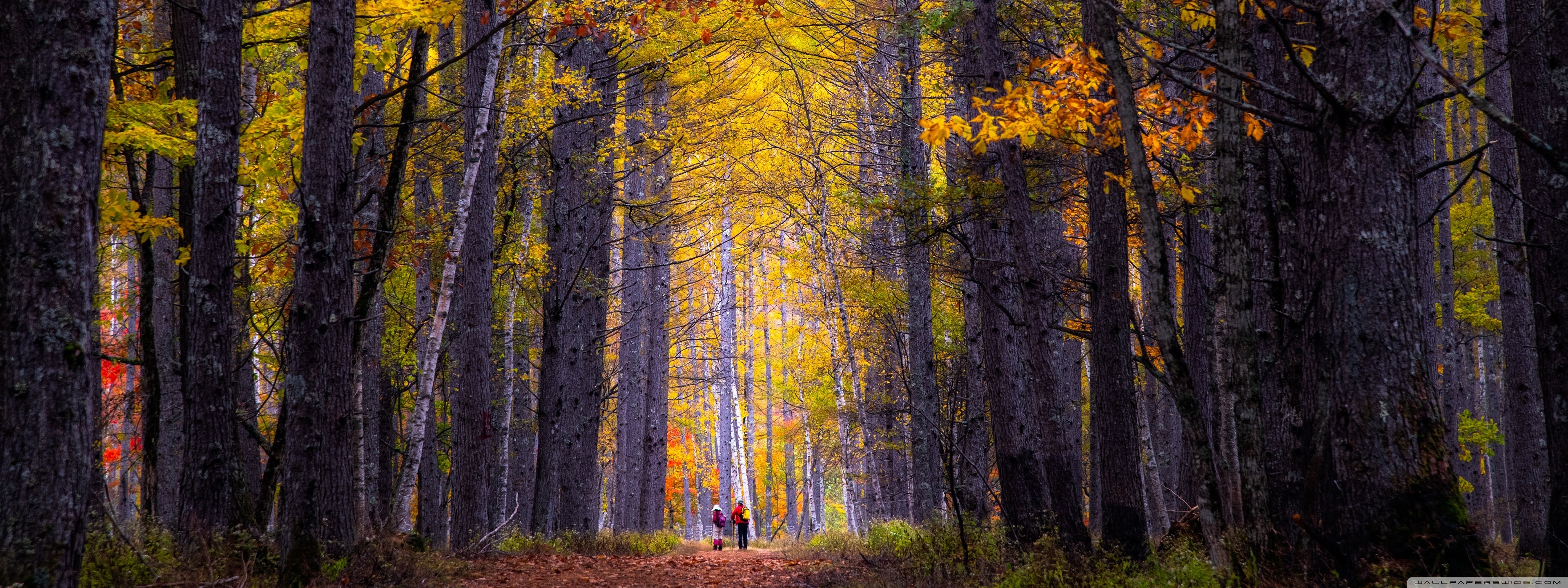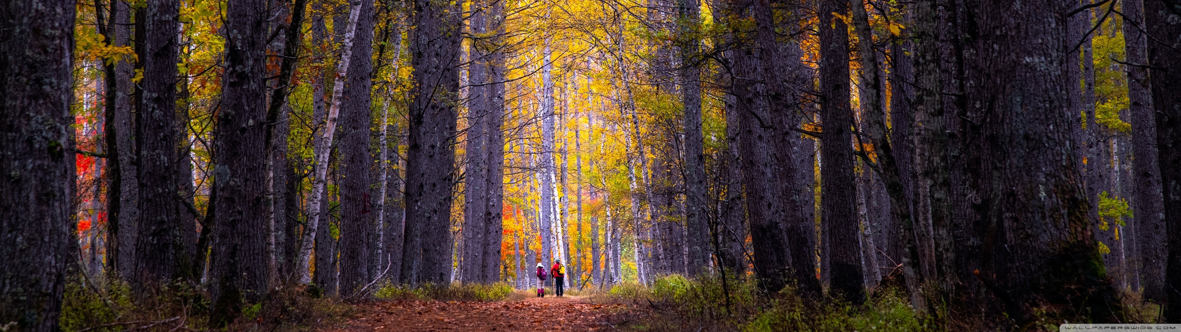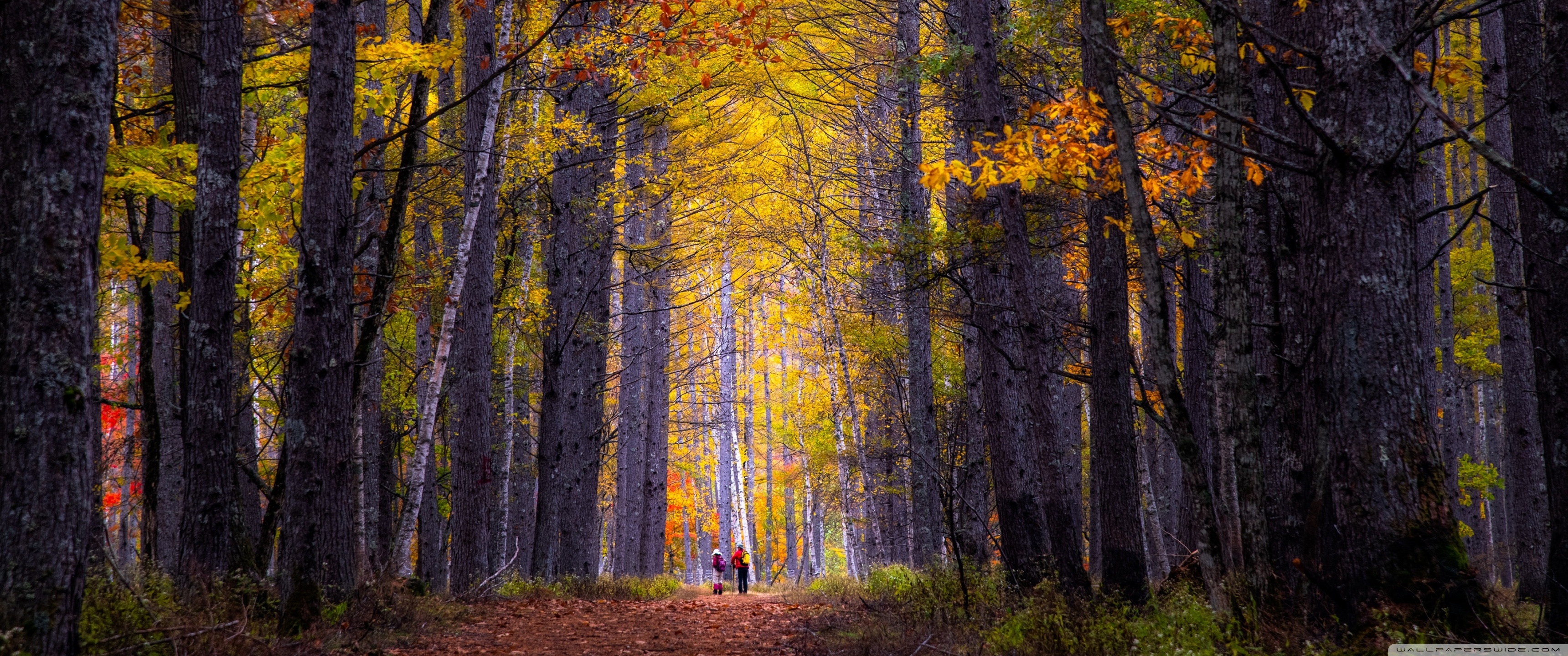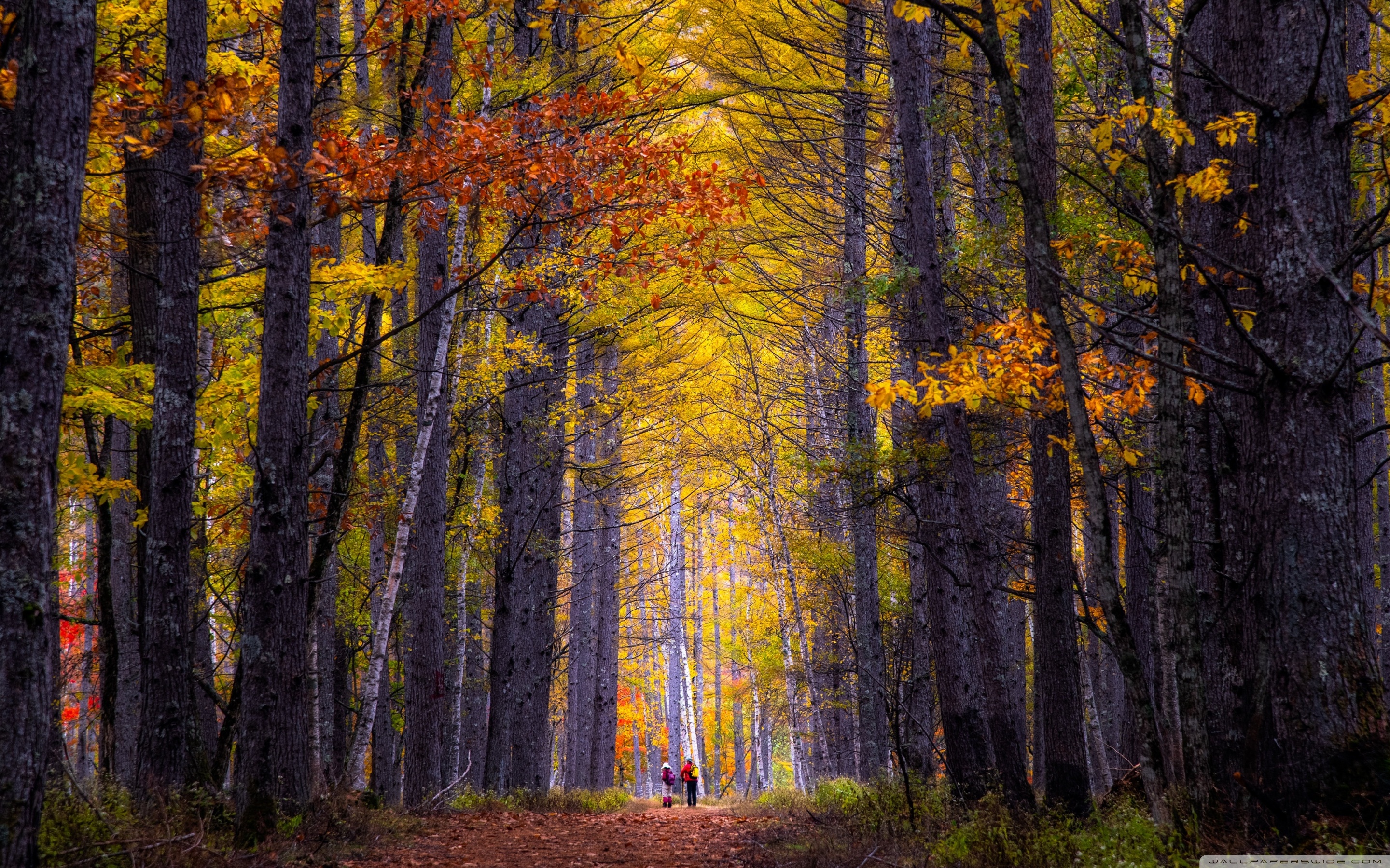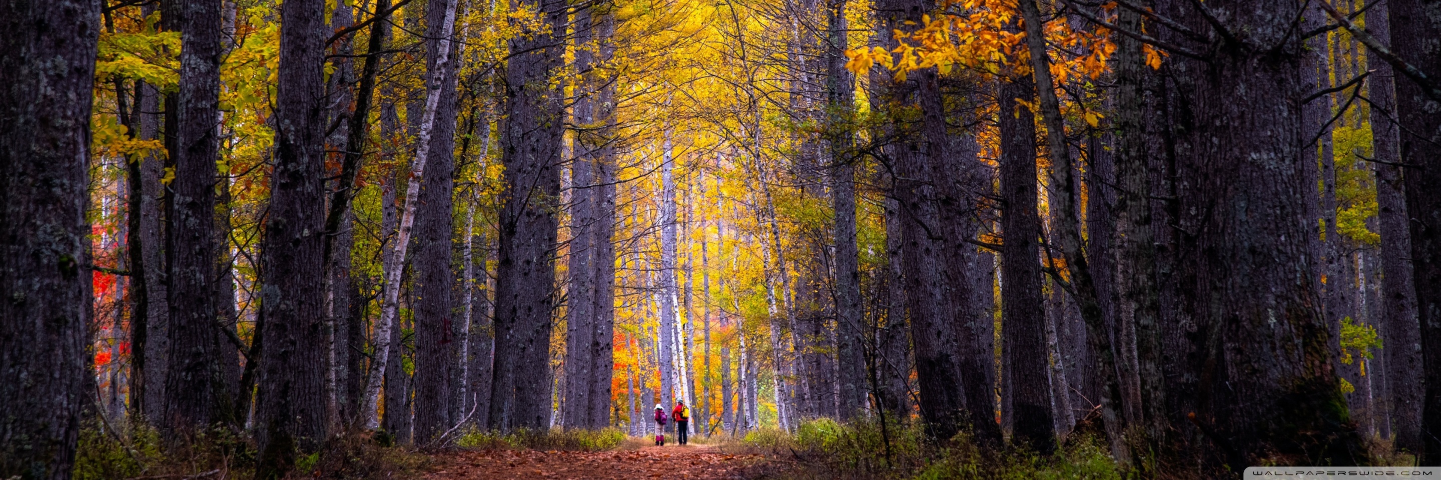 Download Autumn, Hike, Tall Trees, Forest 4K UHD Wallpaper
