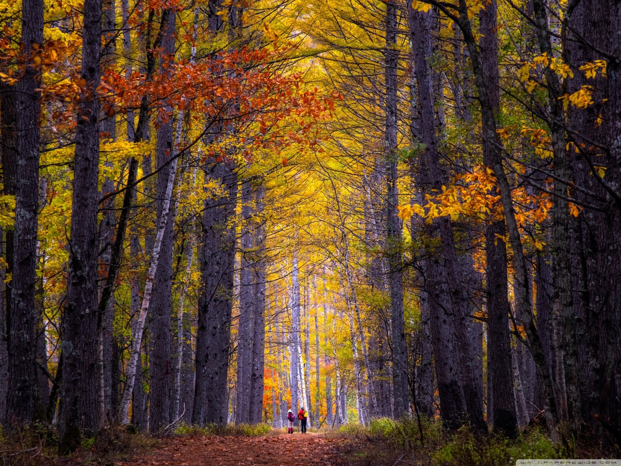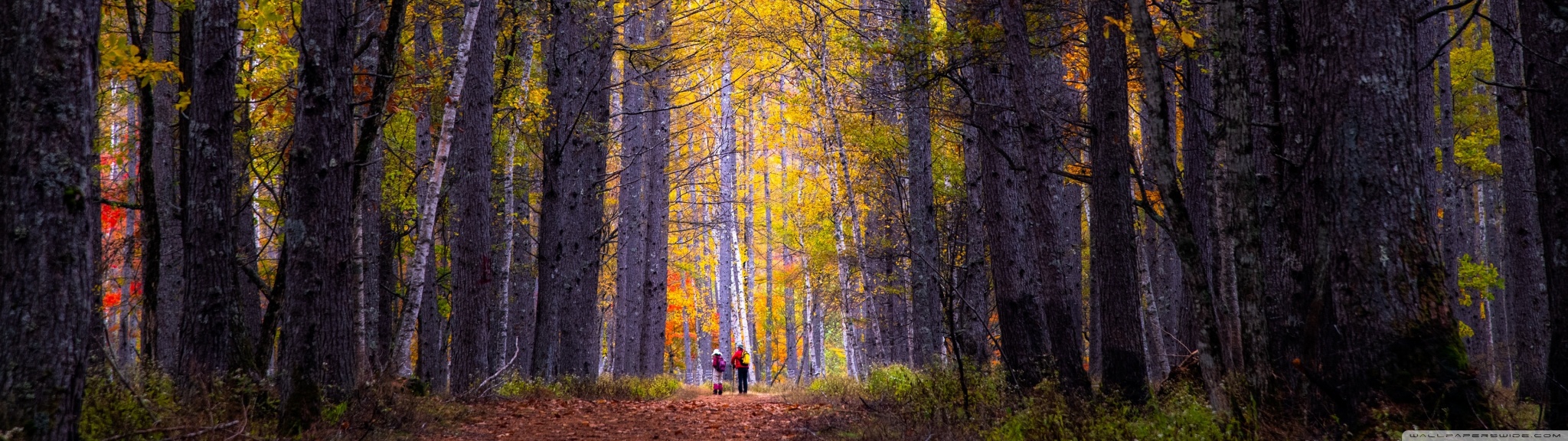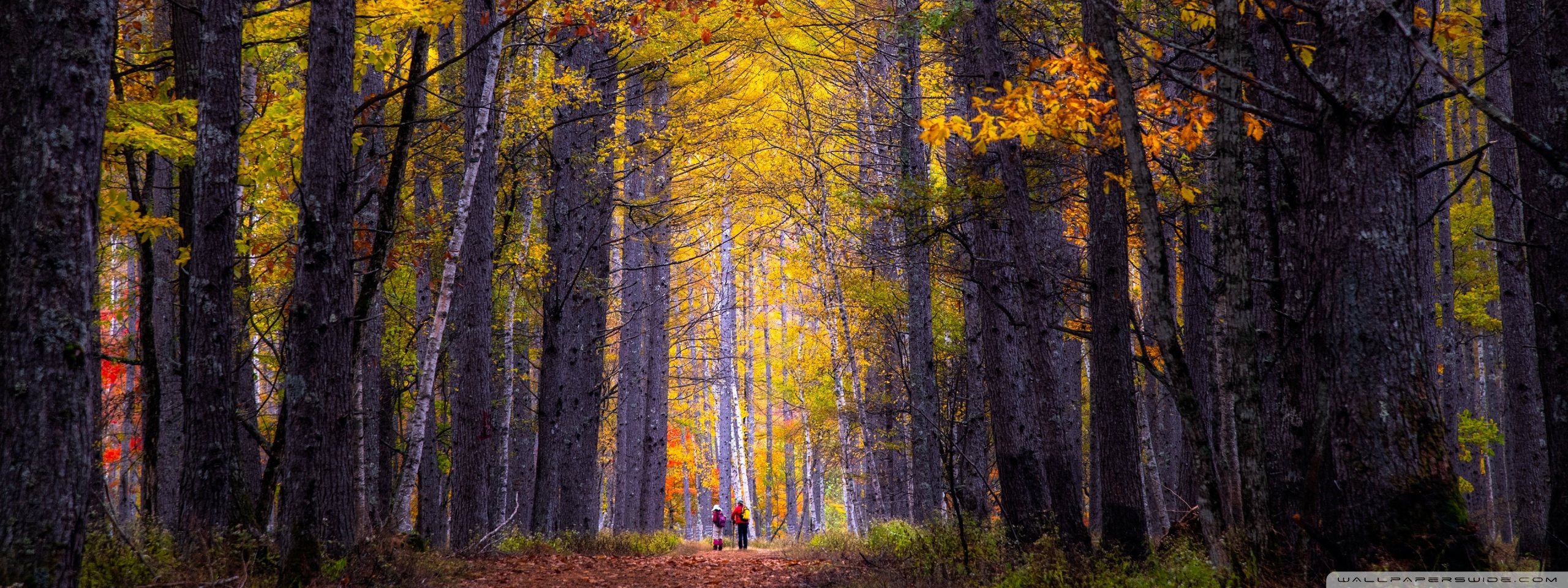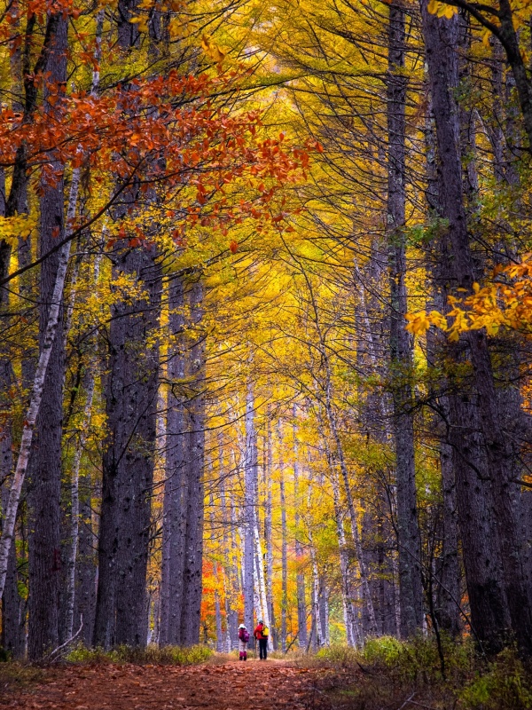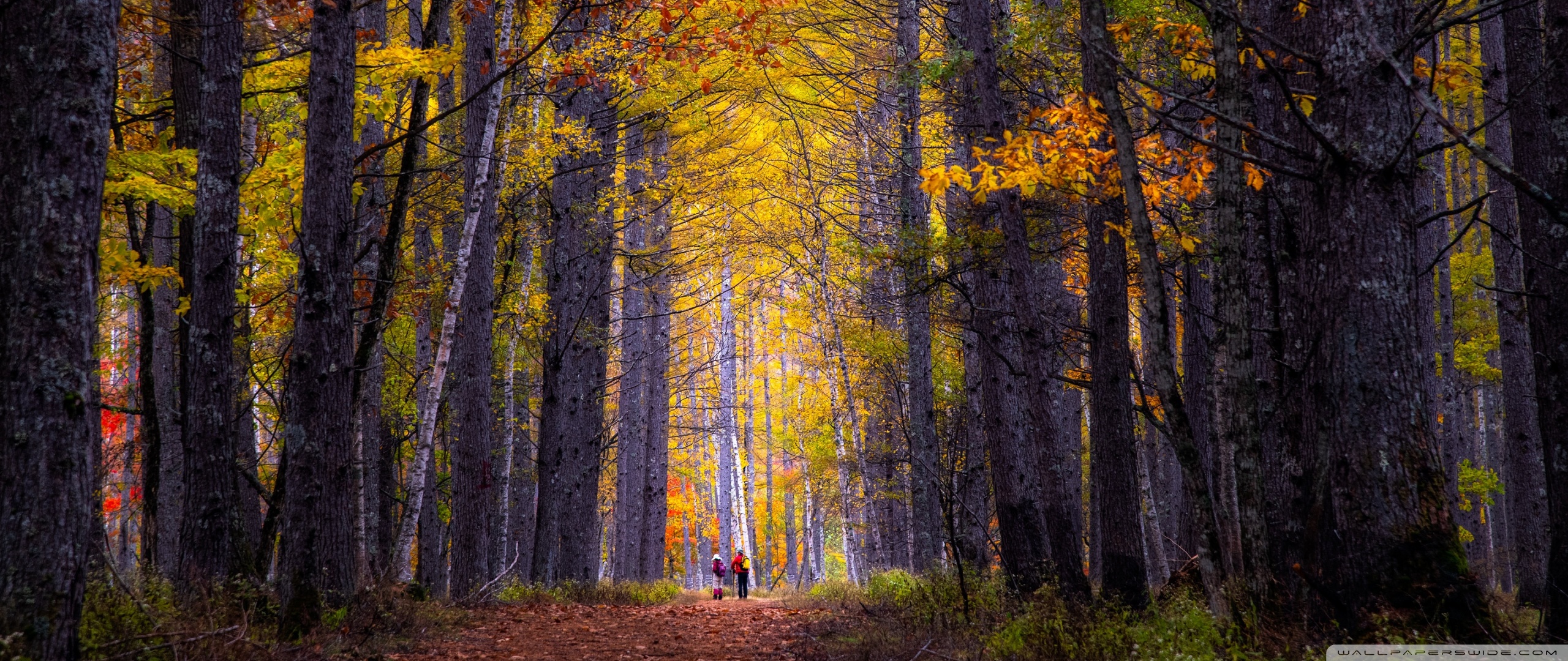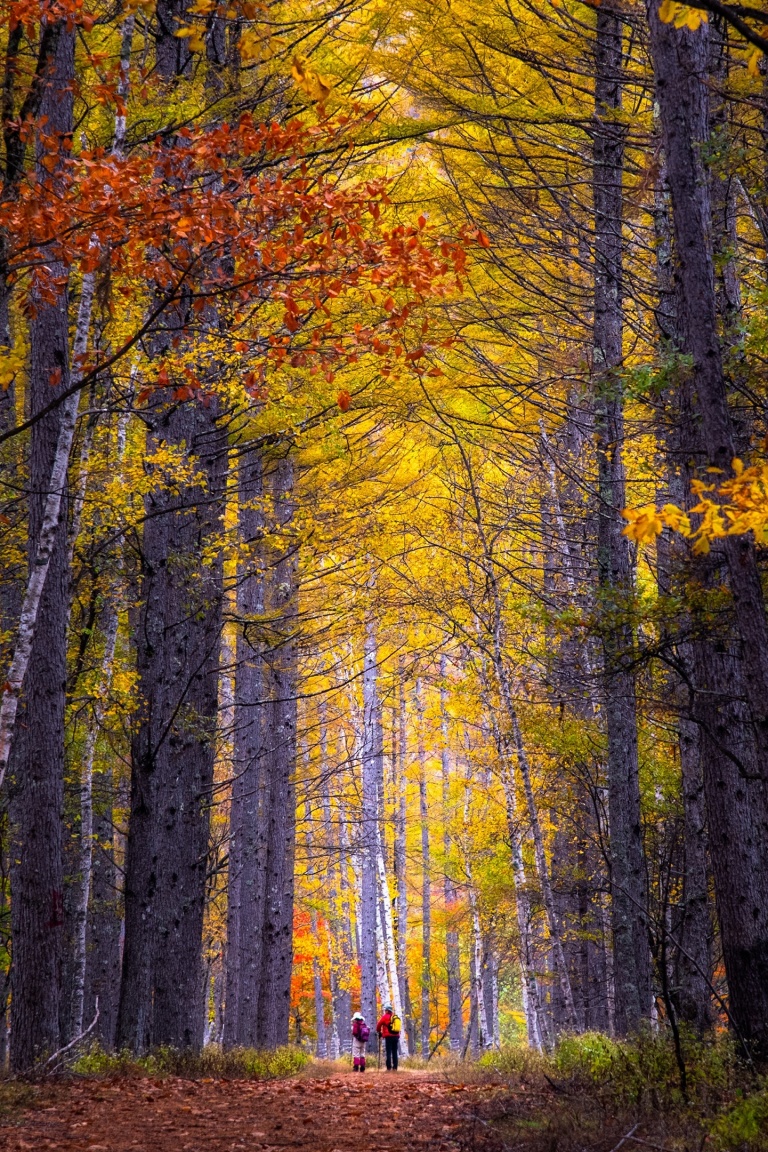 Download Autumn, Hike, Tall Trees, Forest 4K UHD Wallpaper