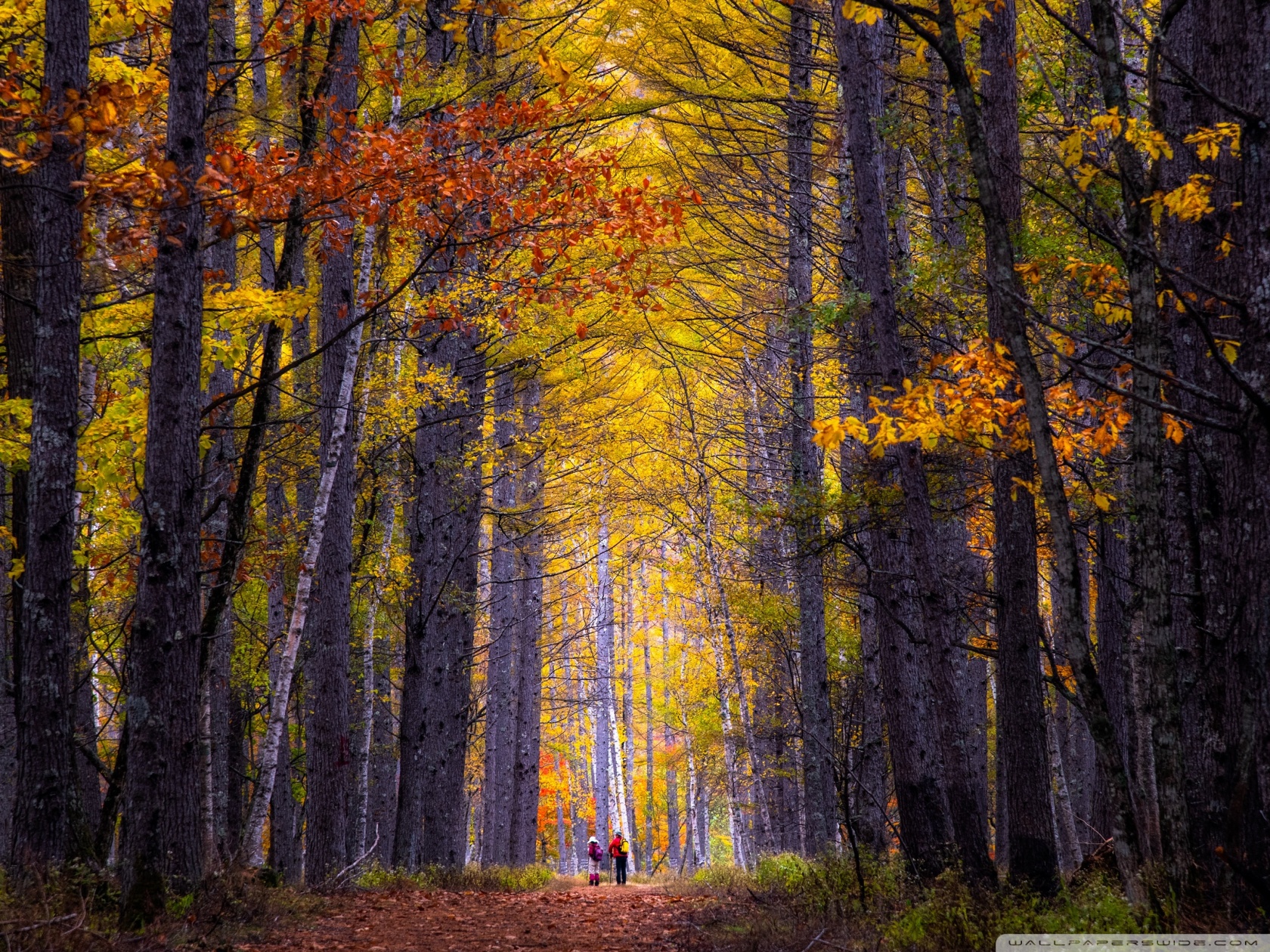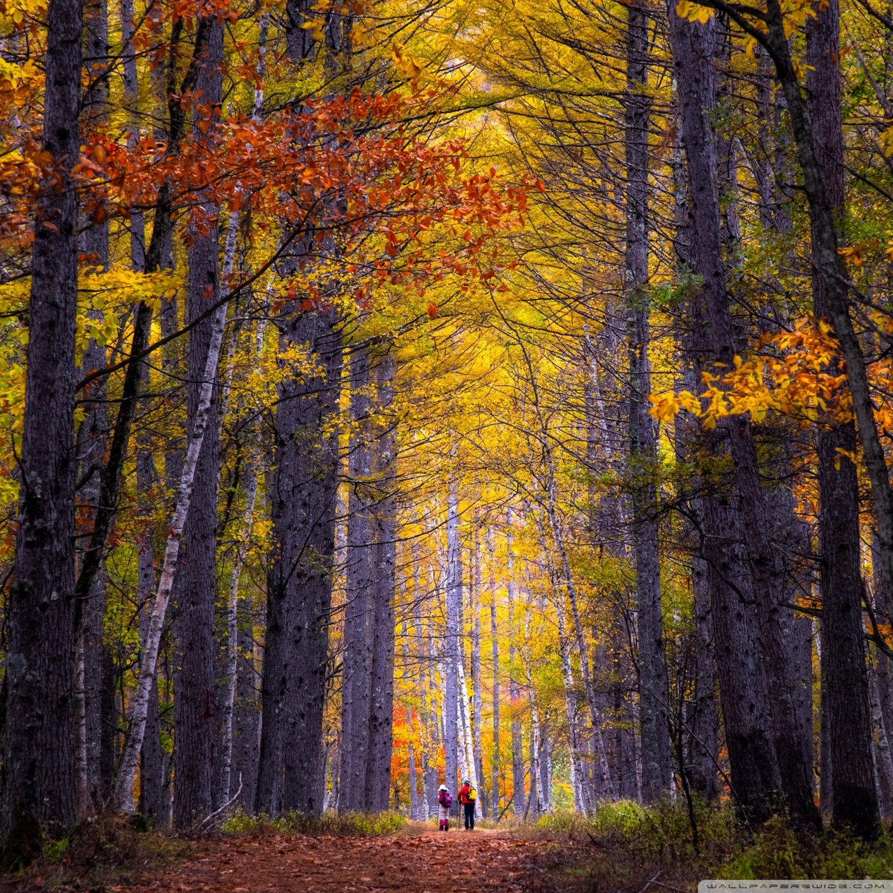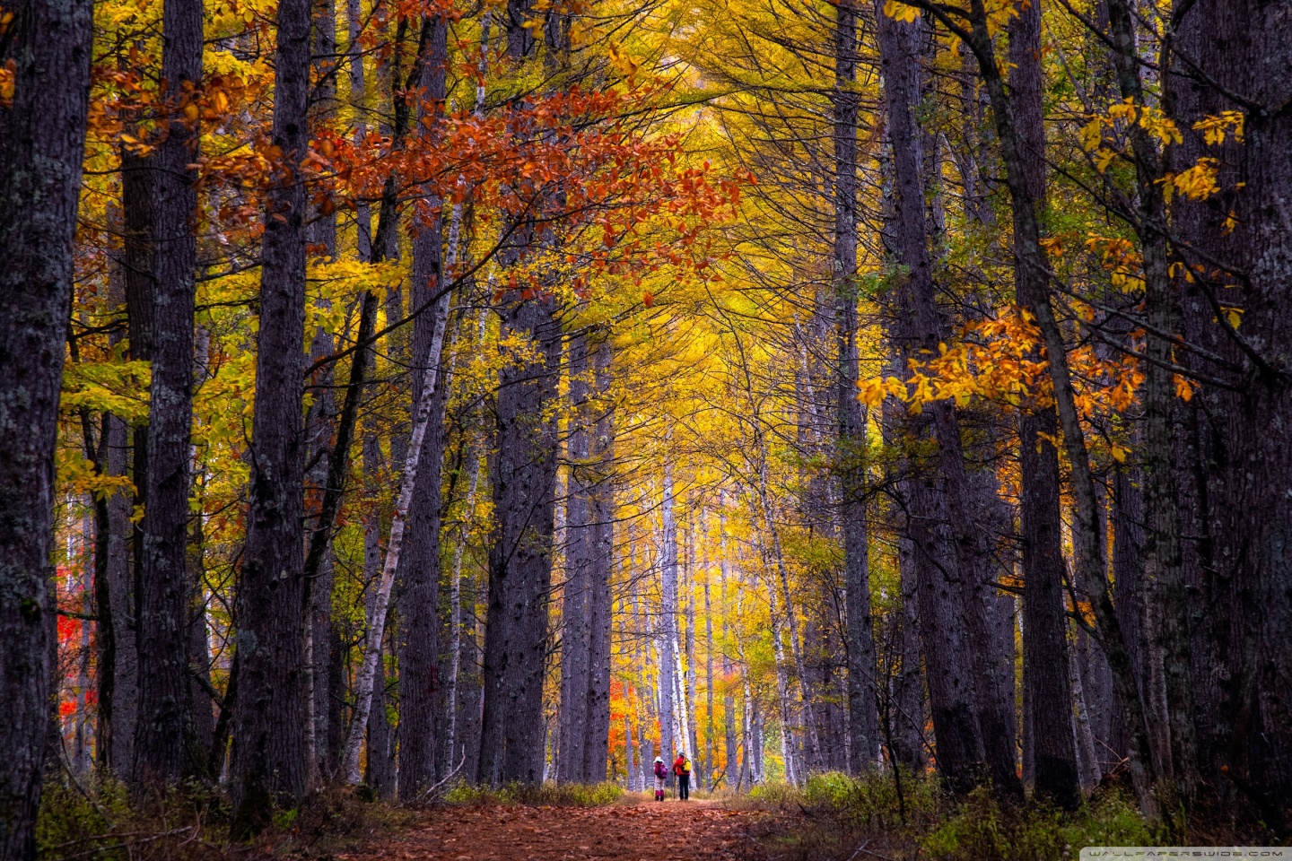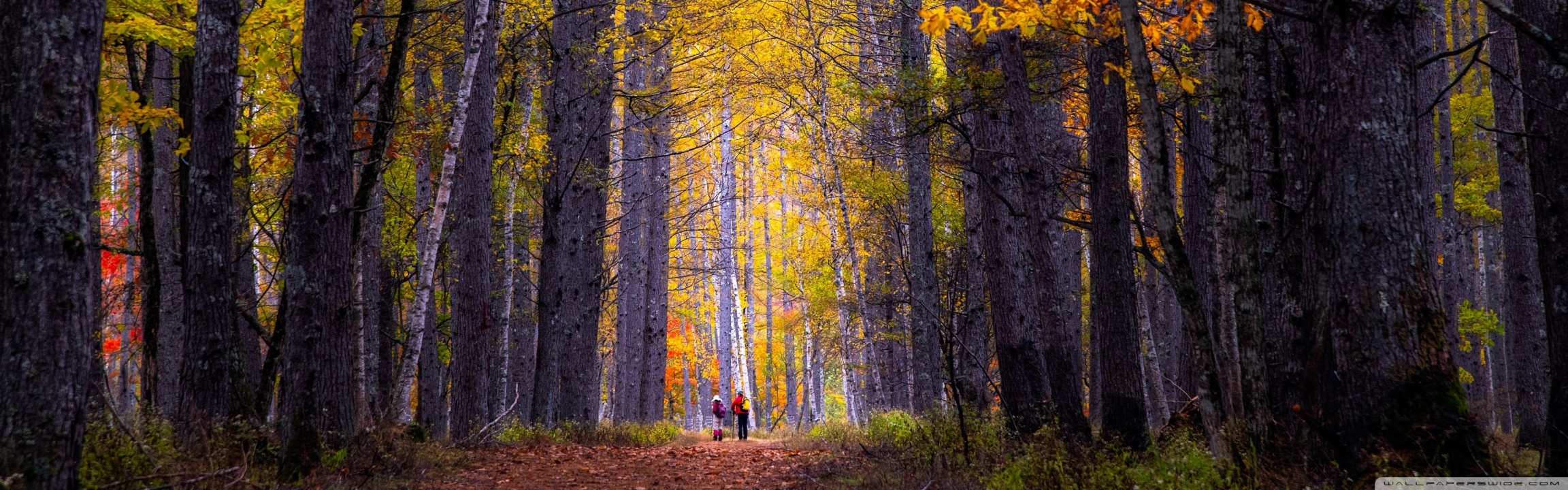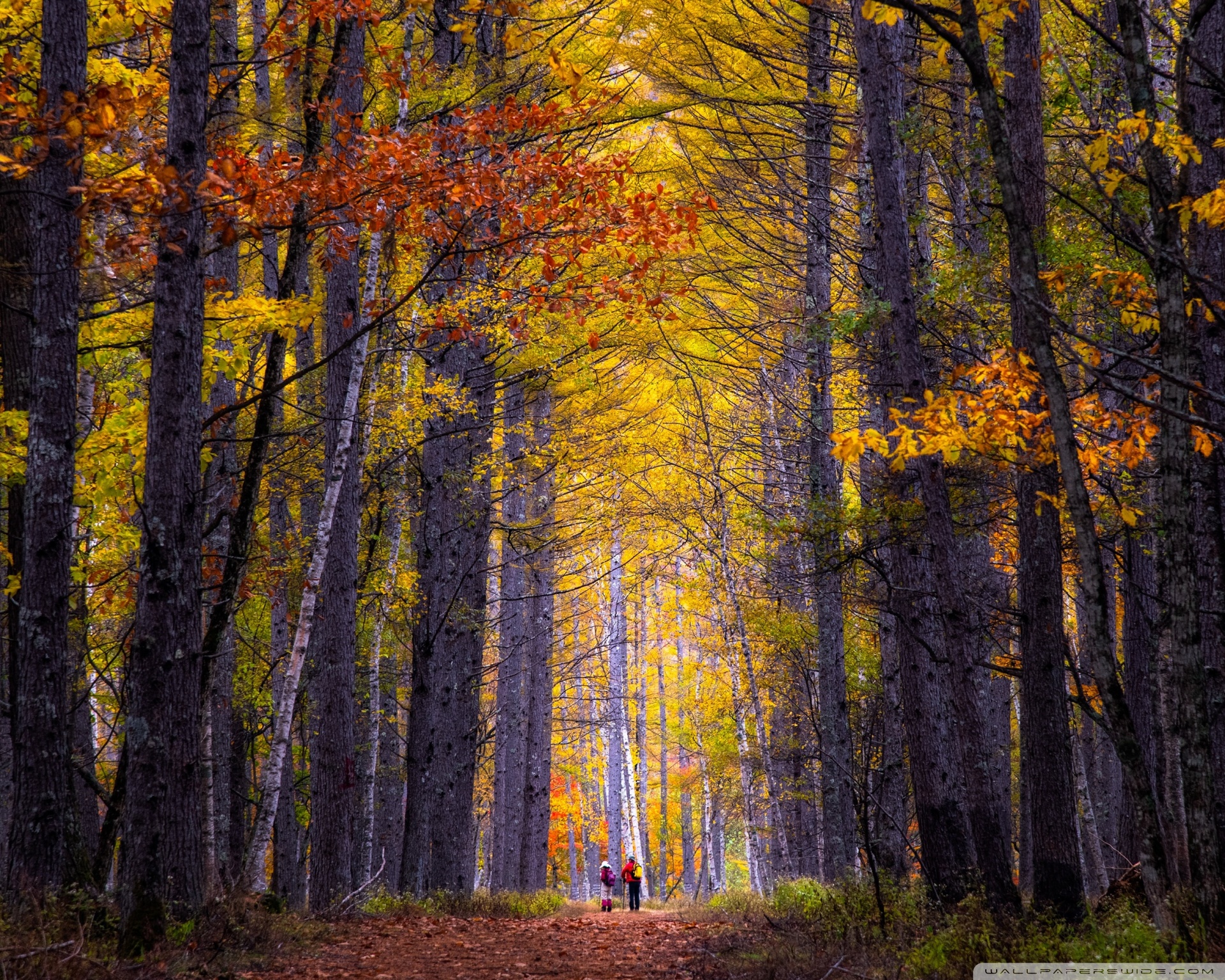 Download Autumn, Hike, Tall Trees, Forest 4K UHD Wallpaper