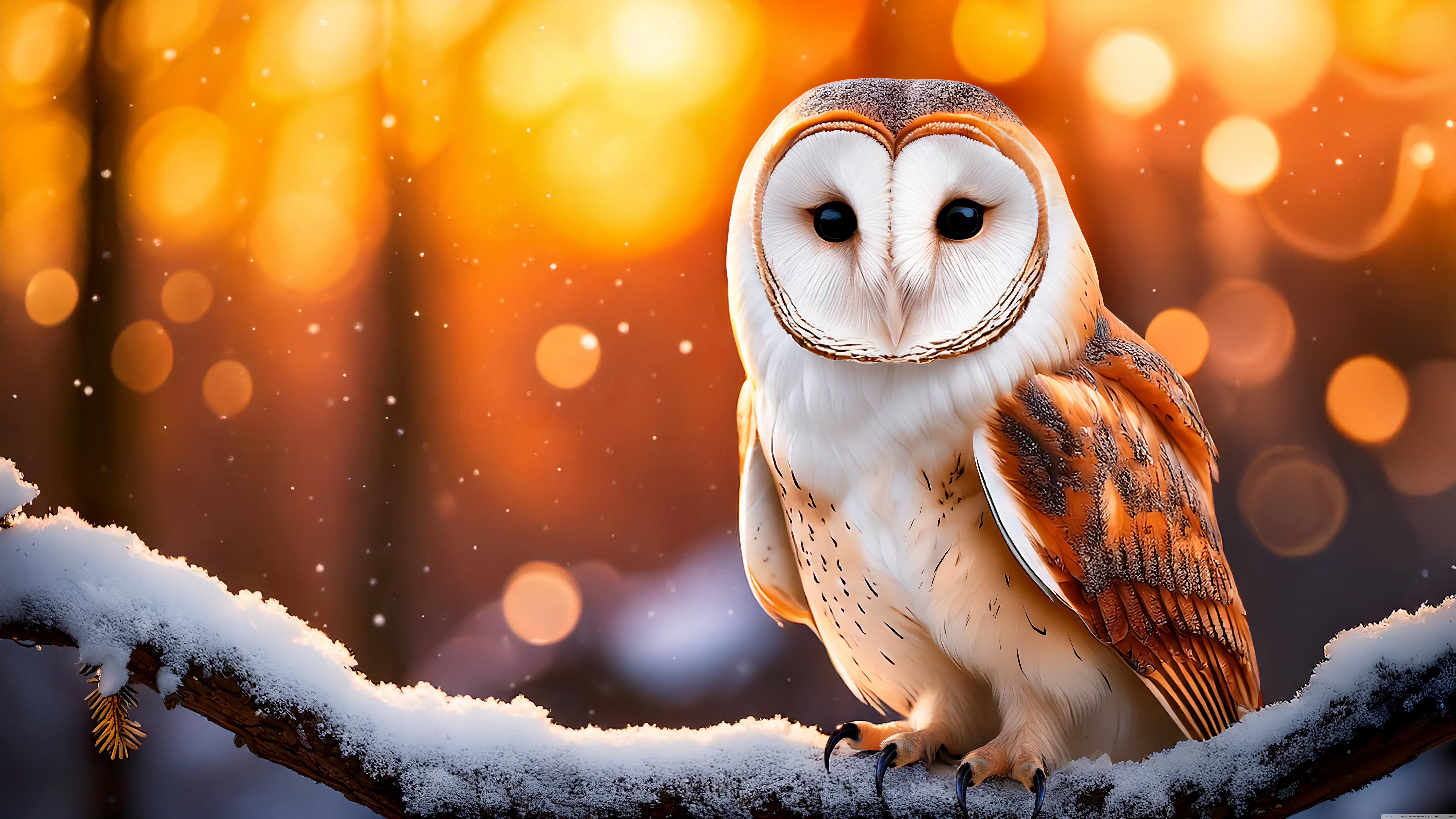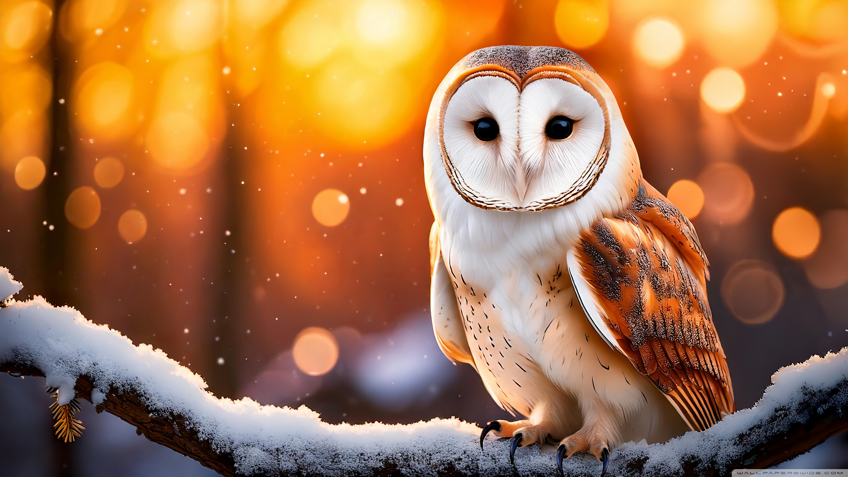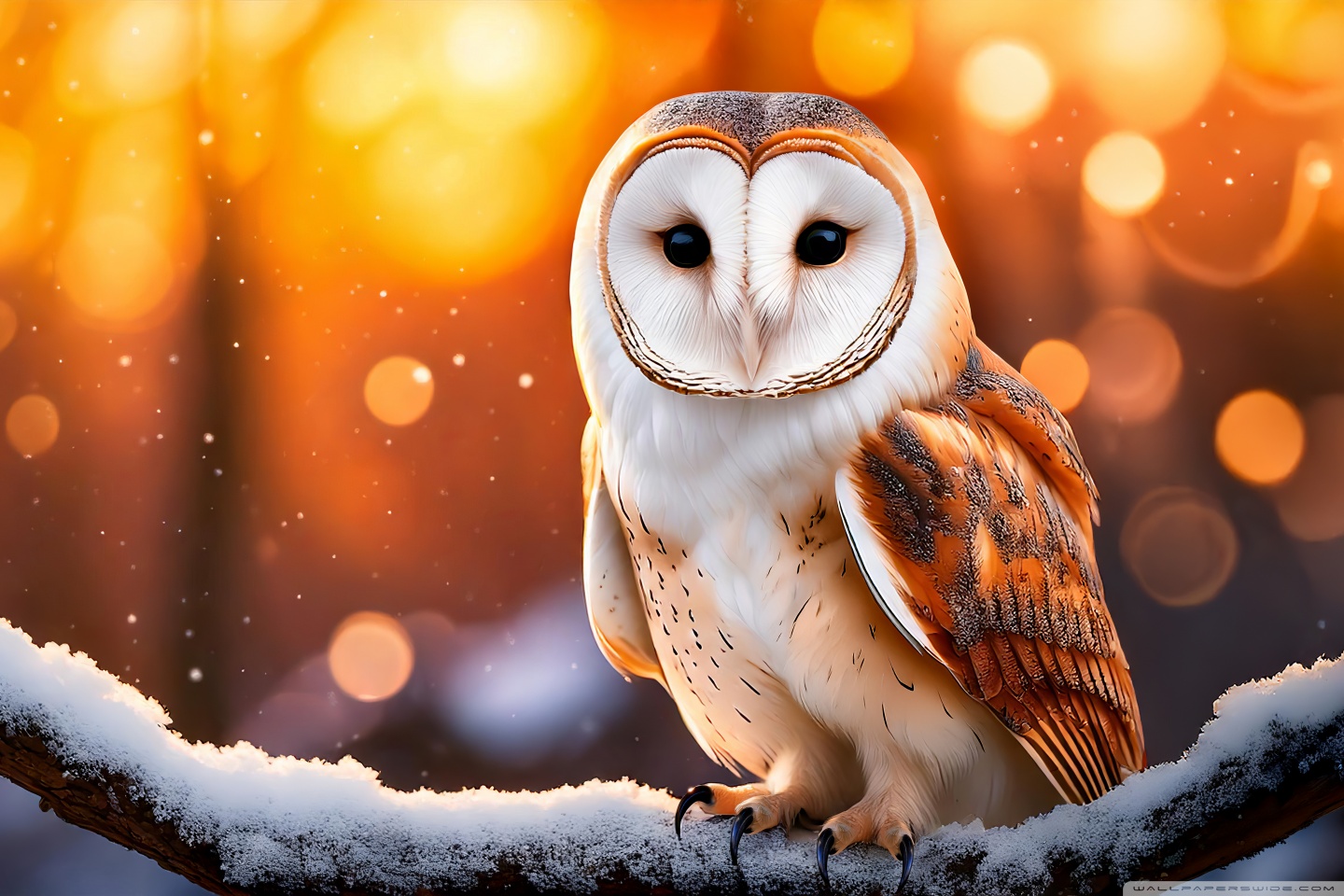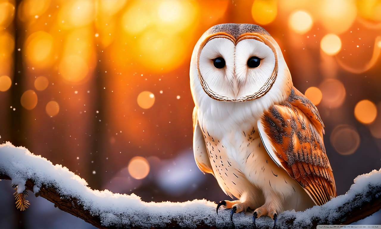 Download Barn Owl Resting on a Snowy Branch in Warm... 4K UHD Wallpaper