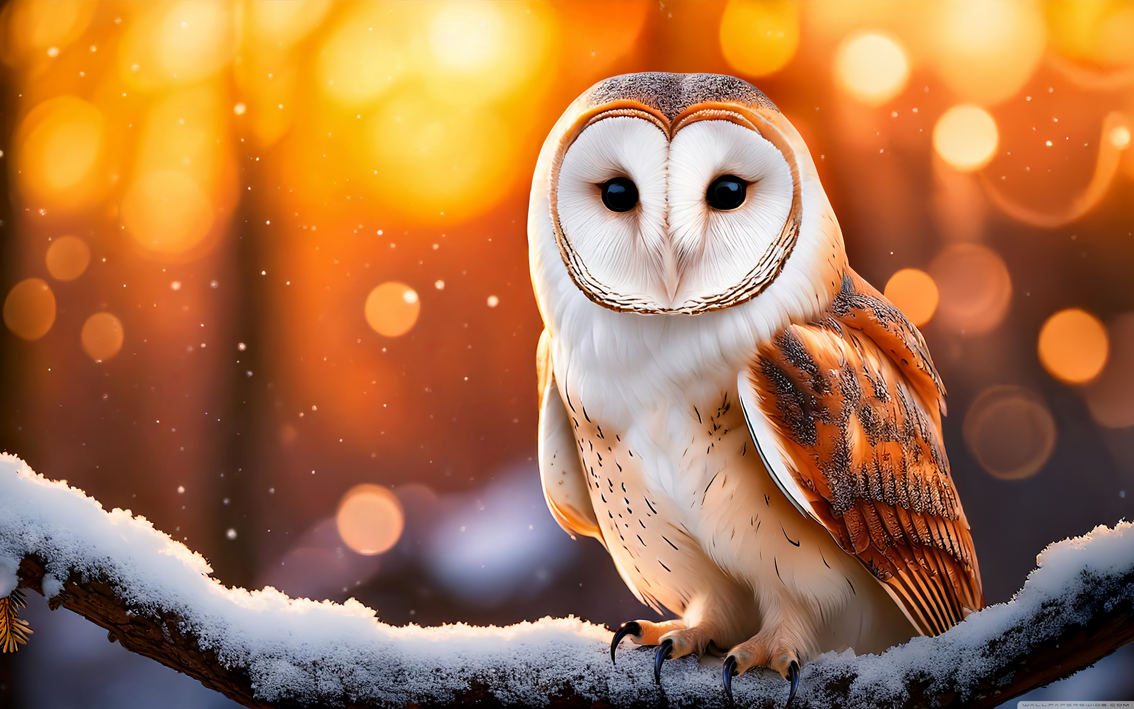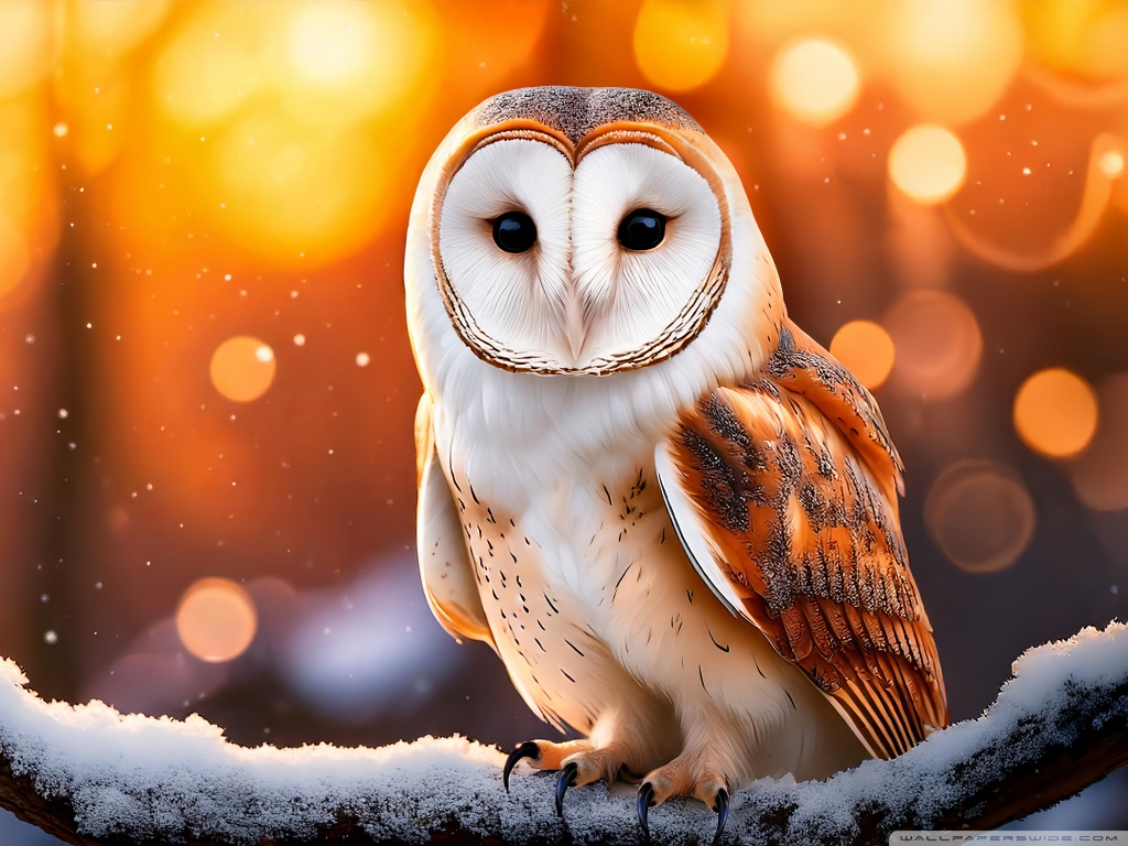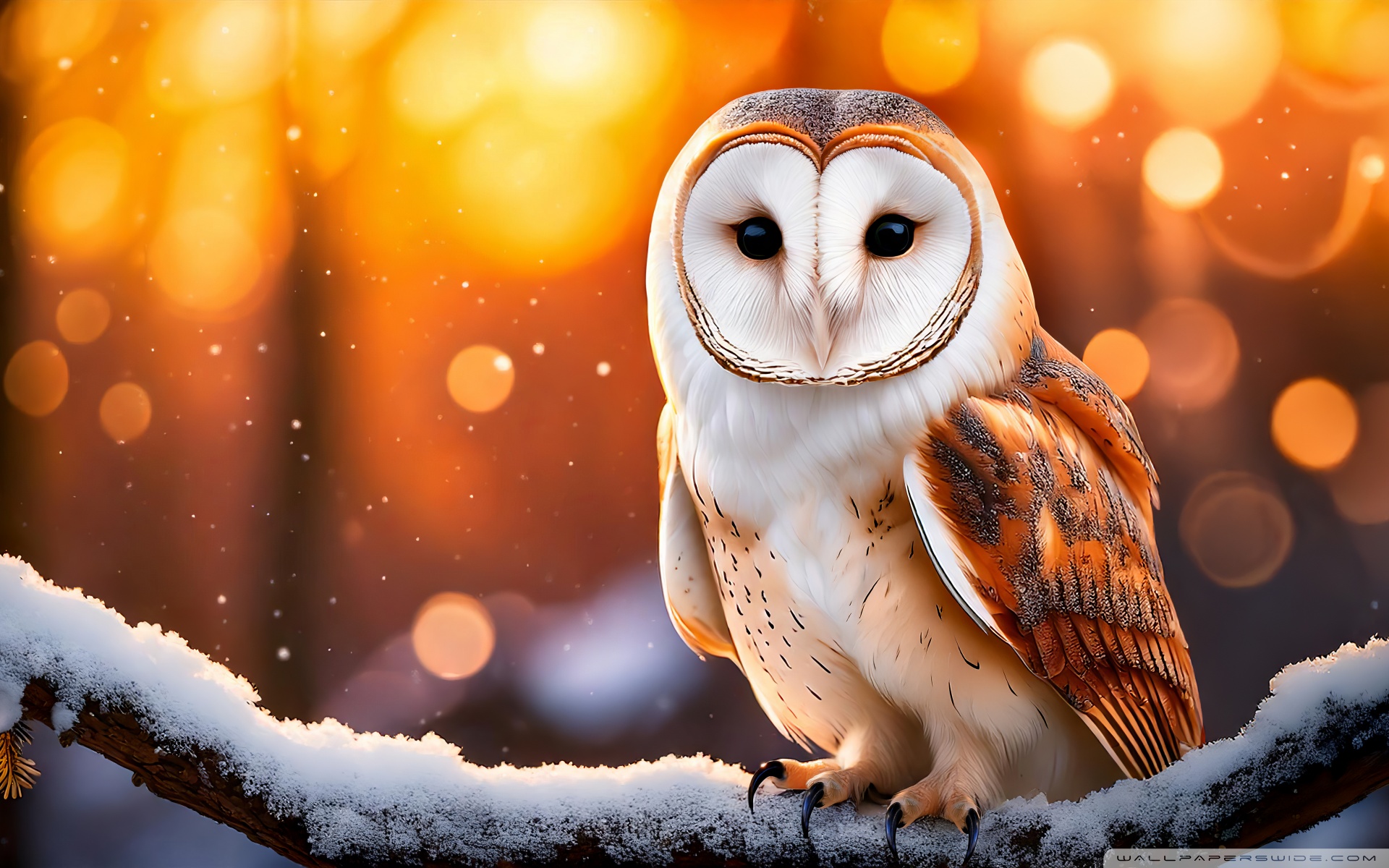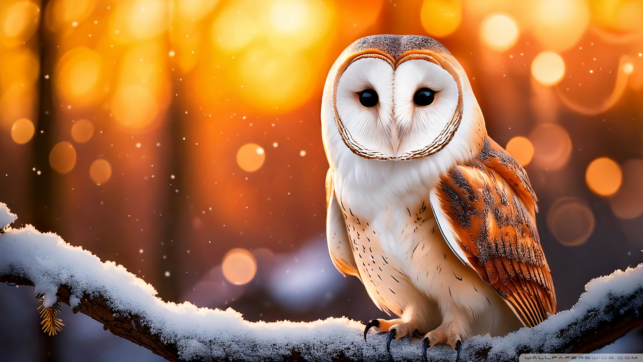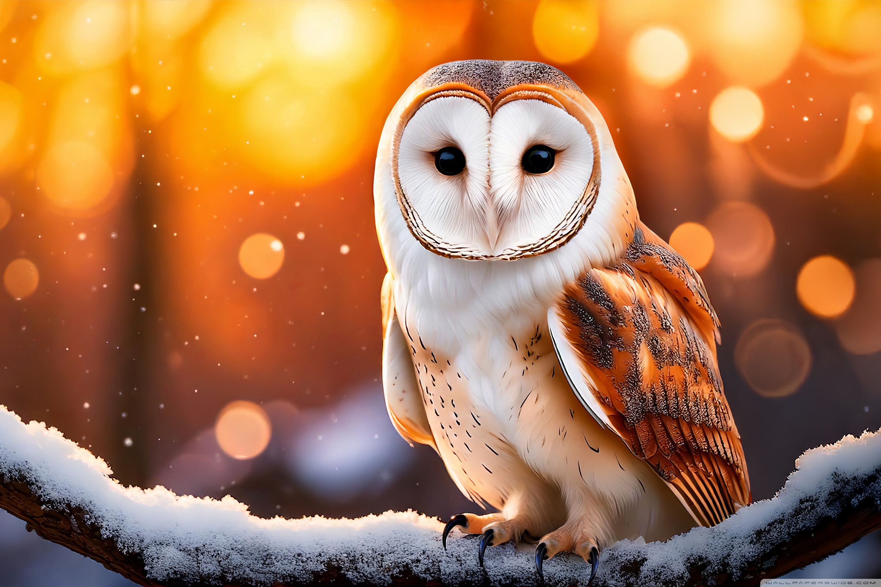 Download Barn Owl Resting on a Snowy Branch in Warm... 4K UHD Wallpaper