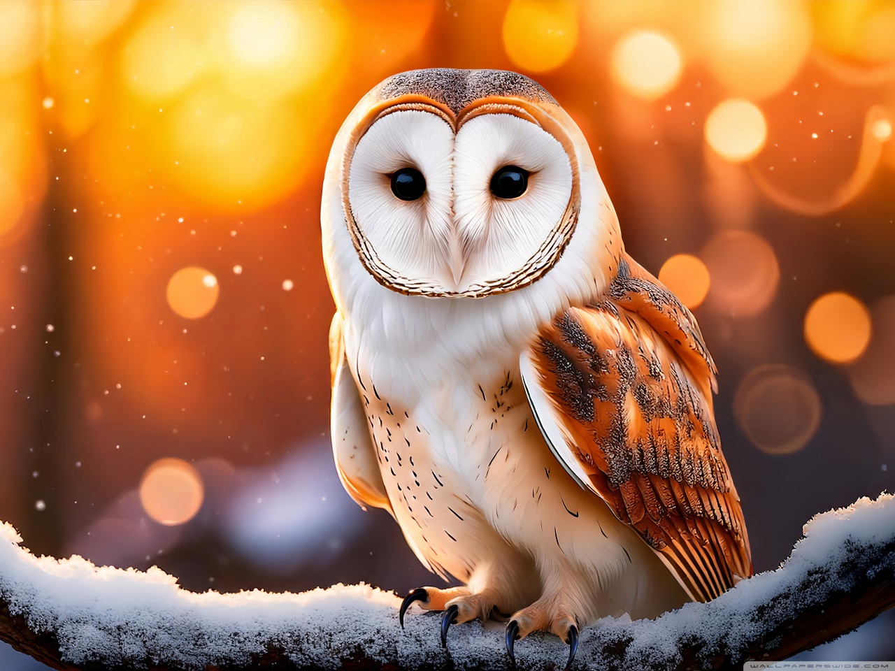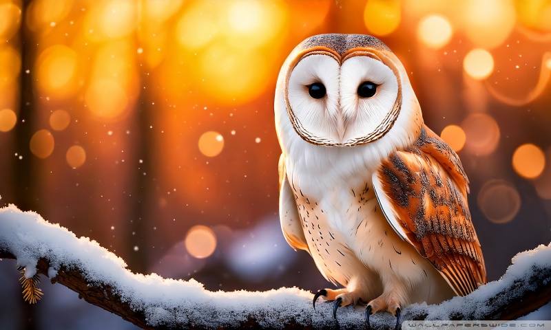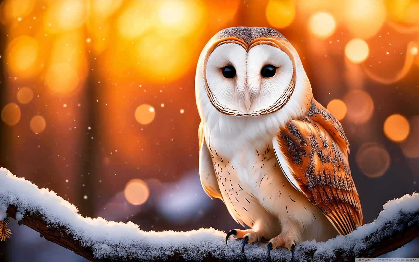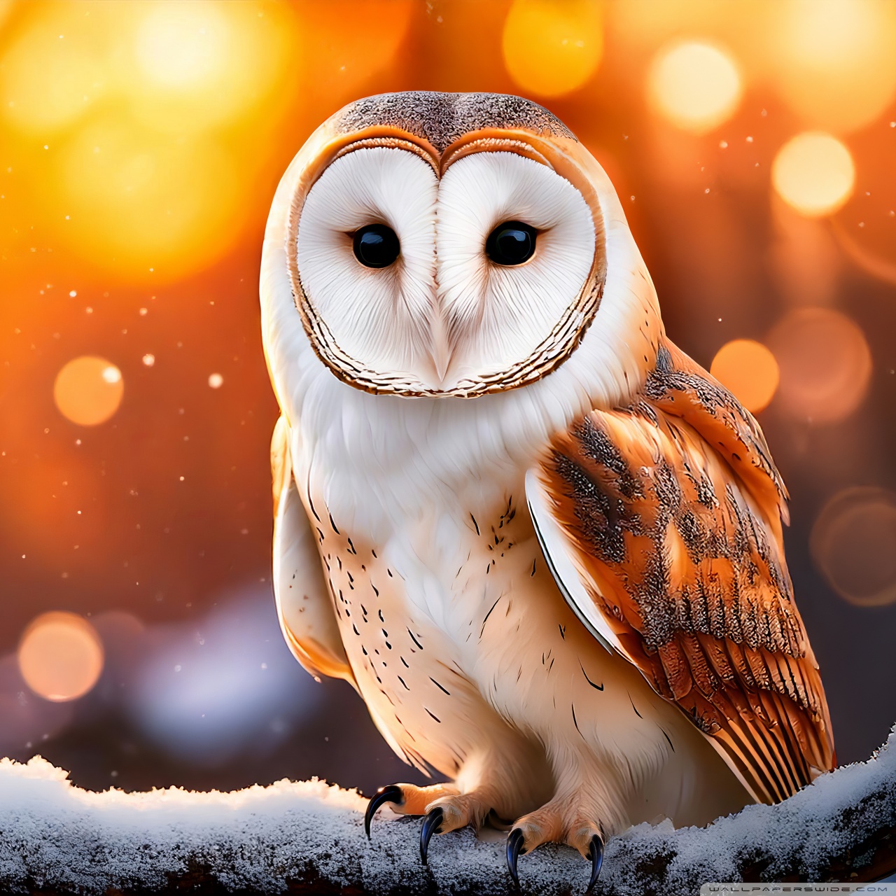 Download Barn Owl Resting on a Snowy Branch in Warm... 4K UHD Wallpaper