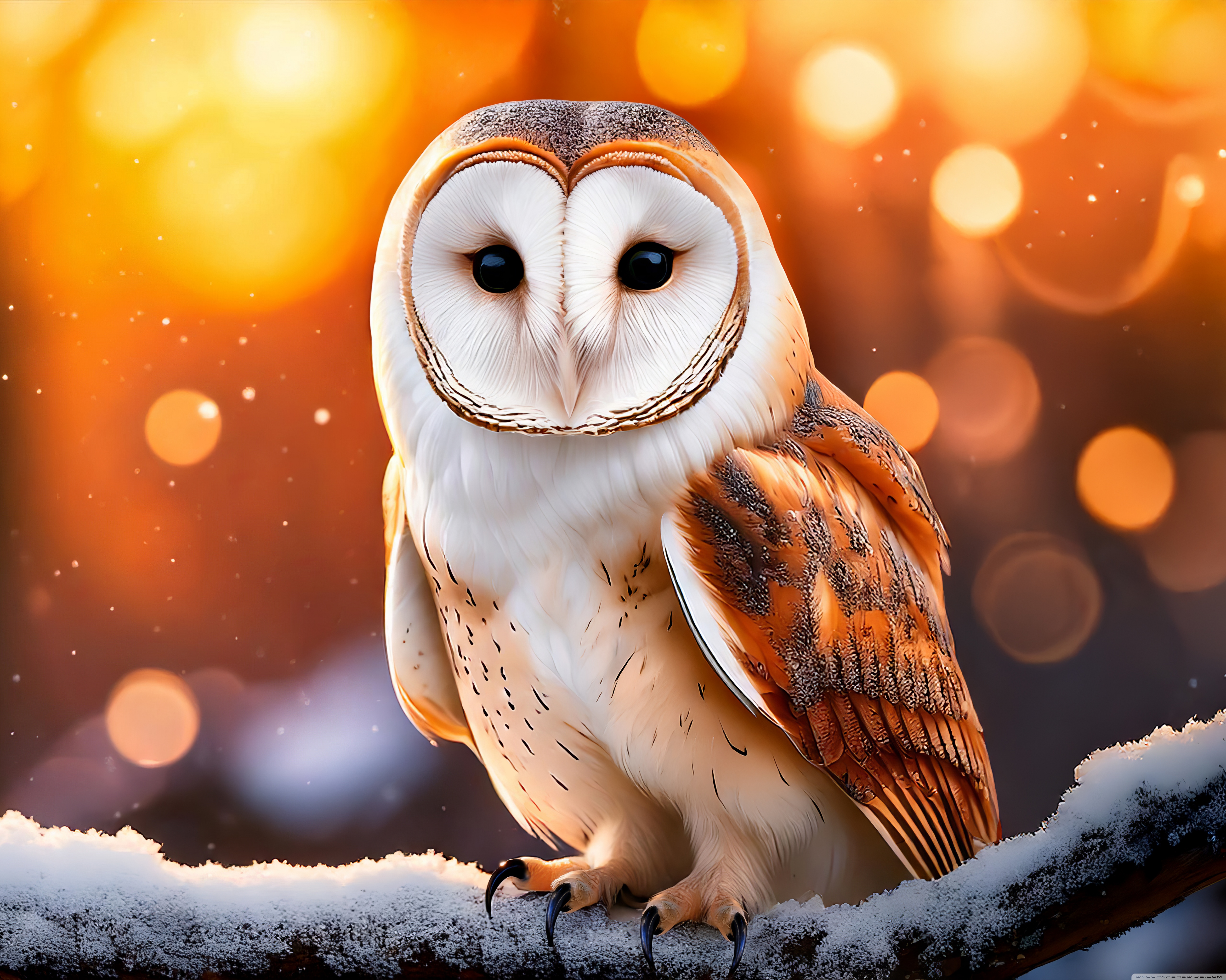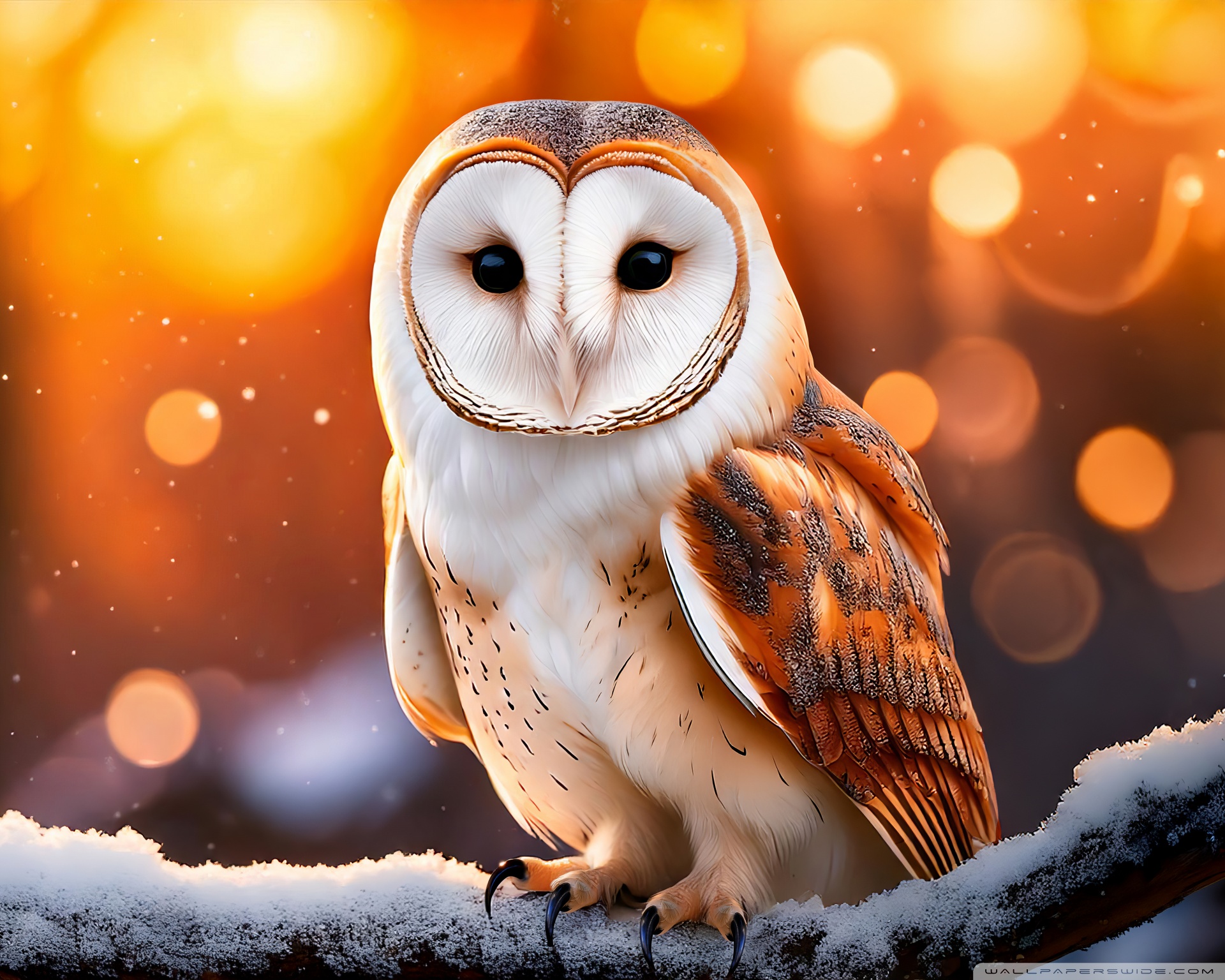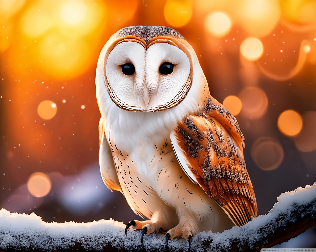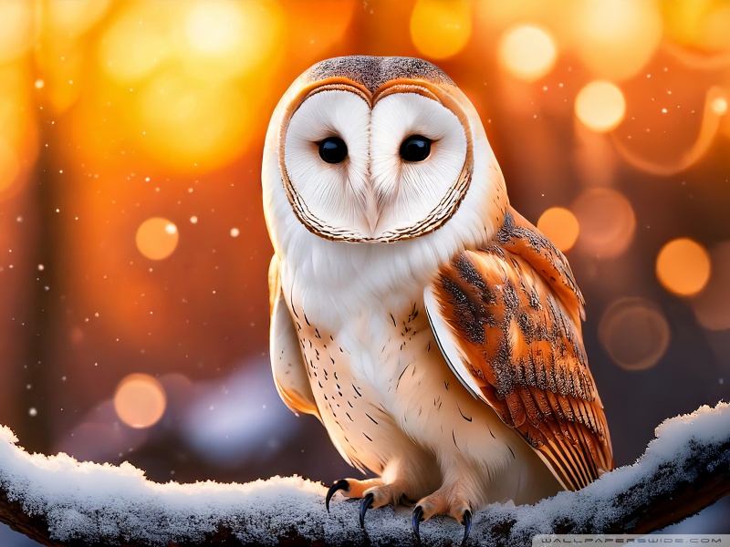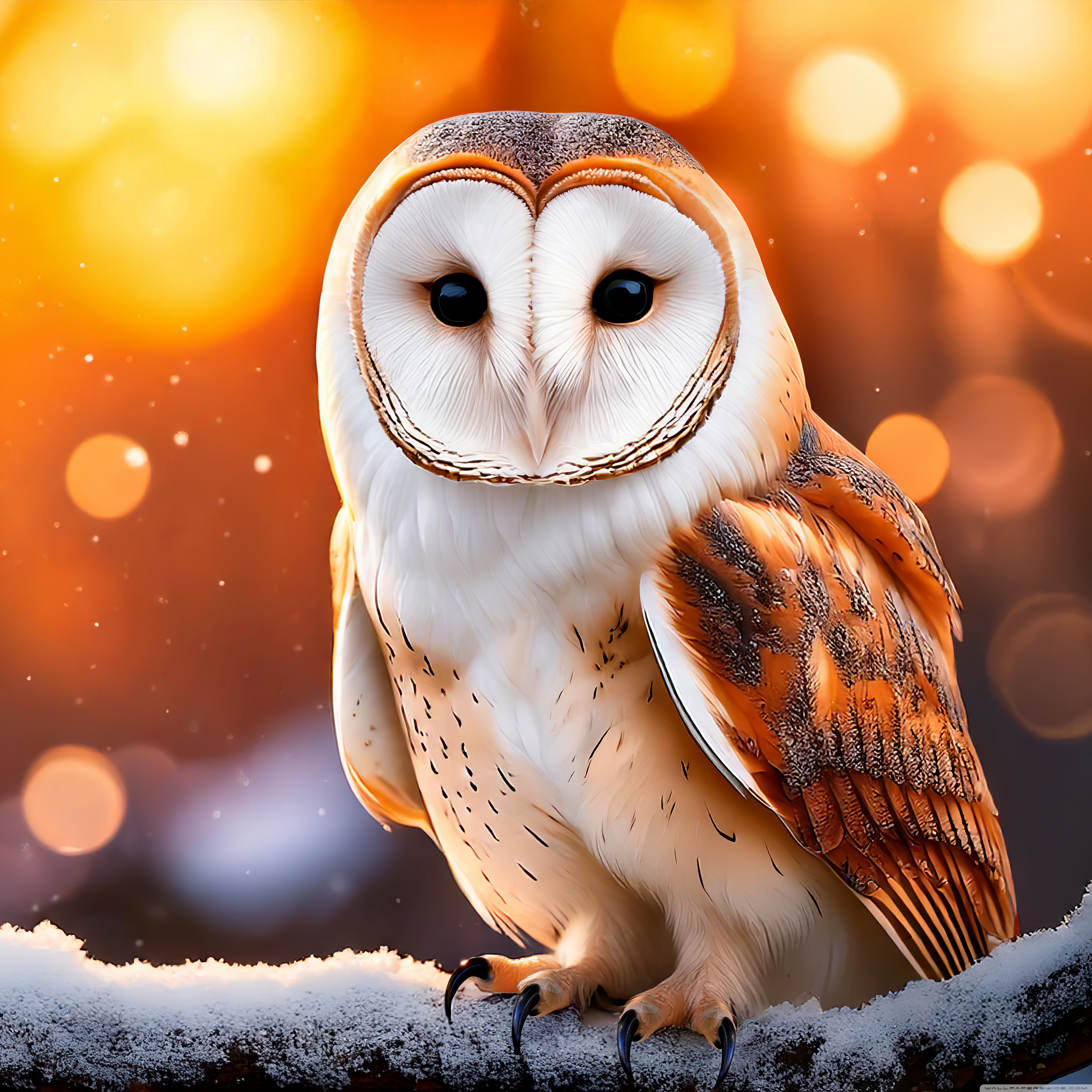 Download Barn Owl Resting on a Snowy Branch in Warm... 4K UHD Wallpaper