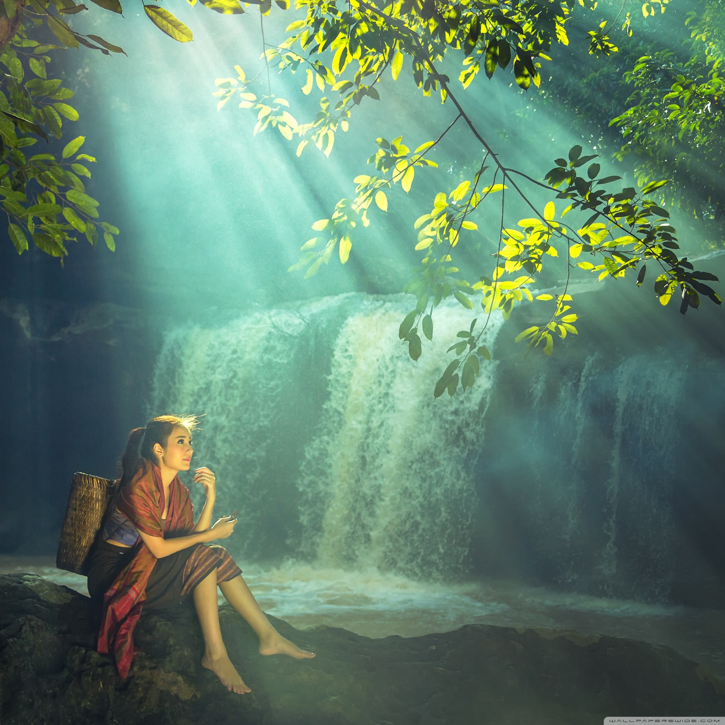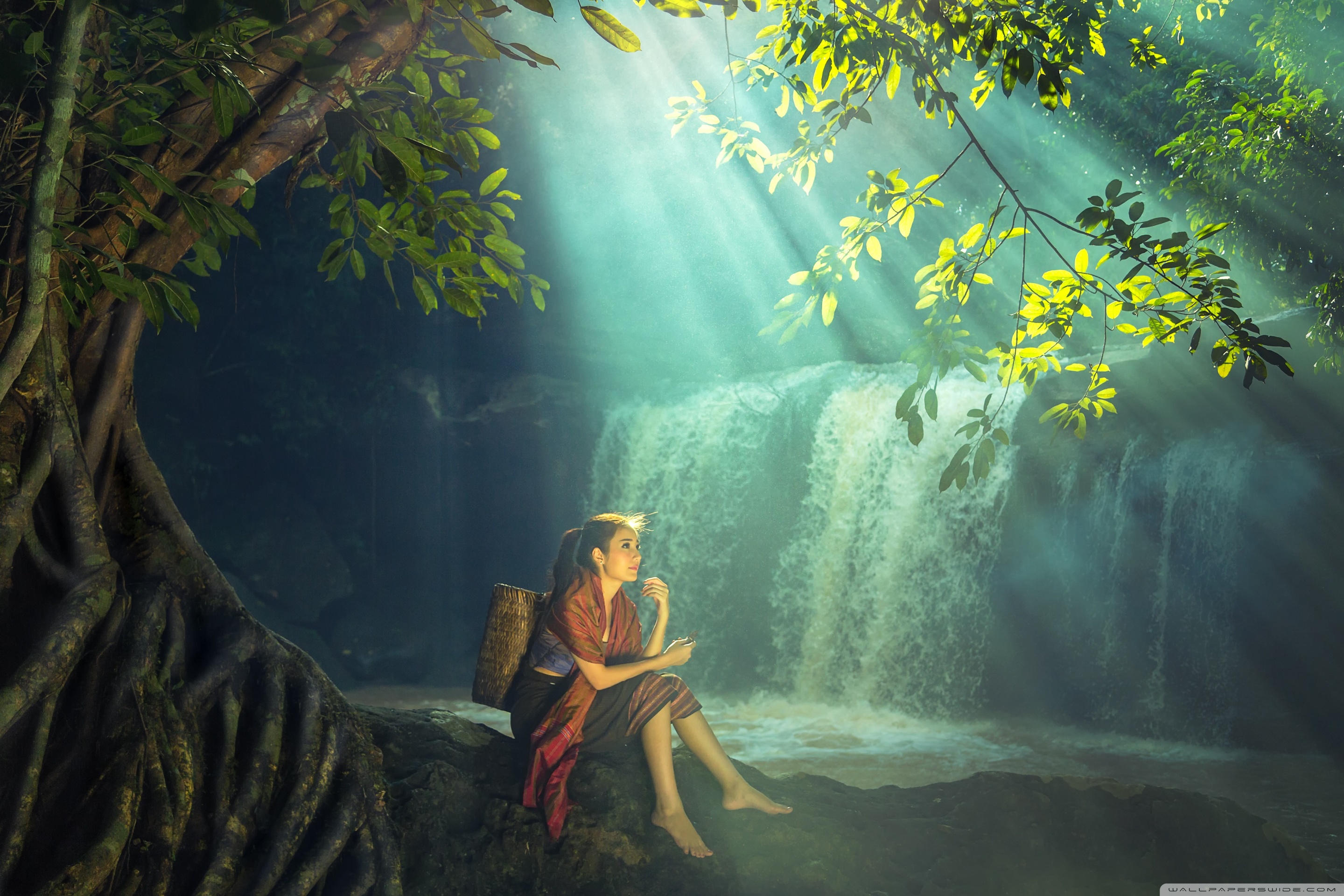 Download Beautiful Asian Girl, Rainforest, Waterfall 4K UHD Wallpaper