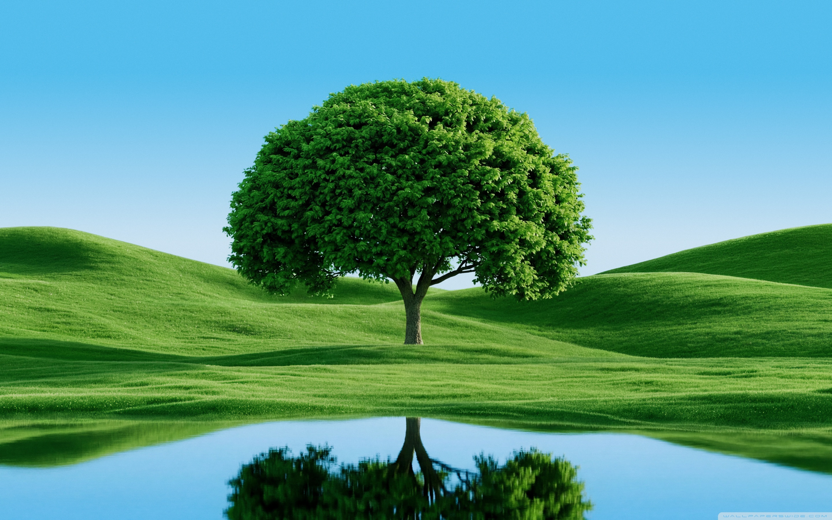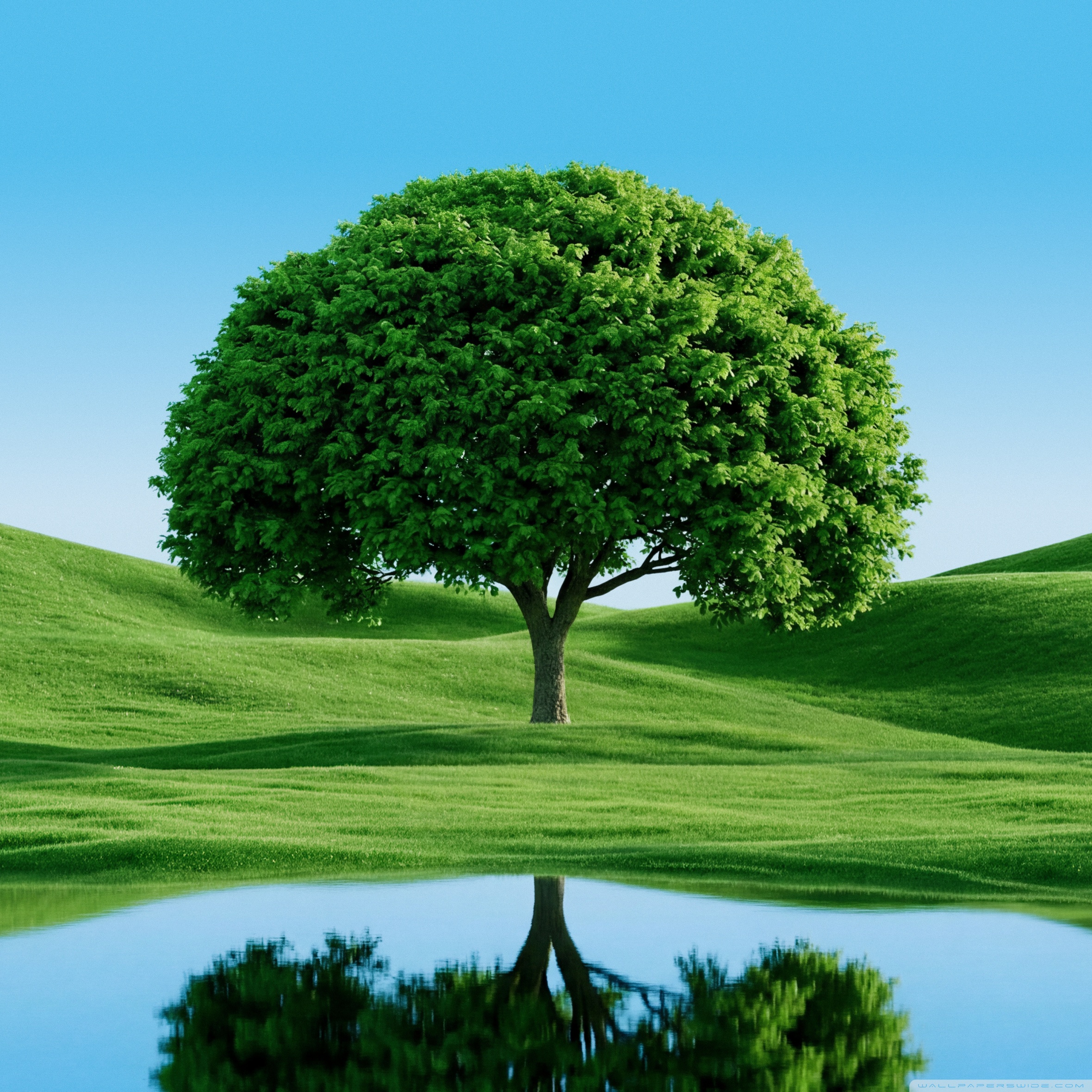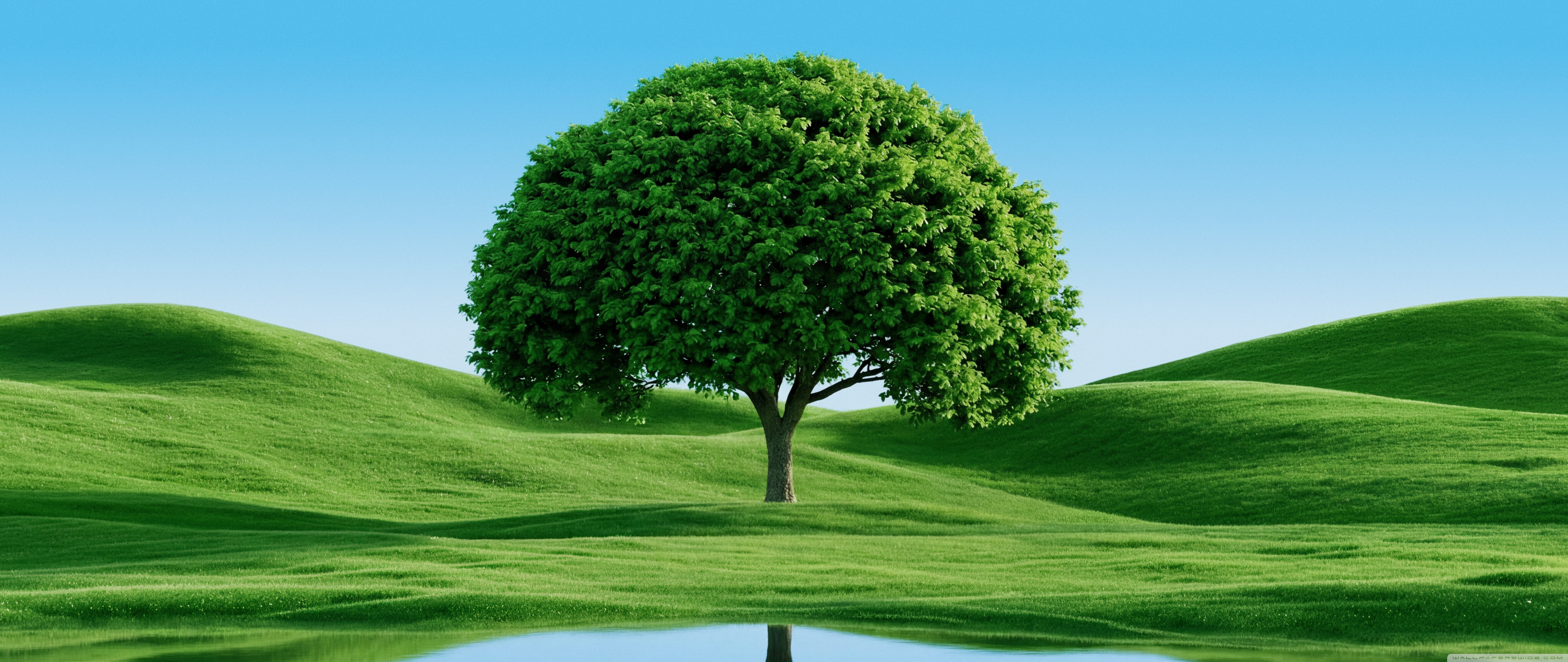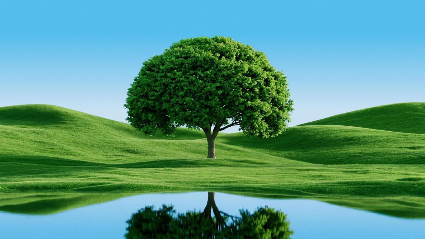 Download Beautiful Green Tree by Hills and Lake 4K UHD Wallpaper