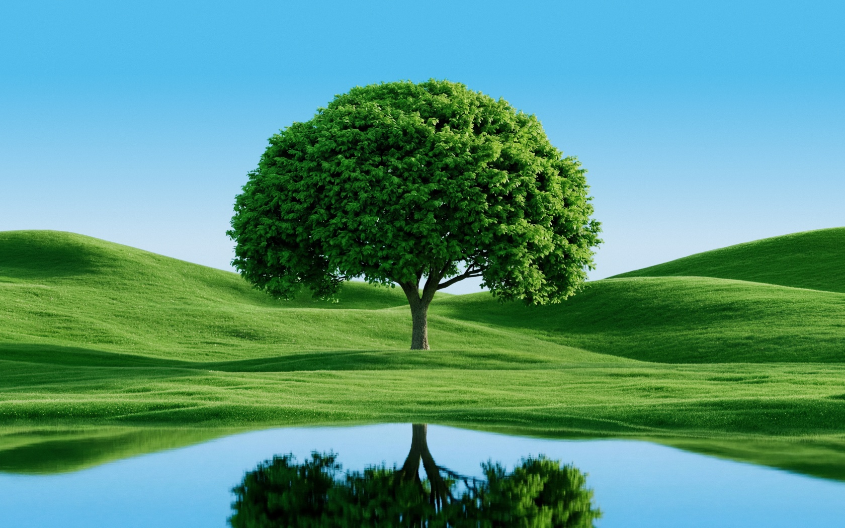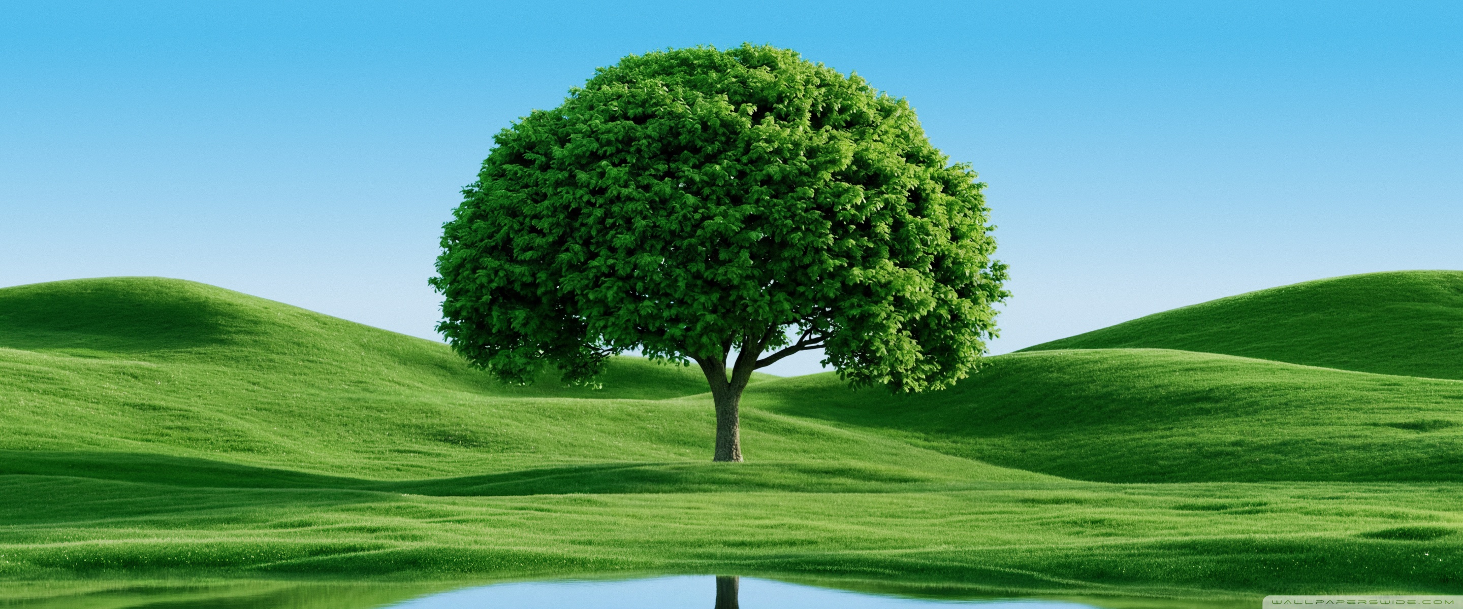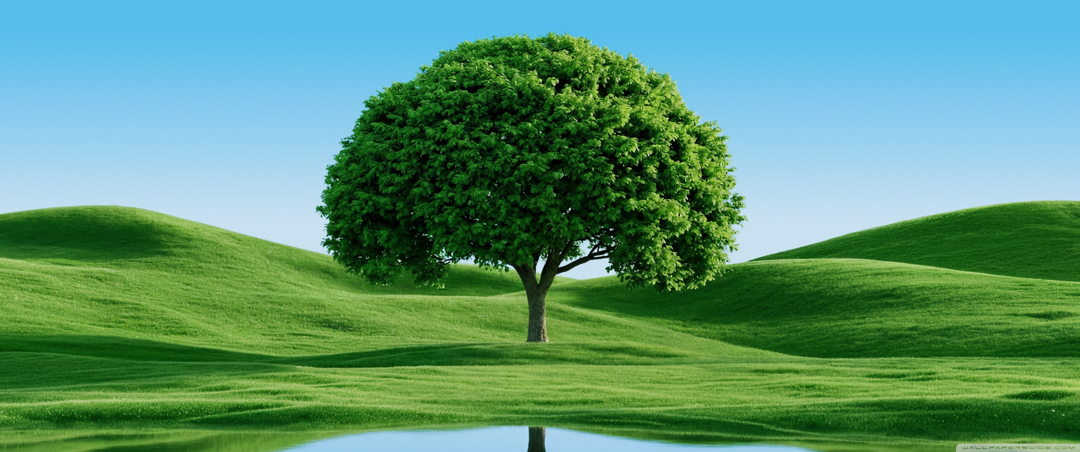 Download Beautiful Green Tree by Hills and Lake 4K UHD Wallpaper