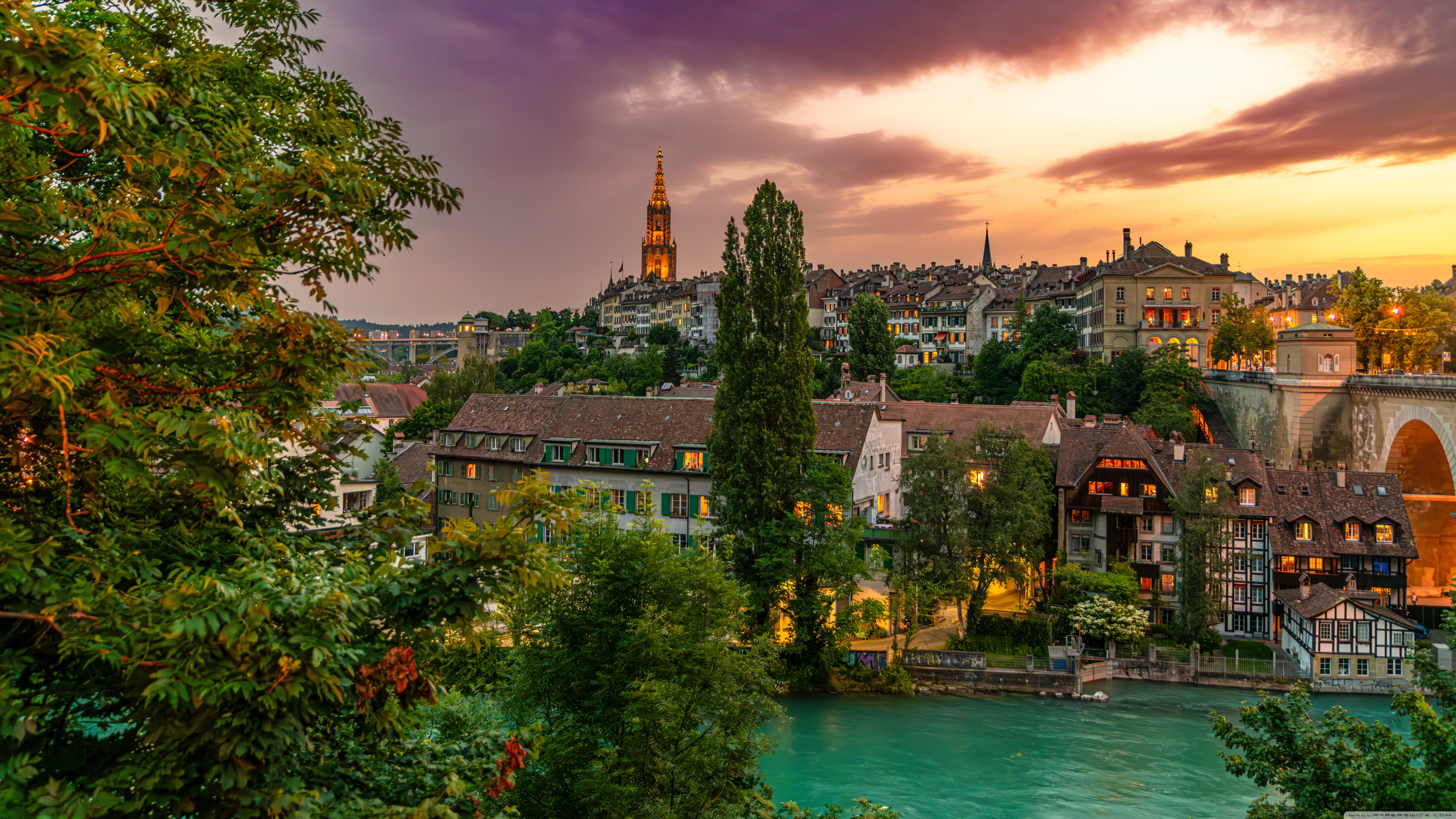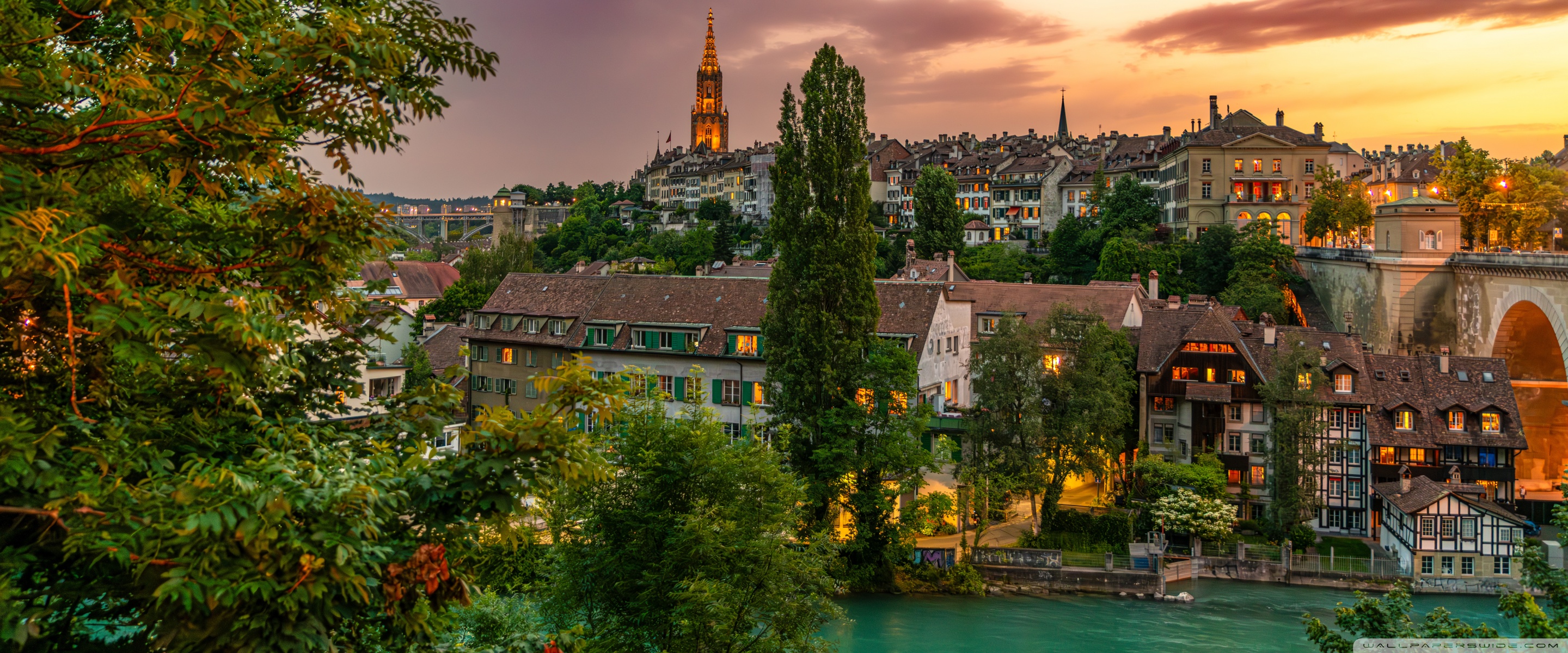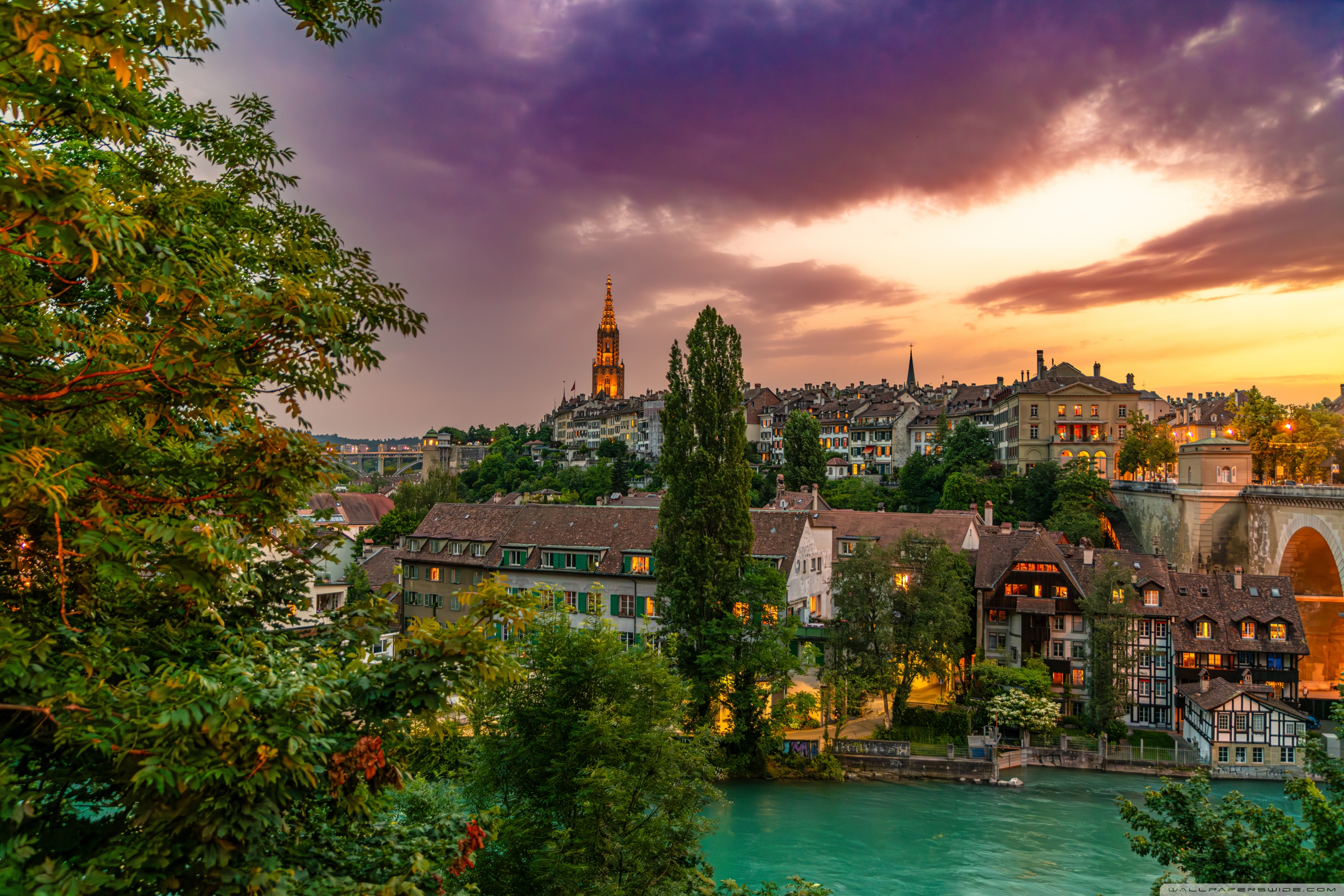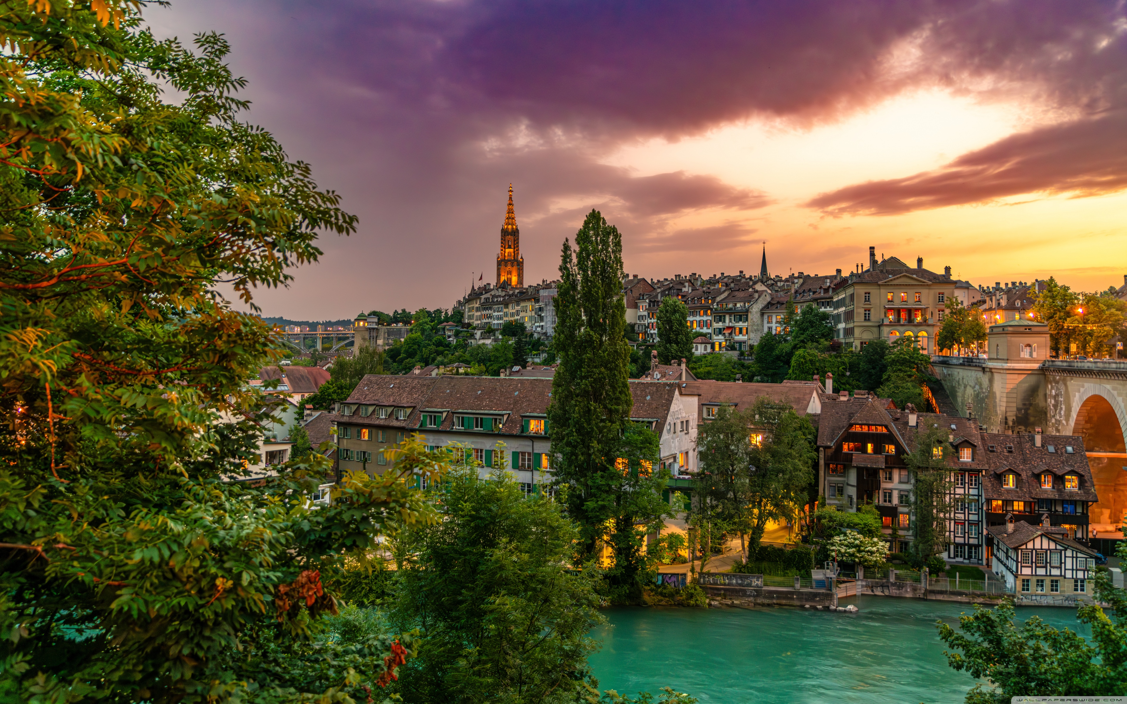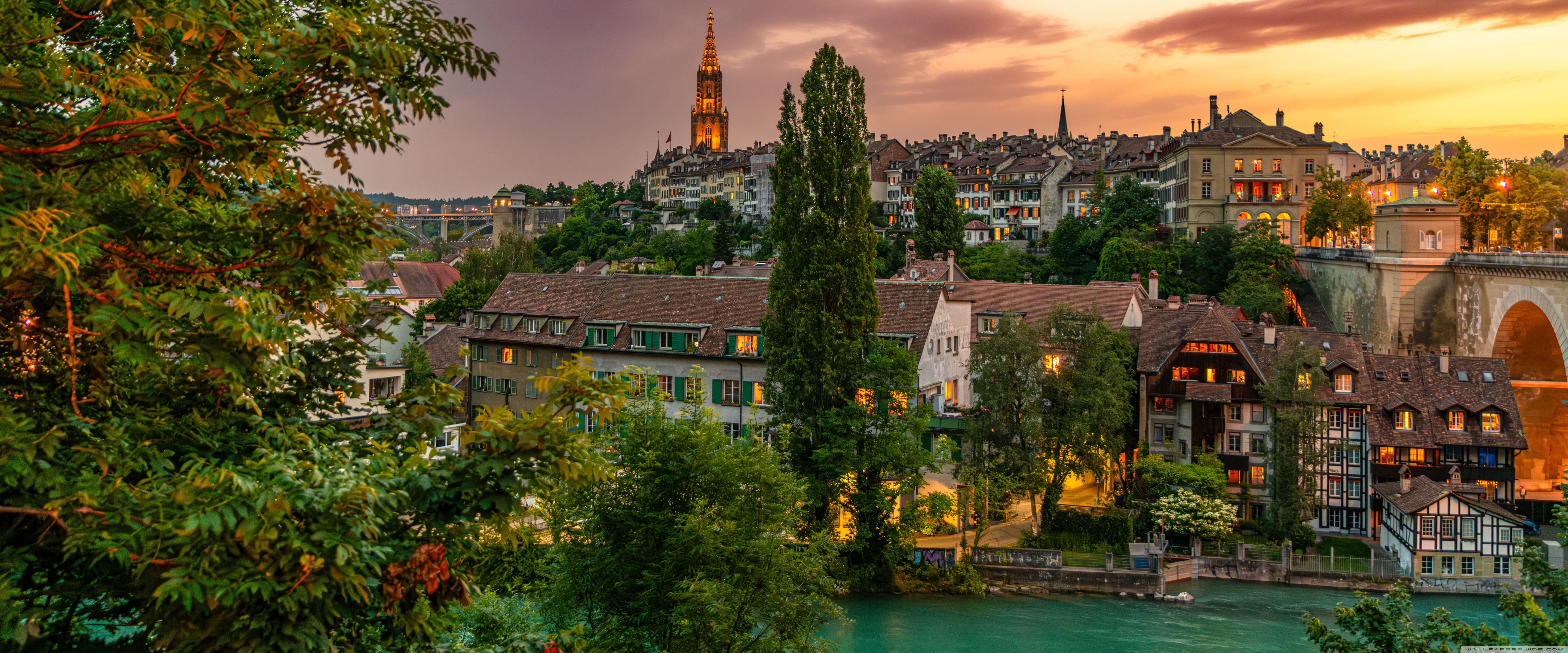 Download Bern, Switzerland, Aare River Sunset Panorama 4K UHD Wallpaper