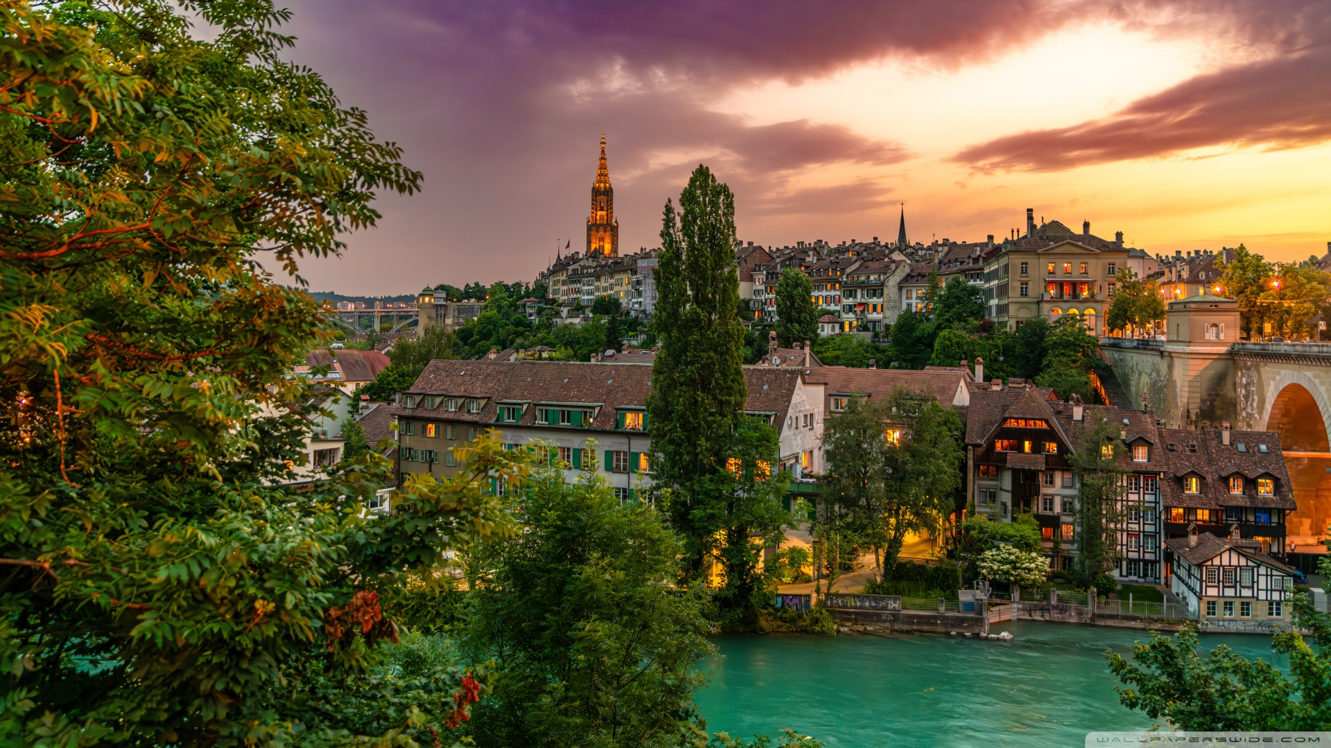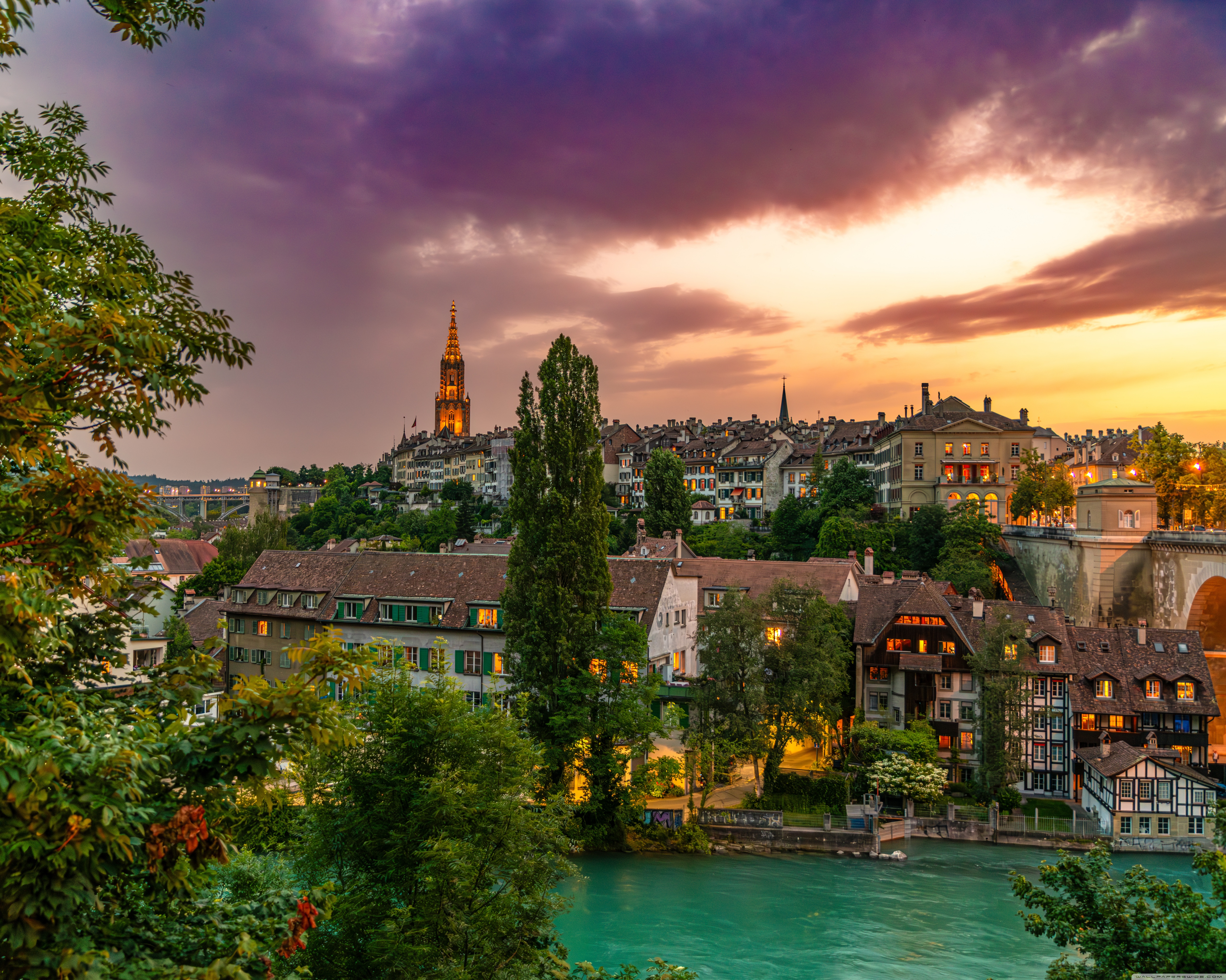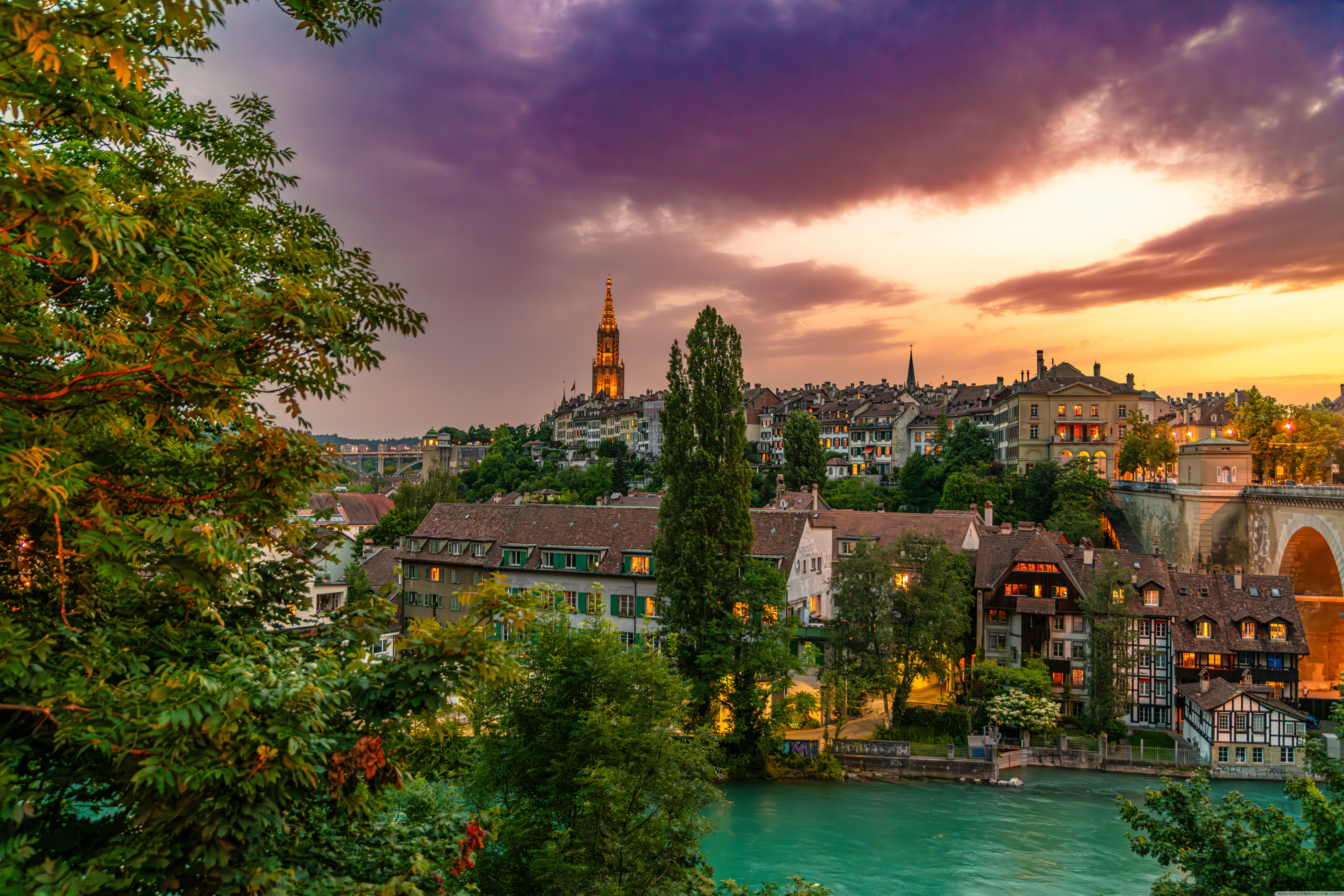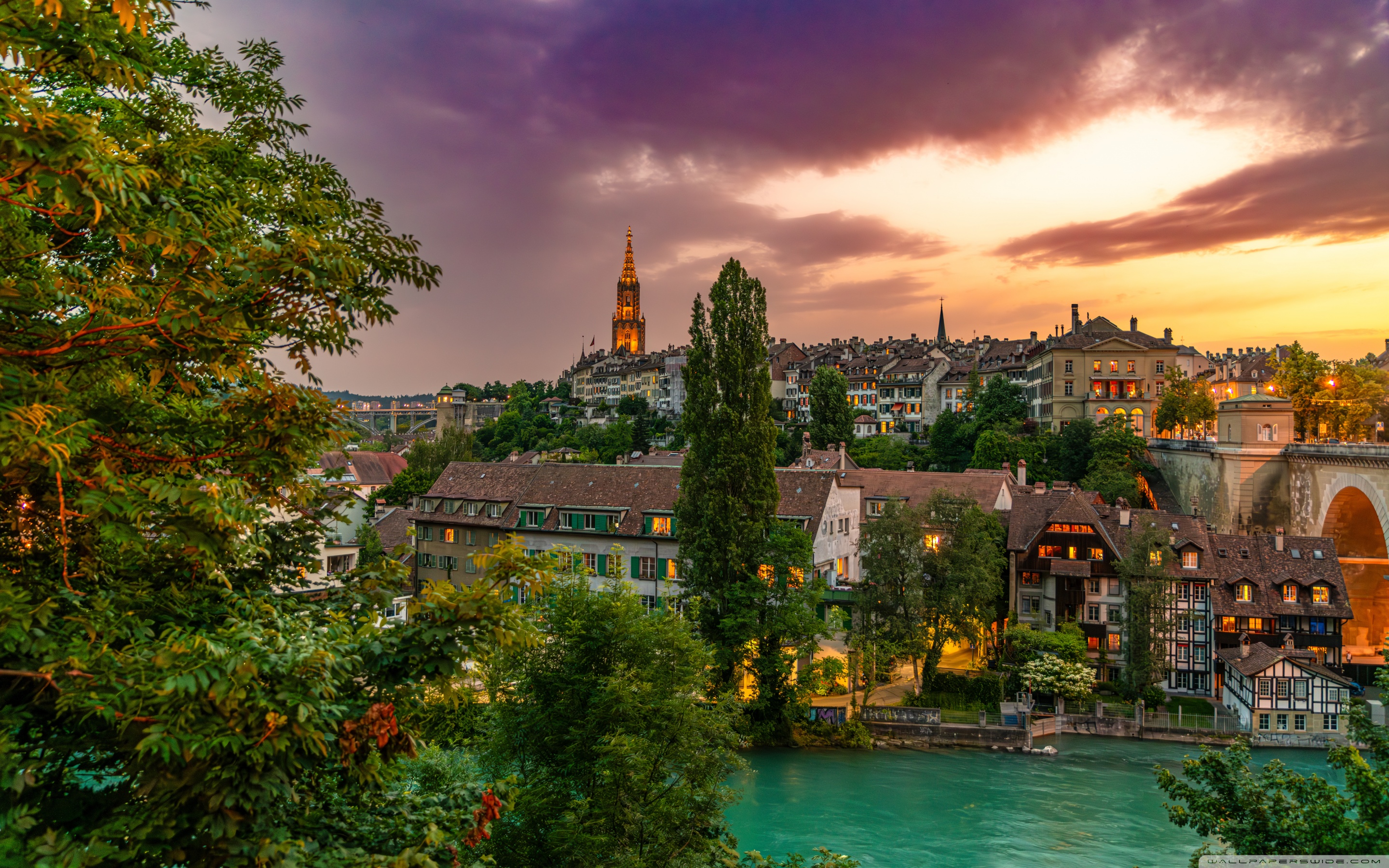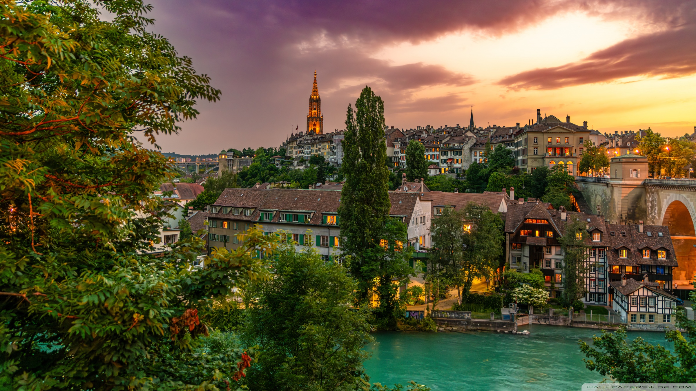 Download Bern, Switzerland, Aare River Sunset Panorama 4K UHD Wallpaper