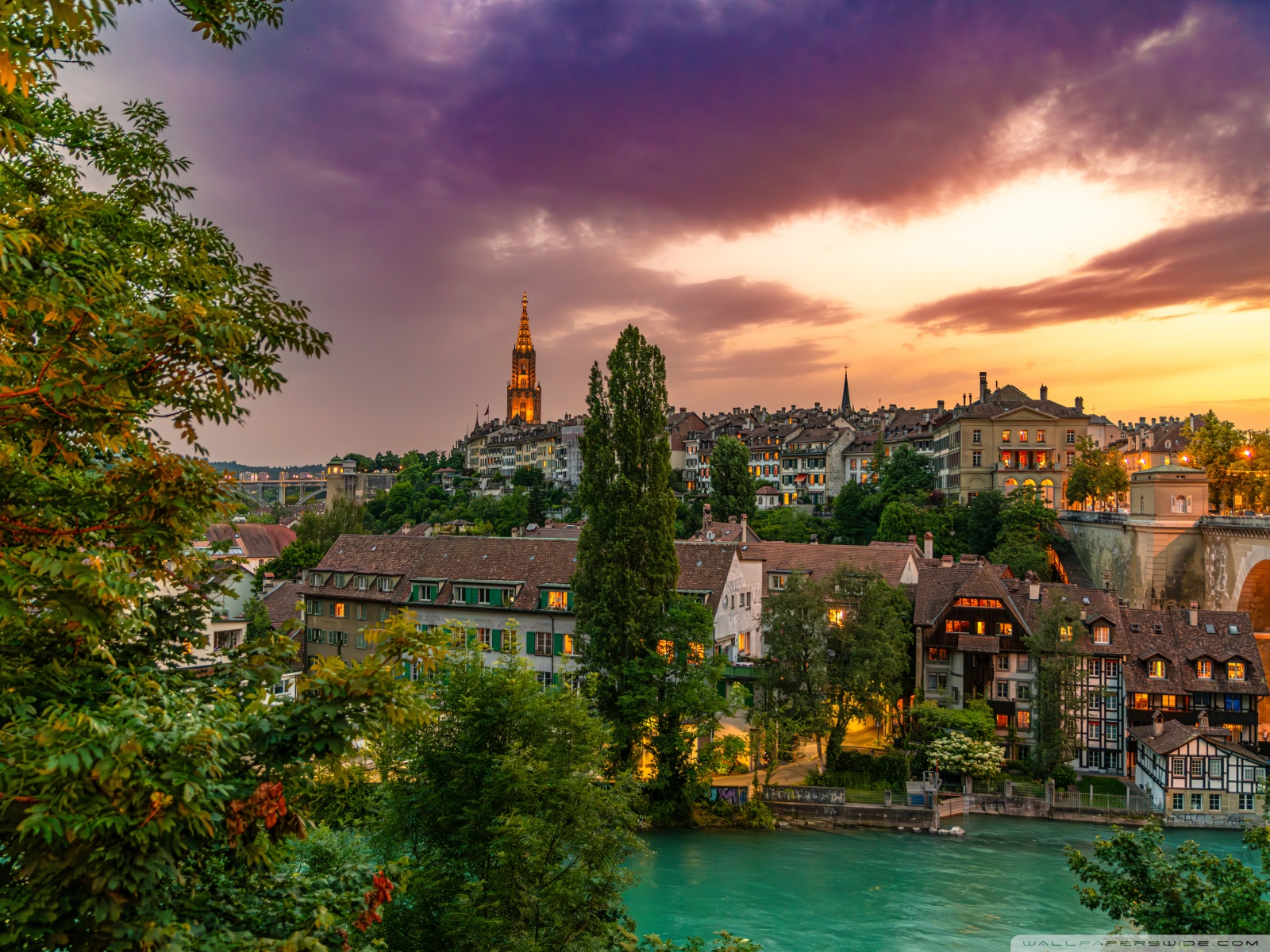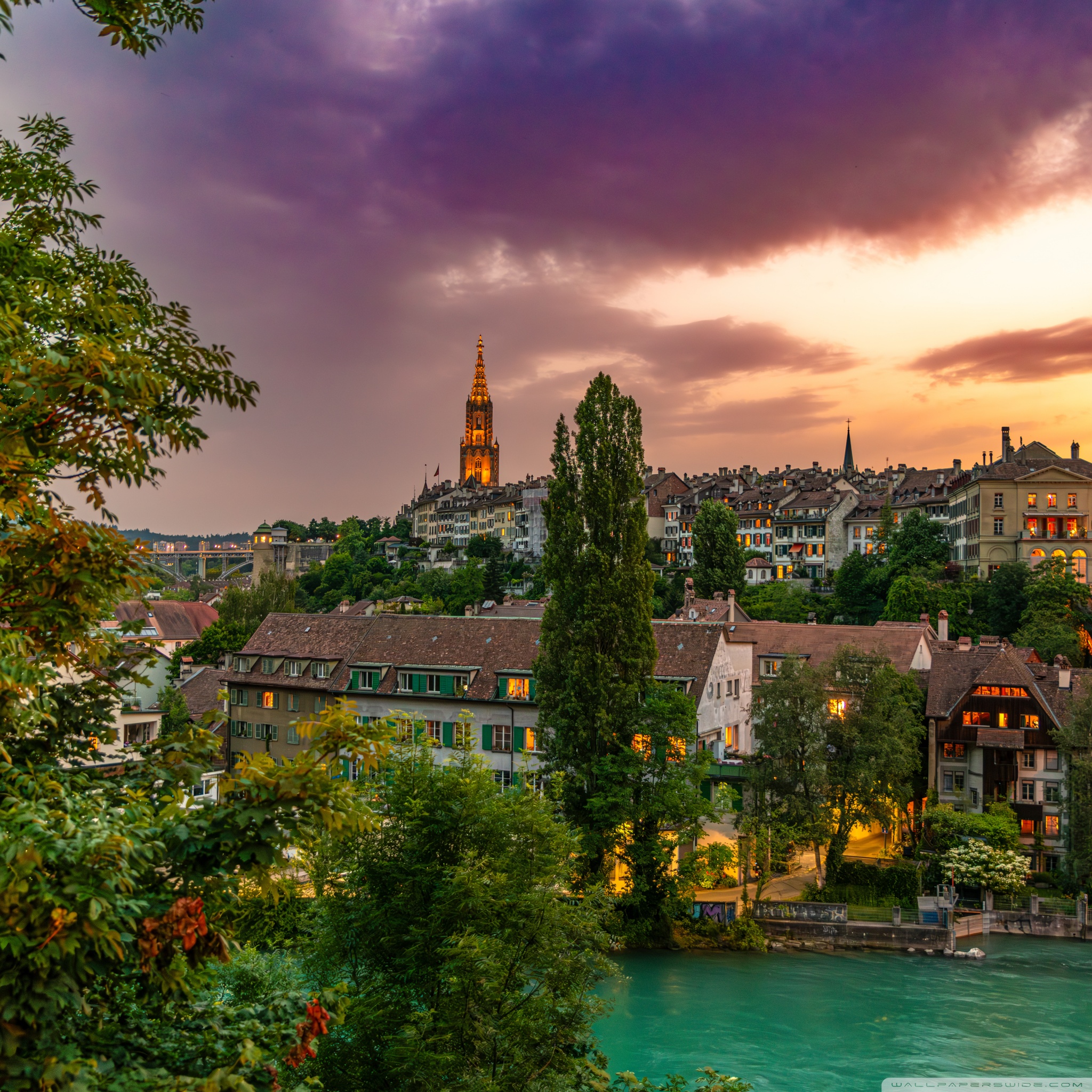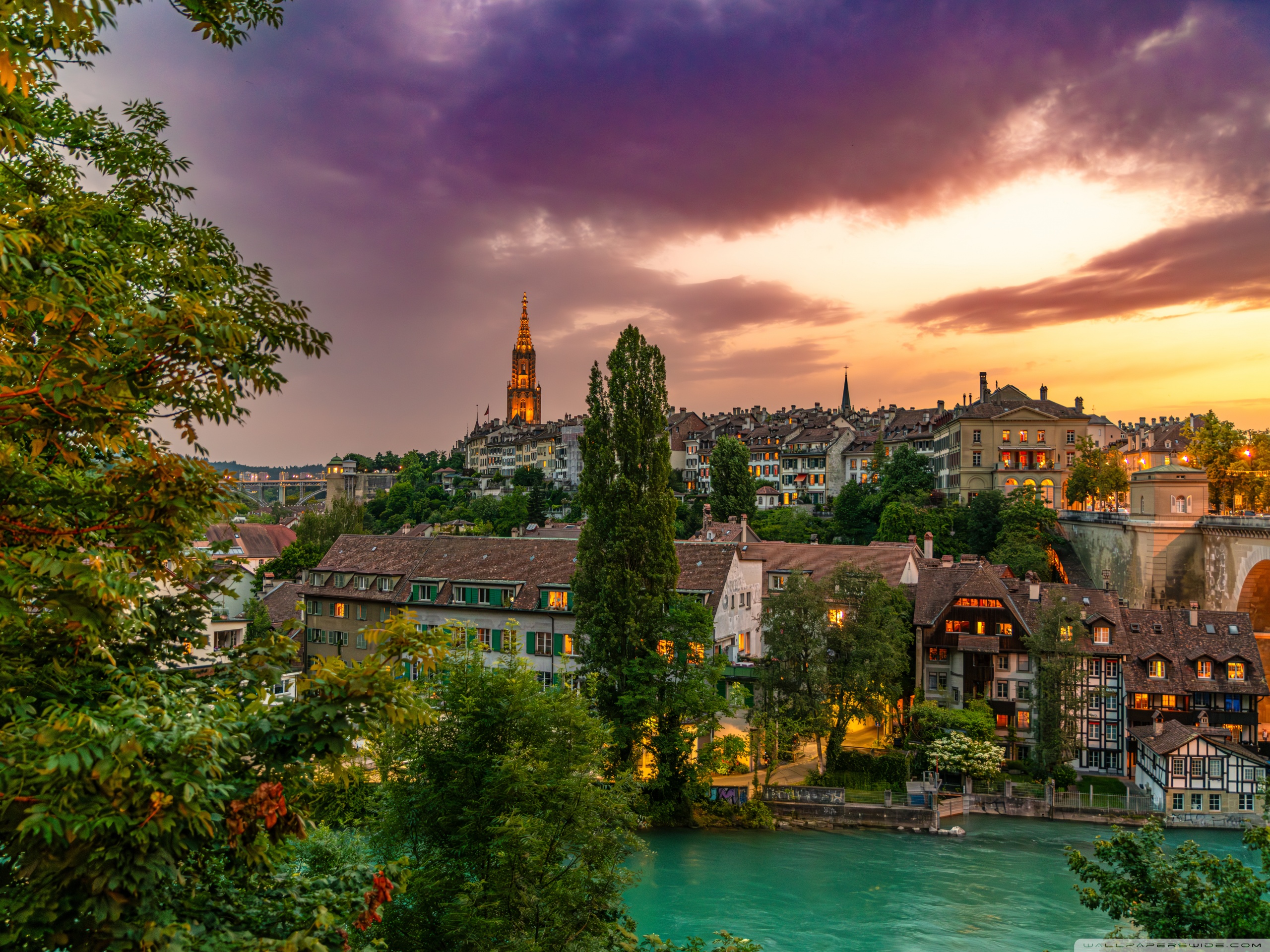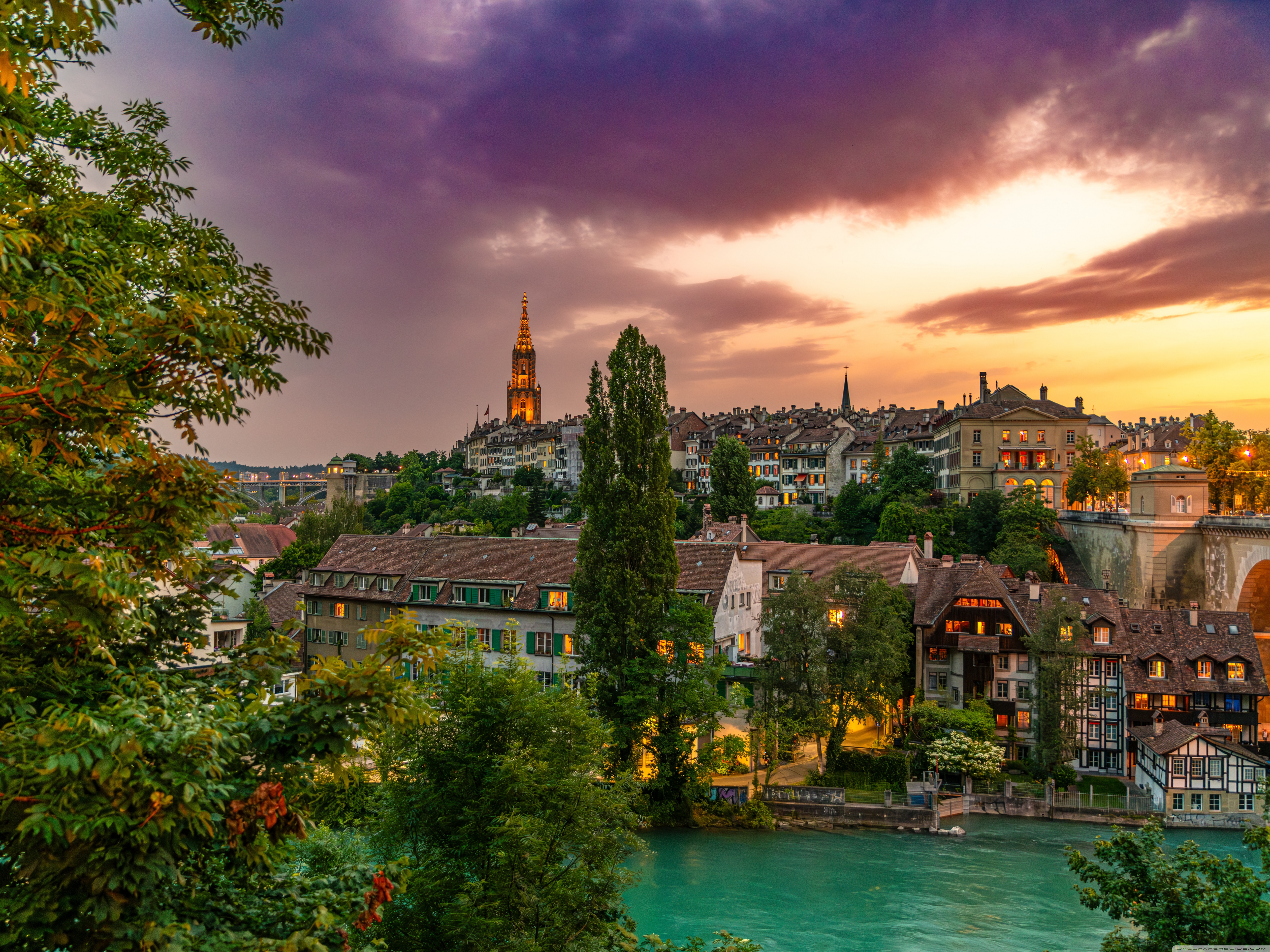 Download Bern, Switzerland, Aare River Sunset Panorama 4K UHD Wallpaper