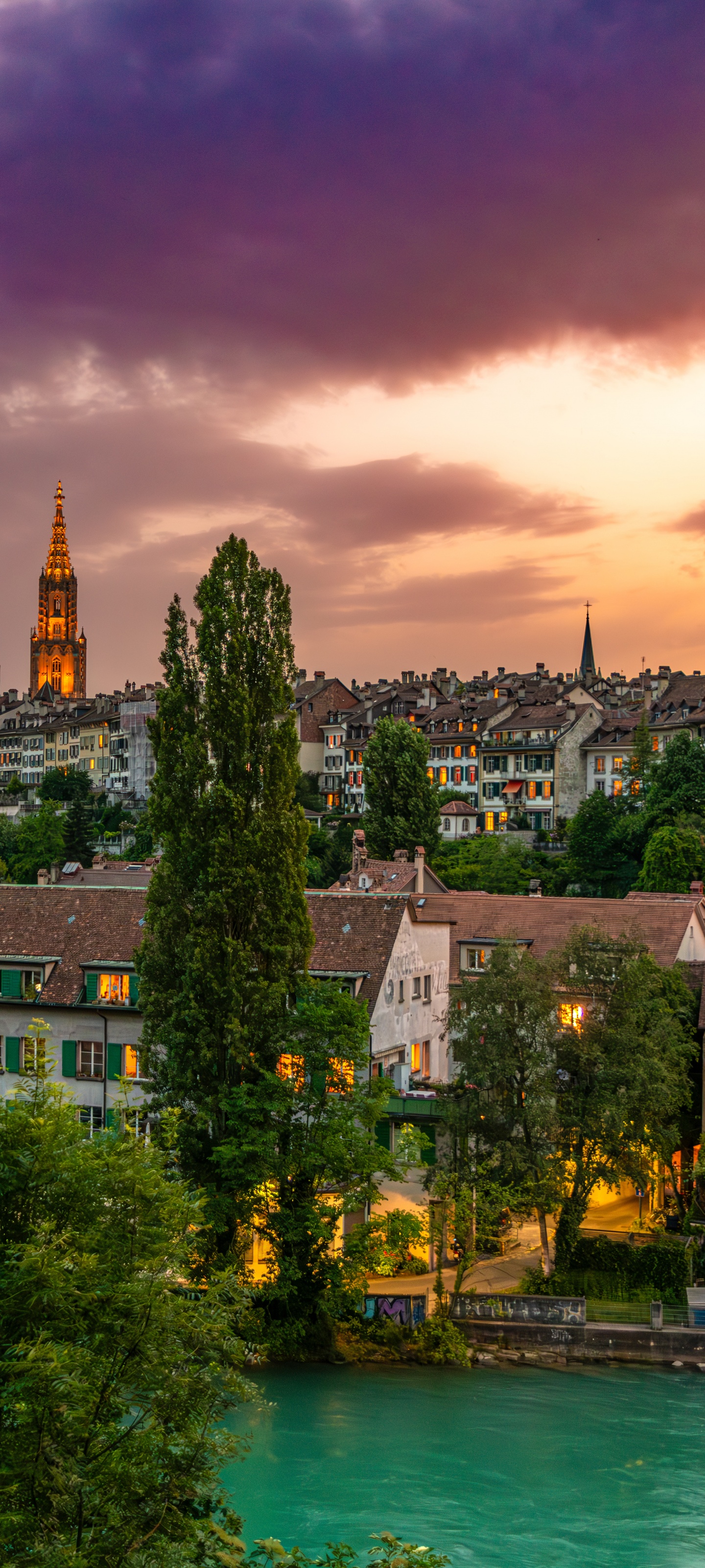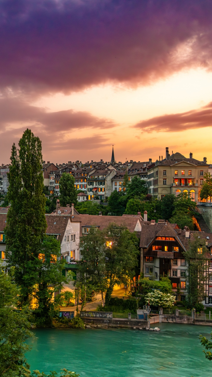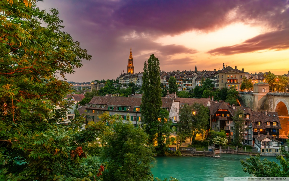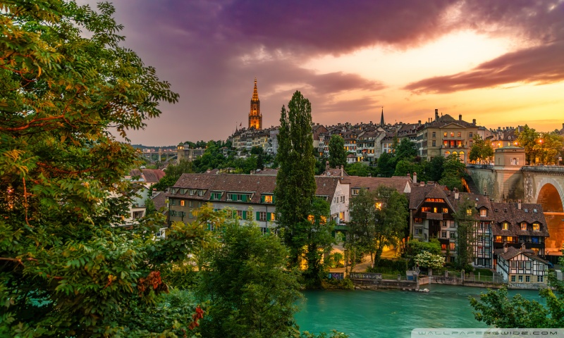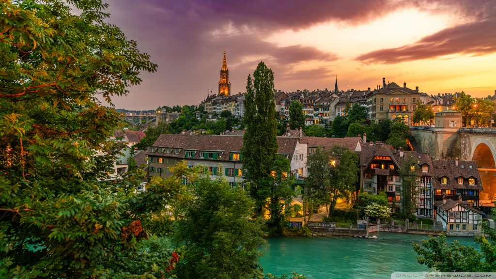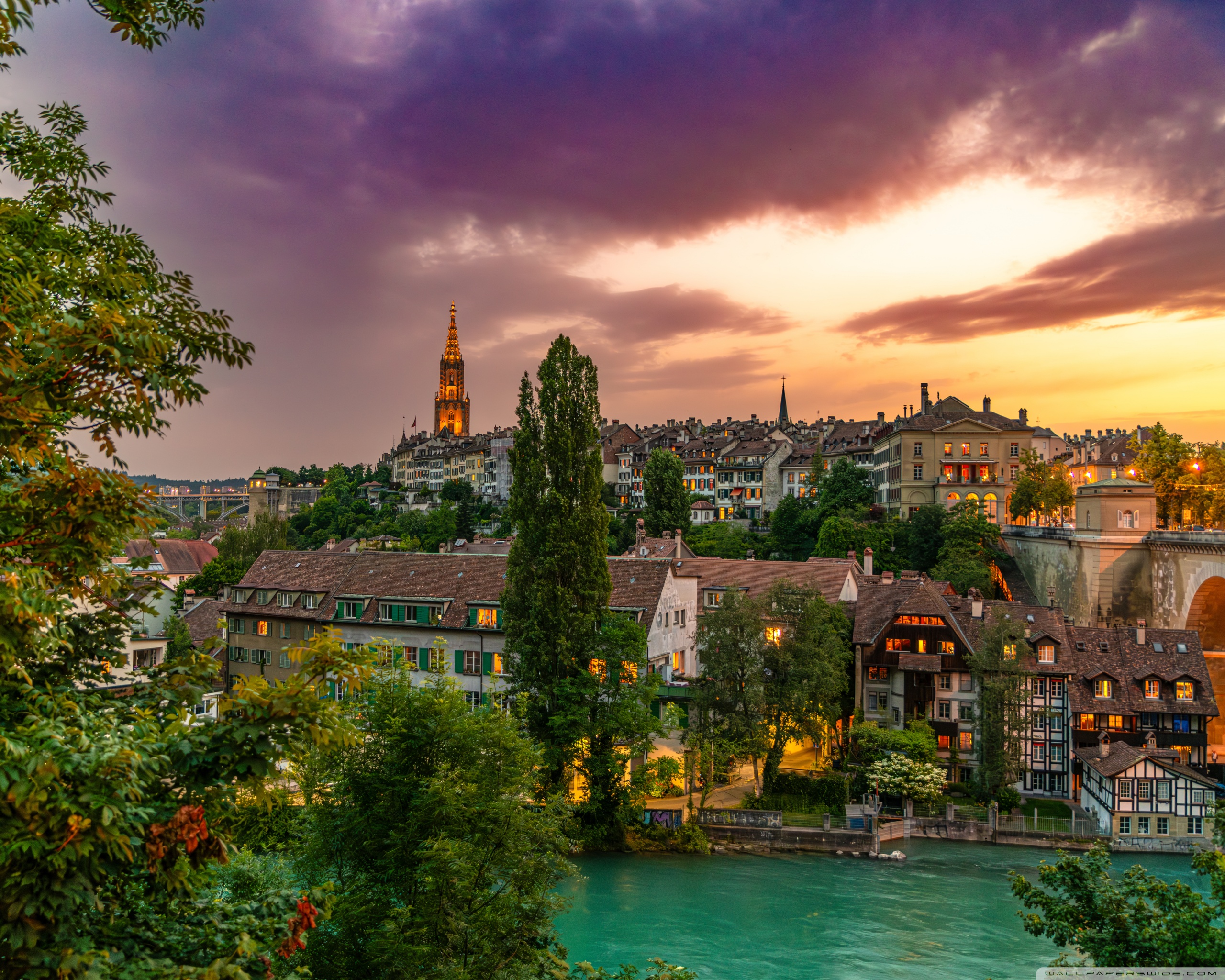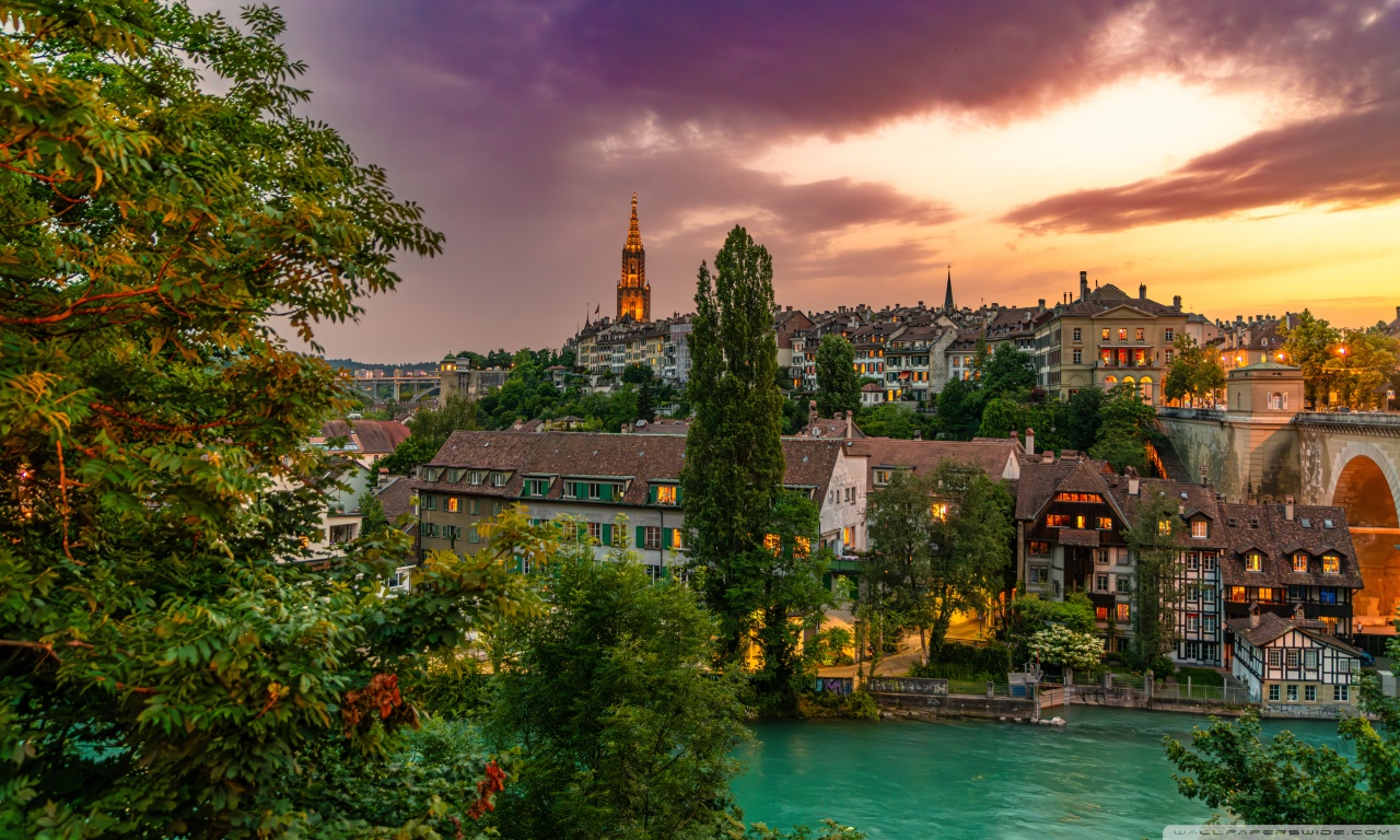 Download Bern, Switzerland, Aare River Sunset Panorama 4K UHD Wallpaper