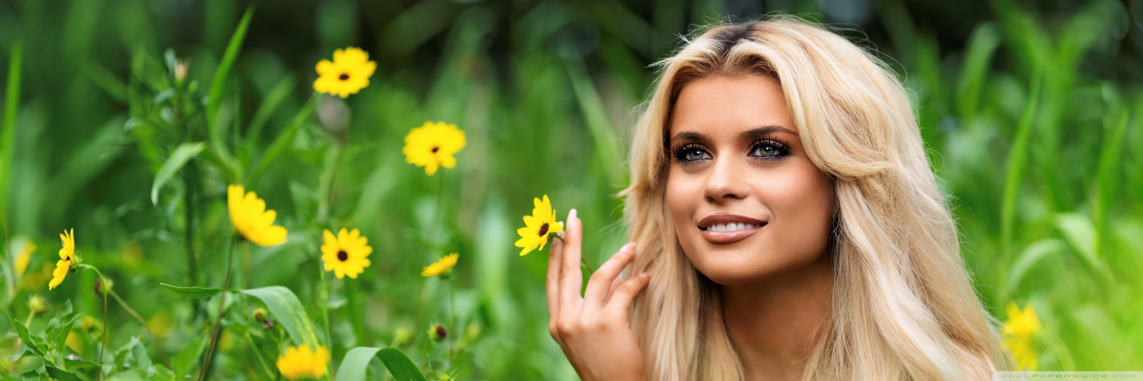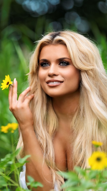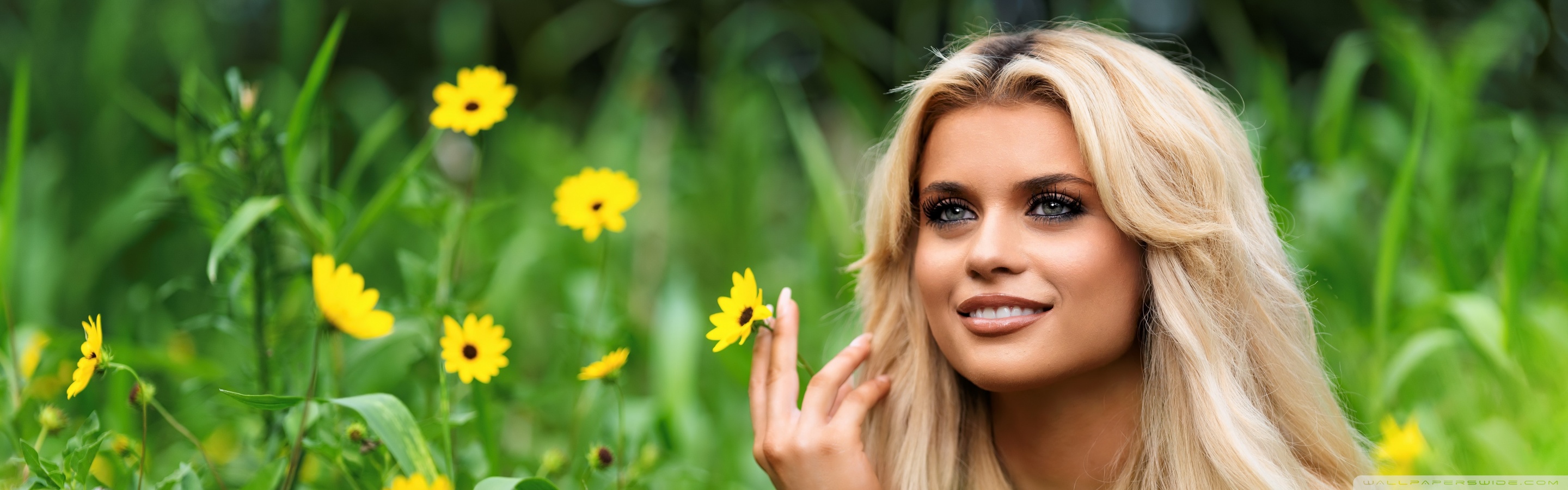 Download Blonde Girl in a Blooming Flower Field 4K UHD Wallpaper