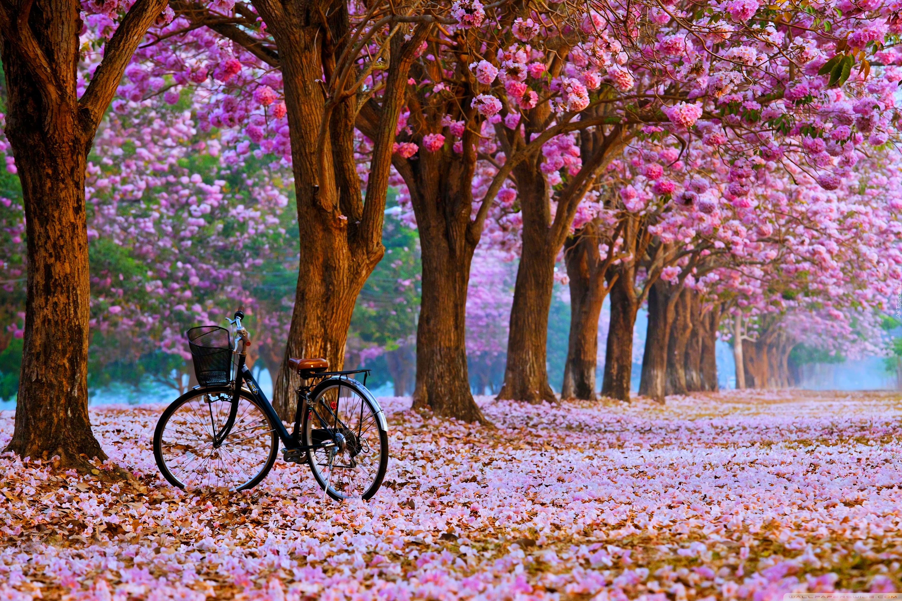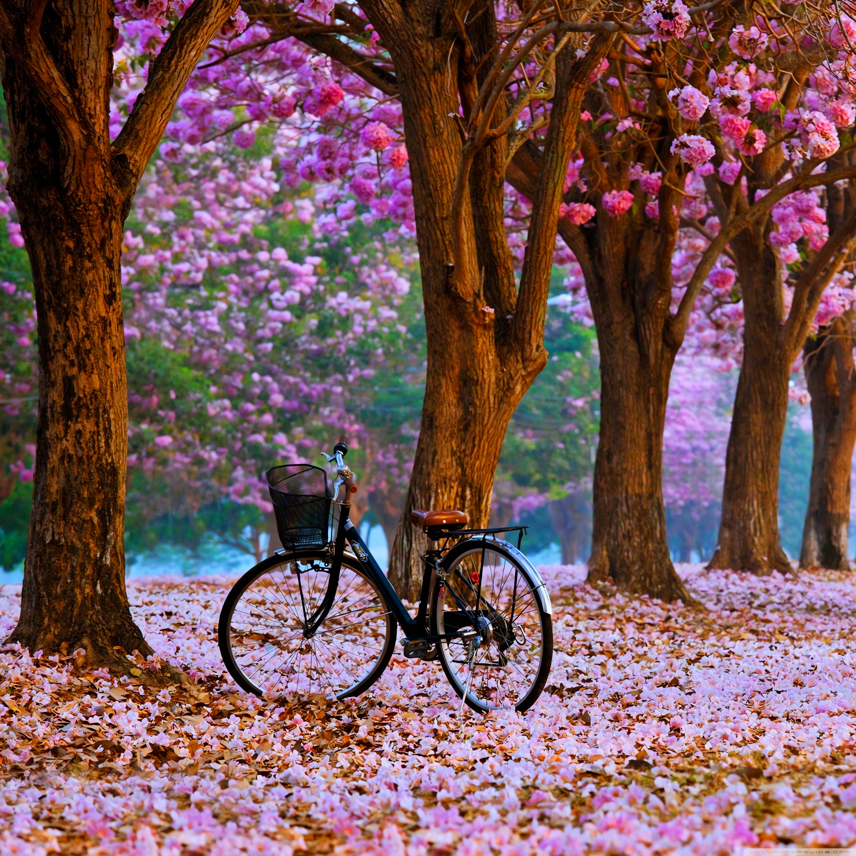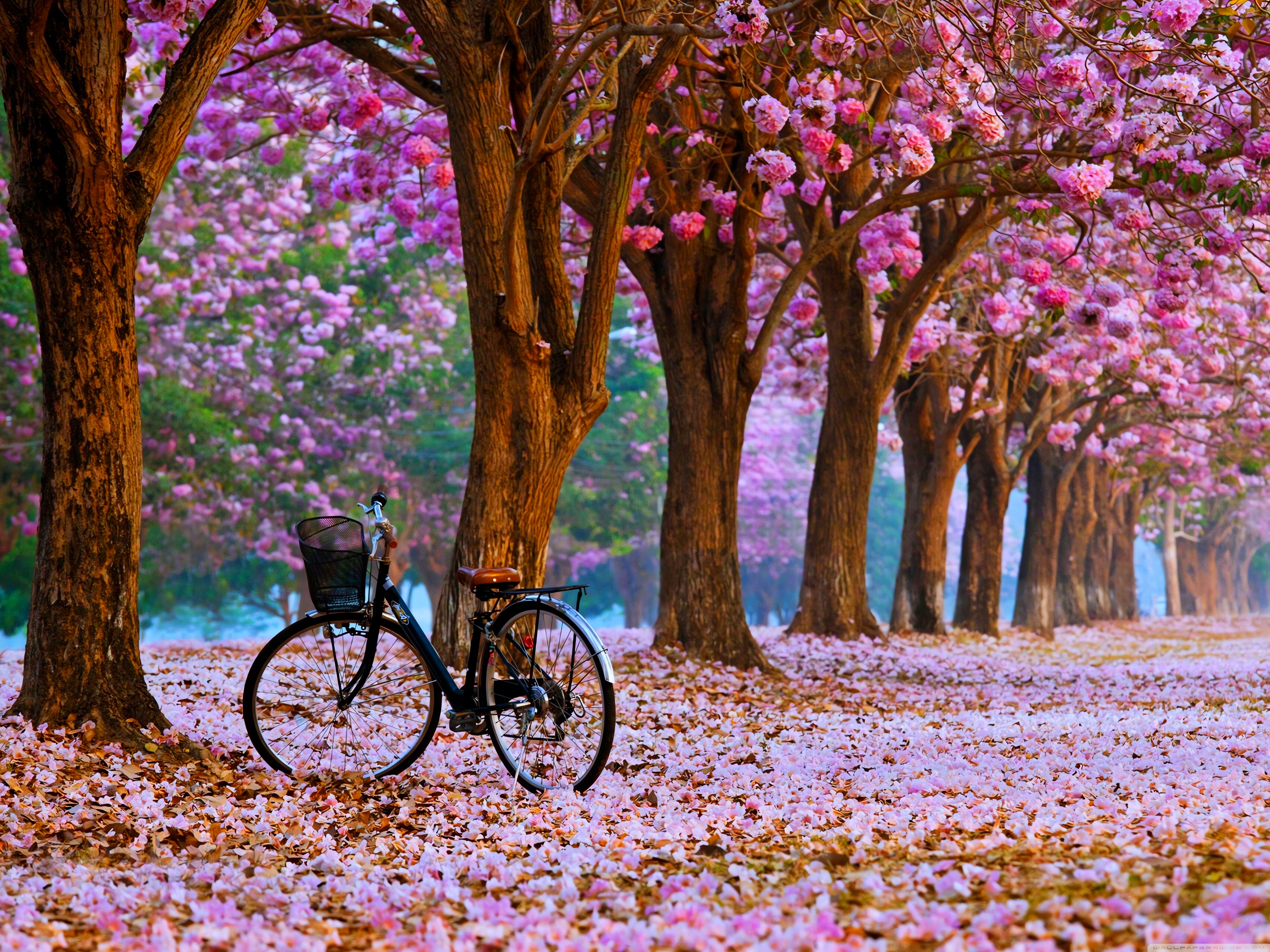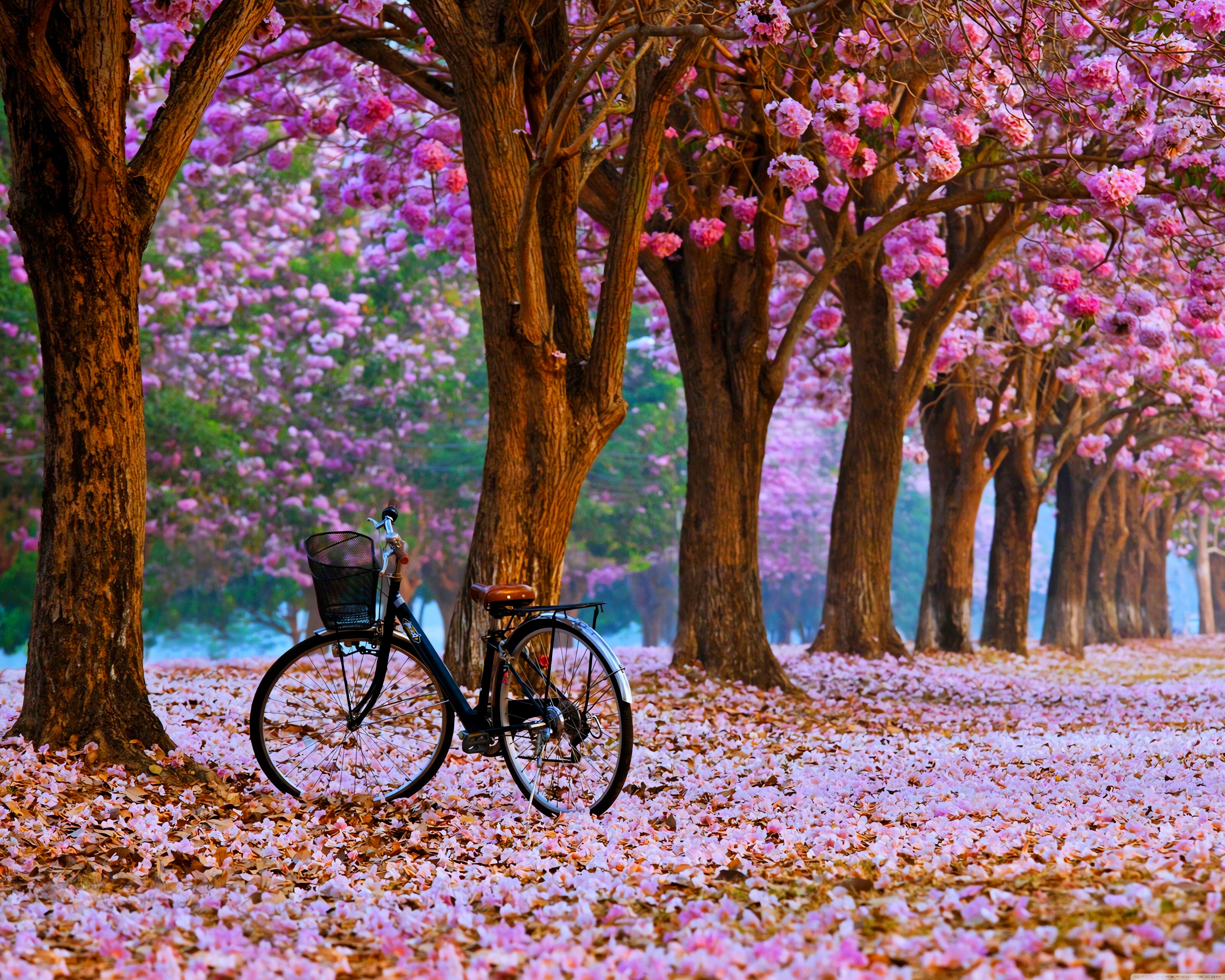 Download Cherry Blossom Path with a Solitary Bicycle 4K UHD Wallpaper