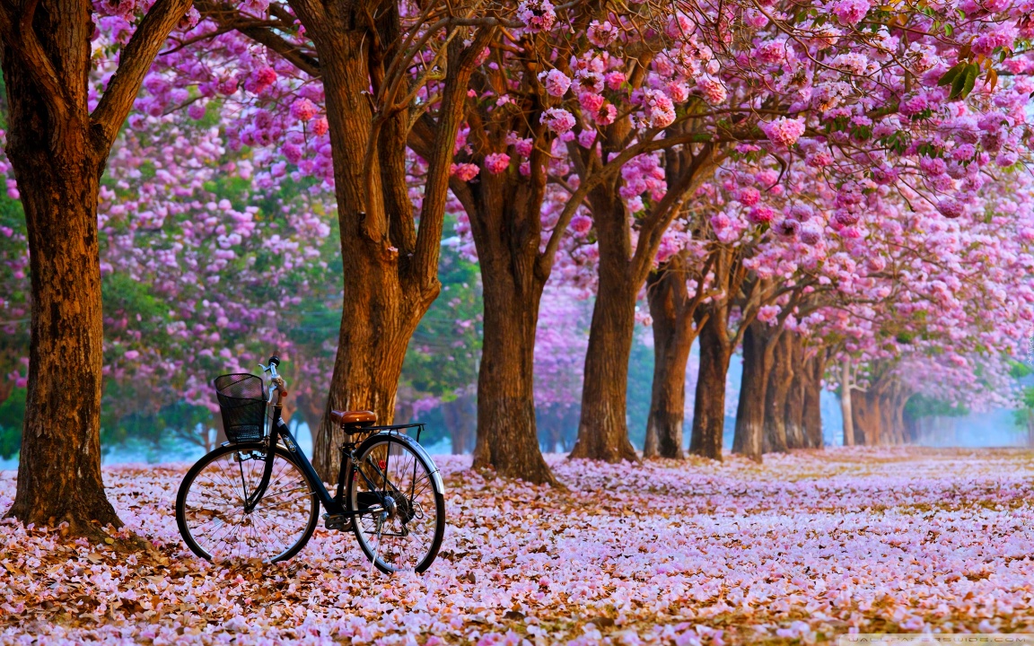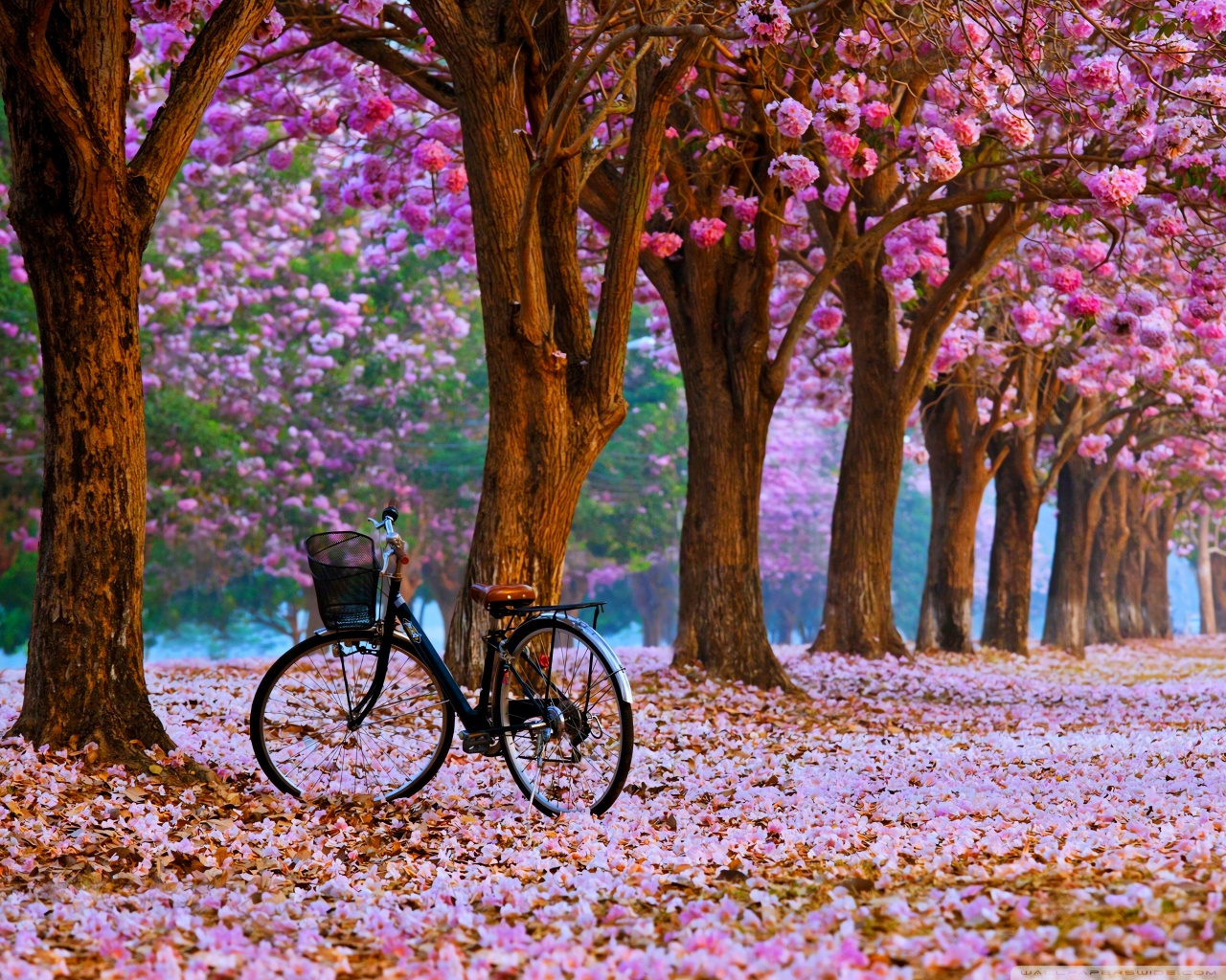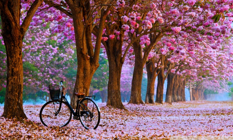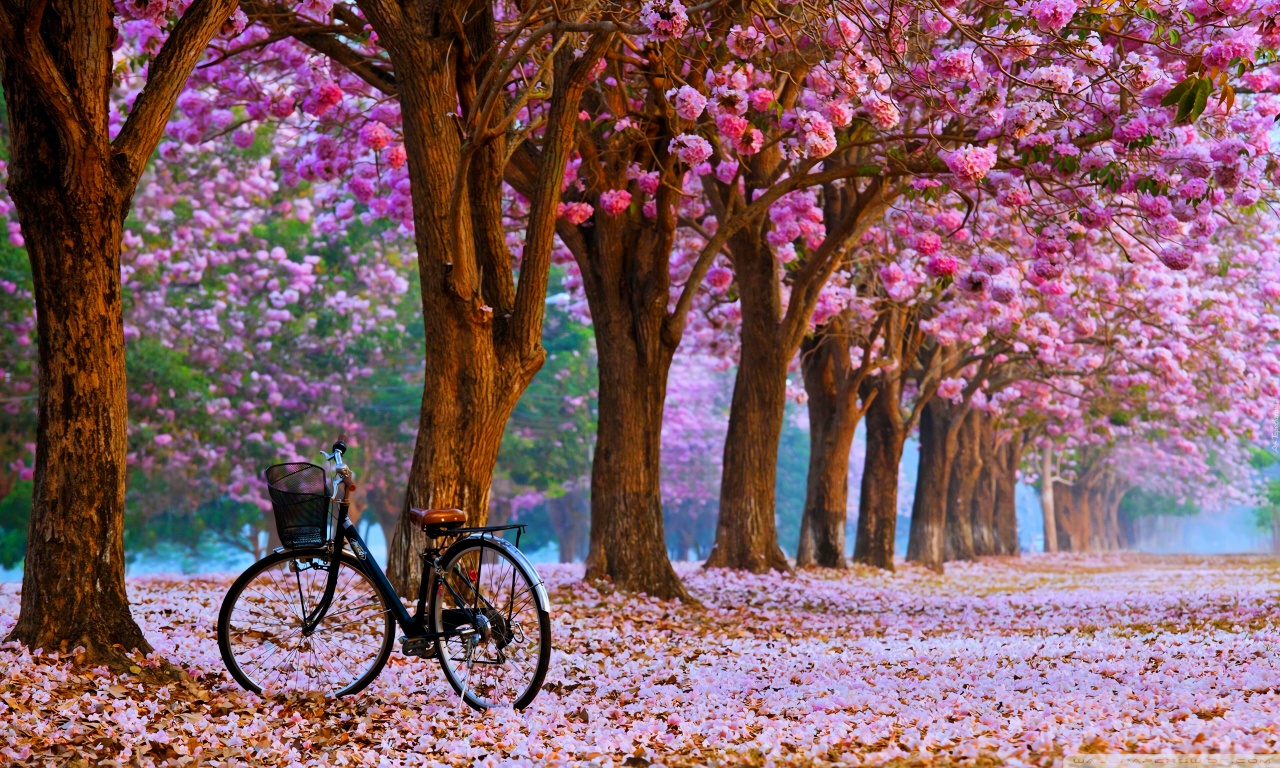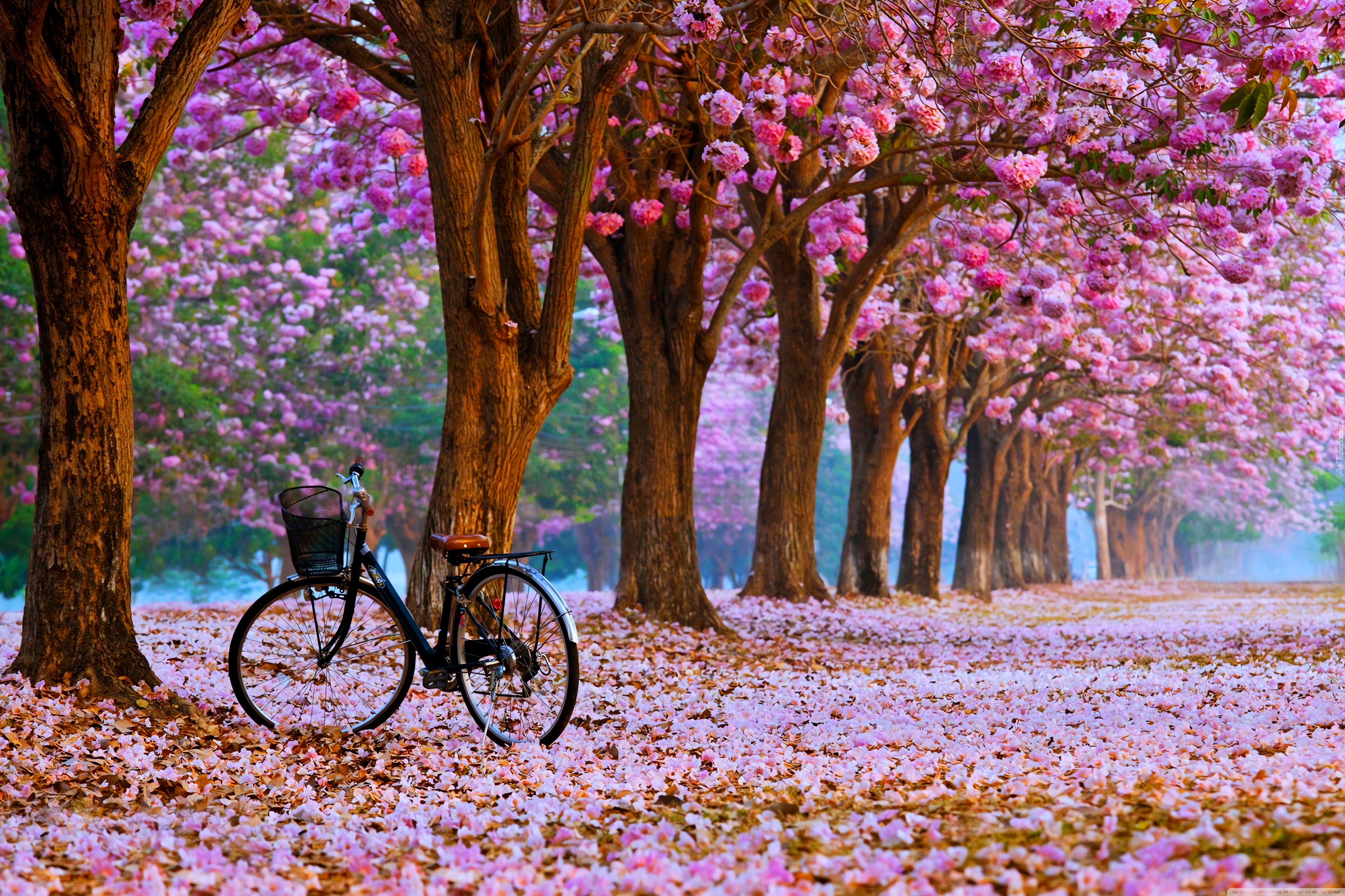 Download Cherry Blossom Path with a Solitary Bicycle 4K UHD Wallpaper