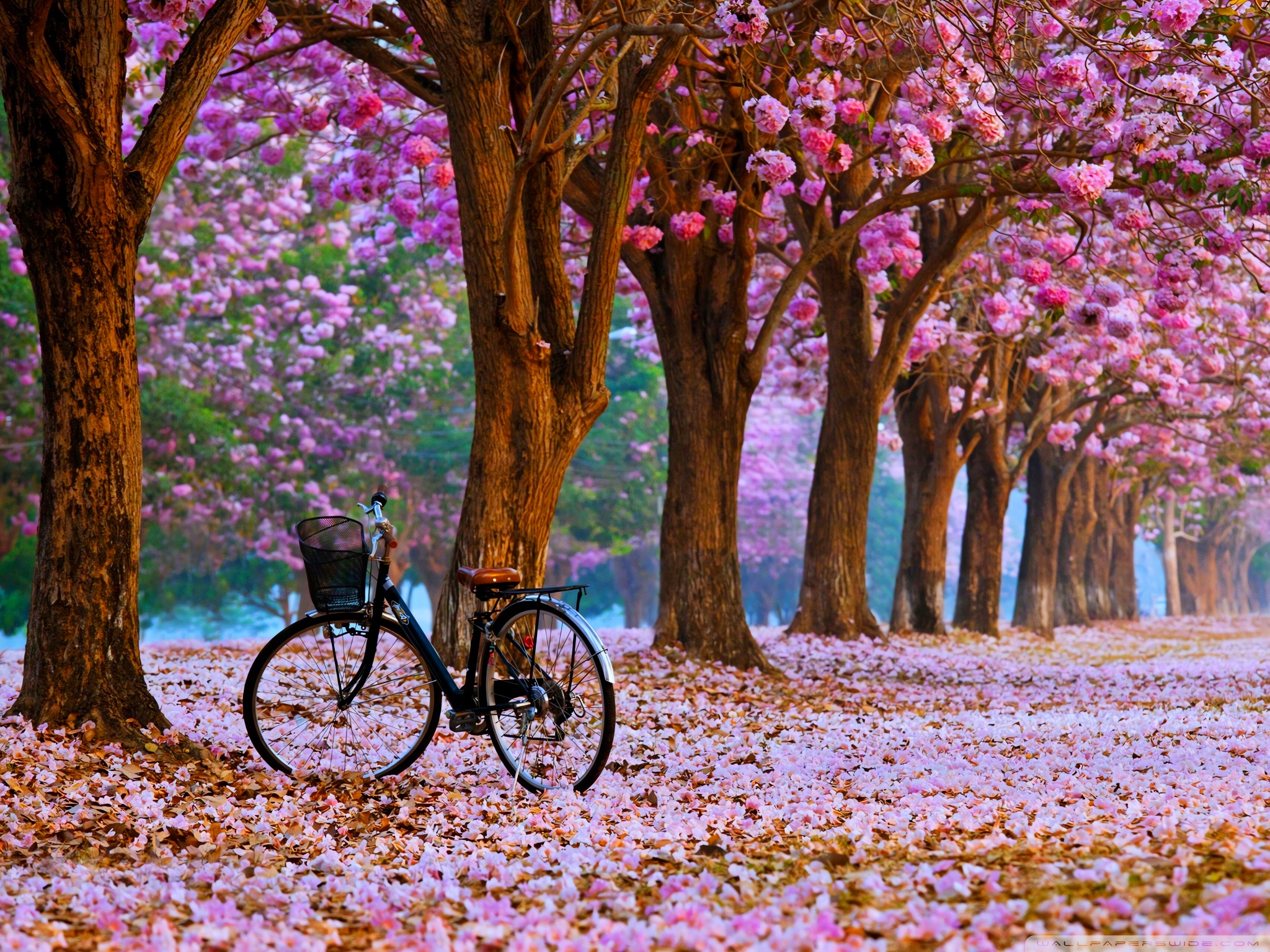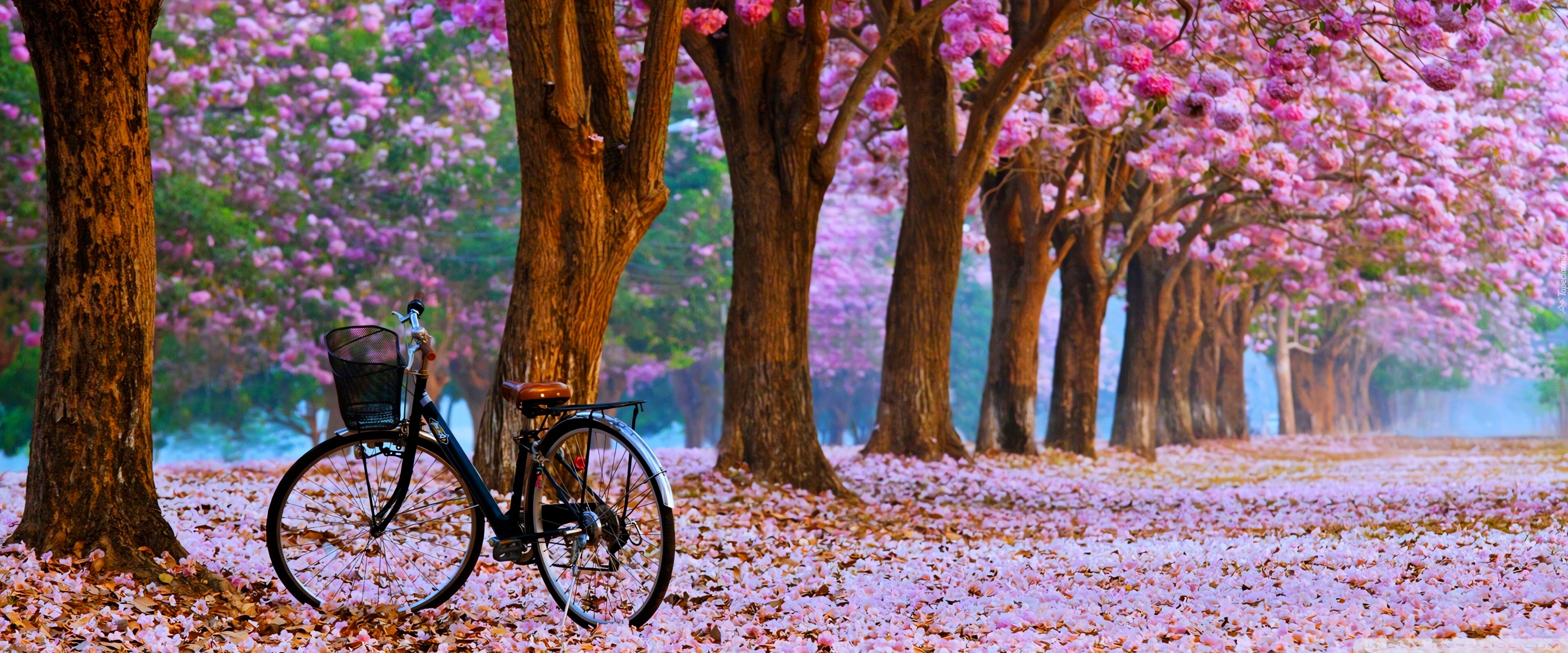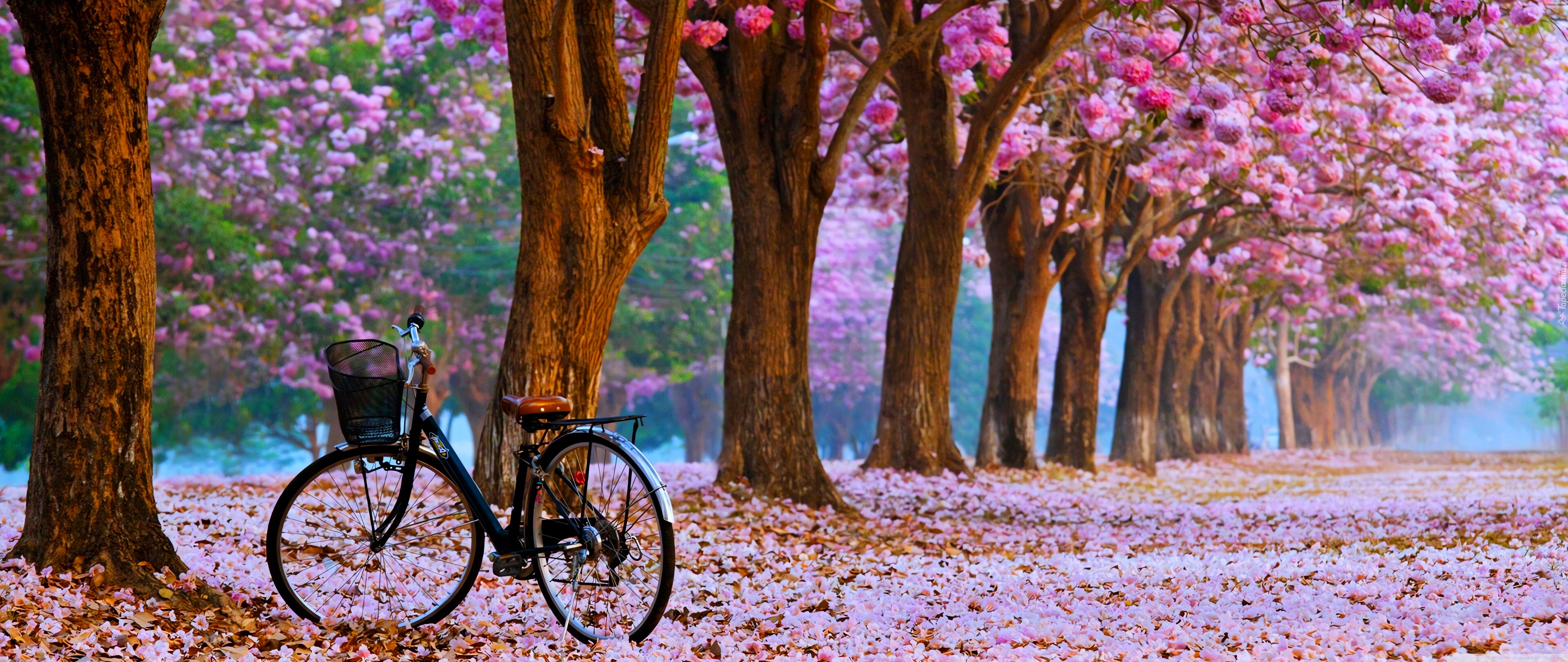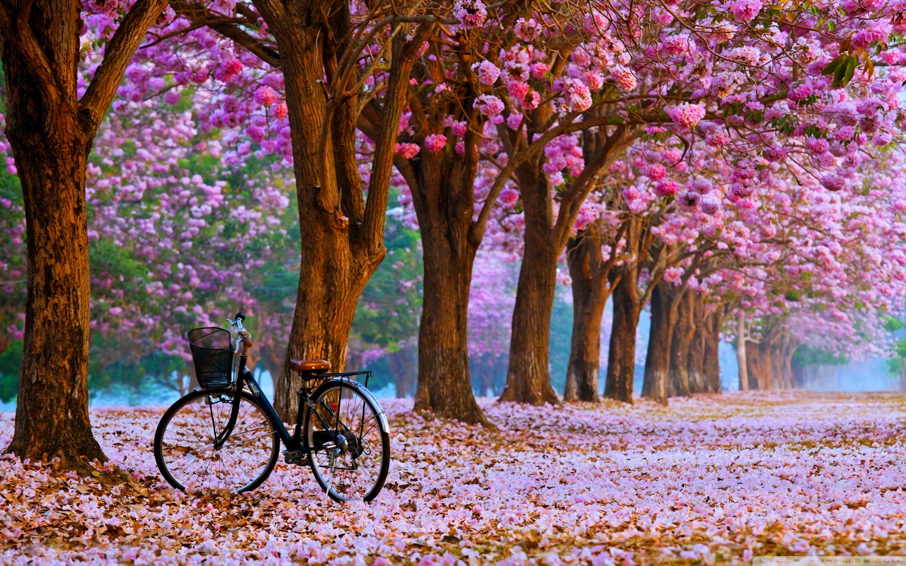 Download Cherry Blossom Path with a Solitary Bicycle 4K UHD Wallpaper
