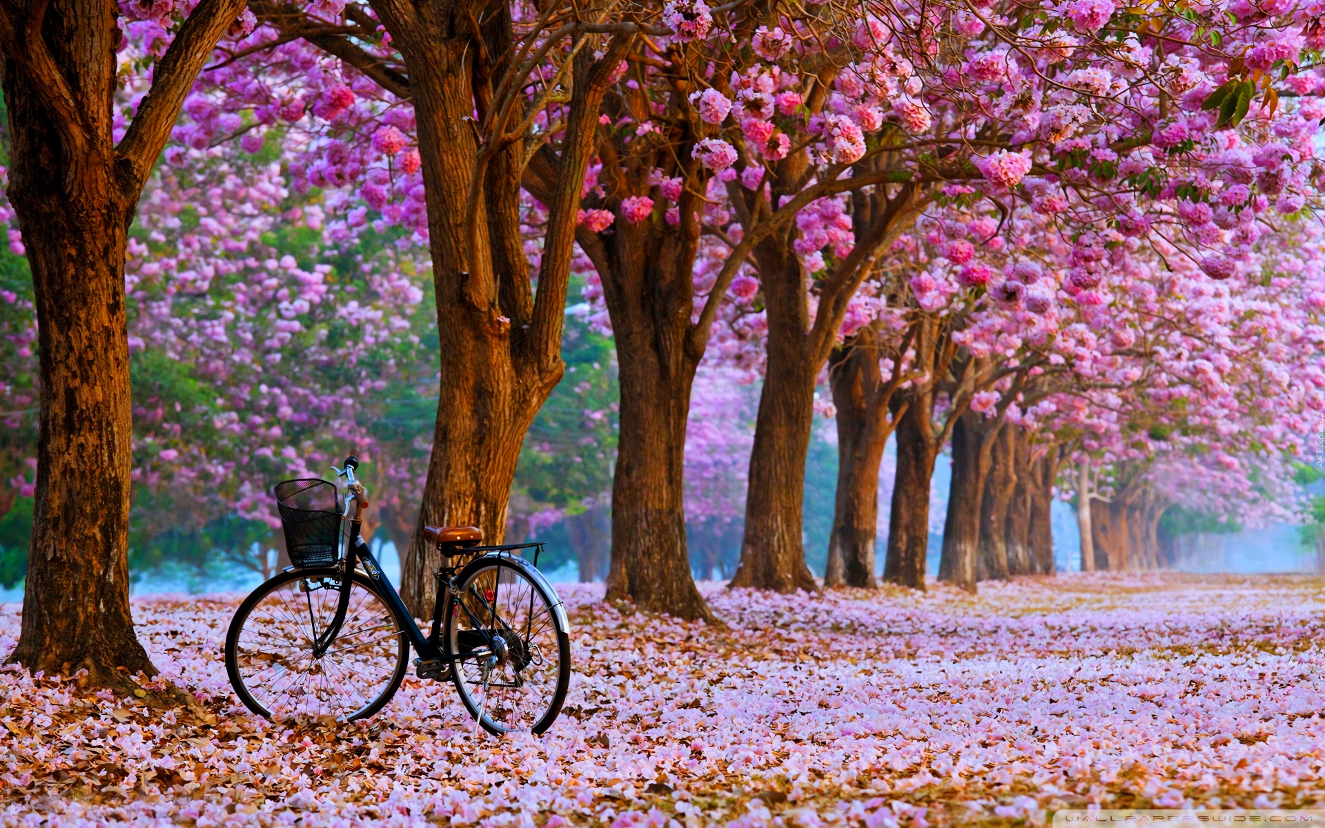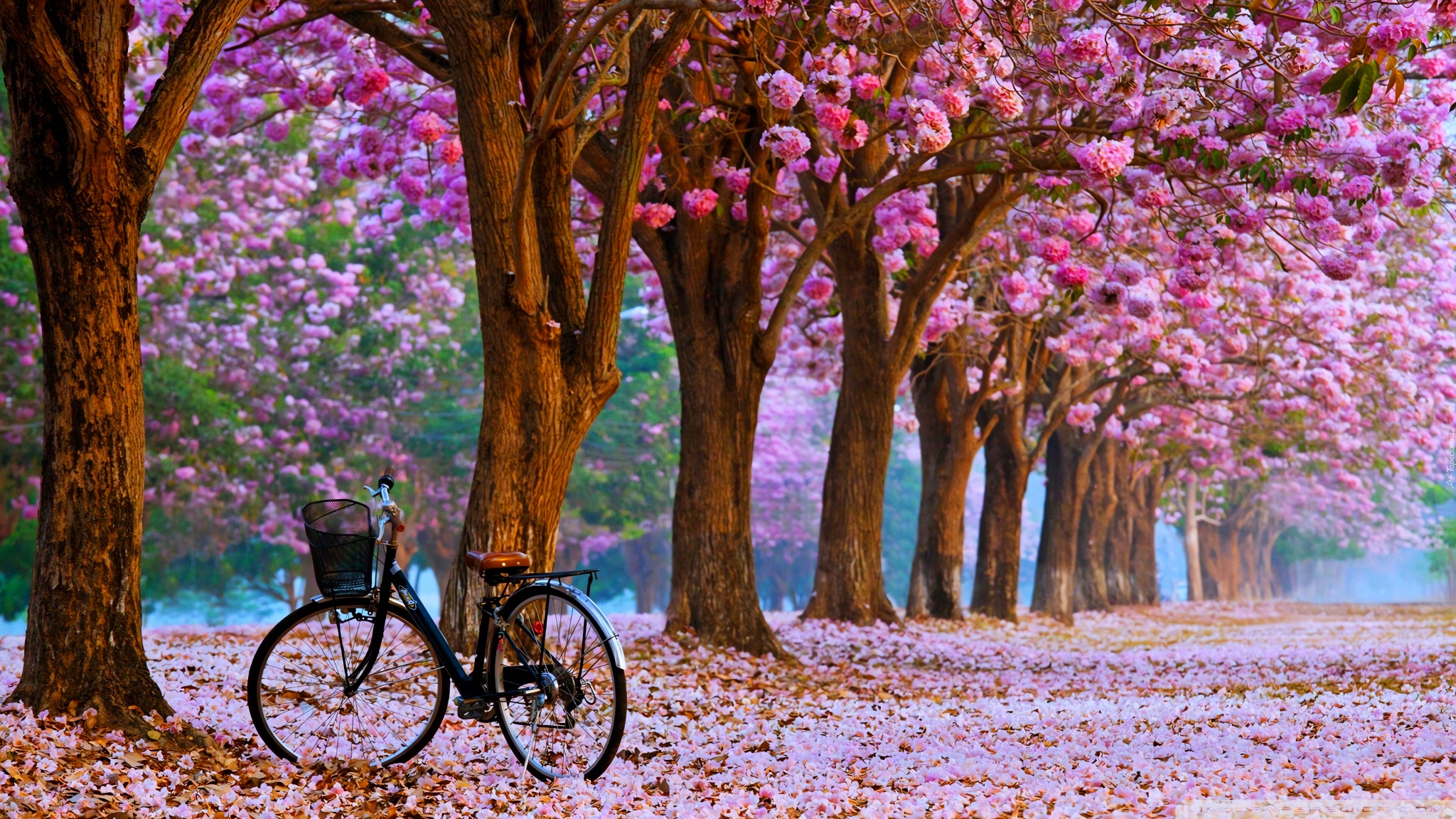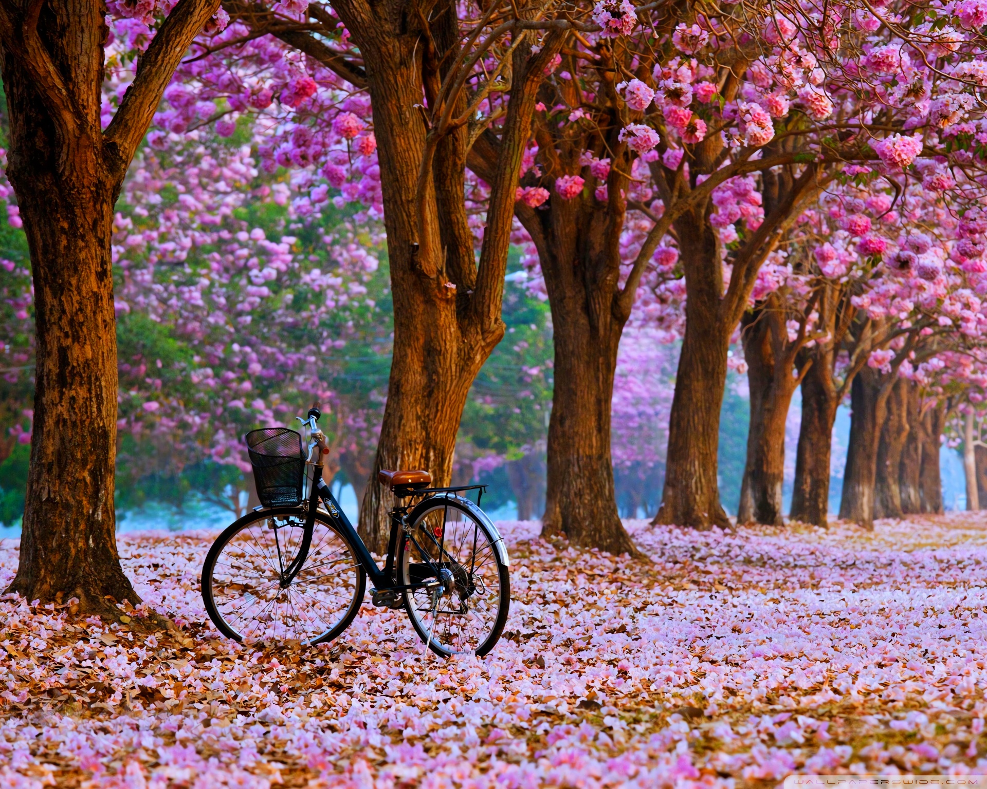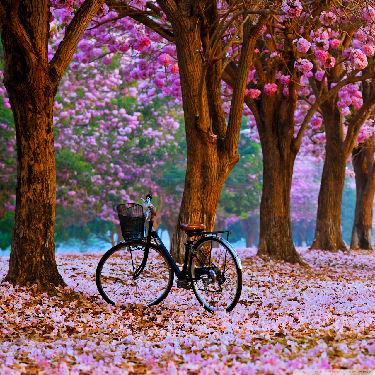 Download Cherry Blossom Path with a Solitary Bicycle 4K UHD Wallpaper