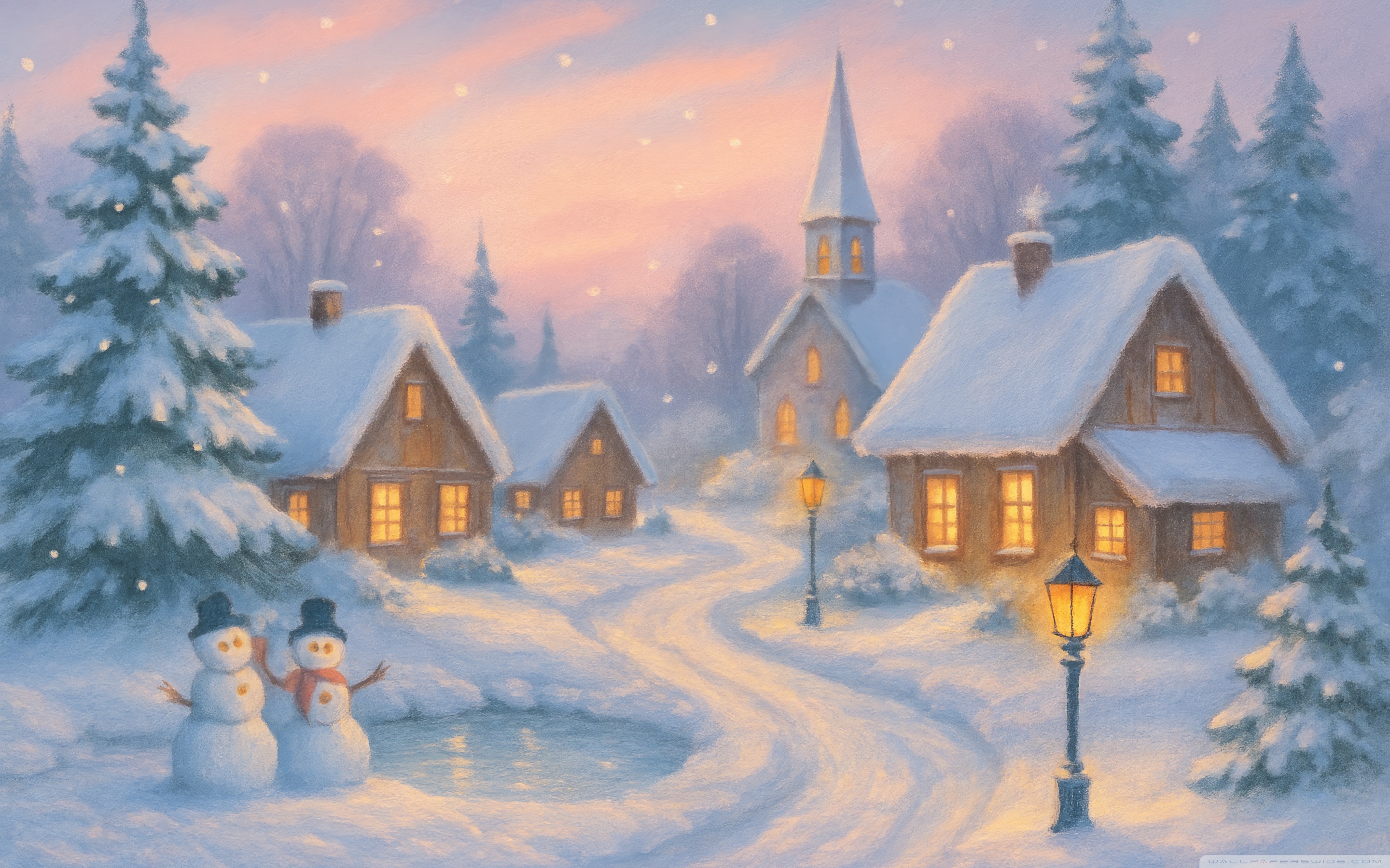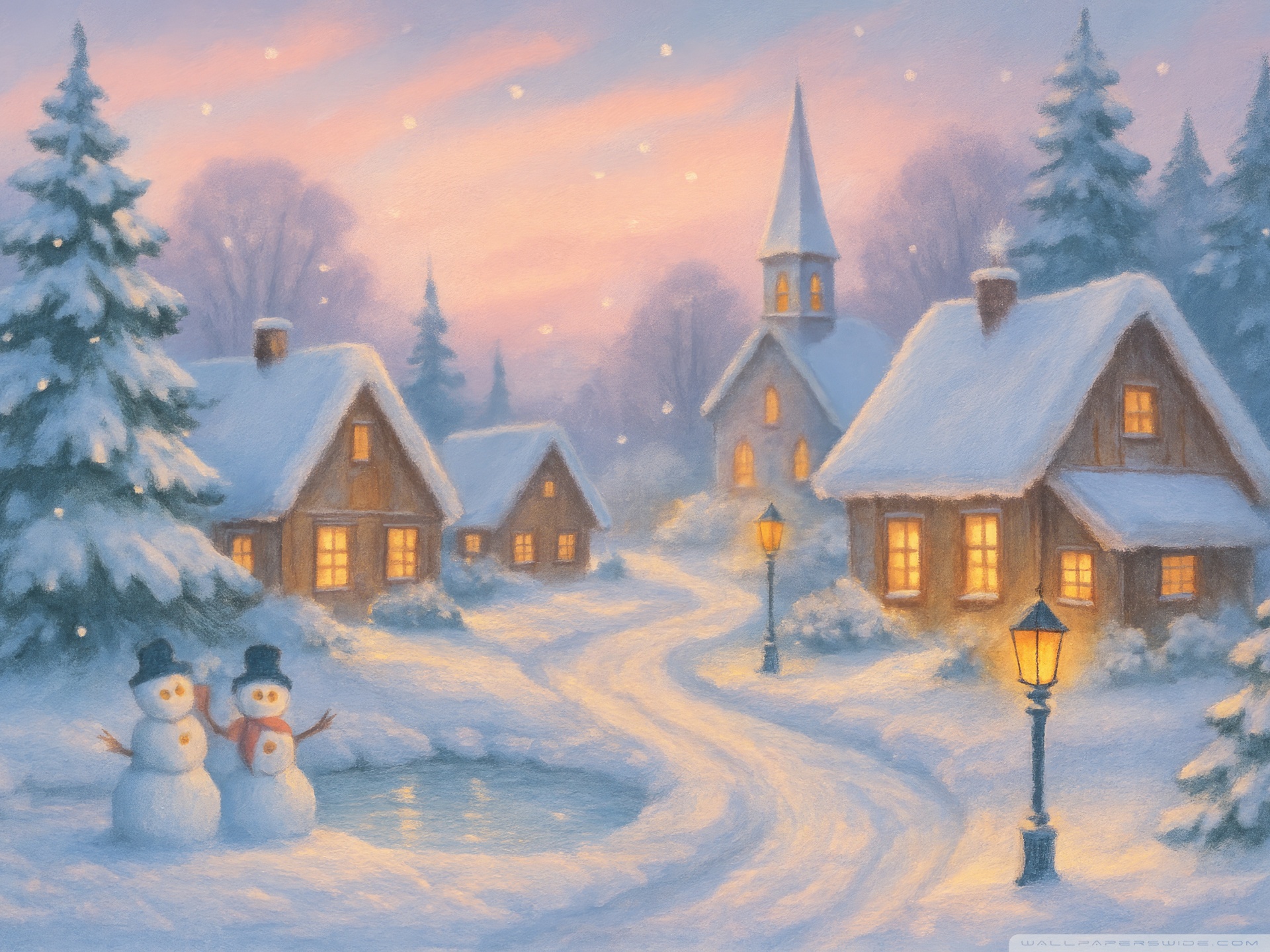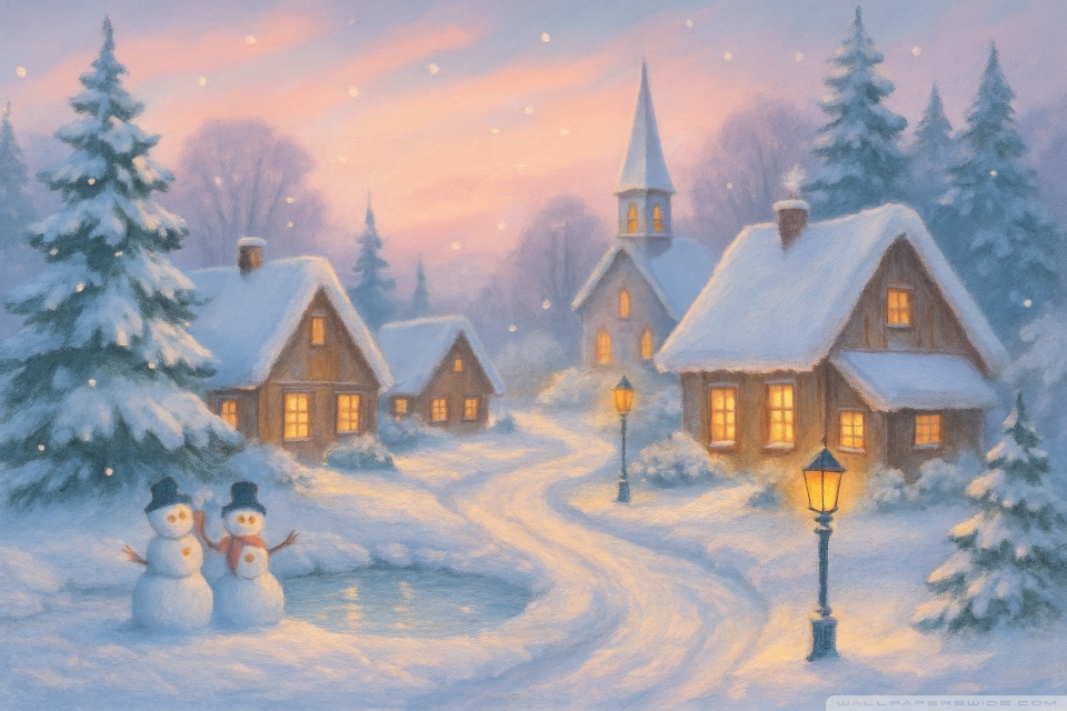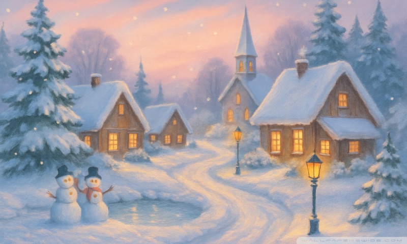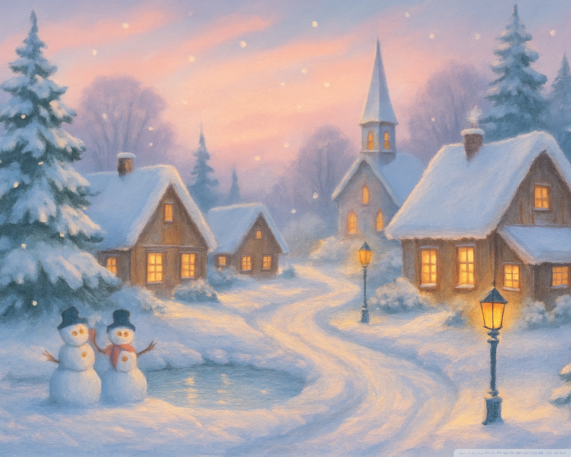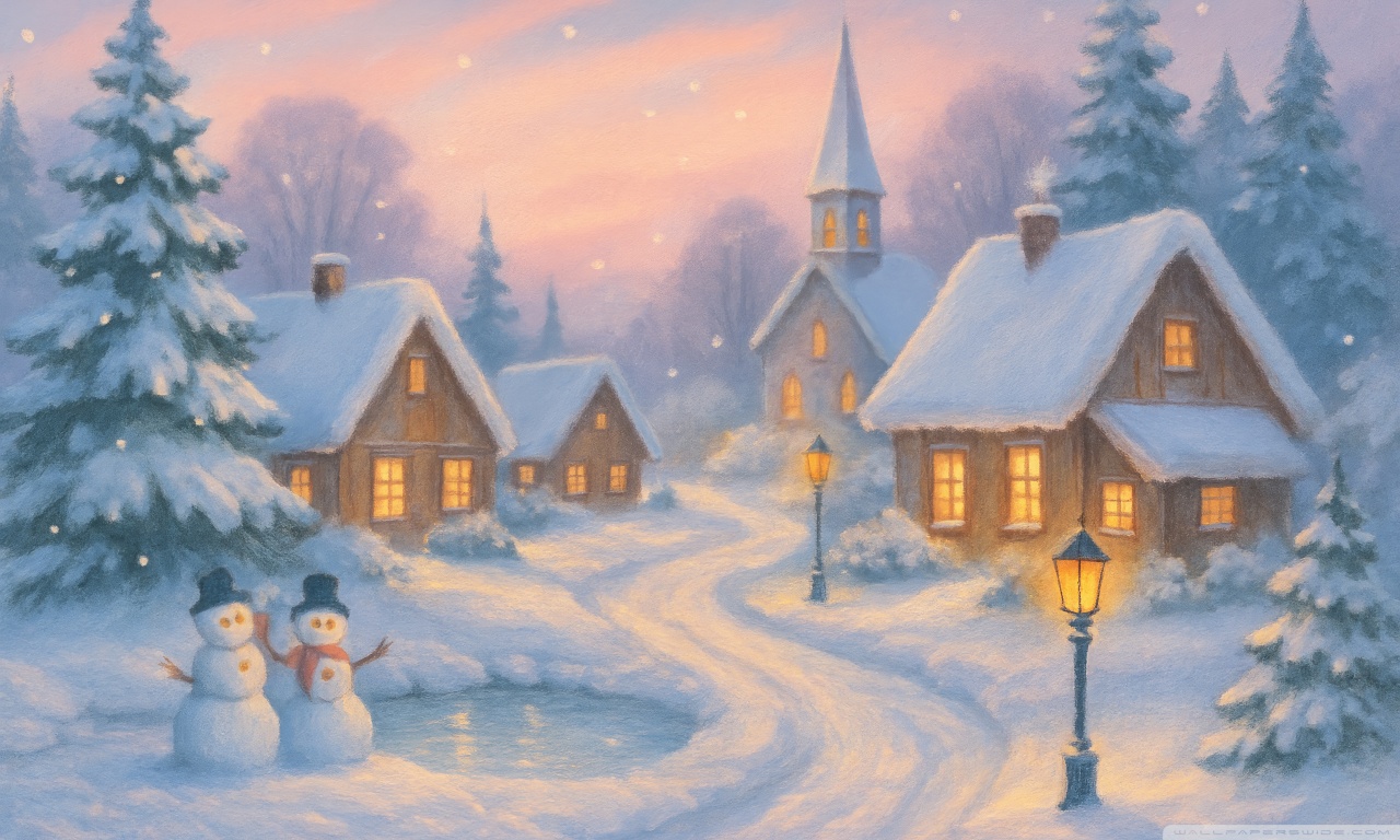 Download Classic Illustration of a Snowy Village 4K UHD Wallpaper
