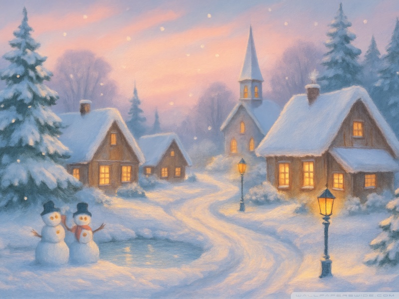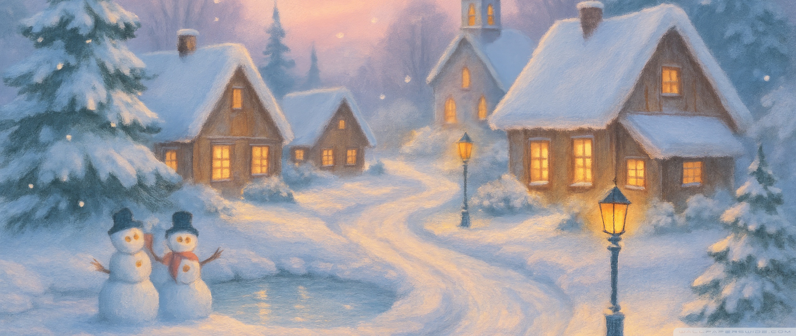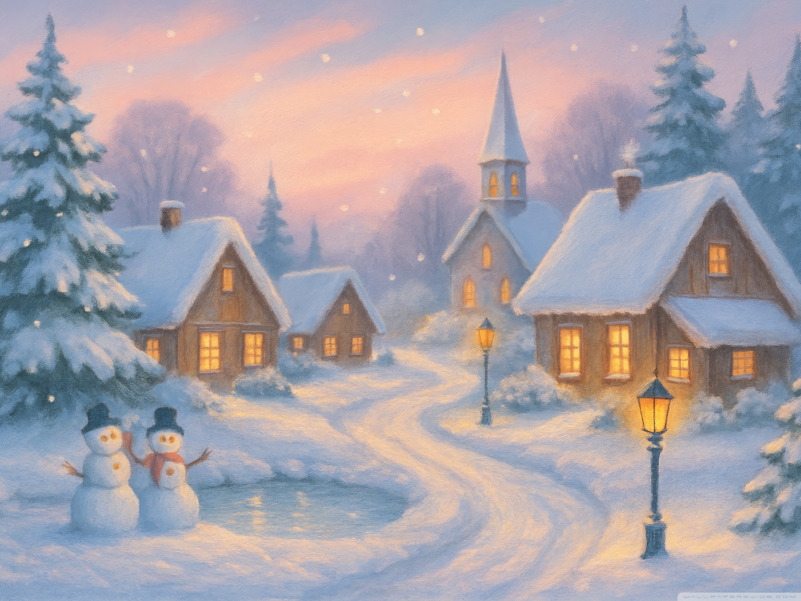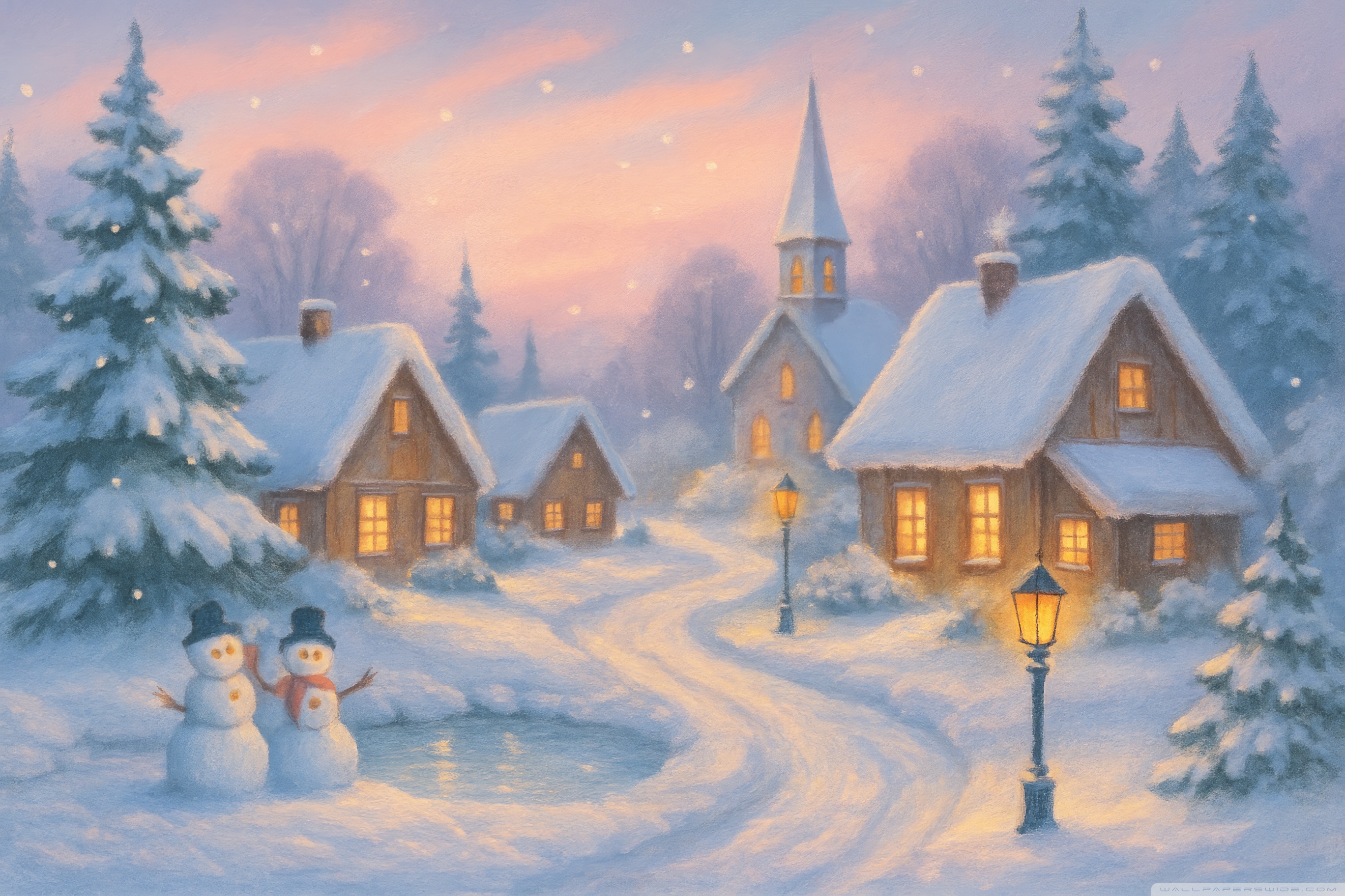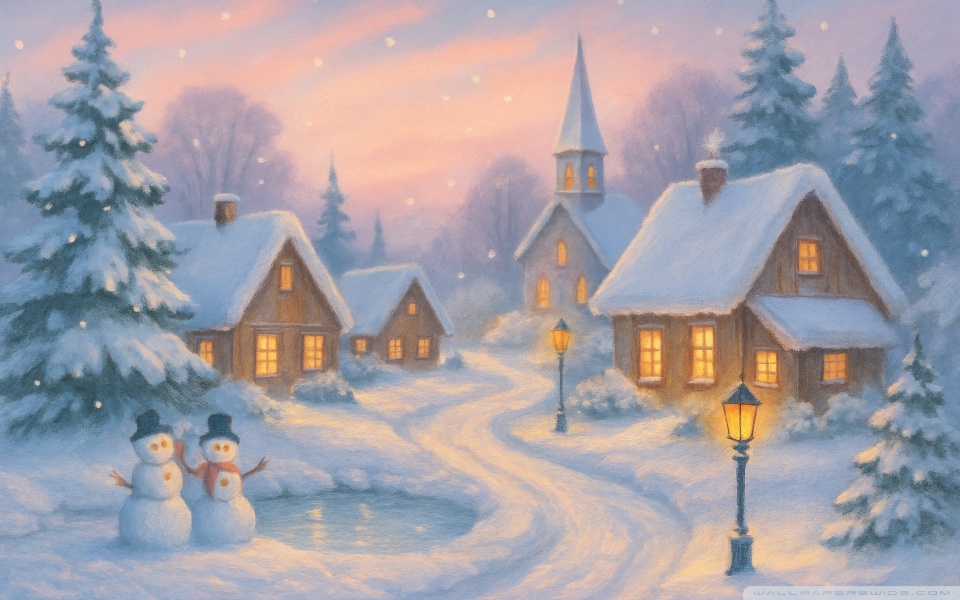Download Classic Illustration of a Snowy Village 4K UHD Wallpaper