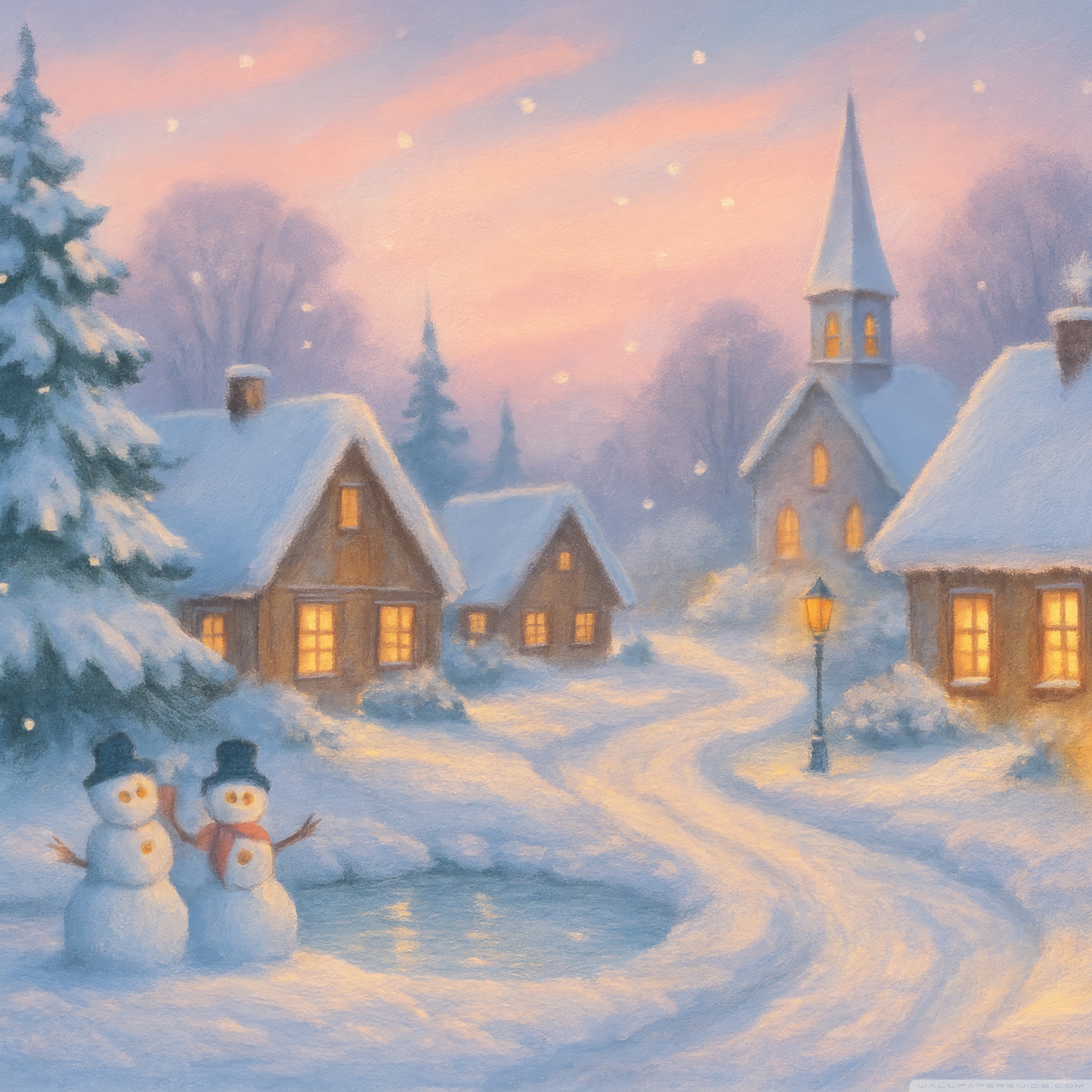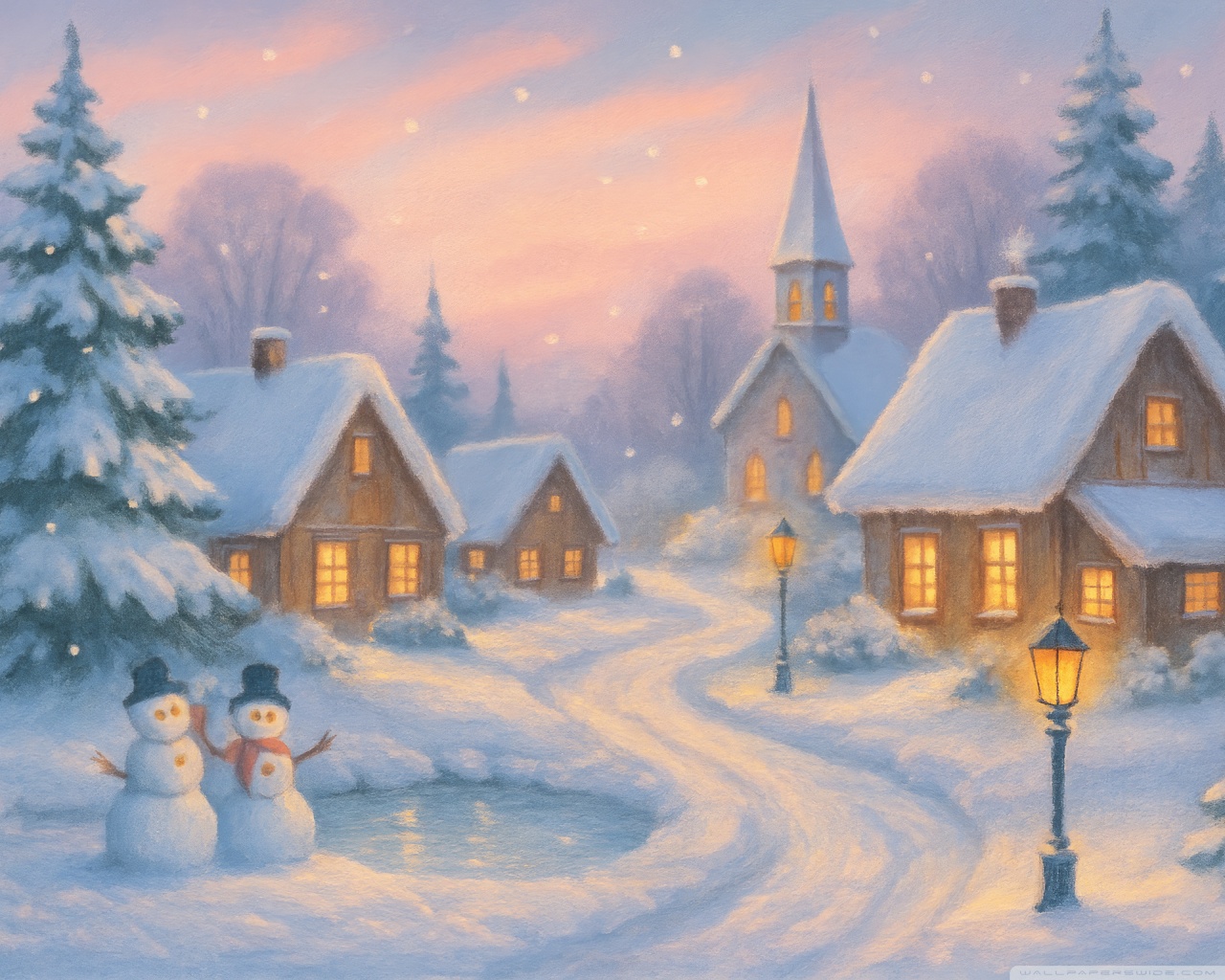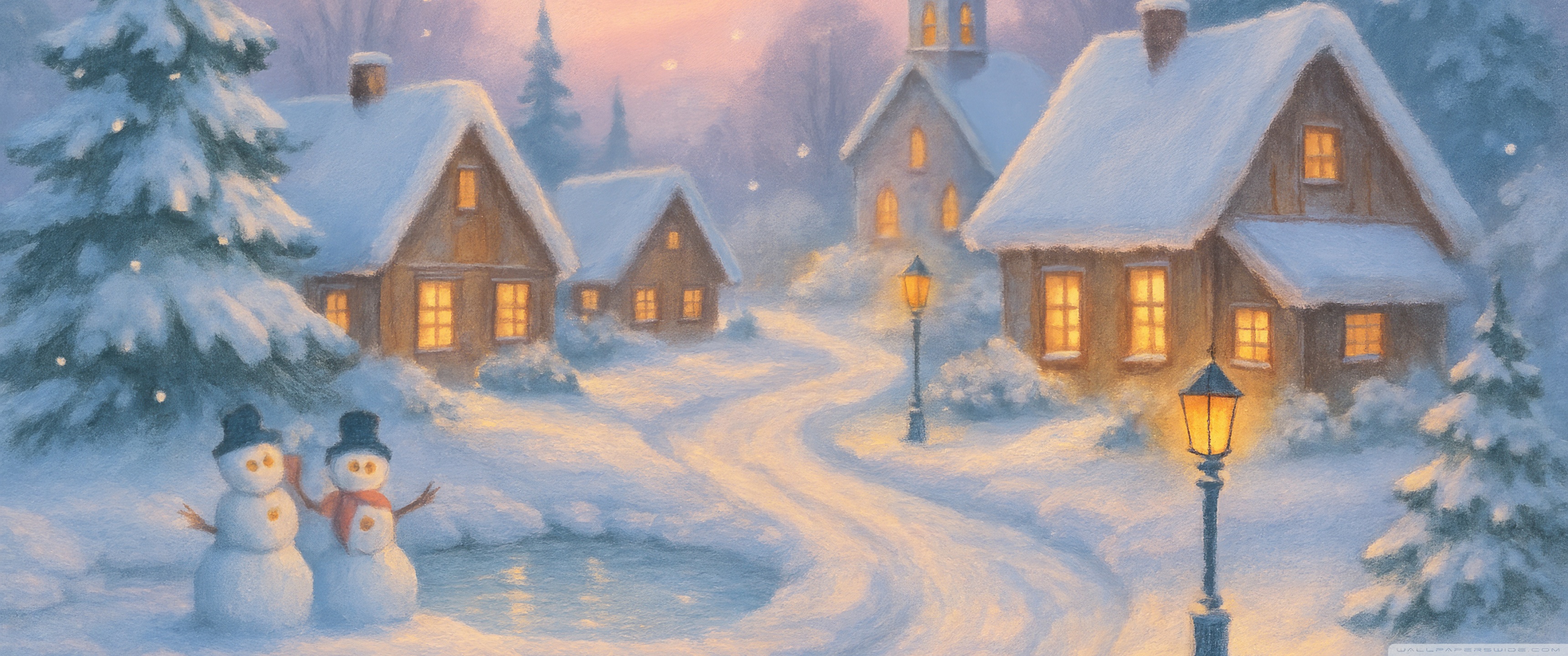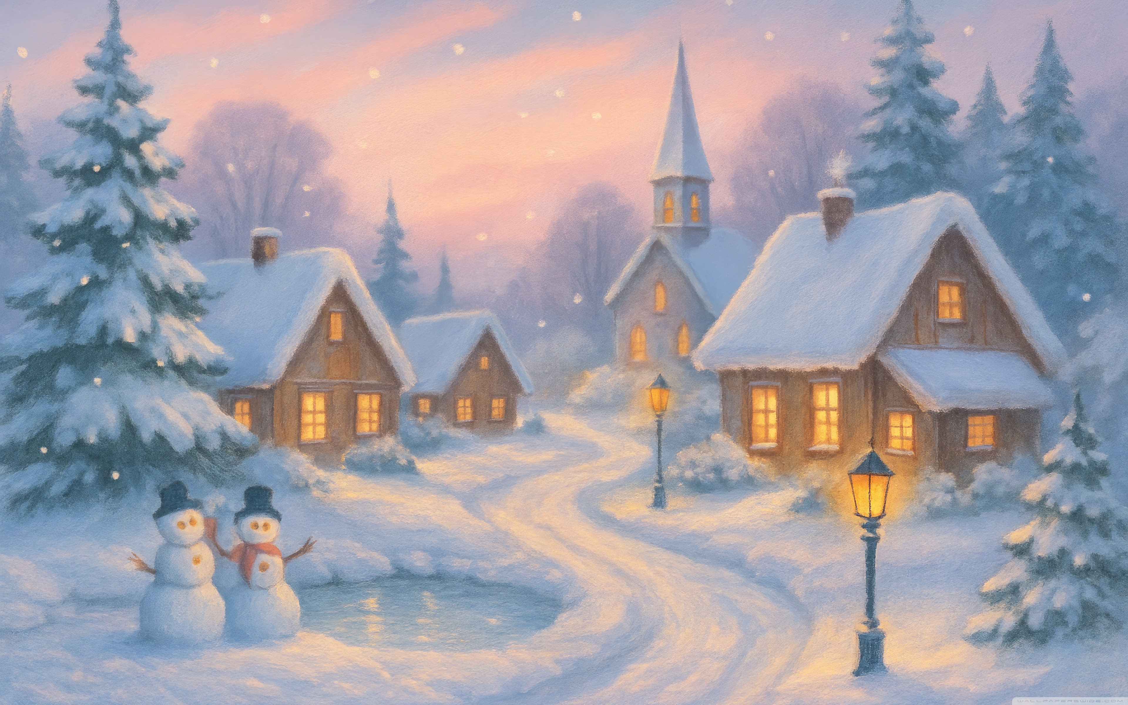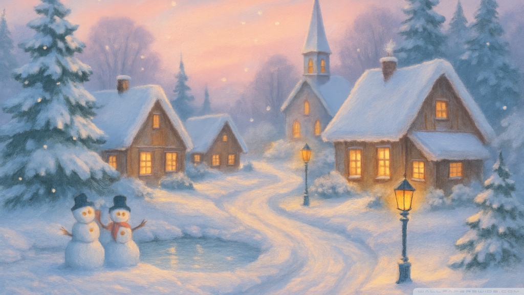 Download Classic Illustration of a Snowy Village 4K UHD Wallpaper