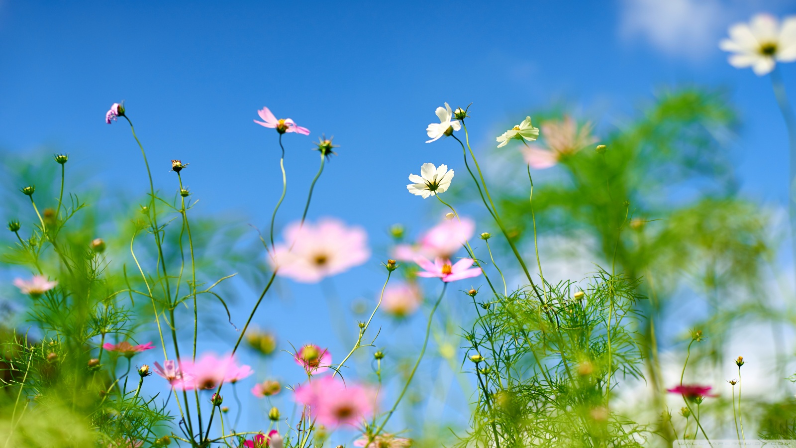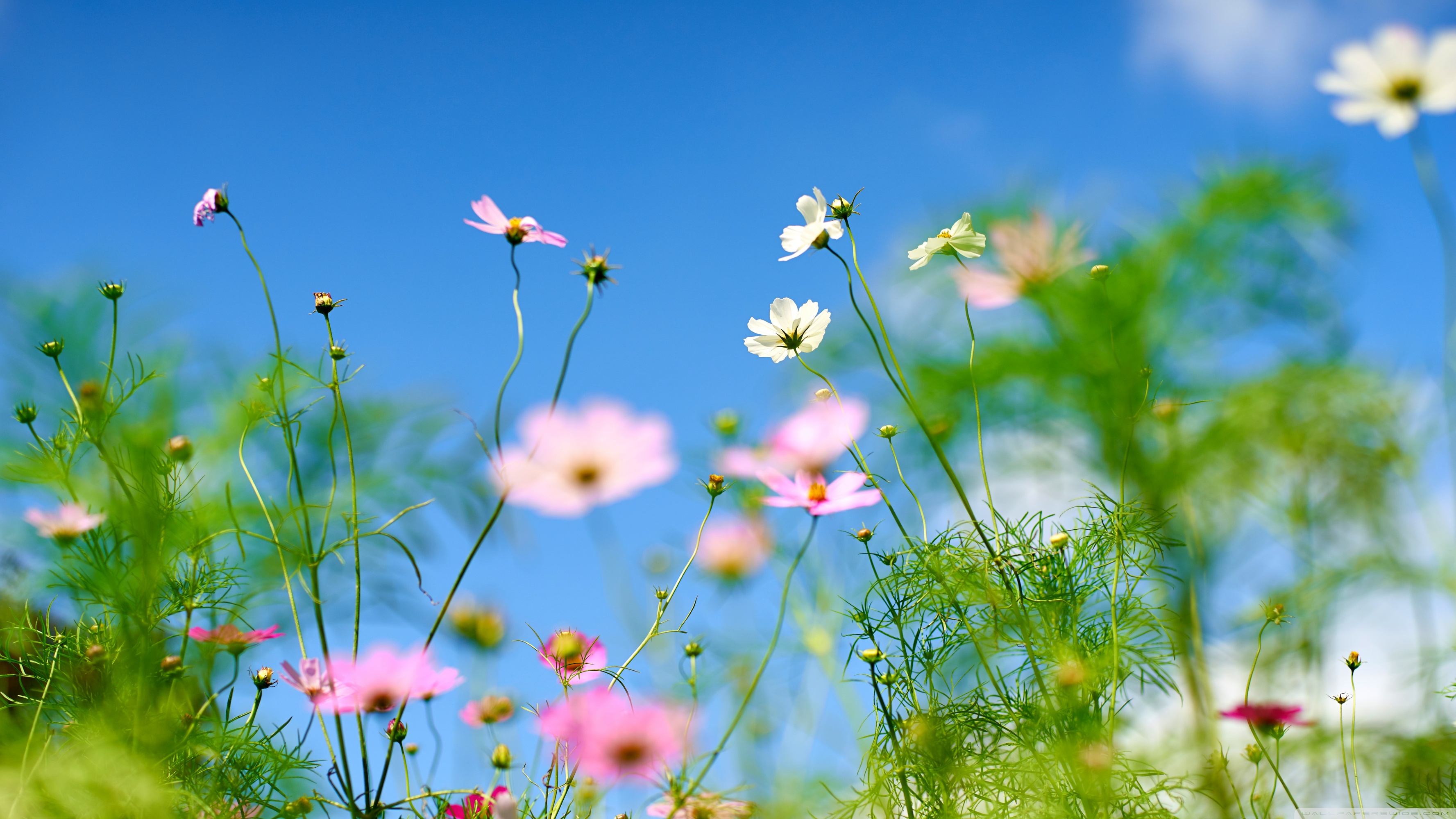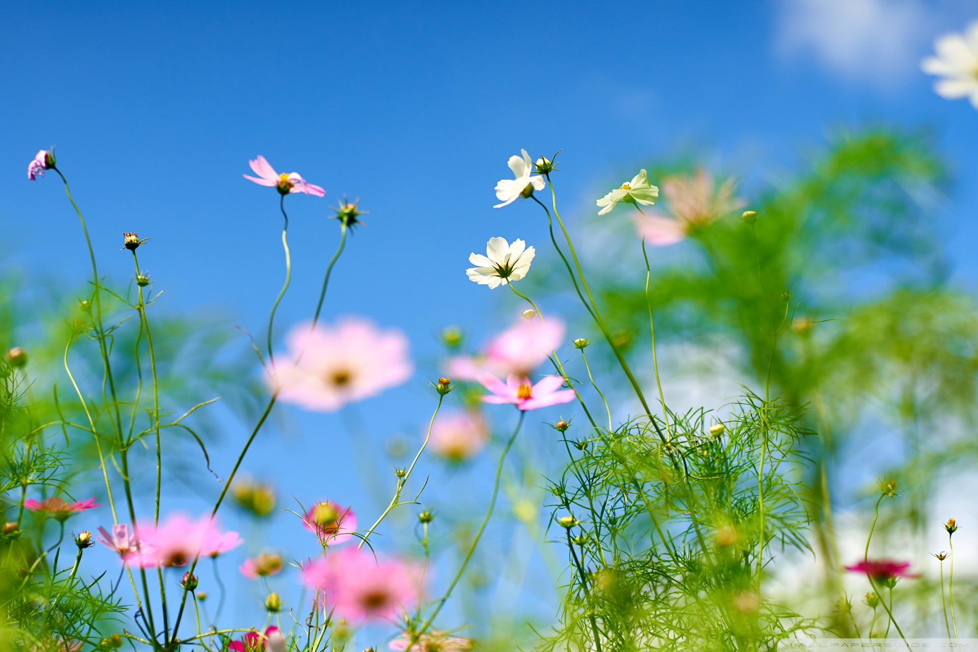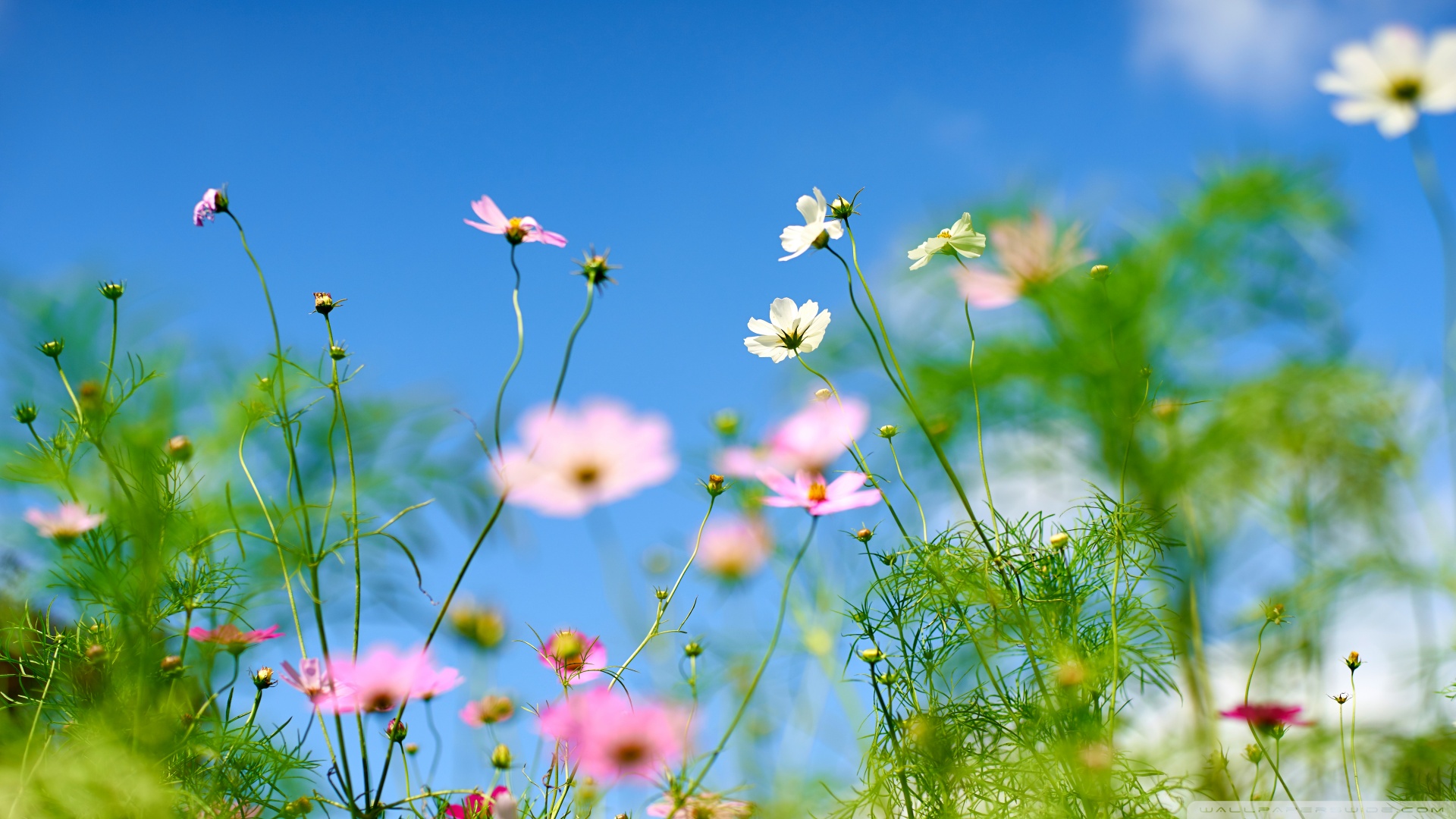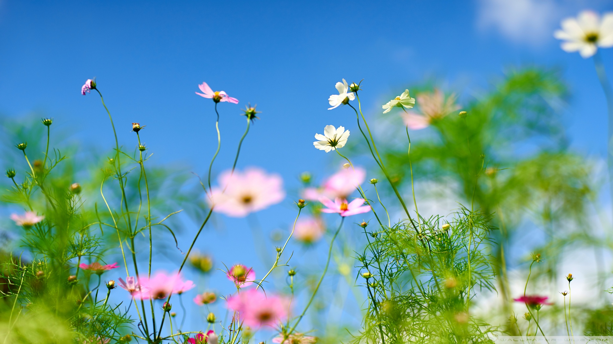 Download Cosmos Flower Field beneath Blue Sky 4K UHD Wallpaper