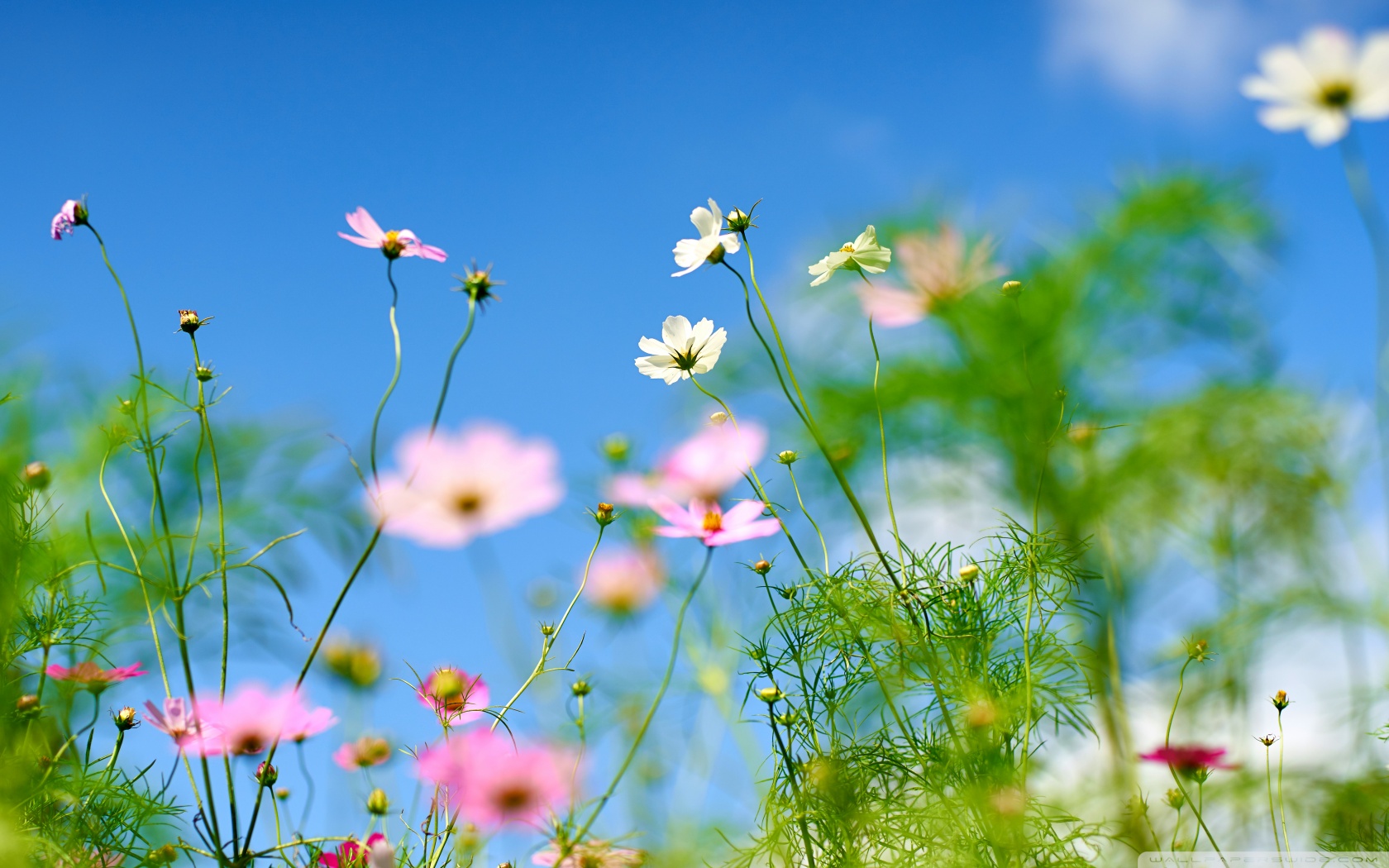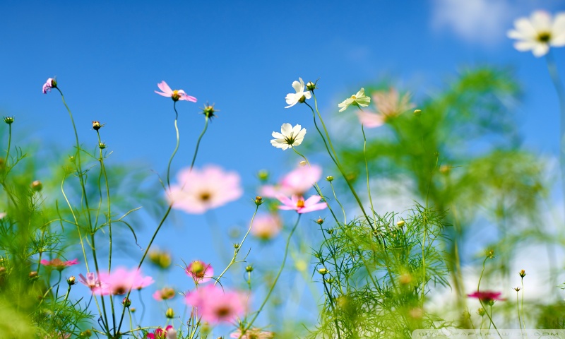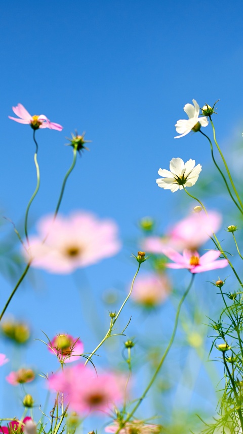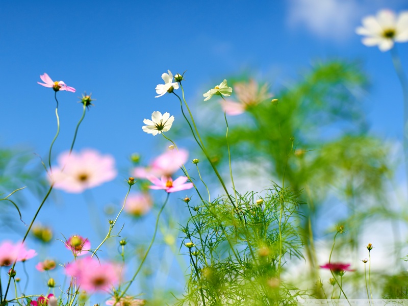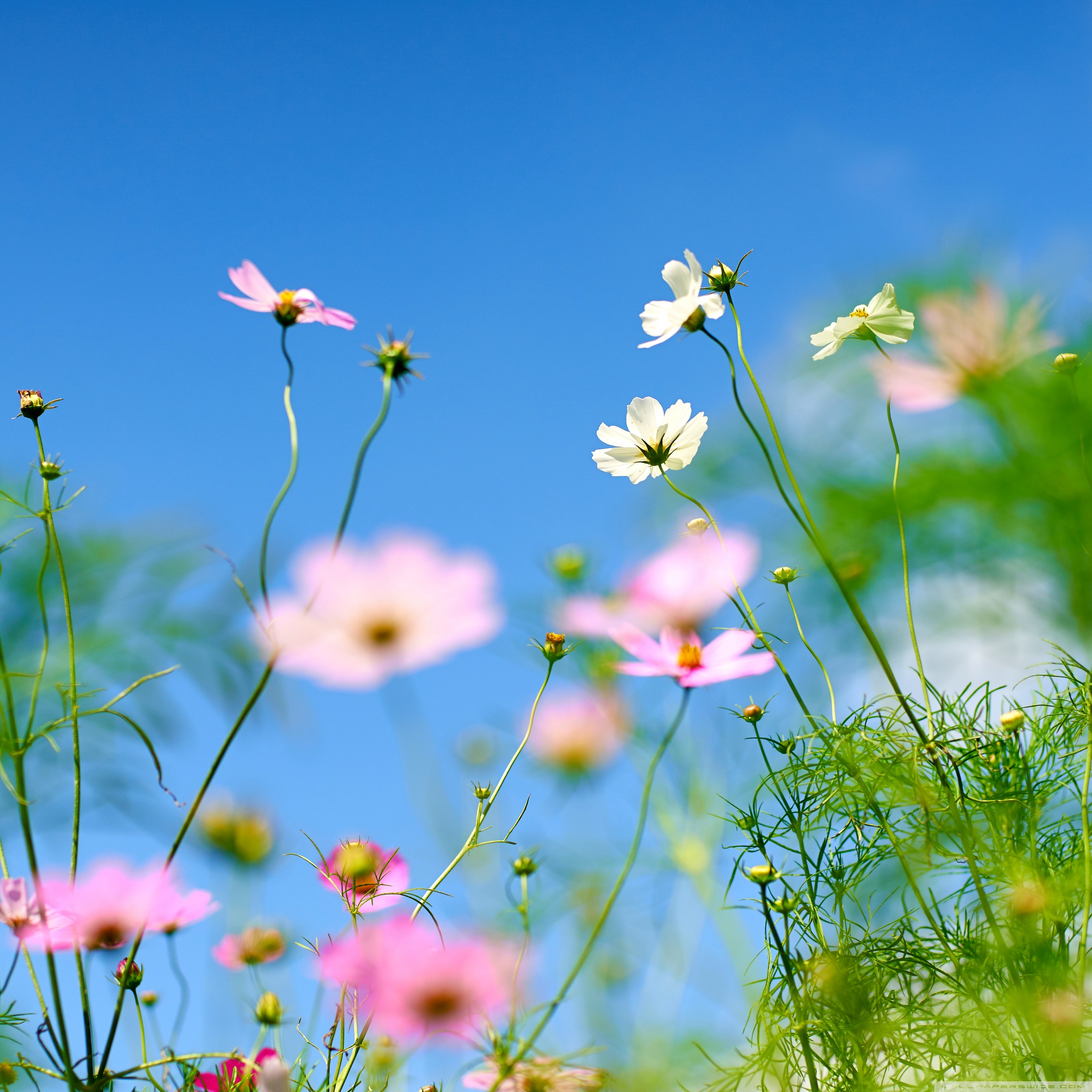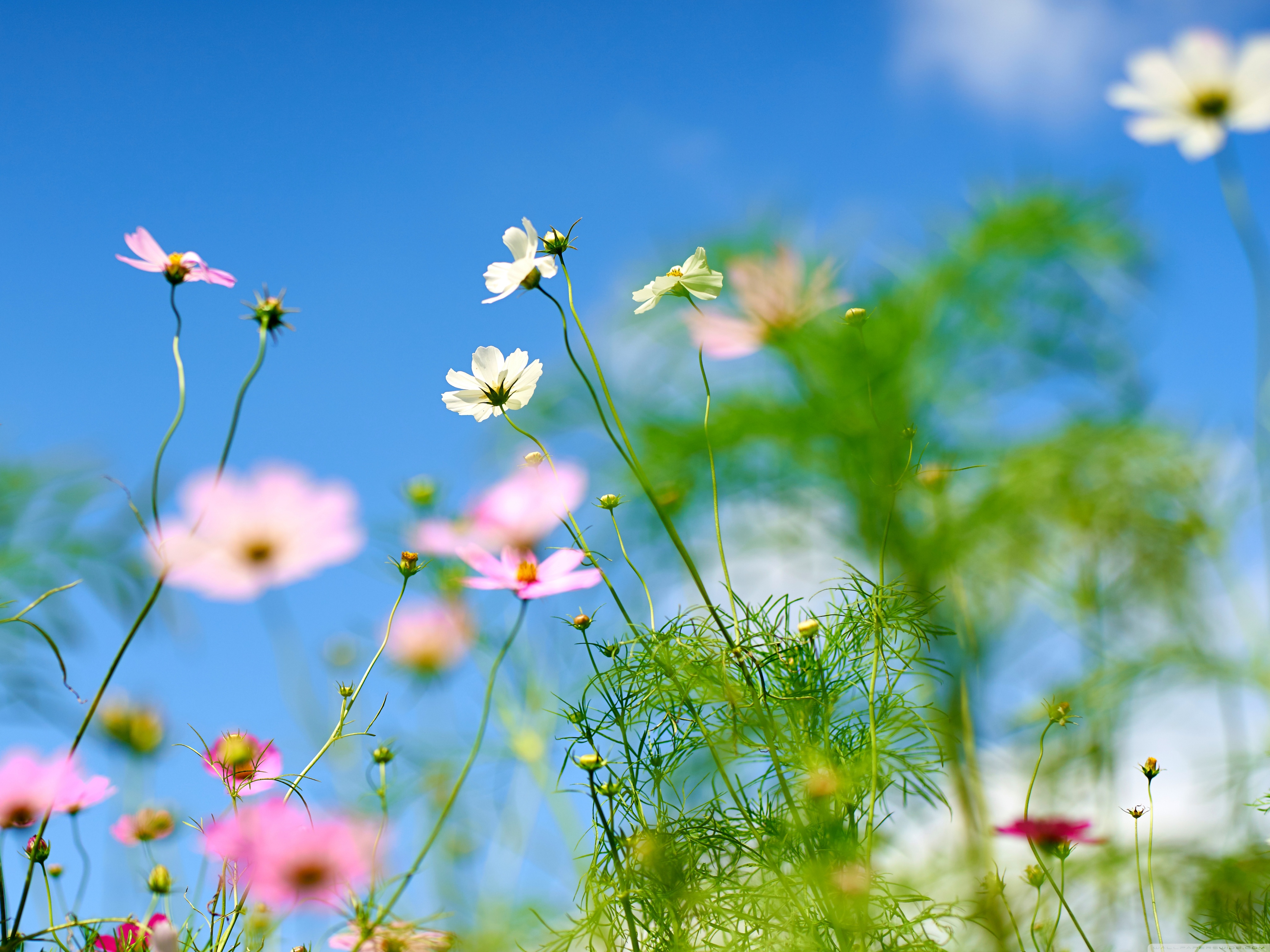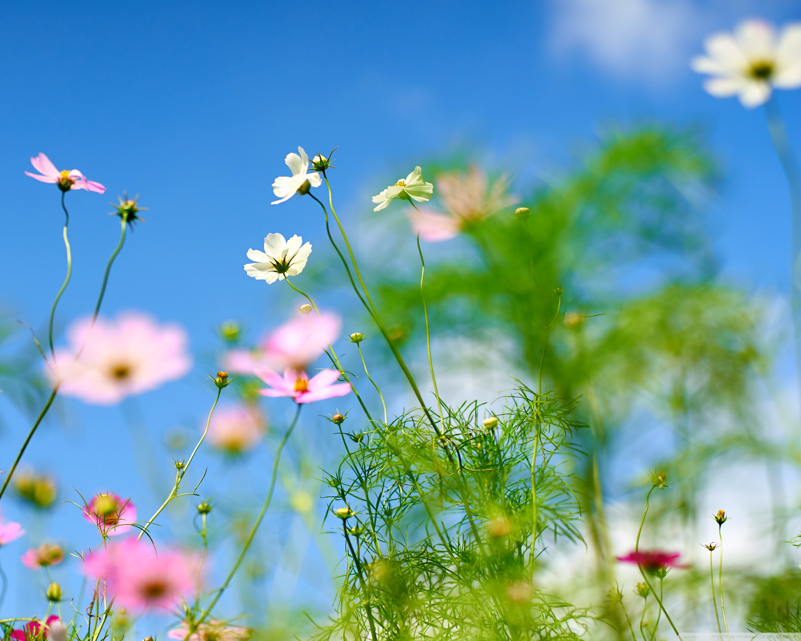 Download Cosmos Flower Field beneath Blue Sky 4K UHD Wallpaper