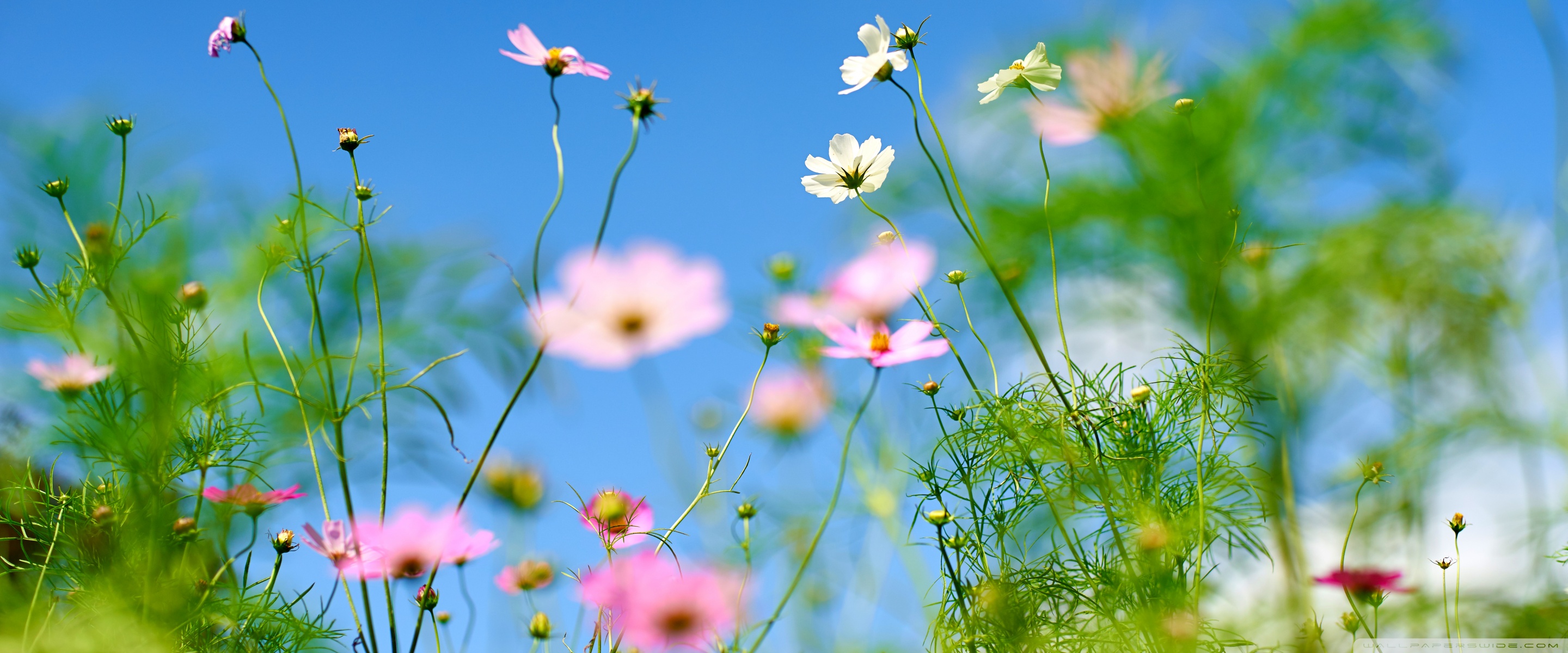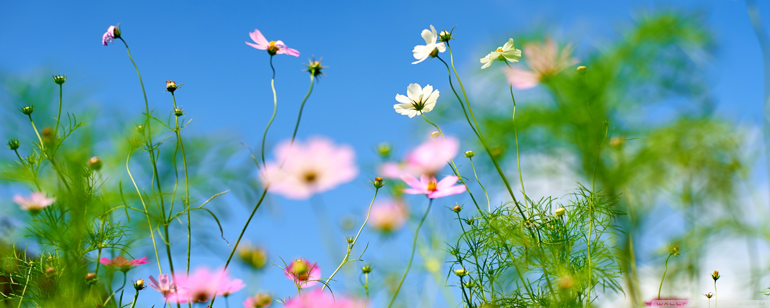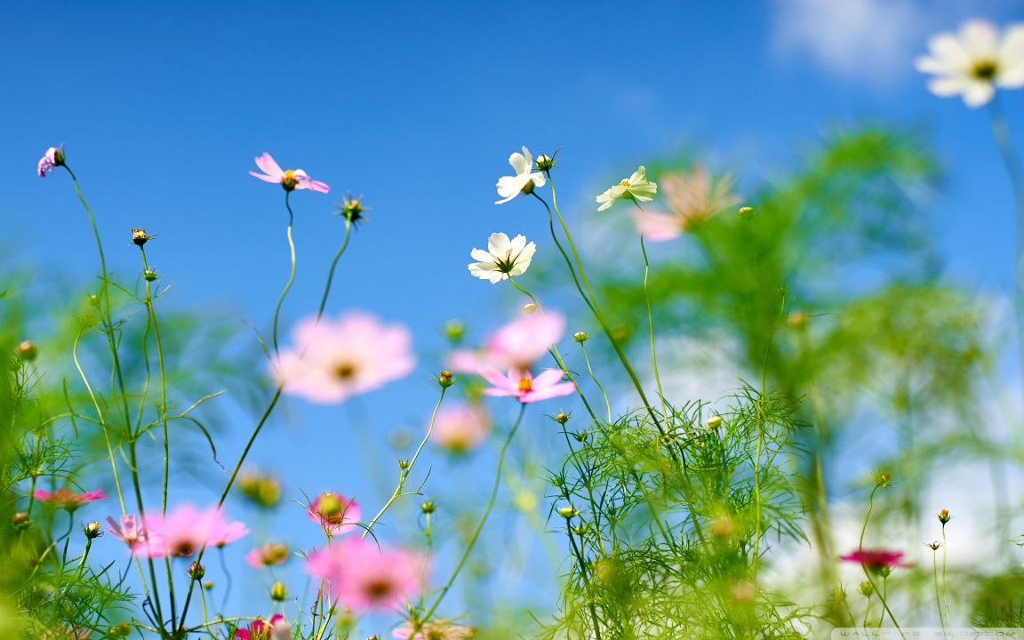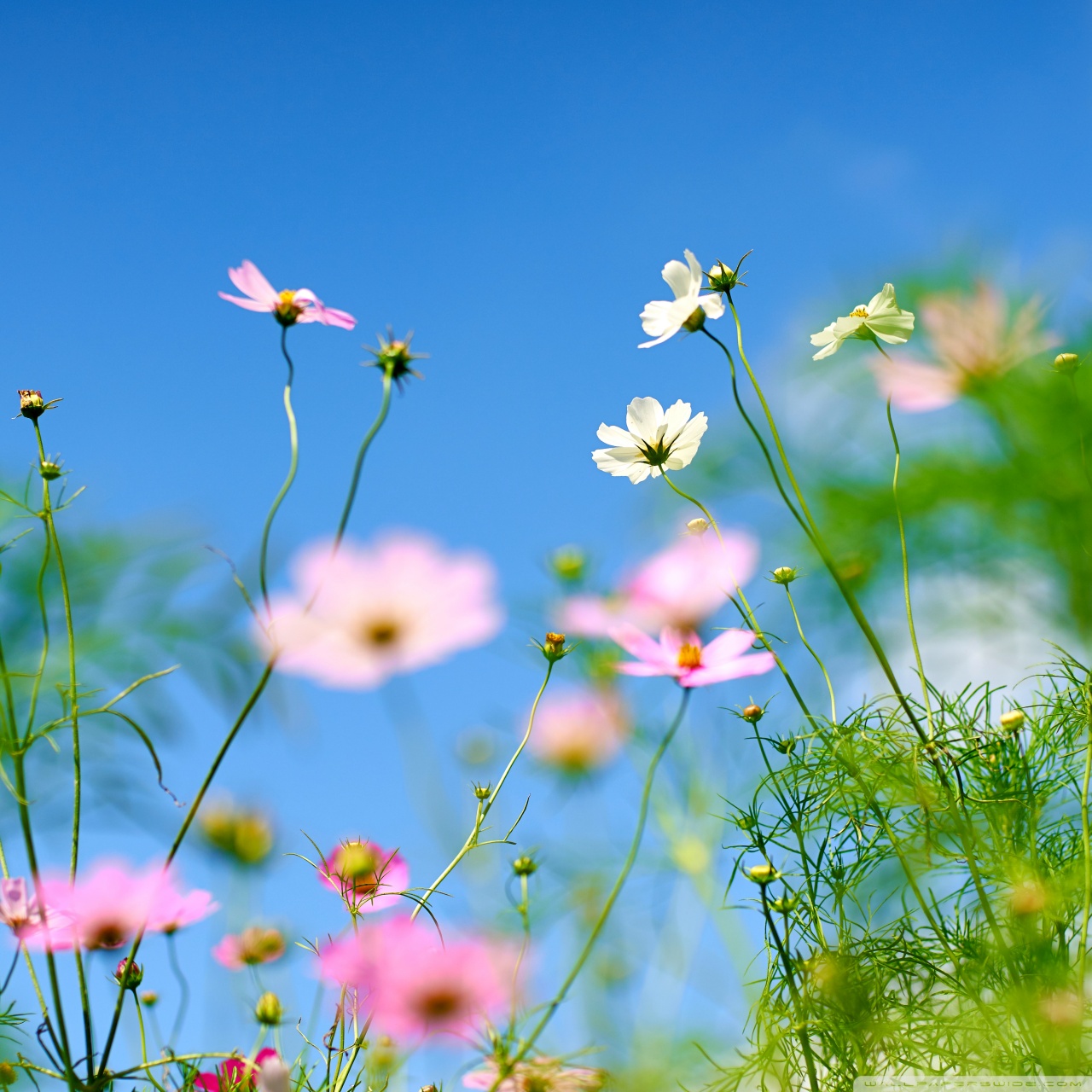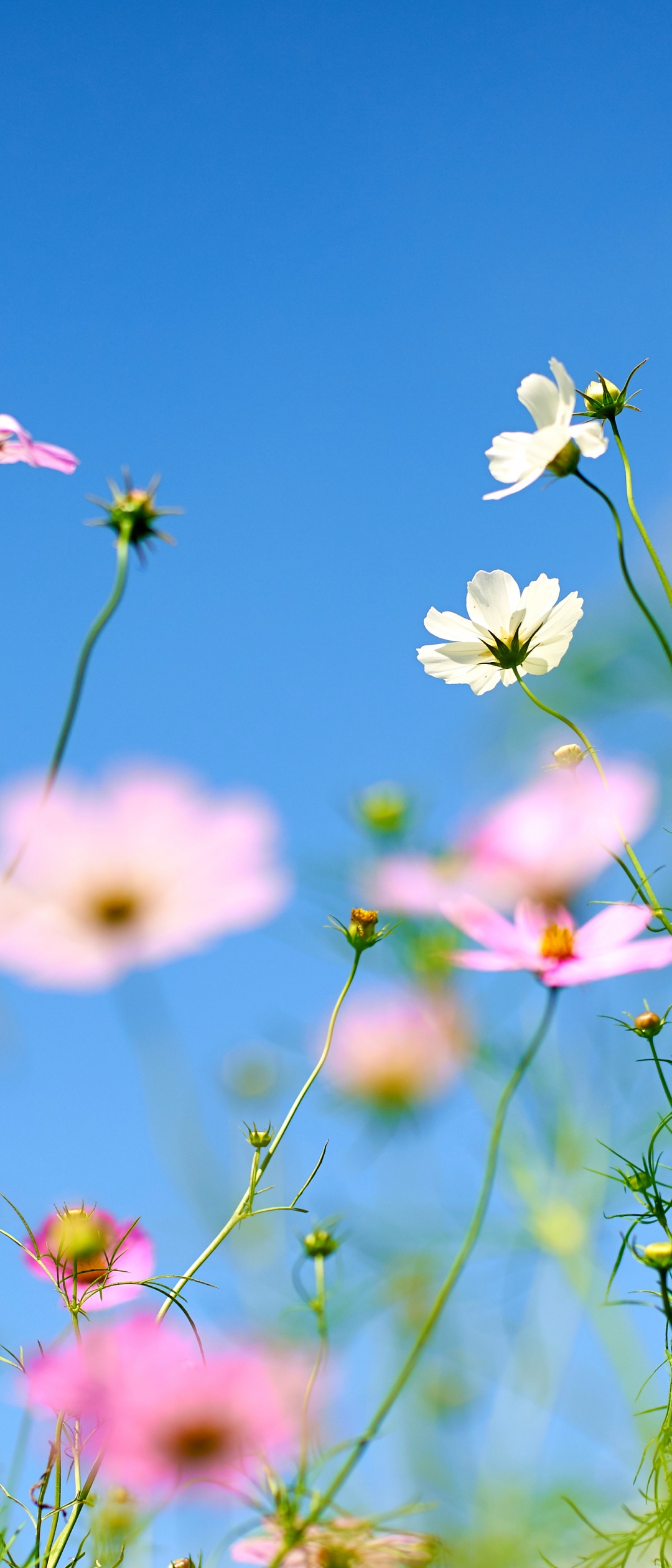 Download Cosmos Flower Field beneath Blue Sky 4K UHD Wallpaper