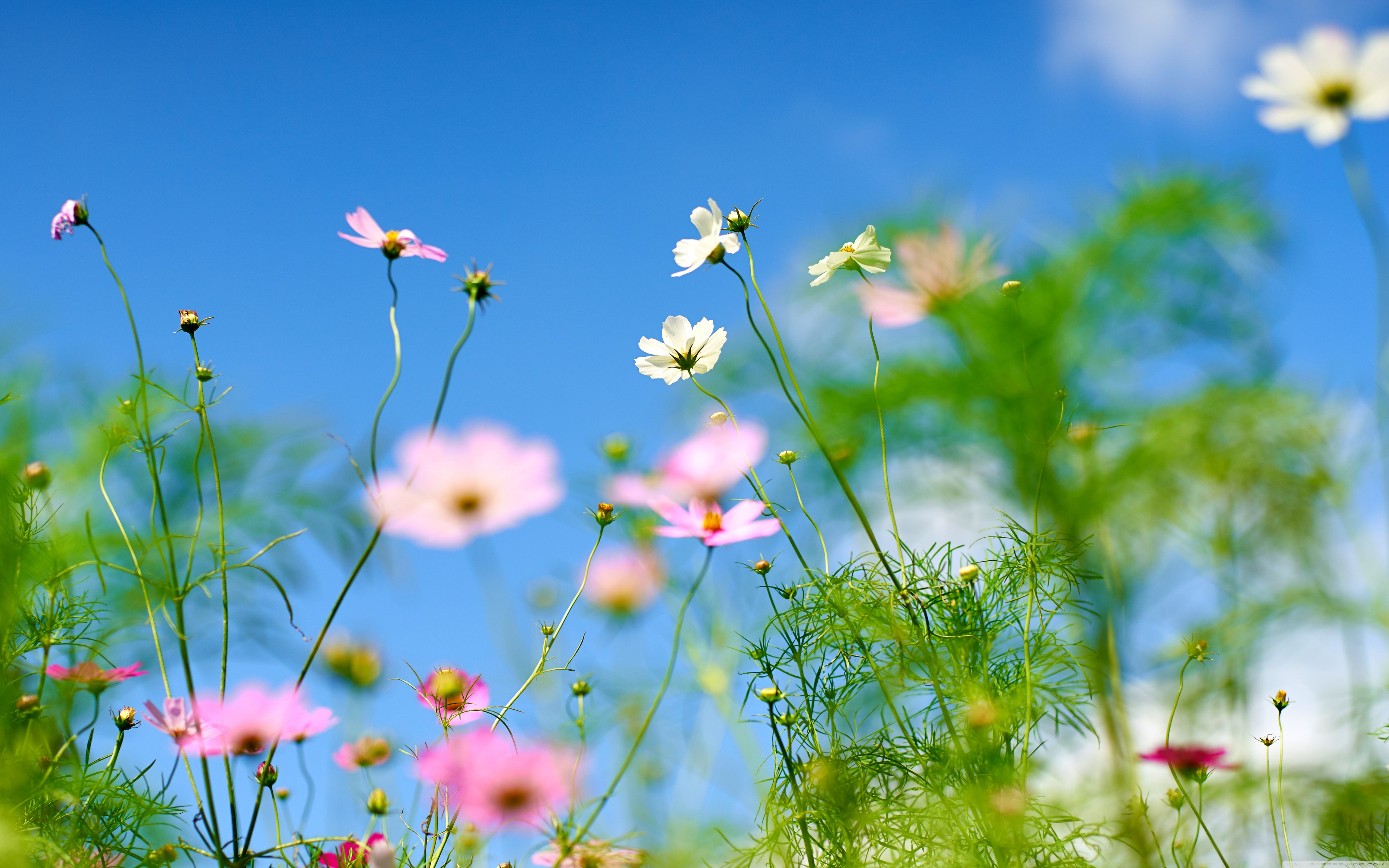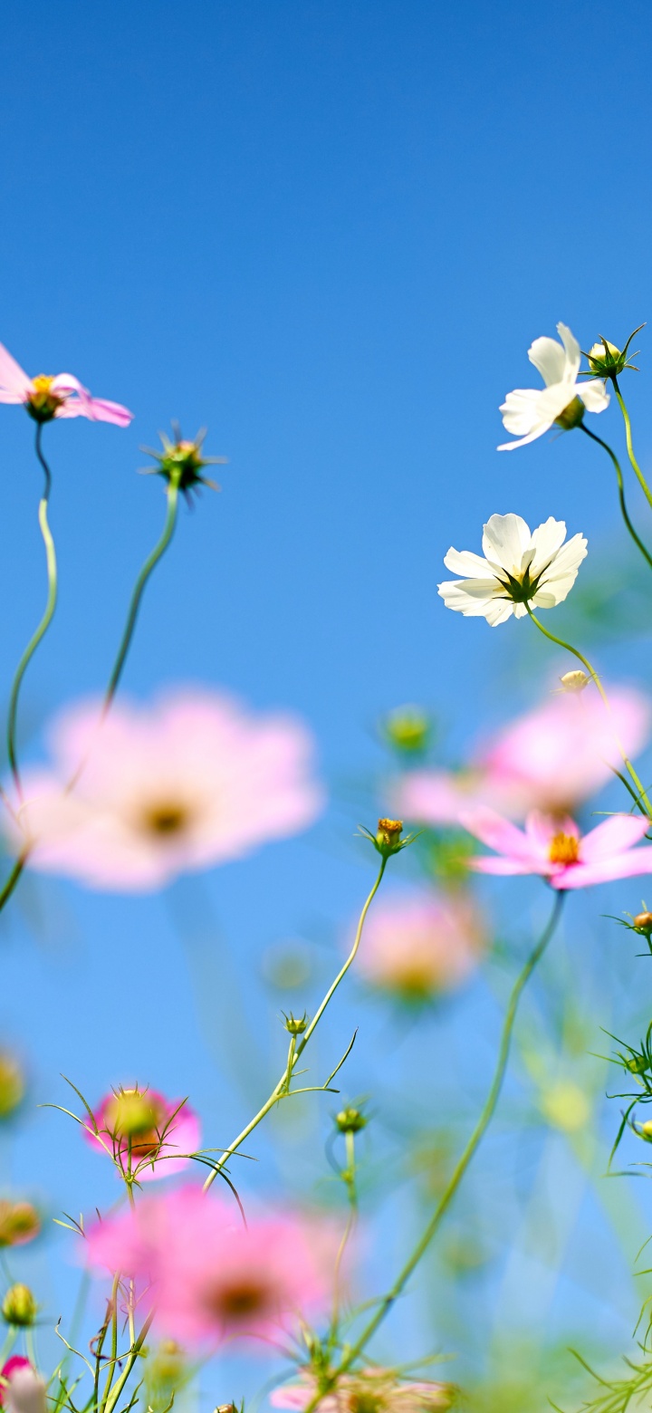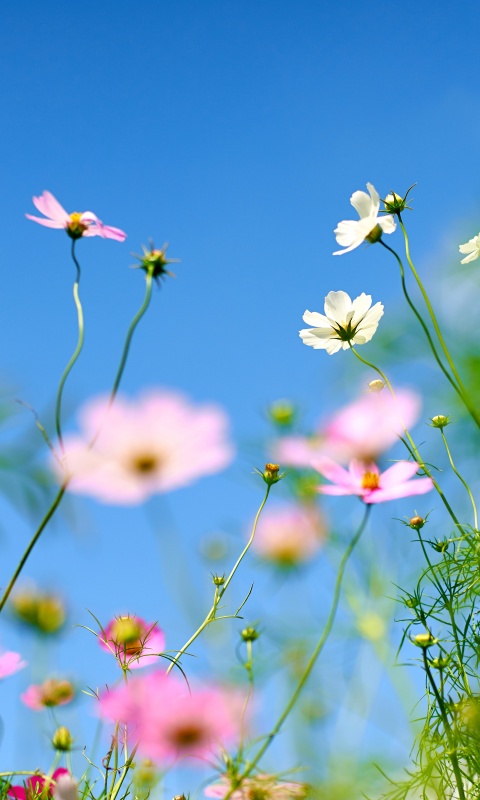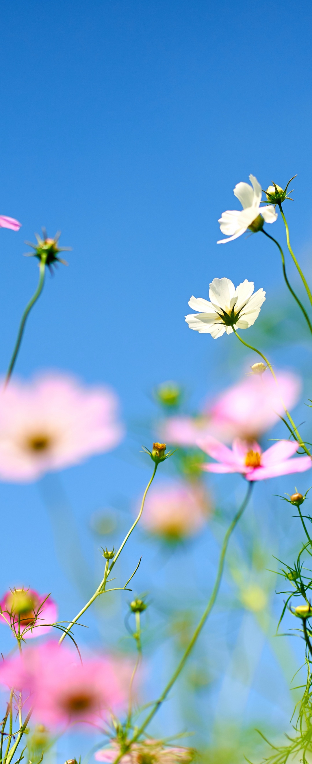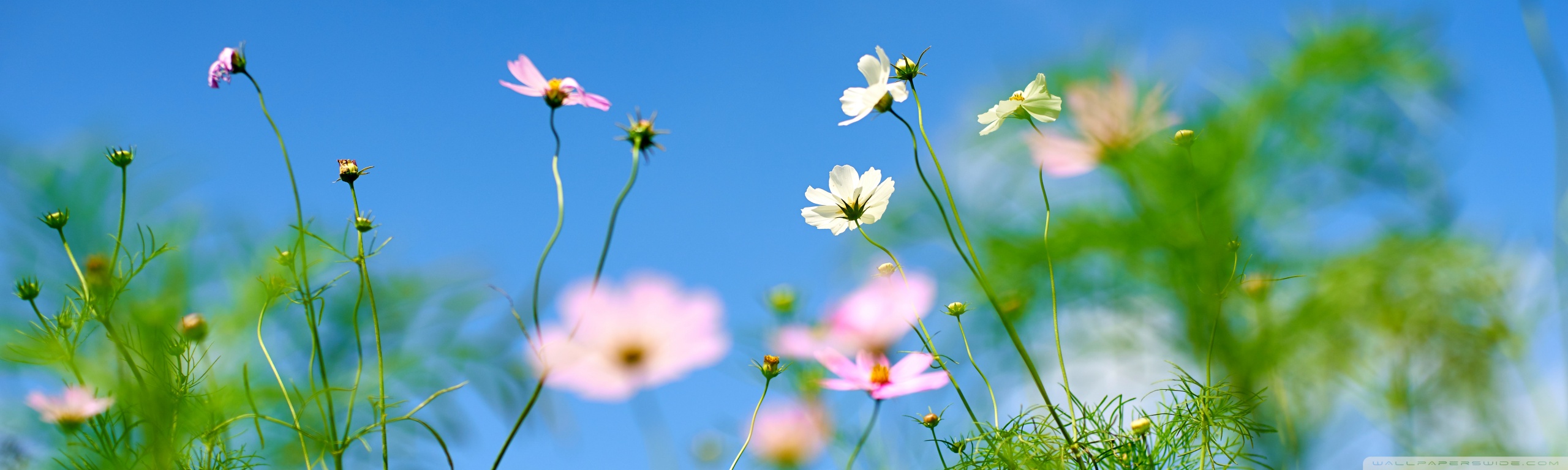 Download Cosmos Flower Field beneath Blue Sky 4K UHD Wallpaper