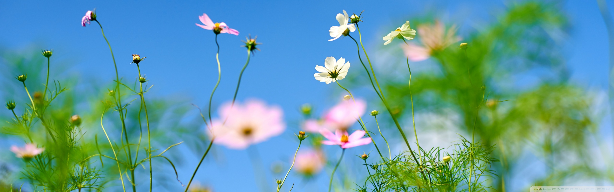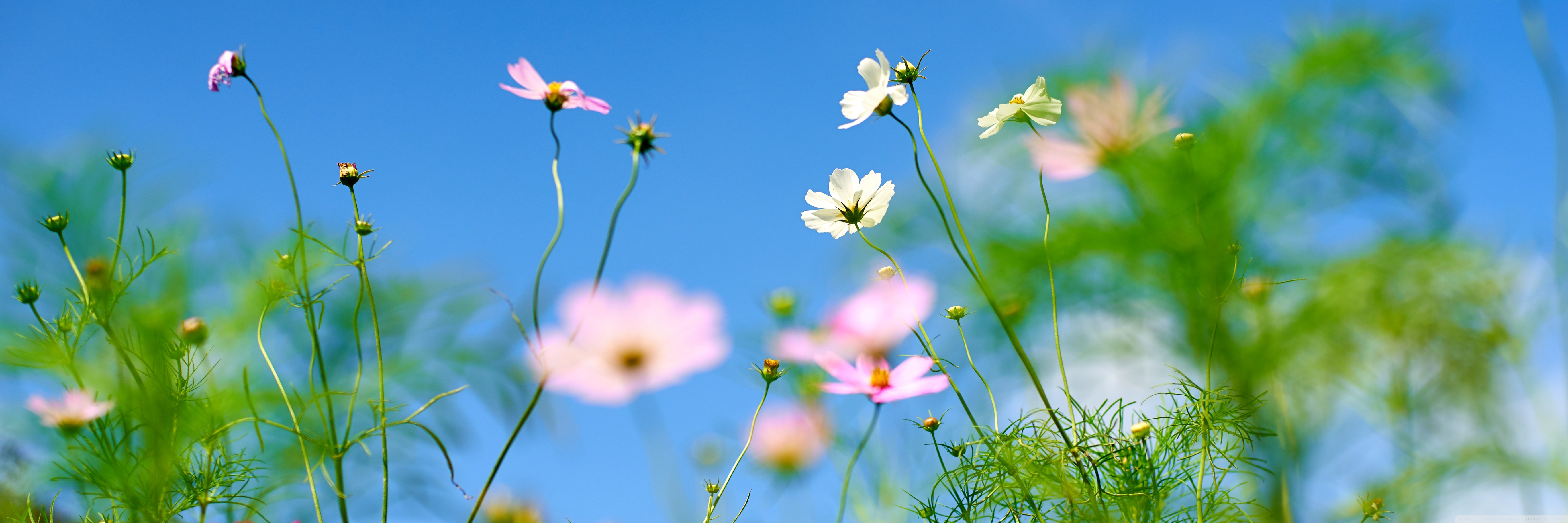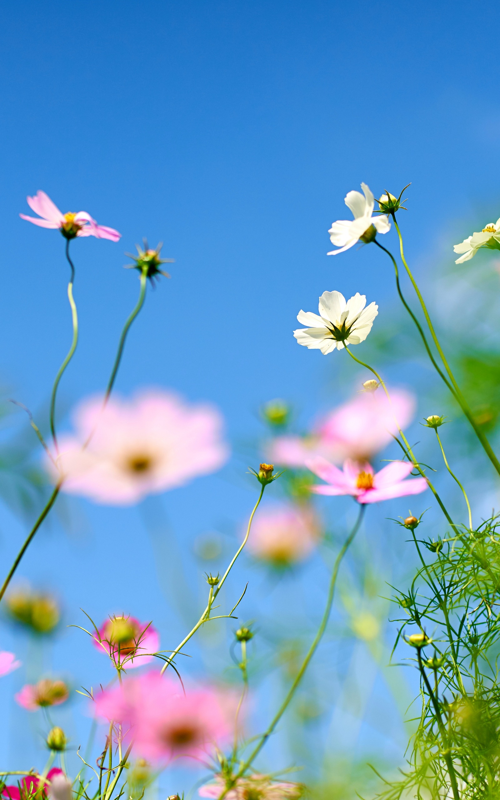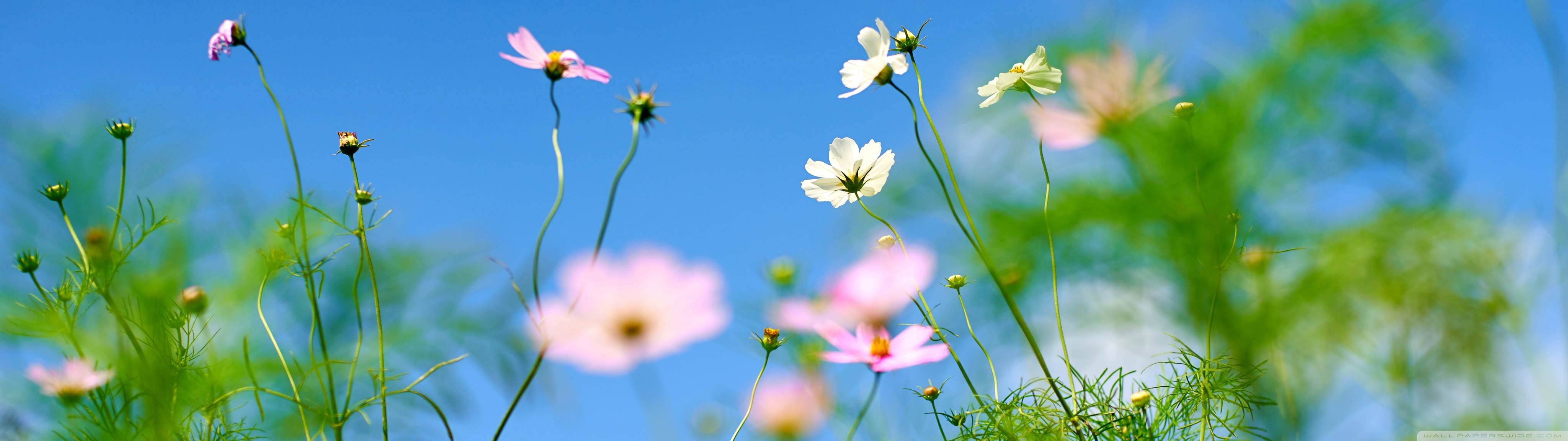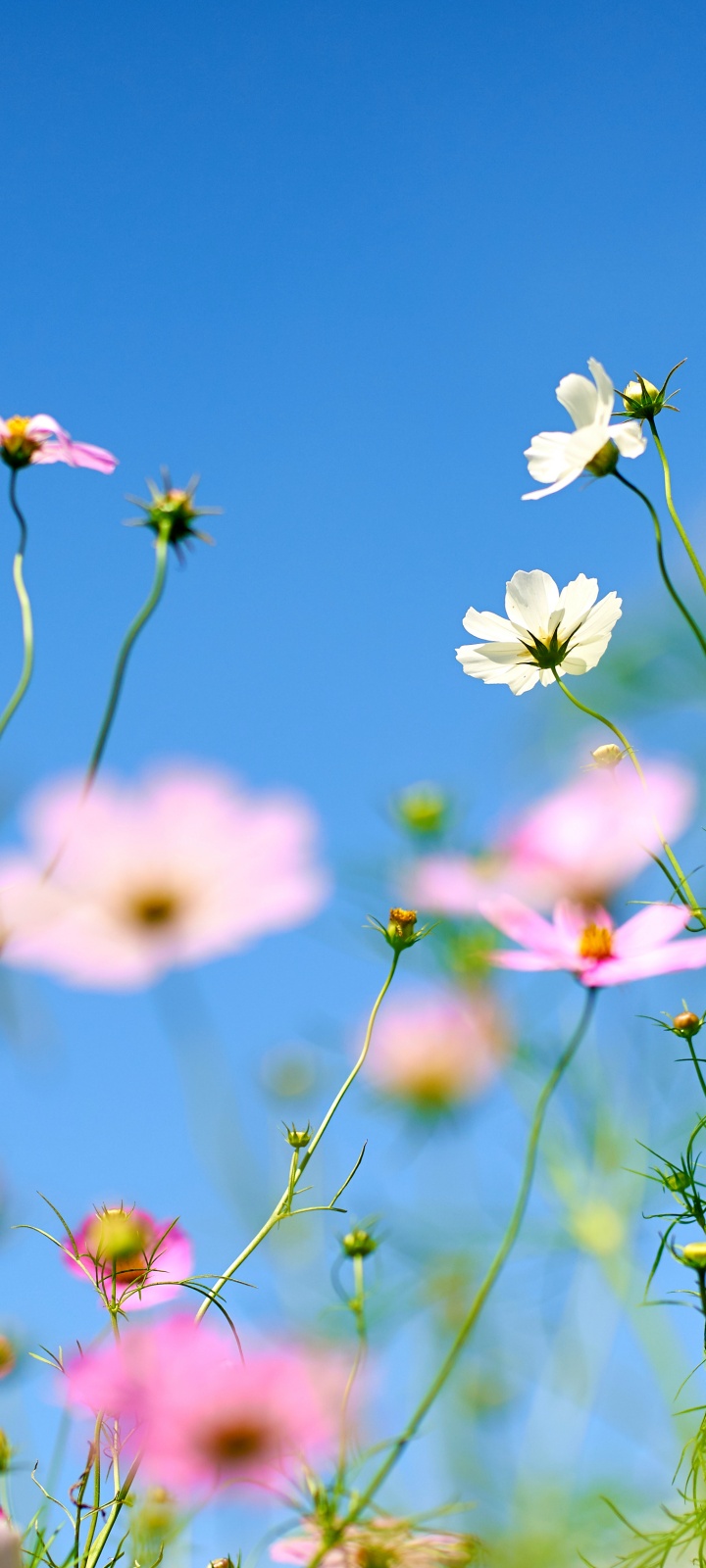 Download Cosmos Flower Field beneath Blue Sky 4K UHD Wallpaper