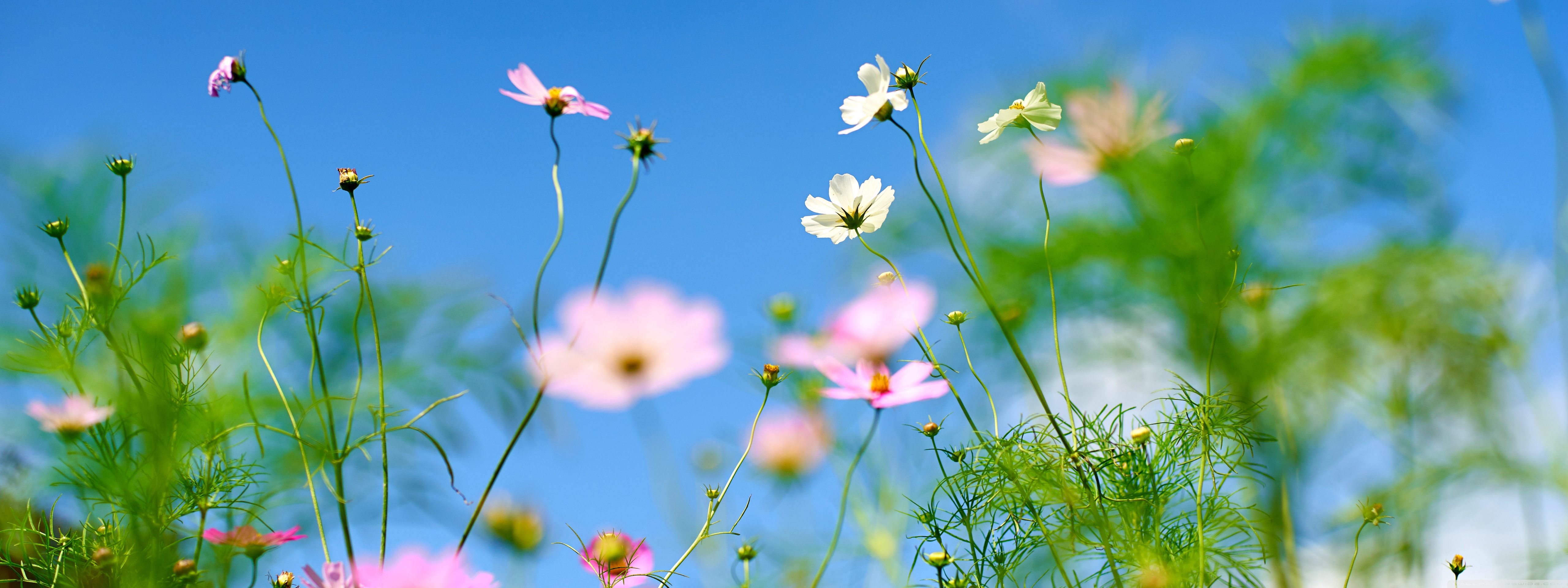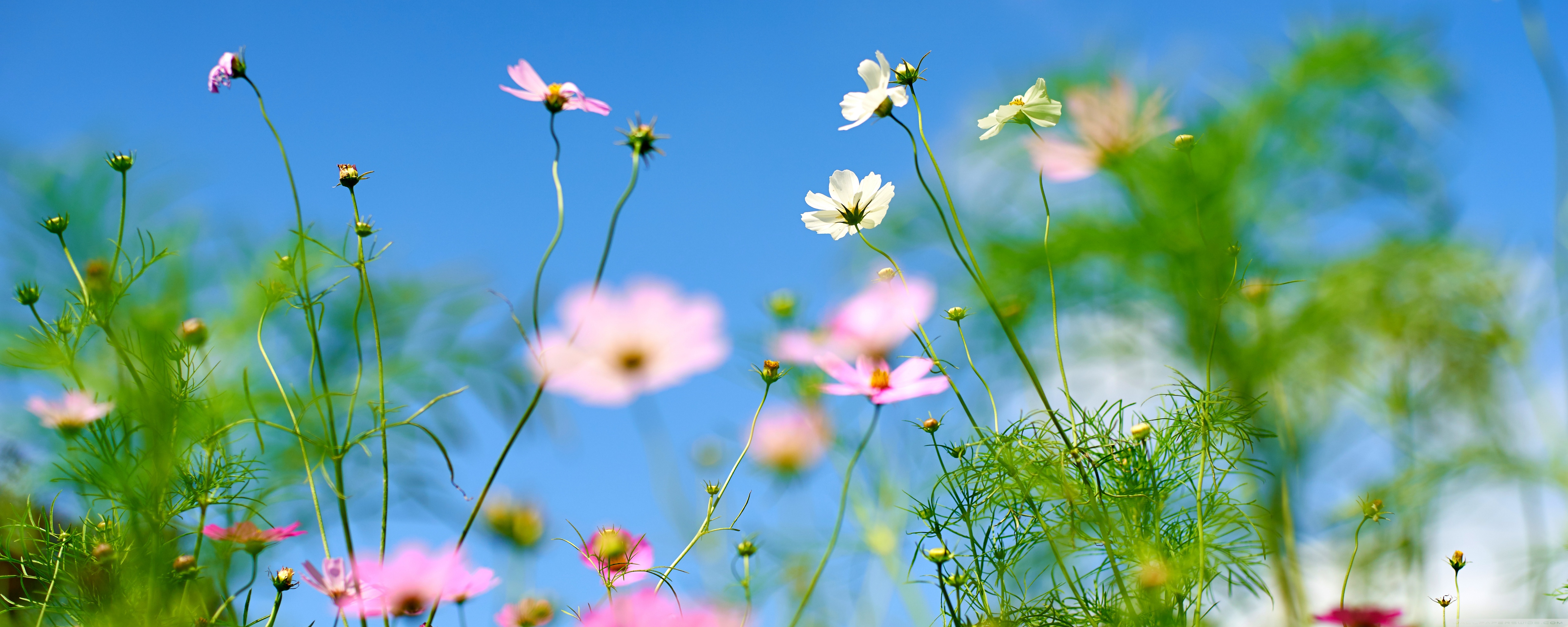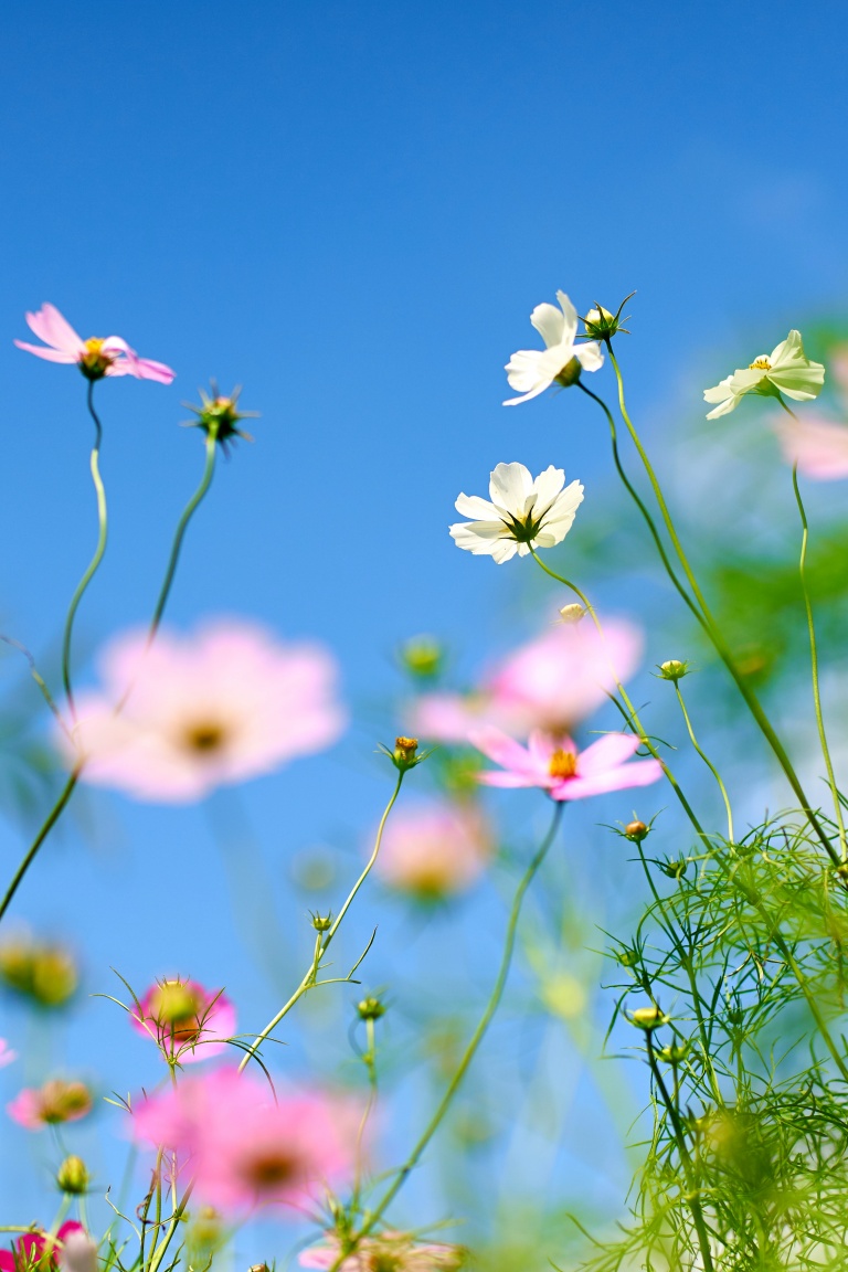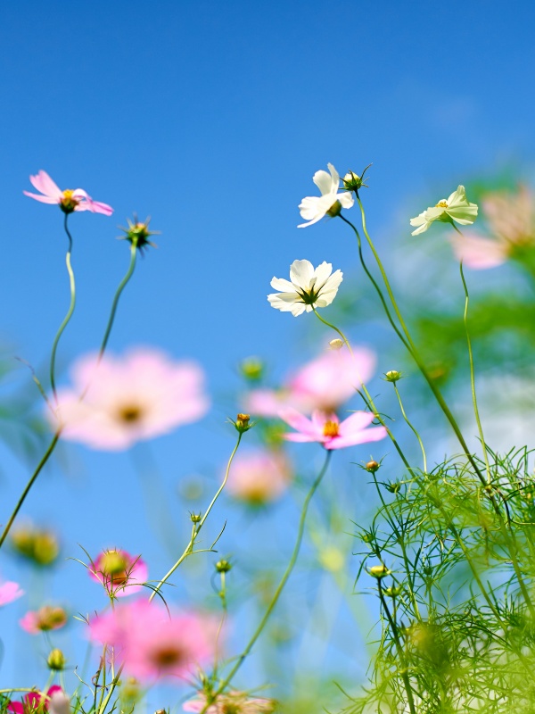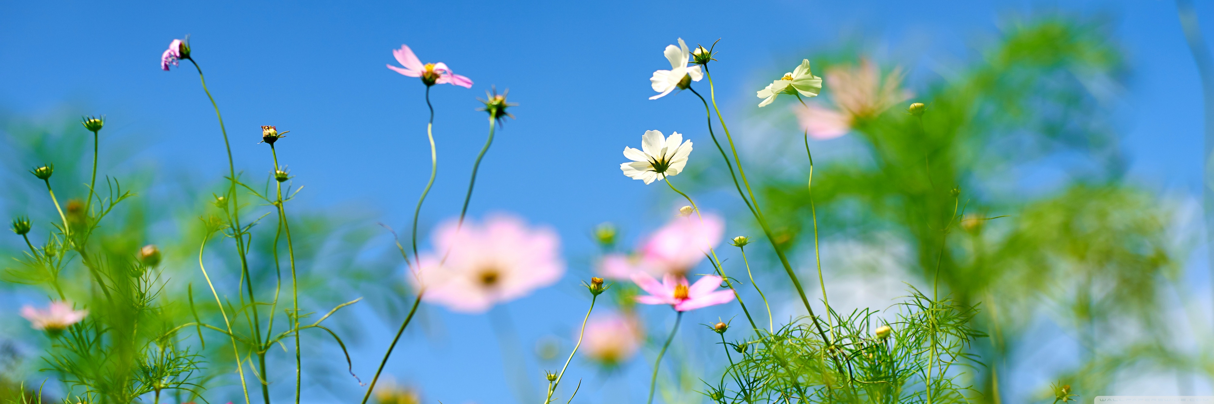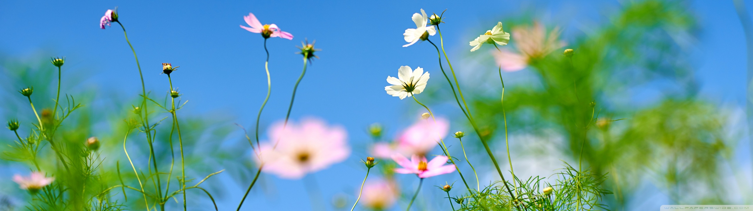 Download Cosmos Flower Field beneath Blue Sky 4K UHD Wallpaper
