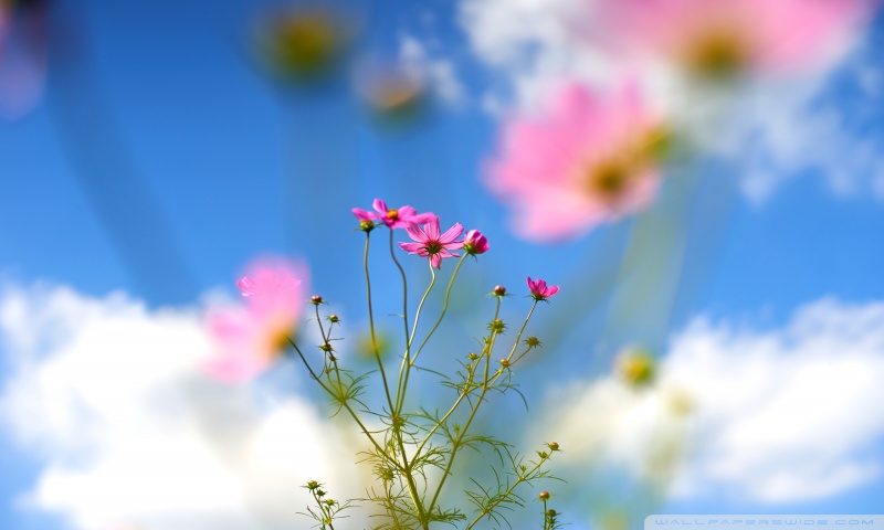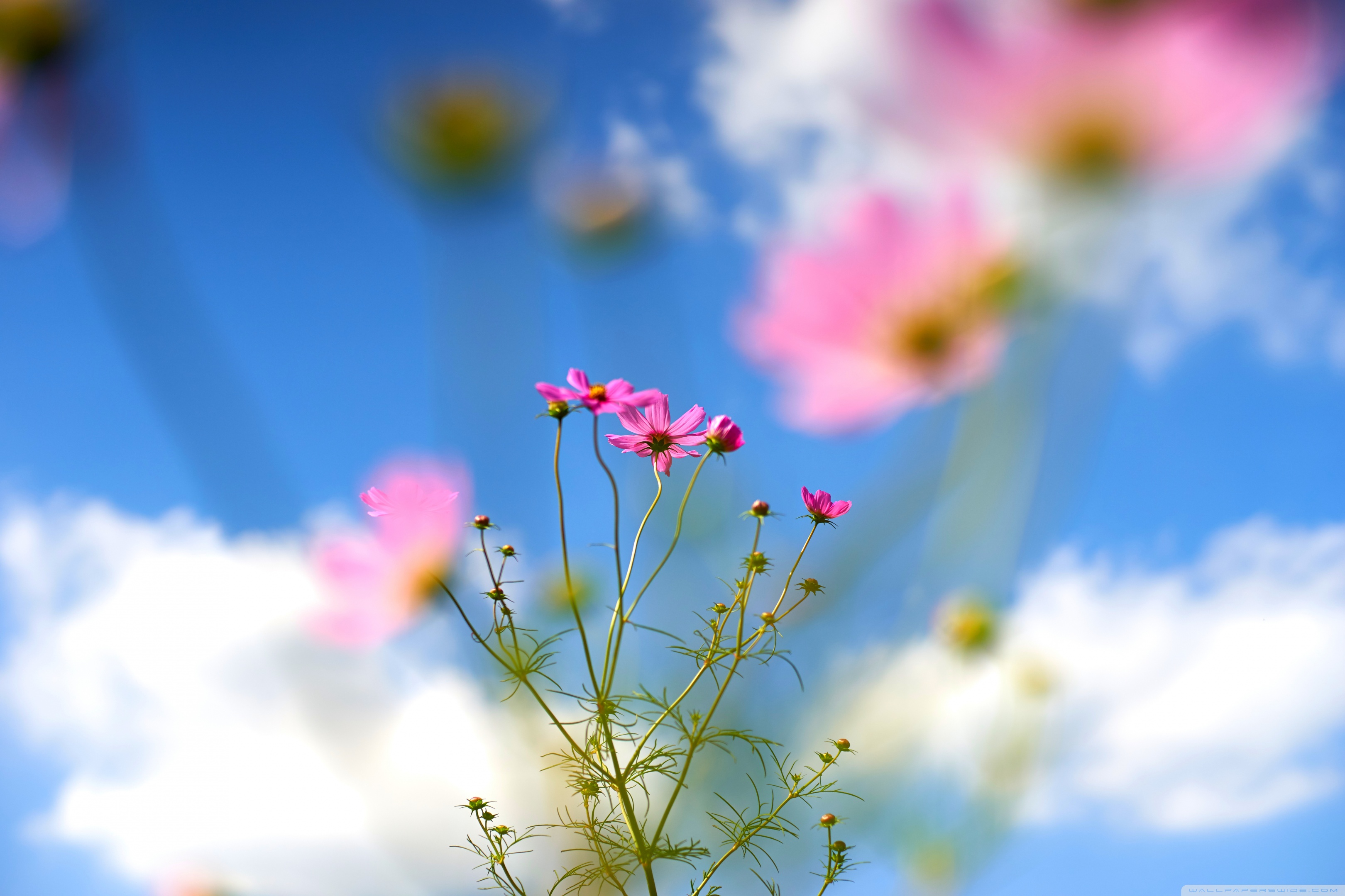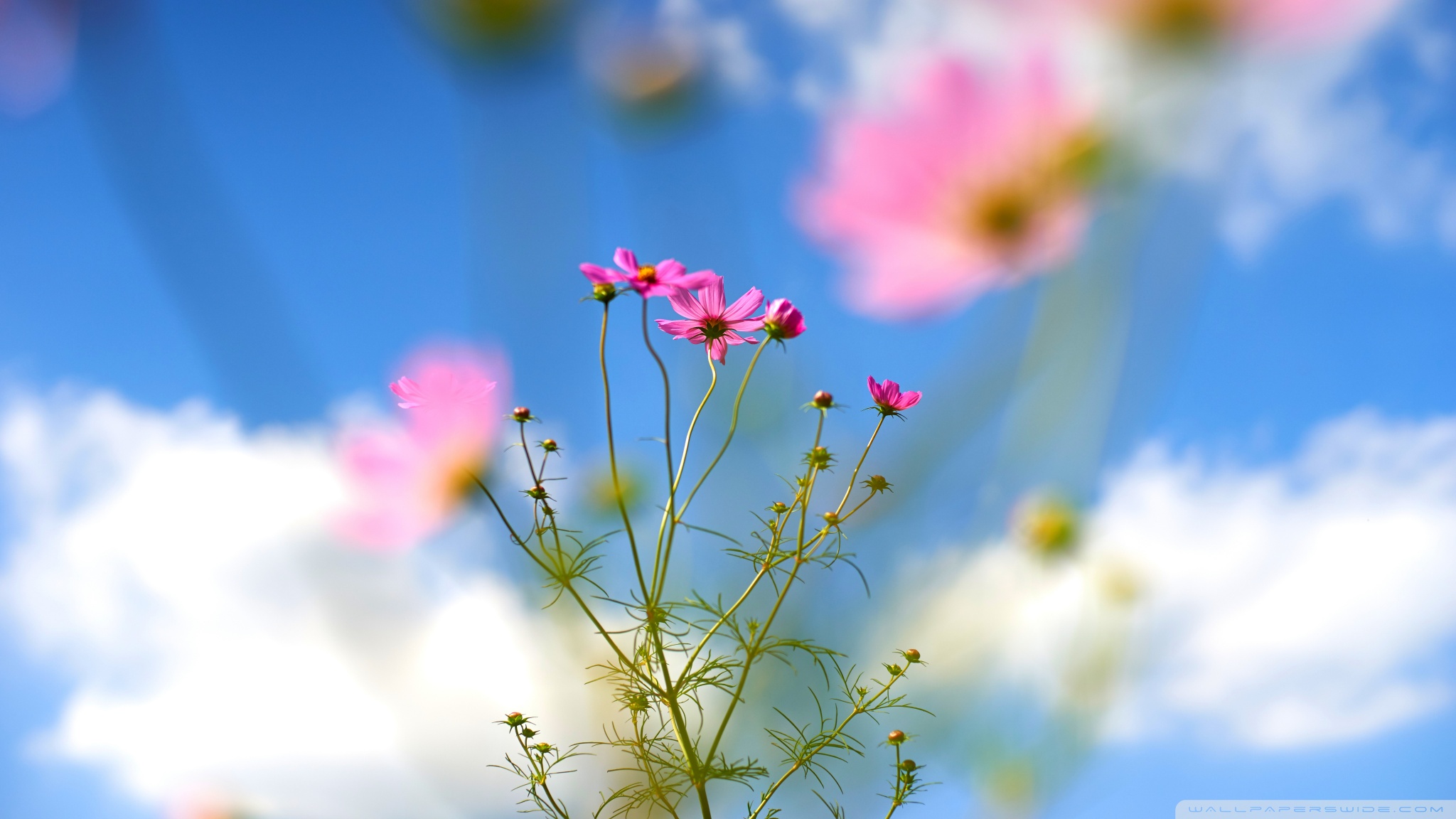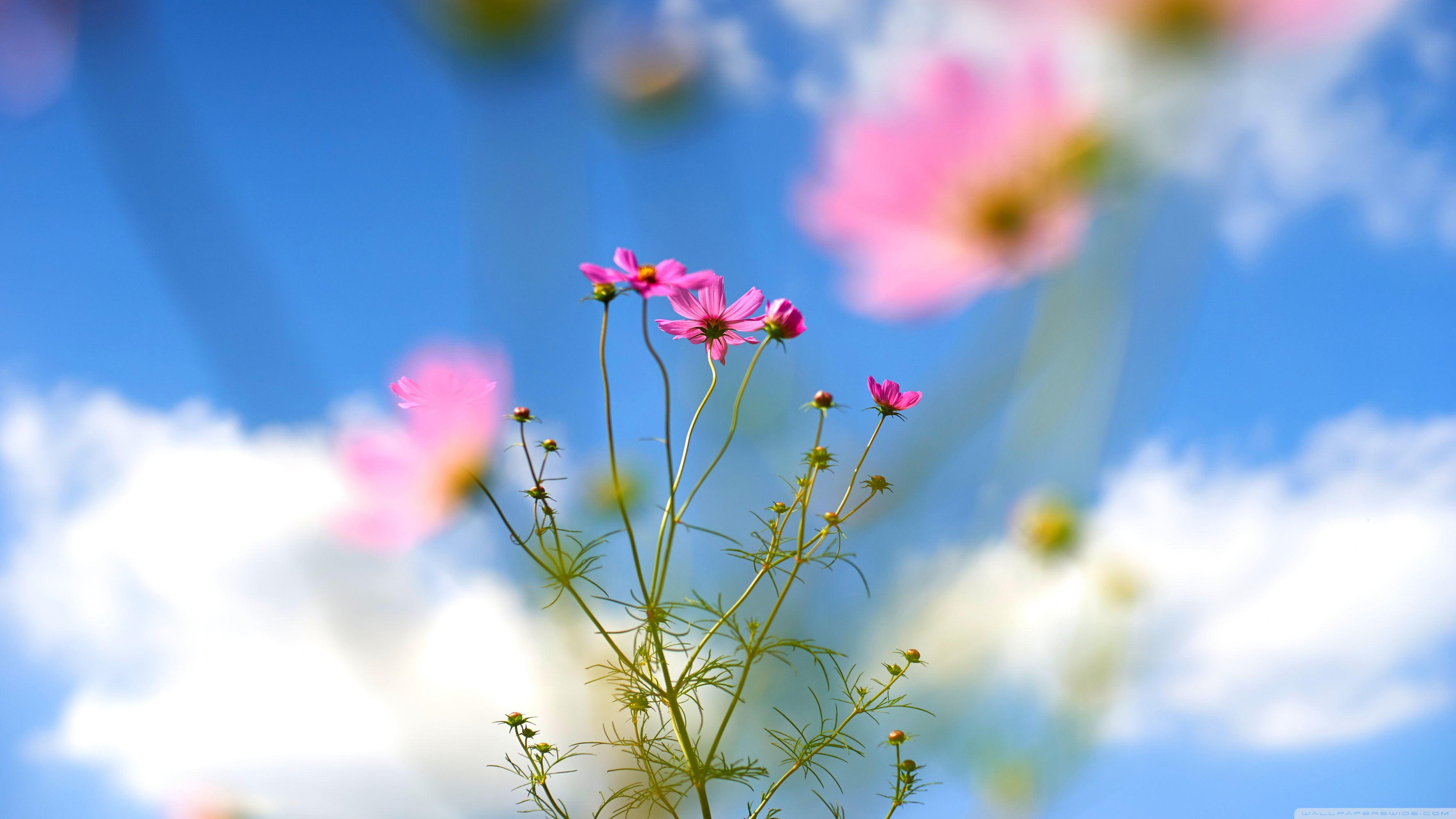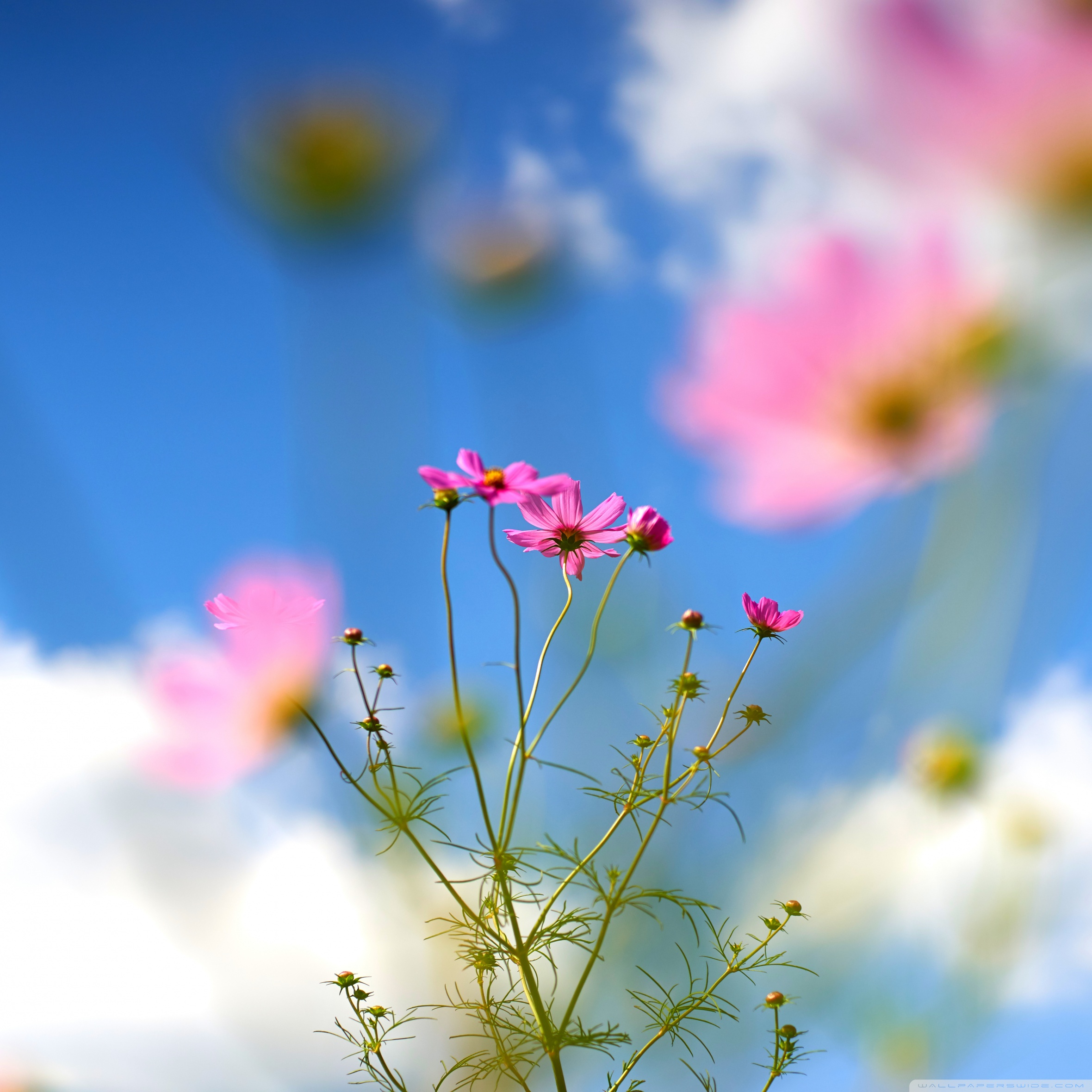 Download Cosmos Flowers in a Field under Blue Sky 4K UHD Wallpaper