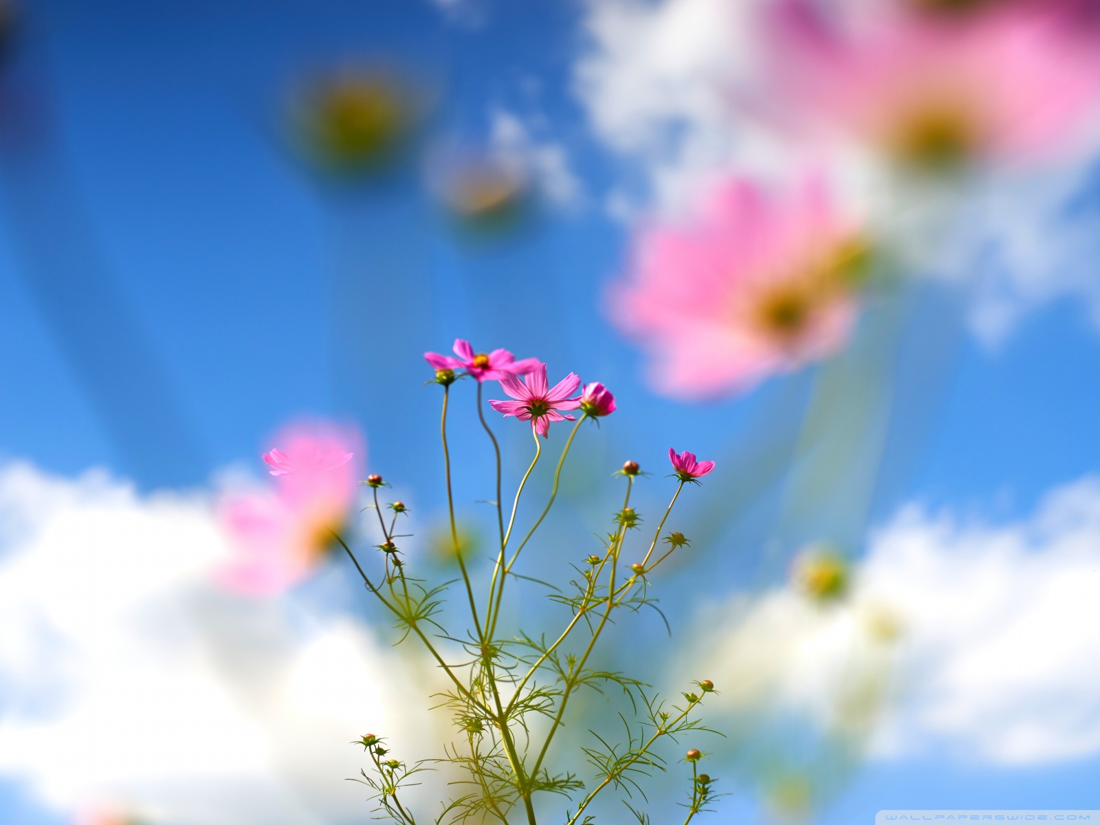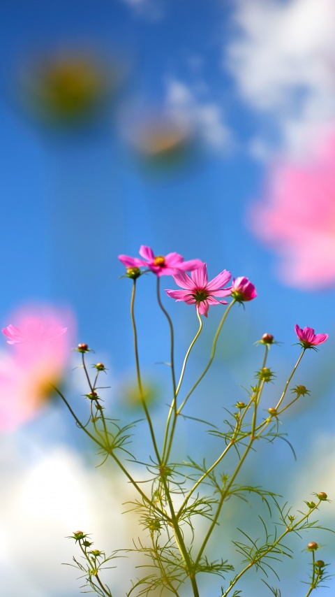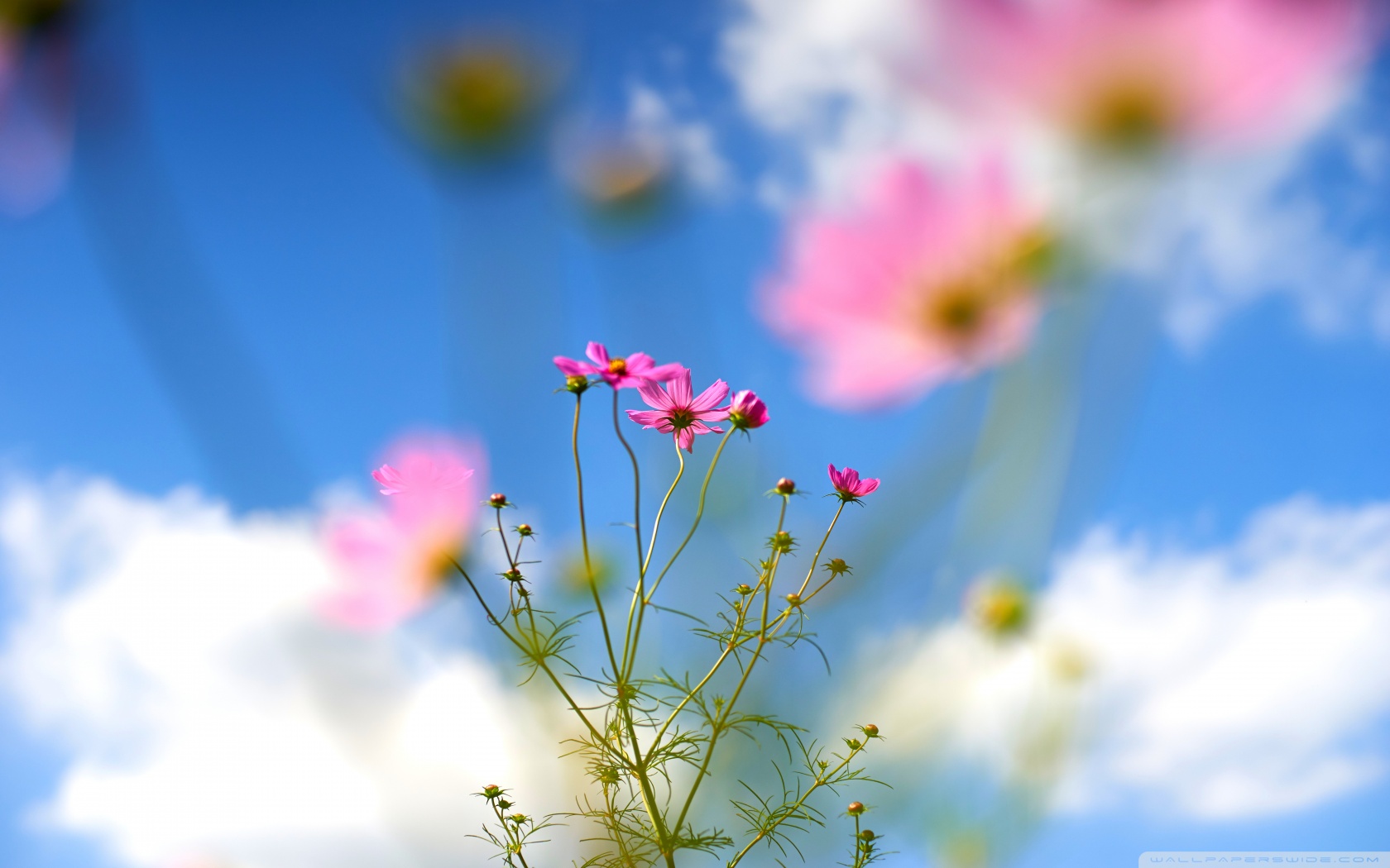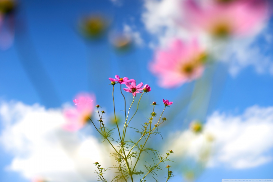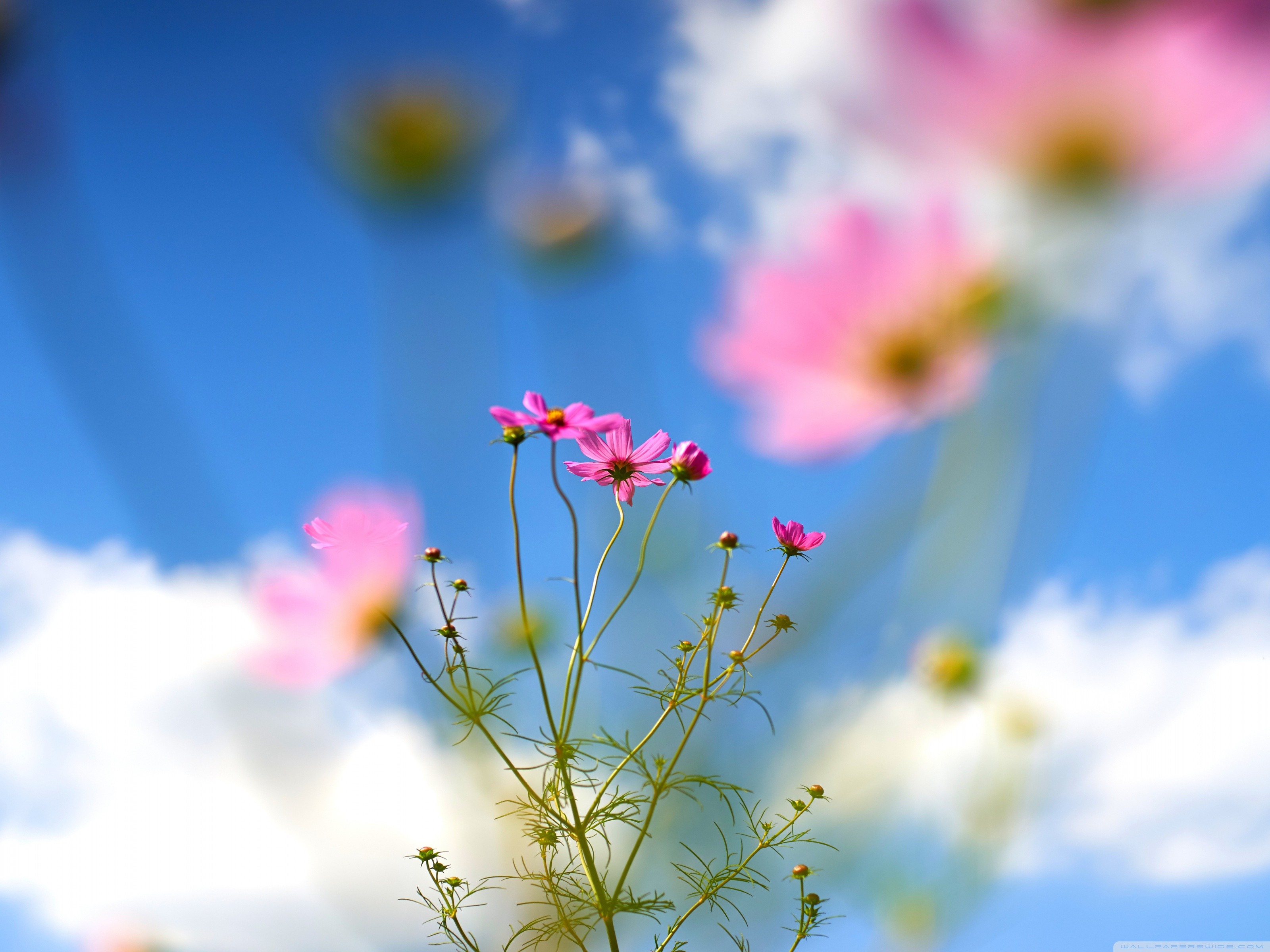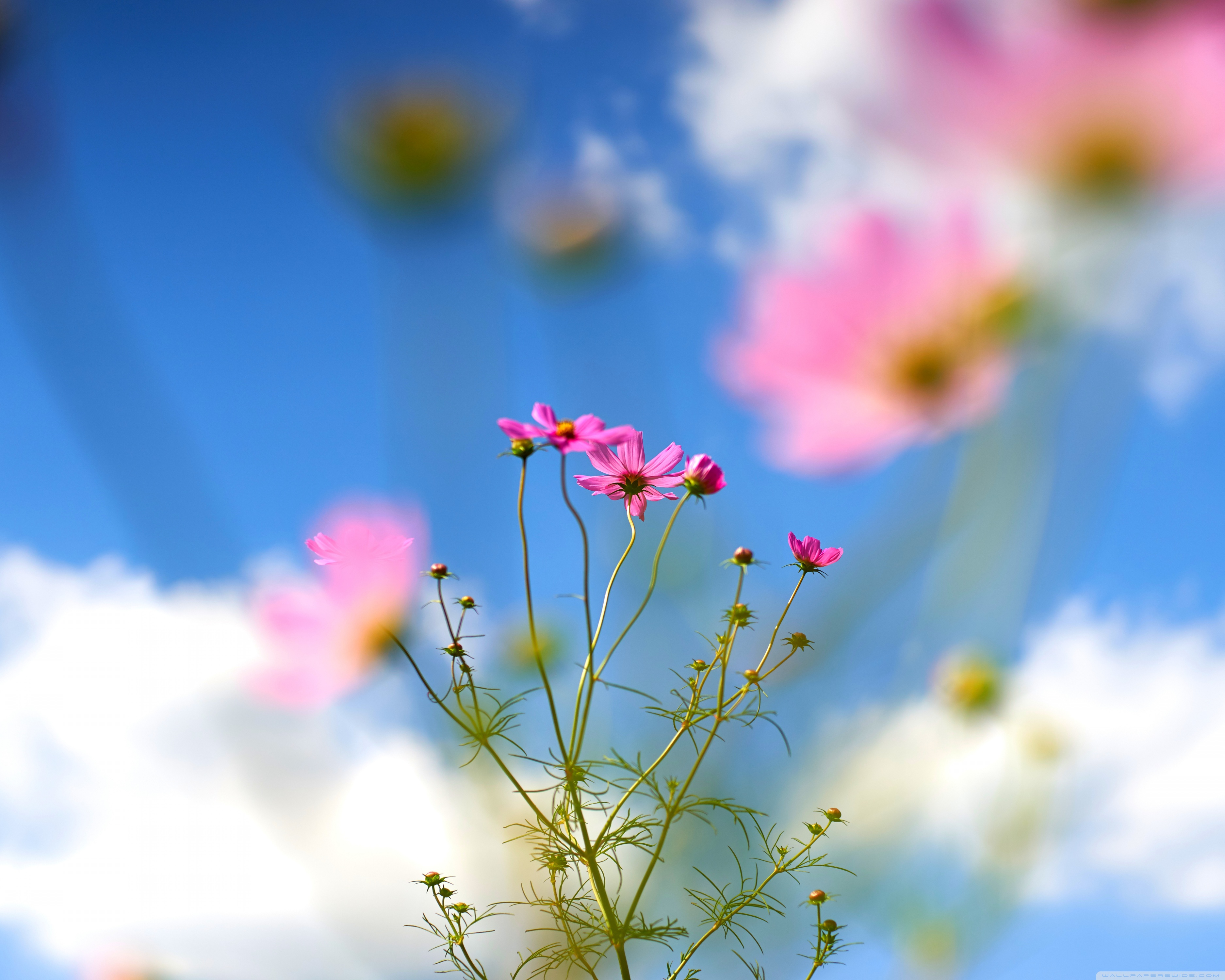 Download Cosmos Flowers in a Field under Blue Sky 4K UHD Wallpaper