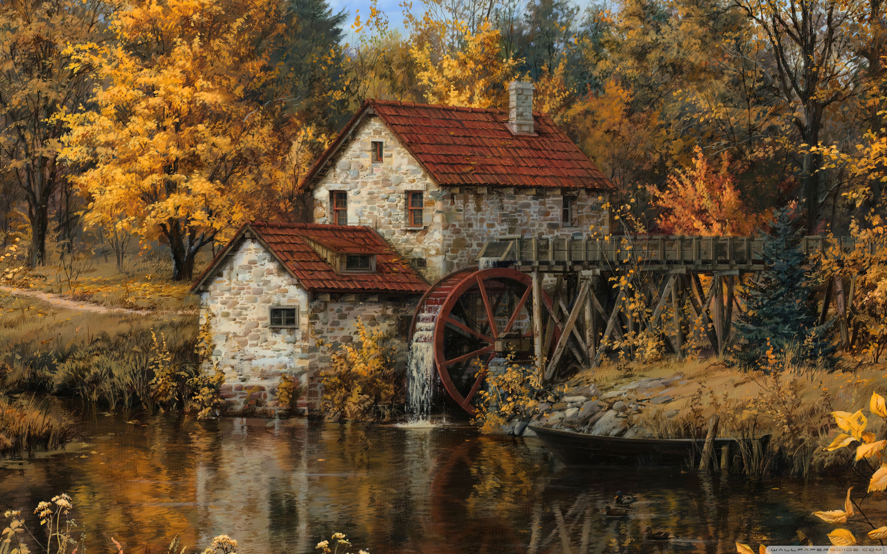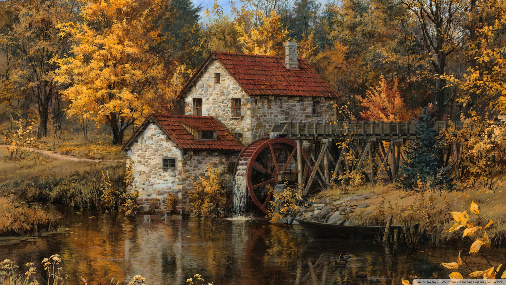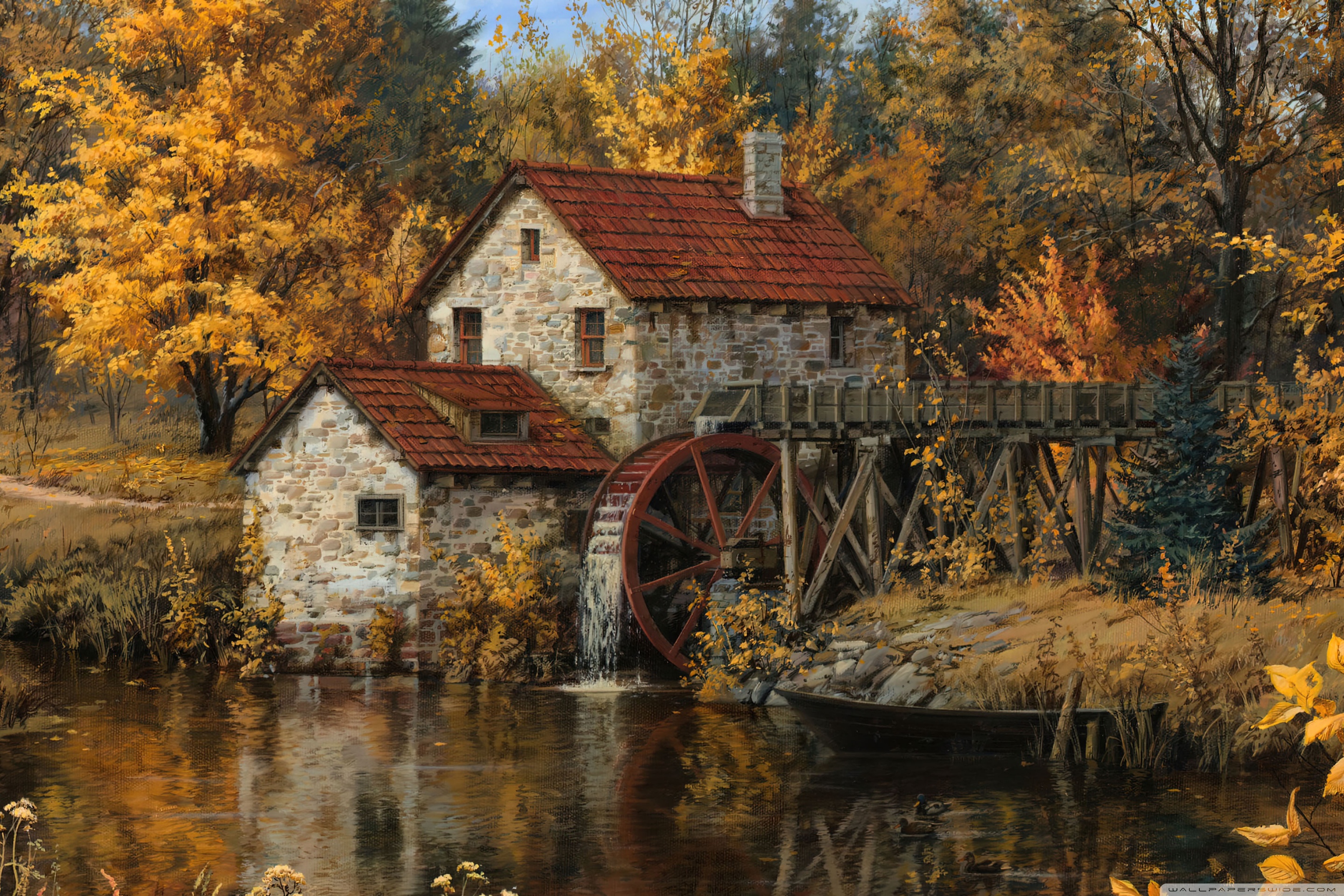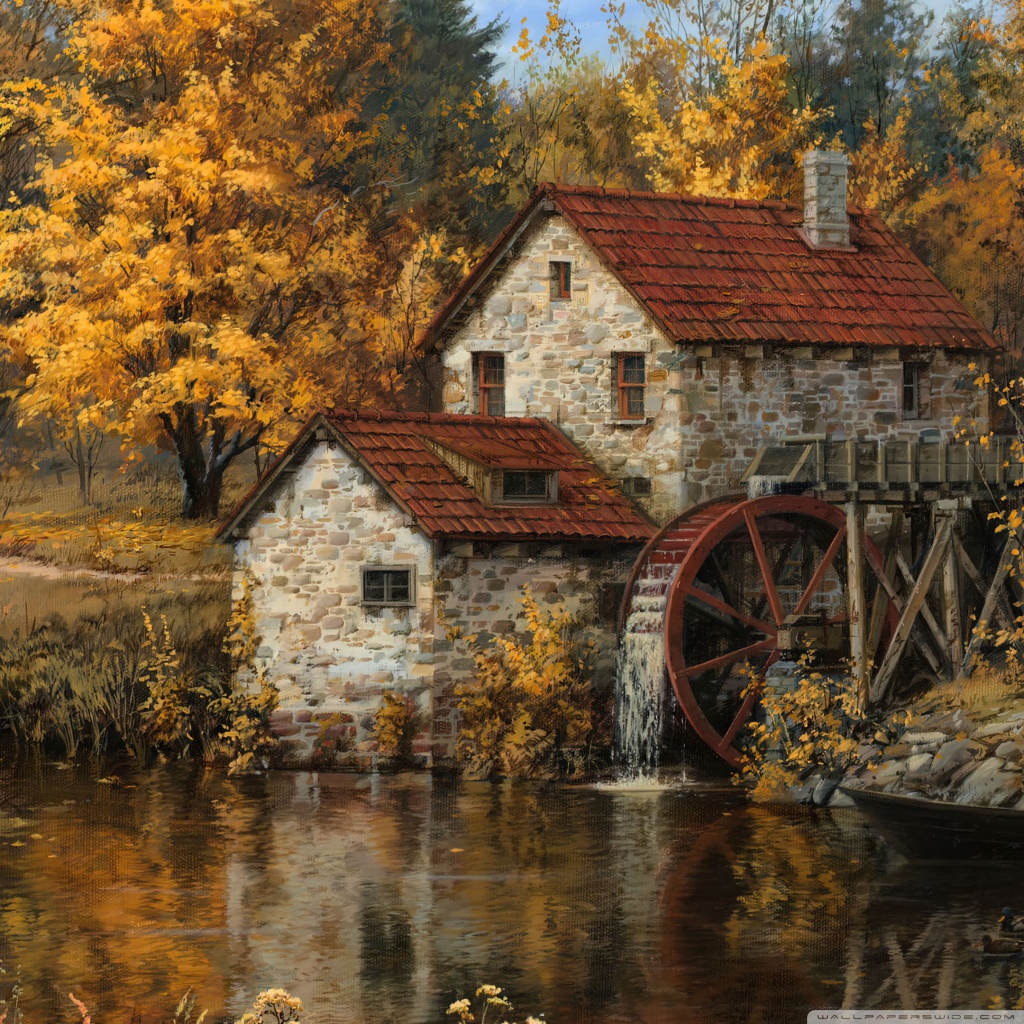 Download Countryside Watermill, Fall Scenery 4K UHD Wallpaper