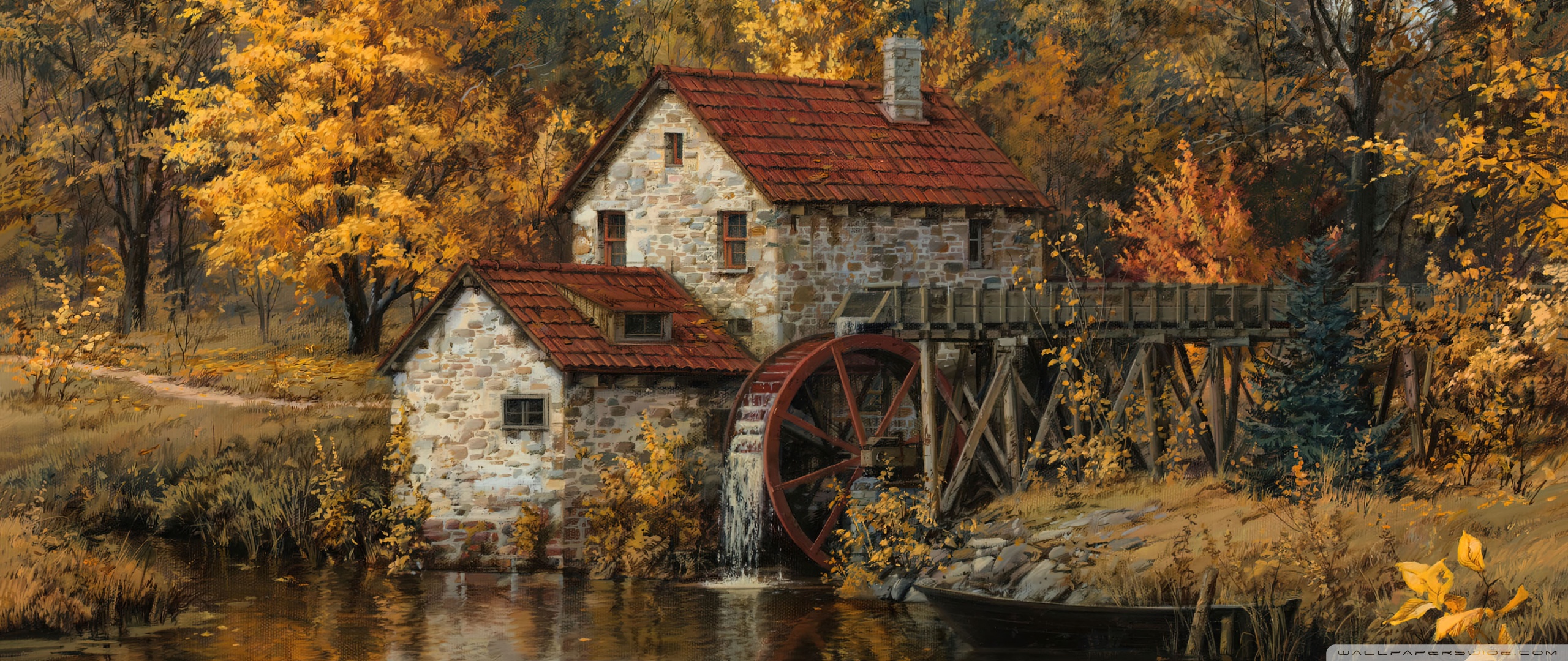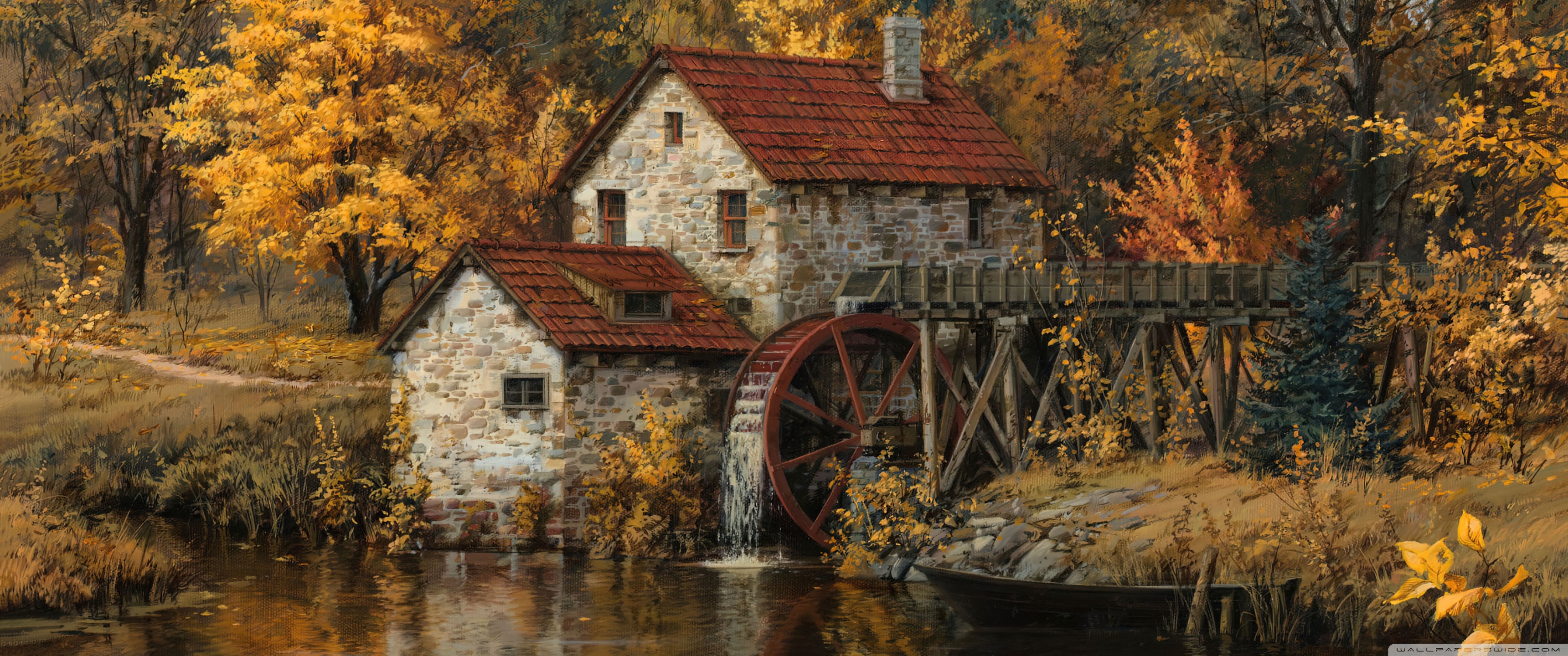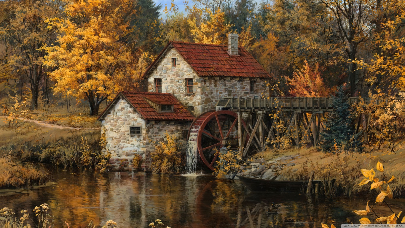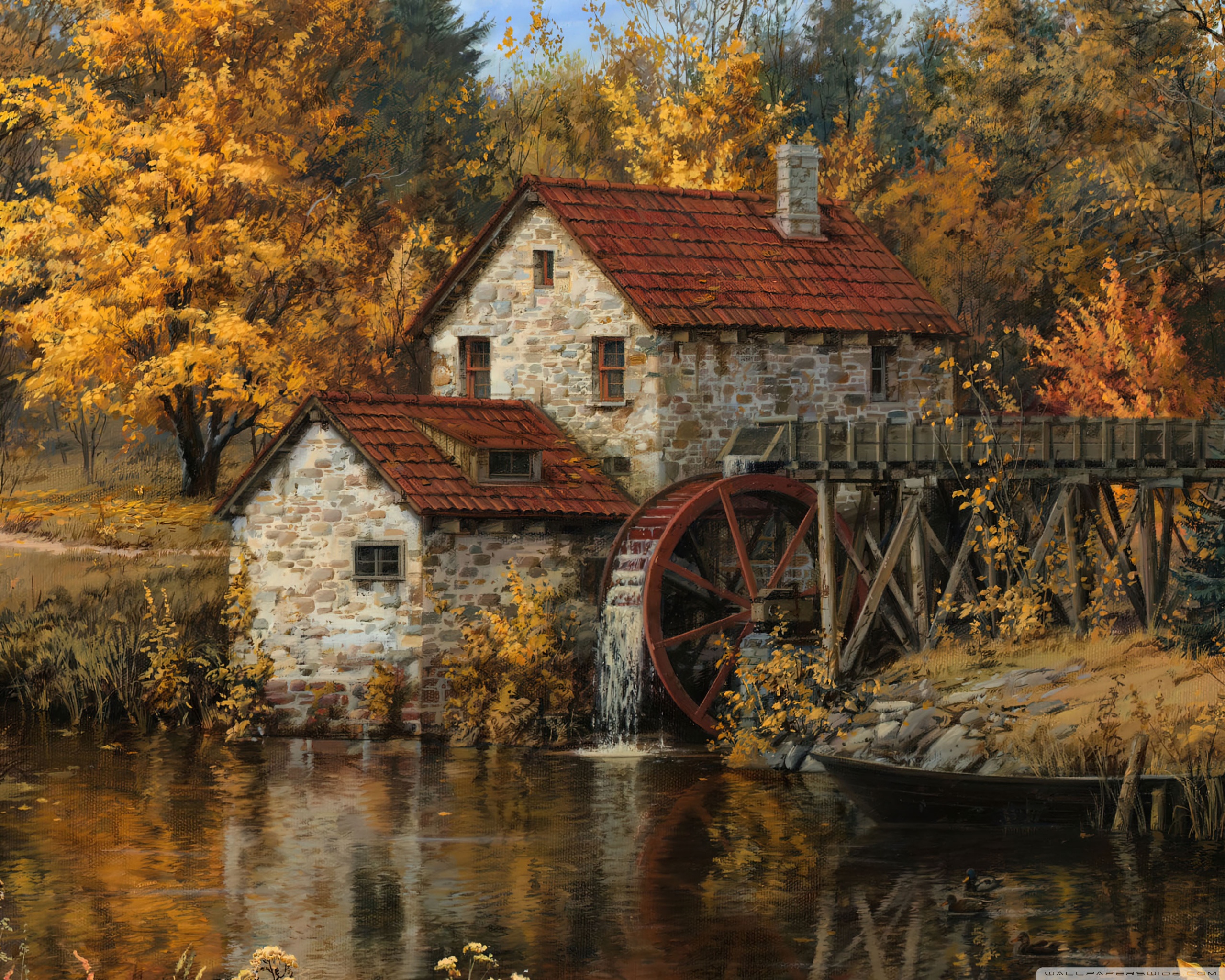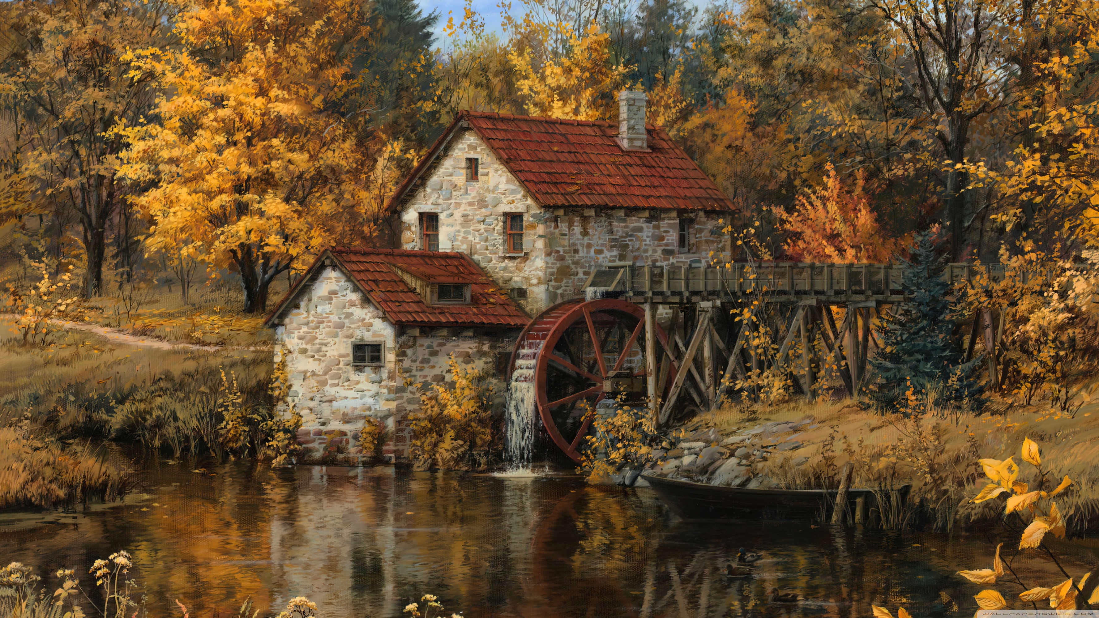 Download Countryside Watermill, Fall Scenery 4K UHD Wallpaper