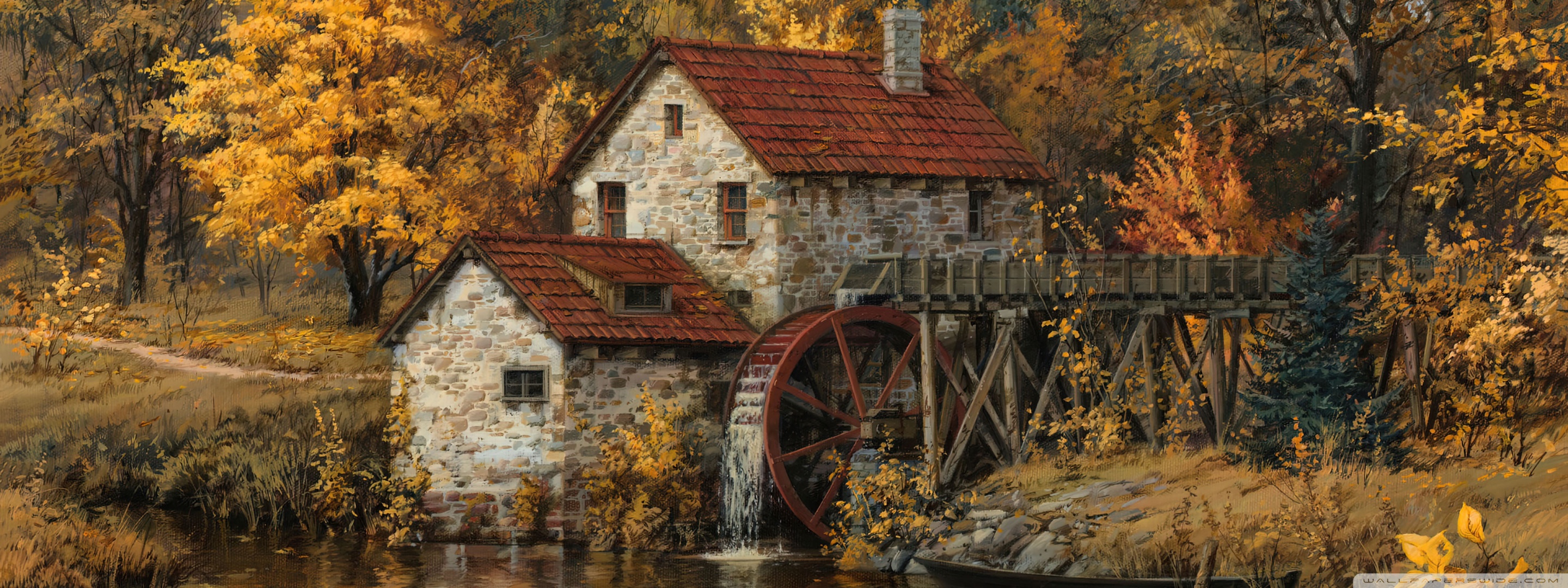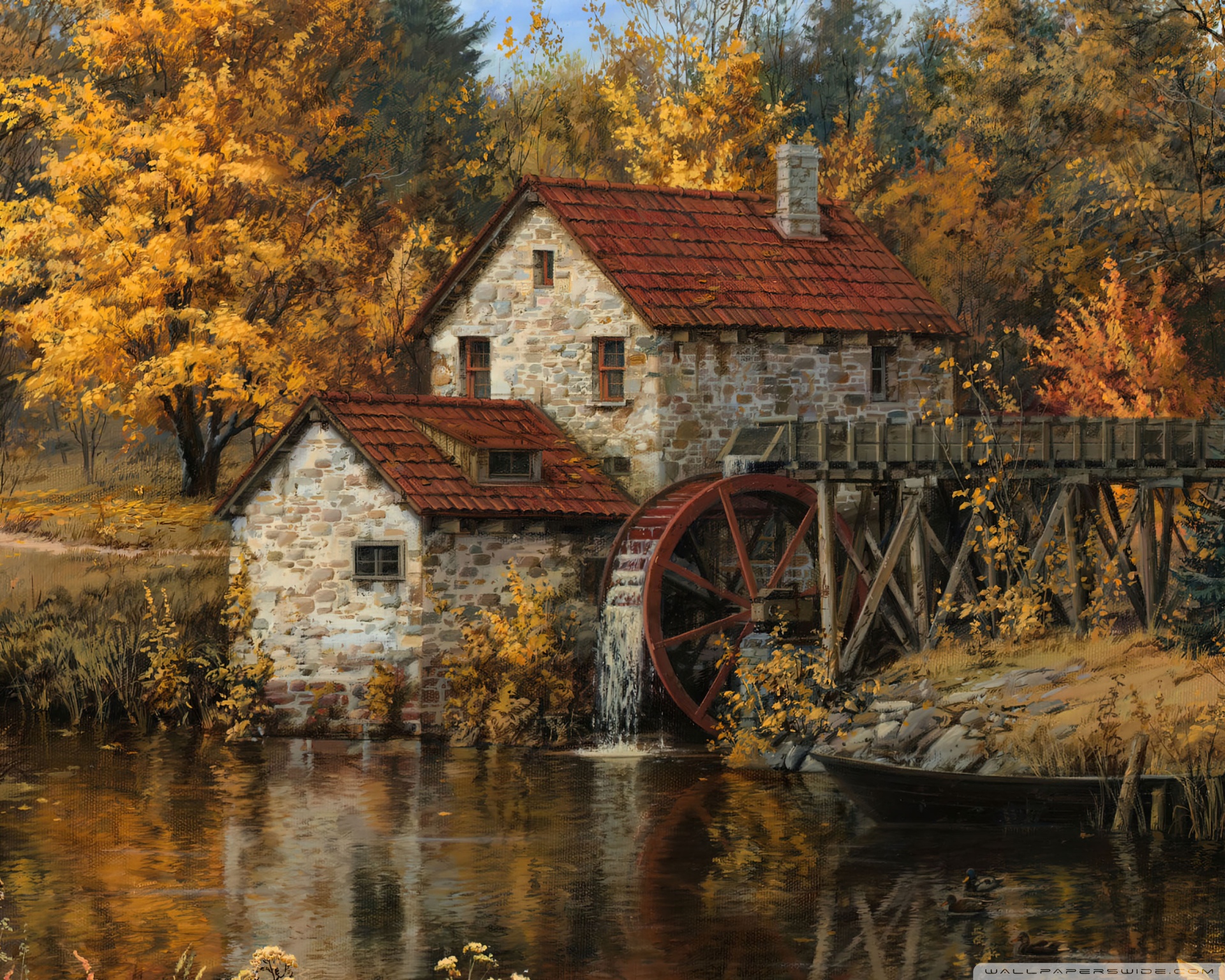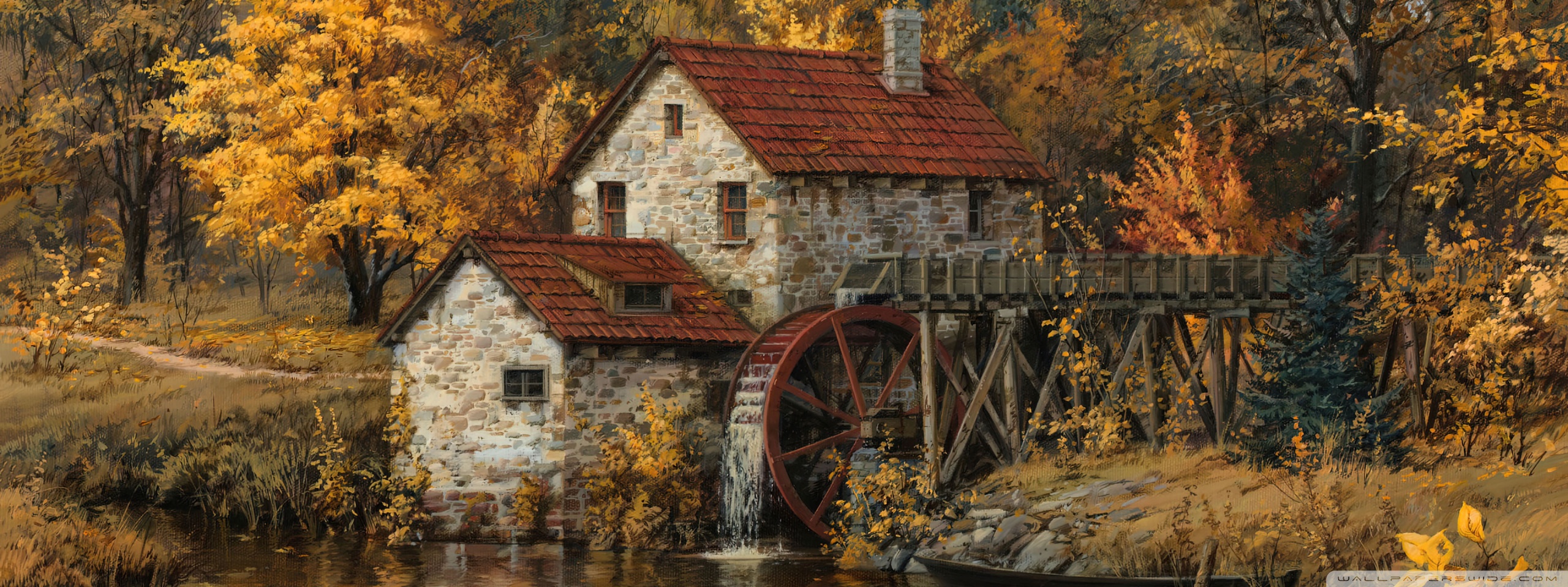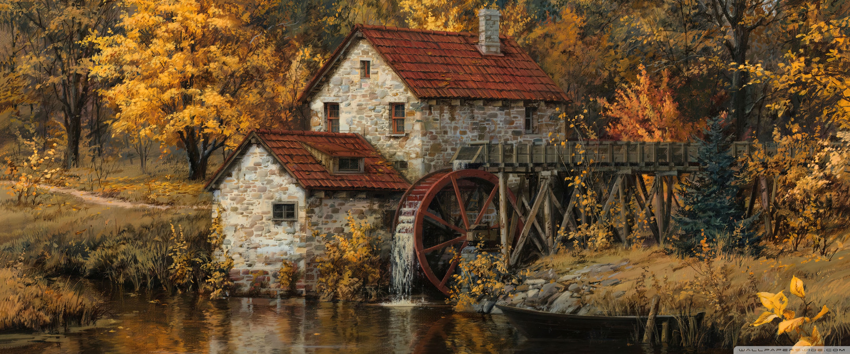 Download Countryside Watermill, Fall Scenery 4K UHD Wallpaper