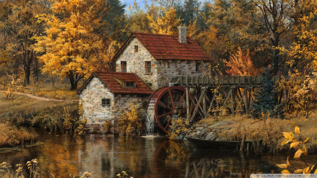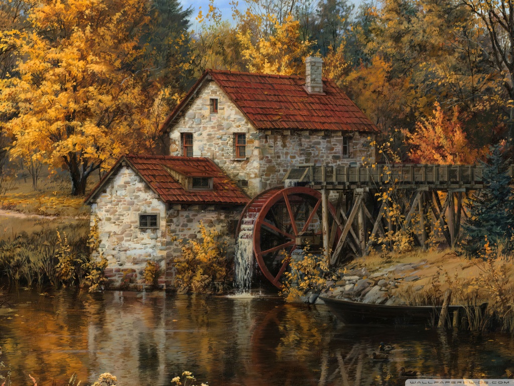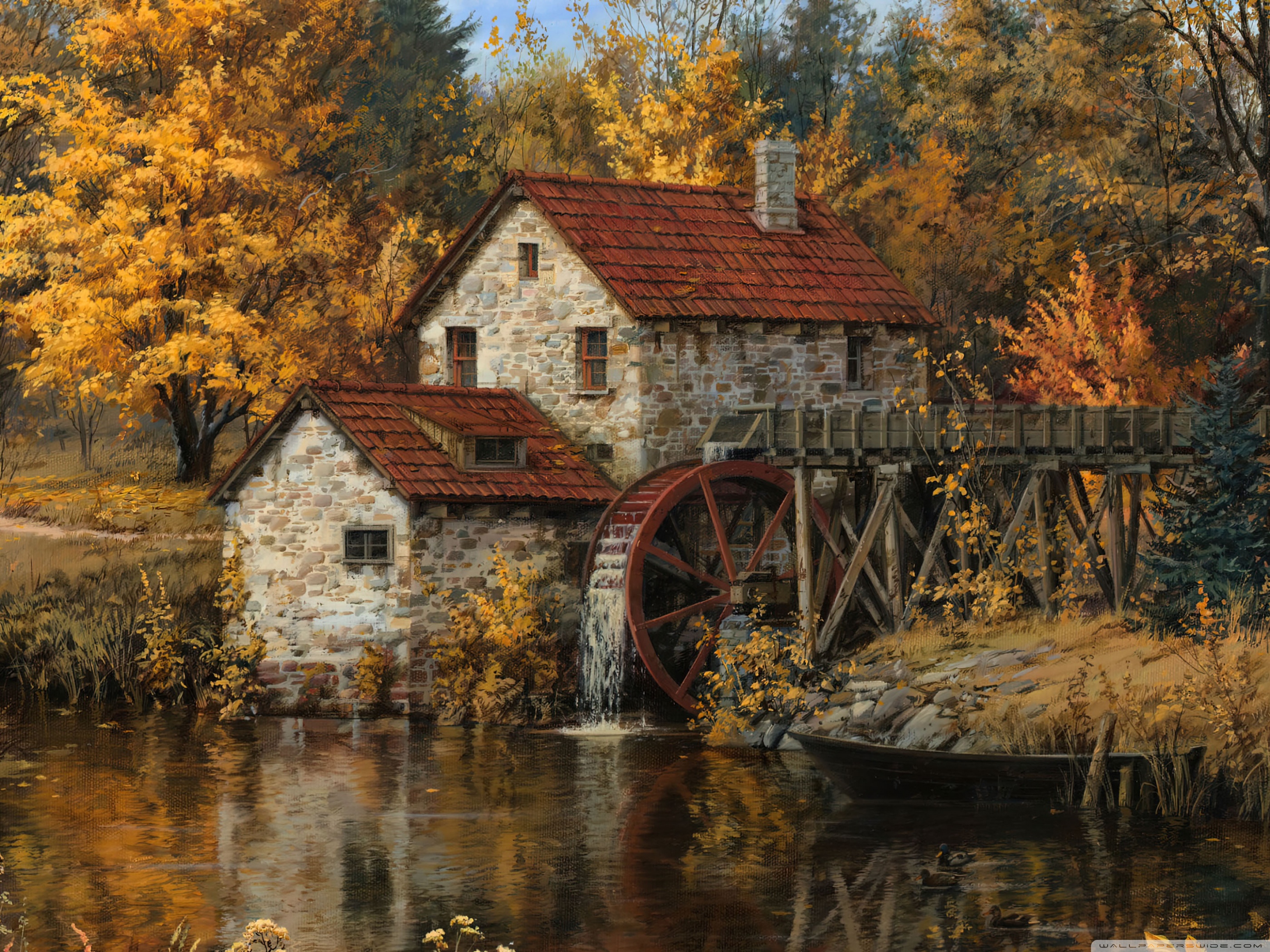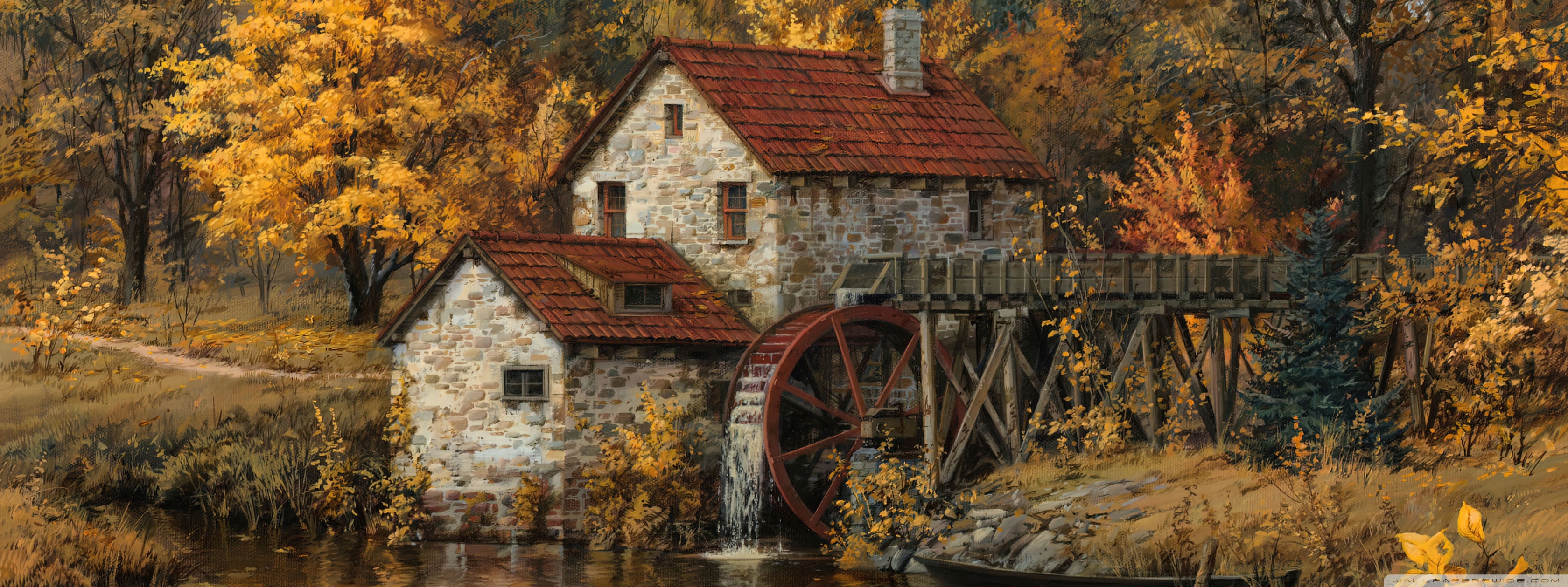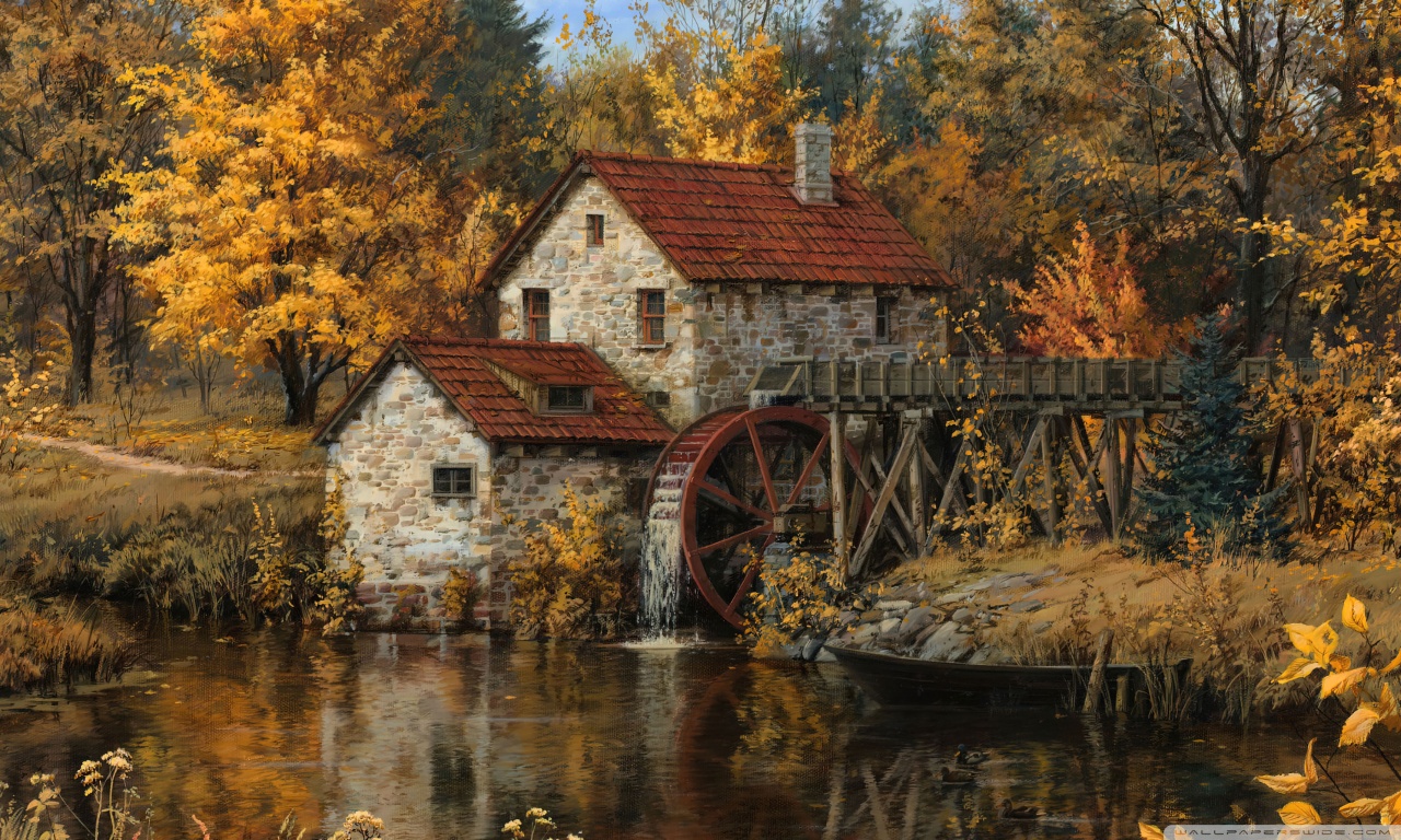 Download Countryside Watermill, Fall Scenery 4K UHD Wallpaper