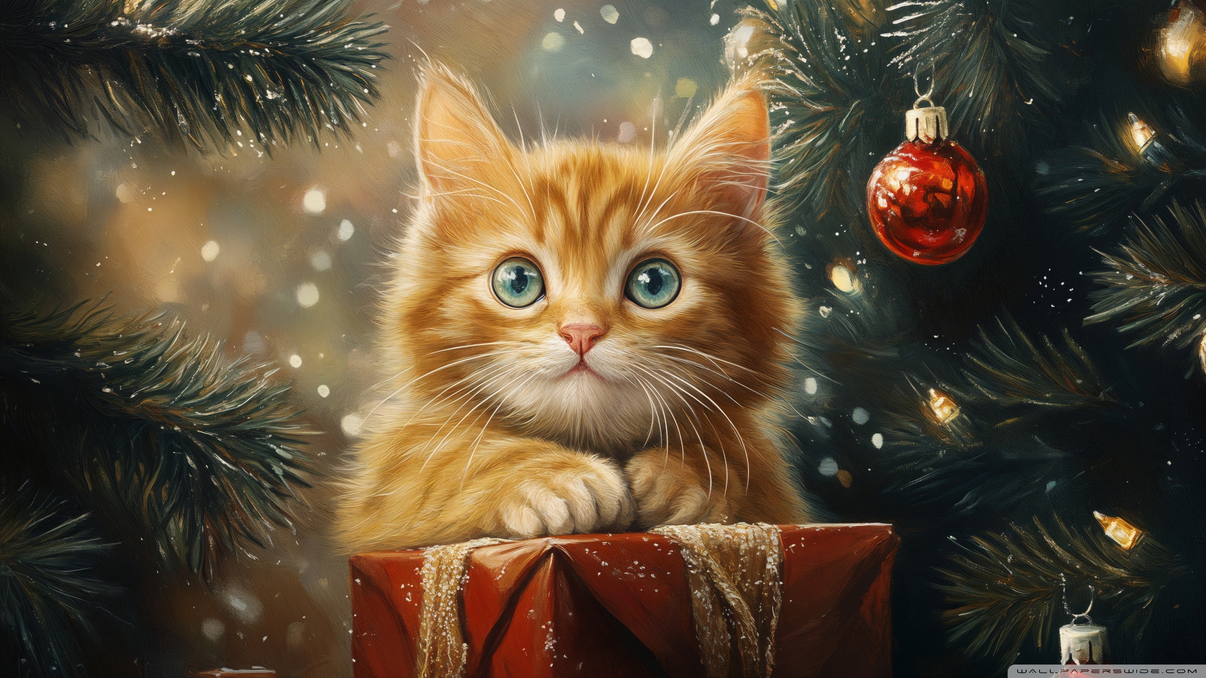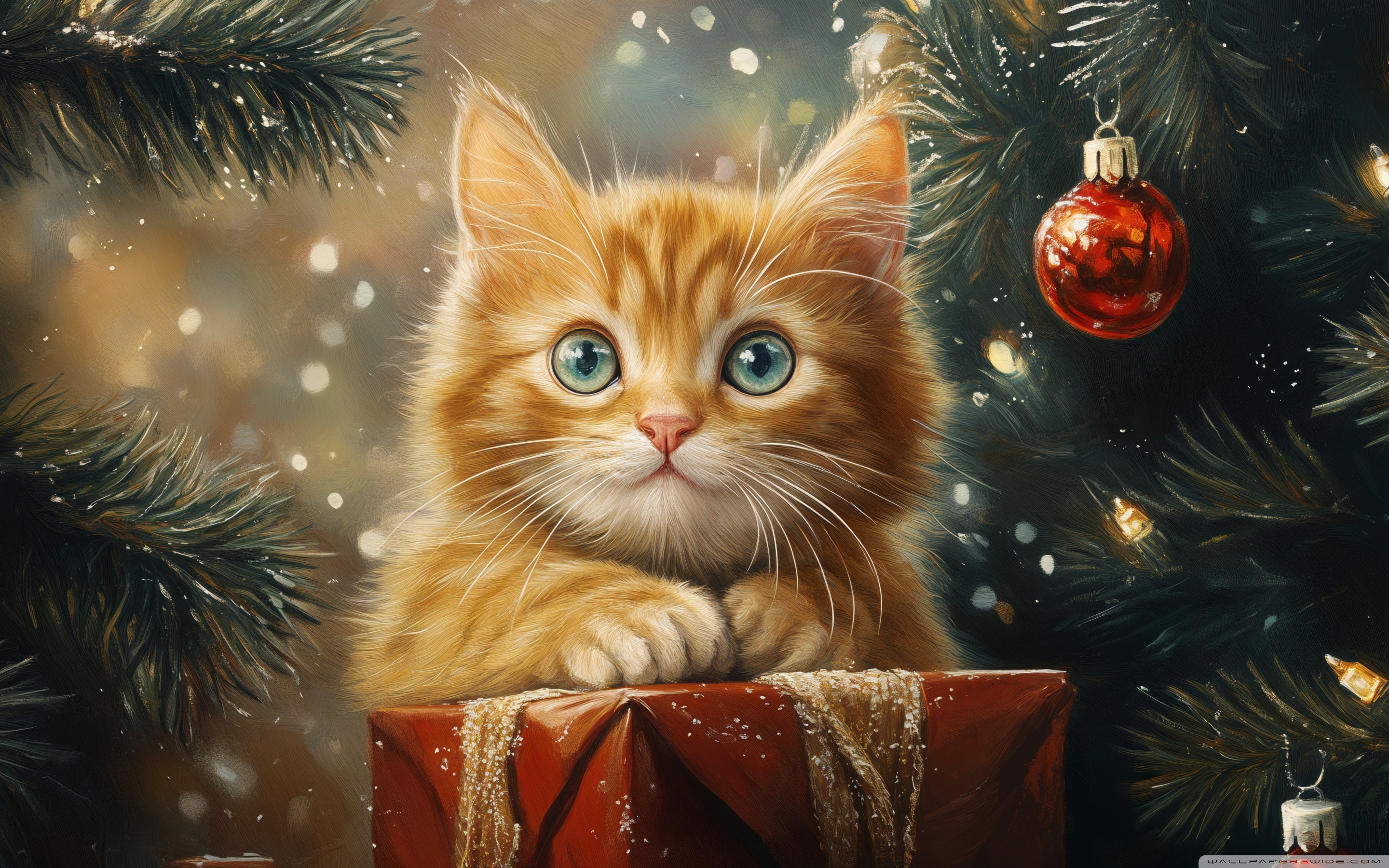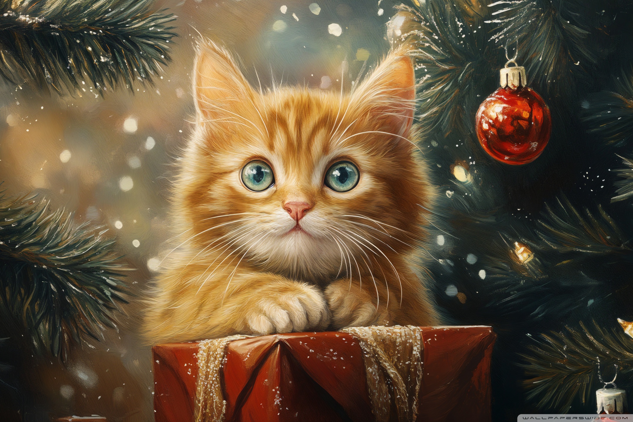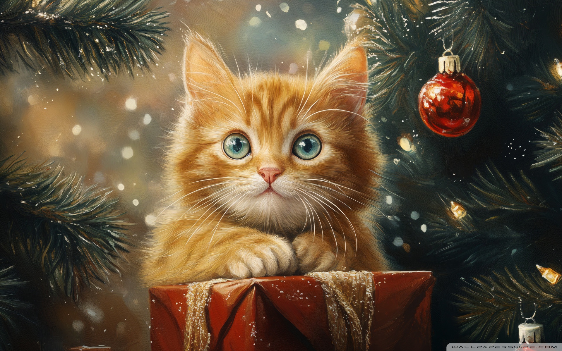 Download Cute Kitten Under Christmas Tree 4K UHD Wallpaper