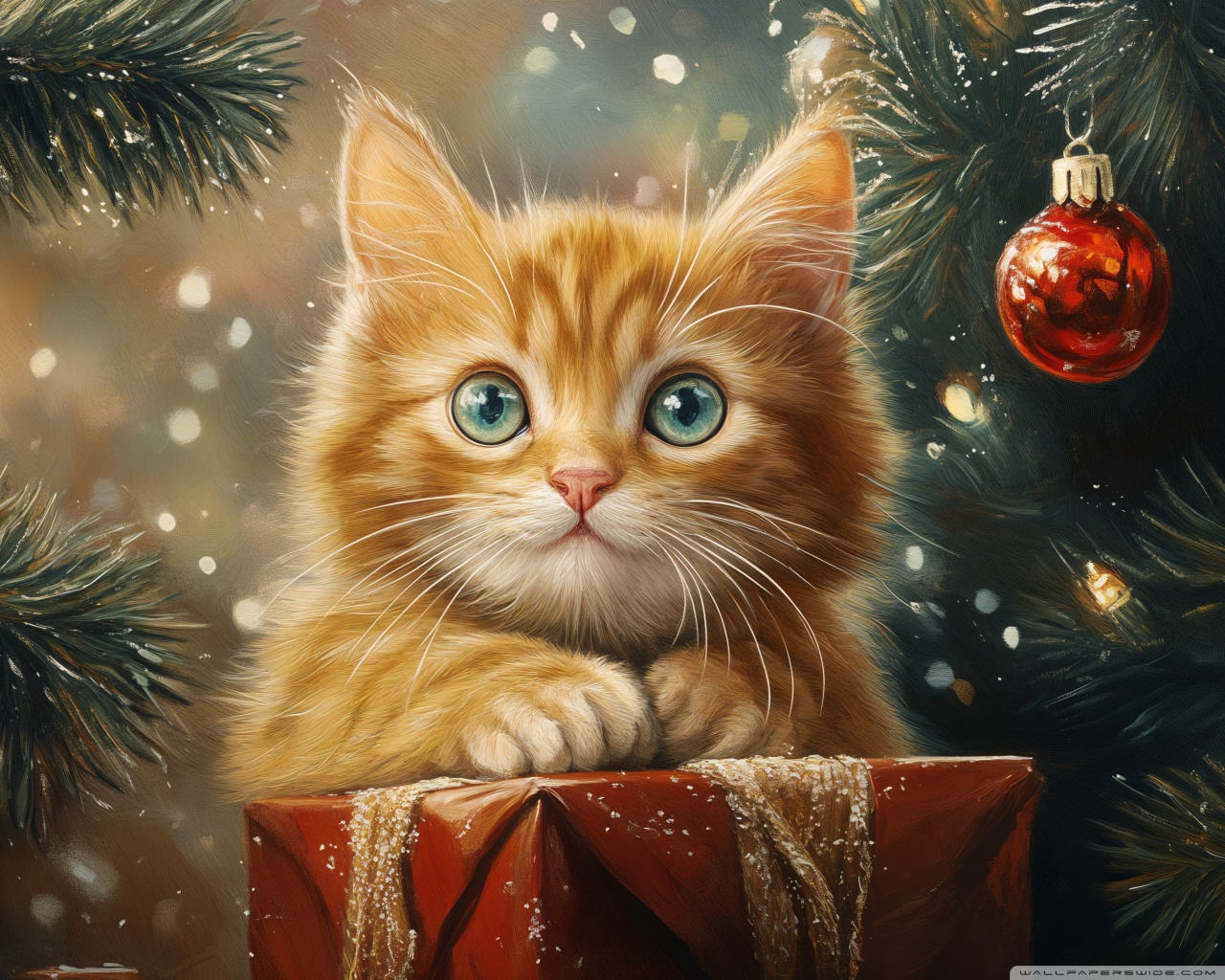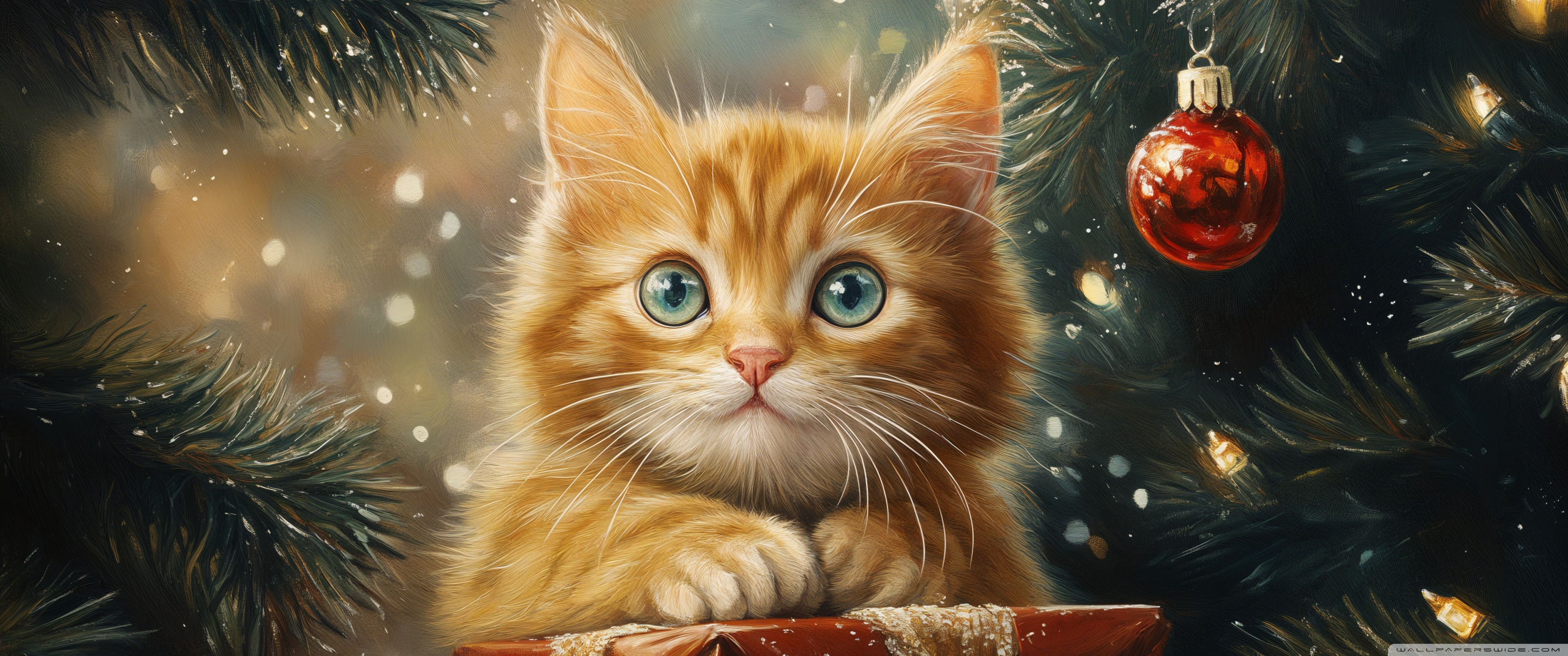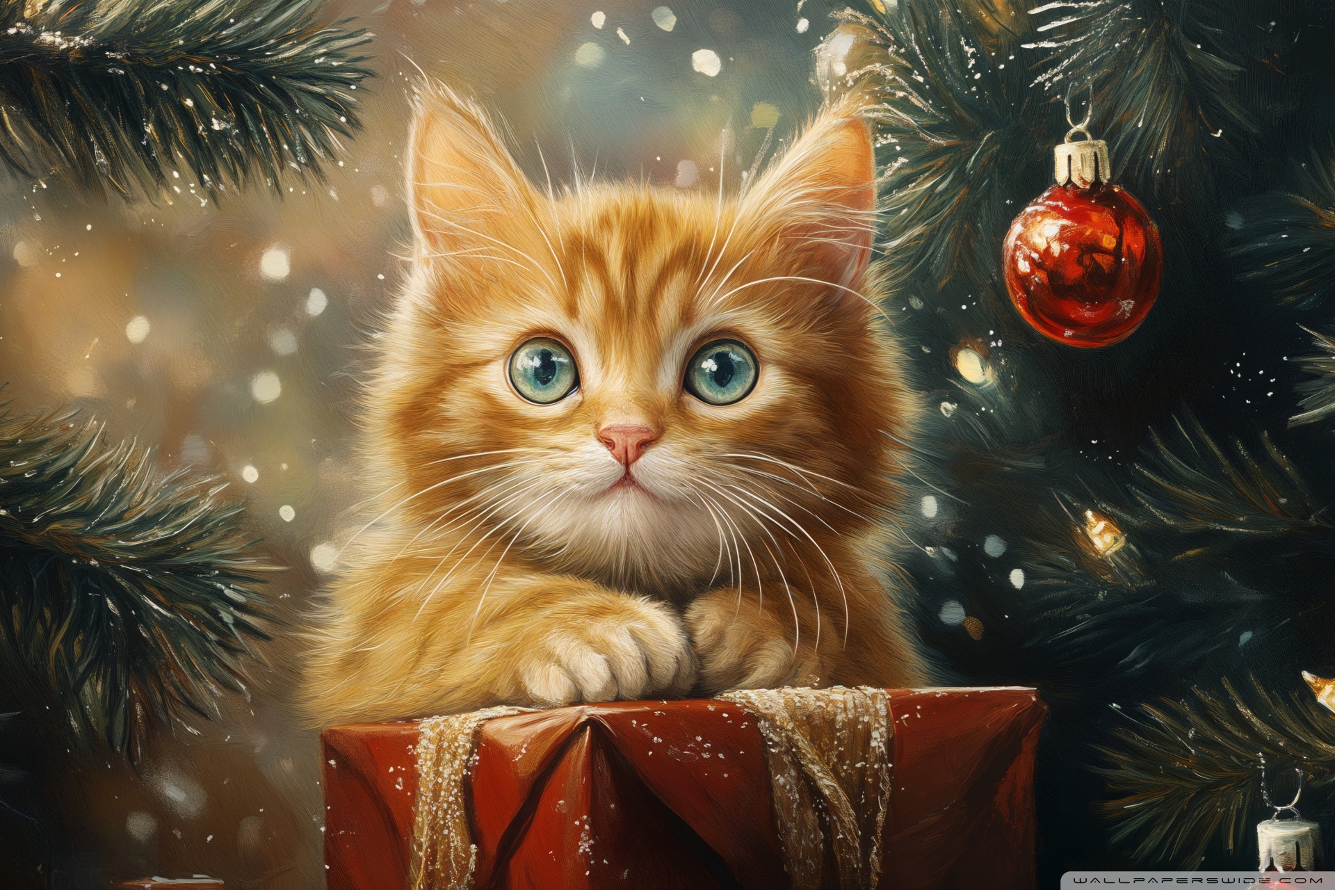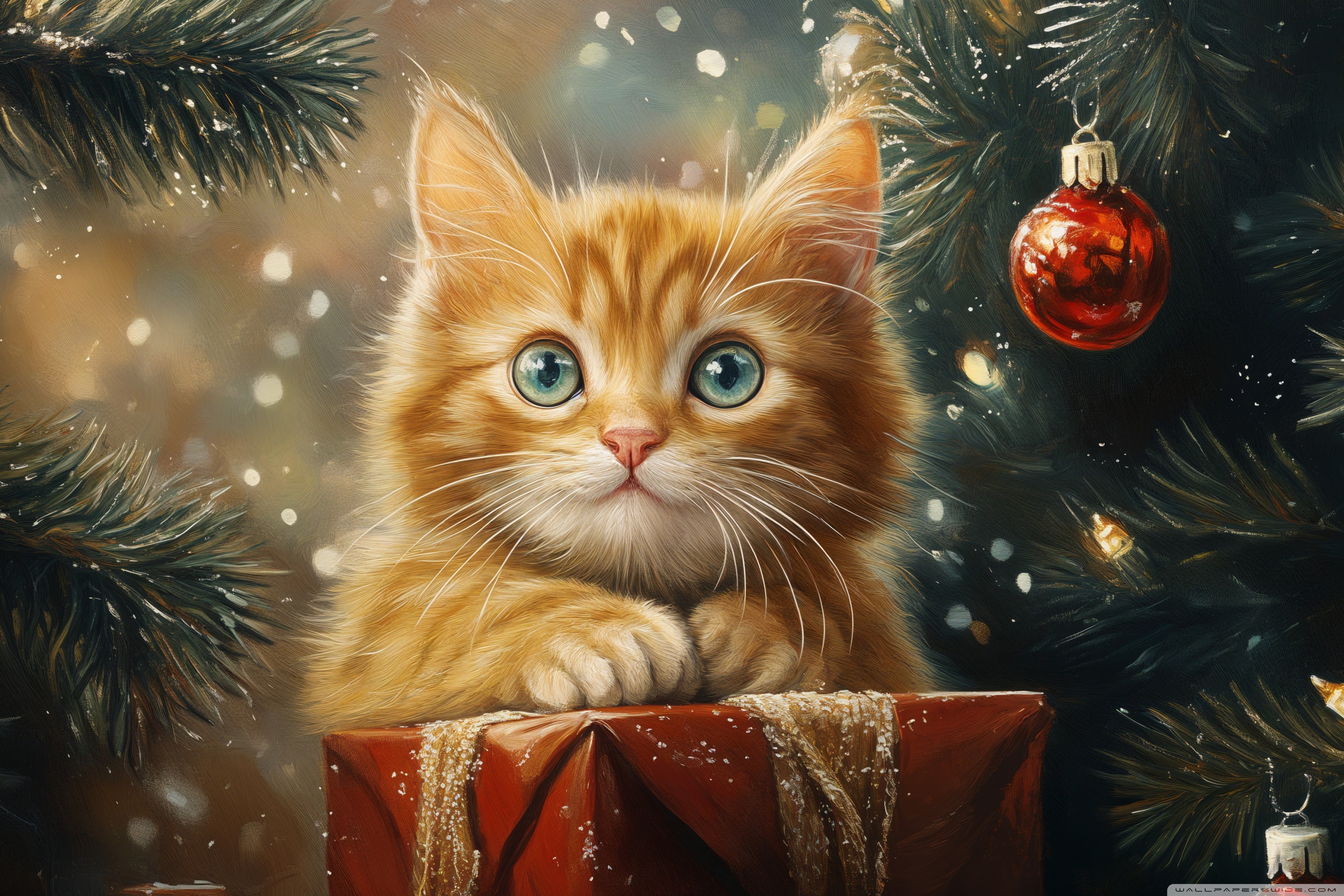 Download Cute Kitten Under Christmas Tree 4K UHD Wallpaper