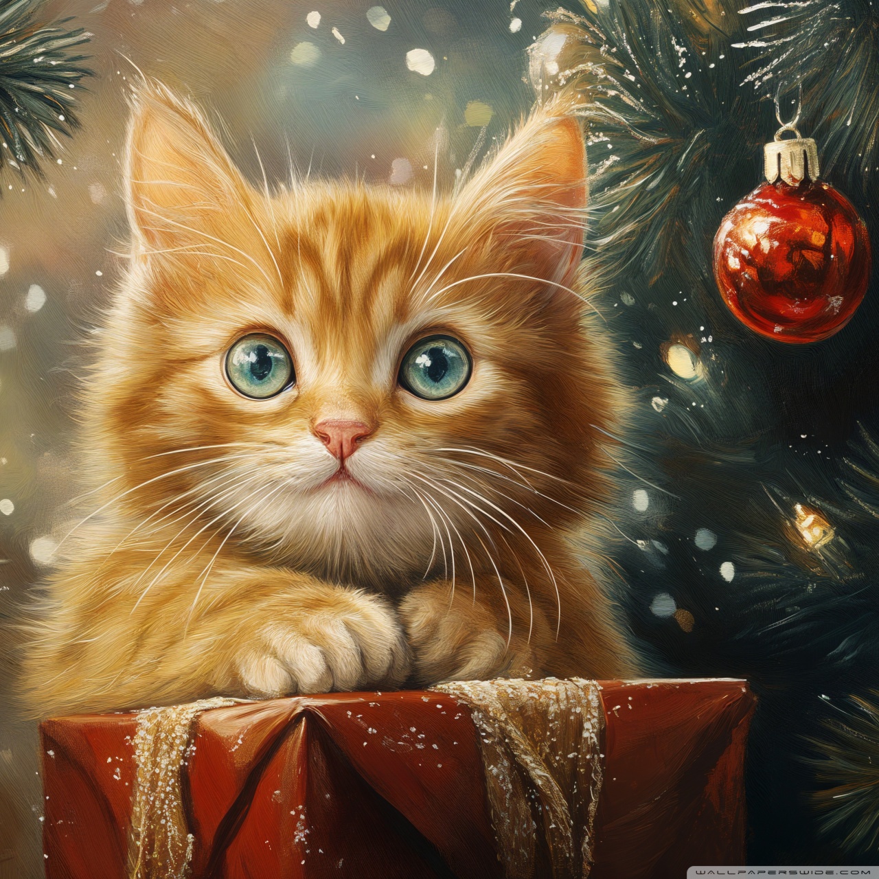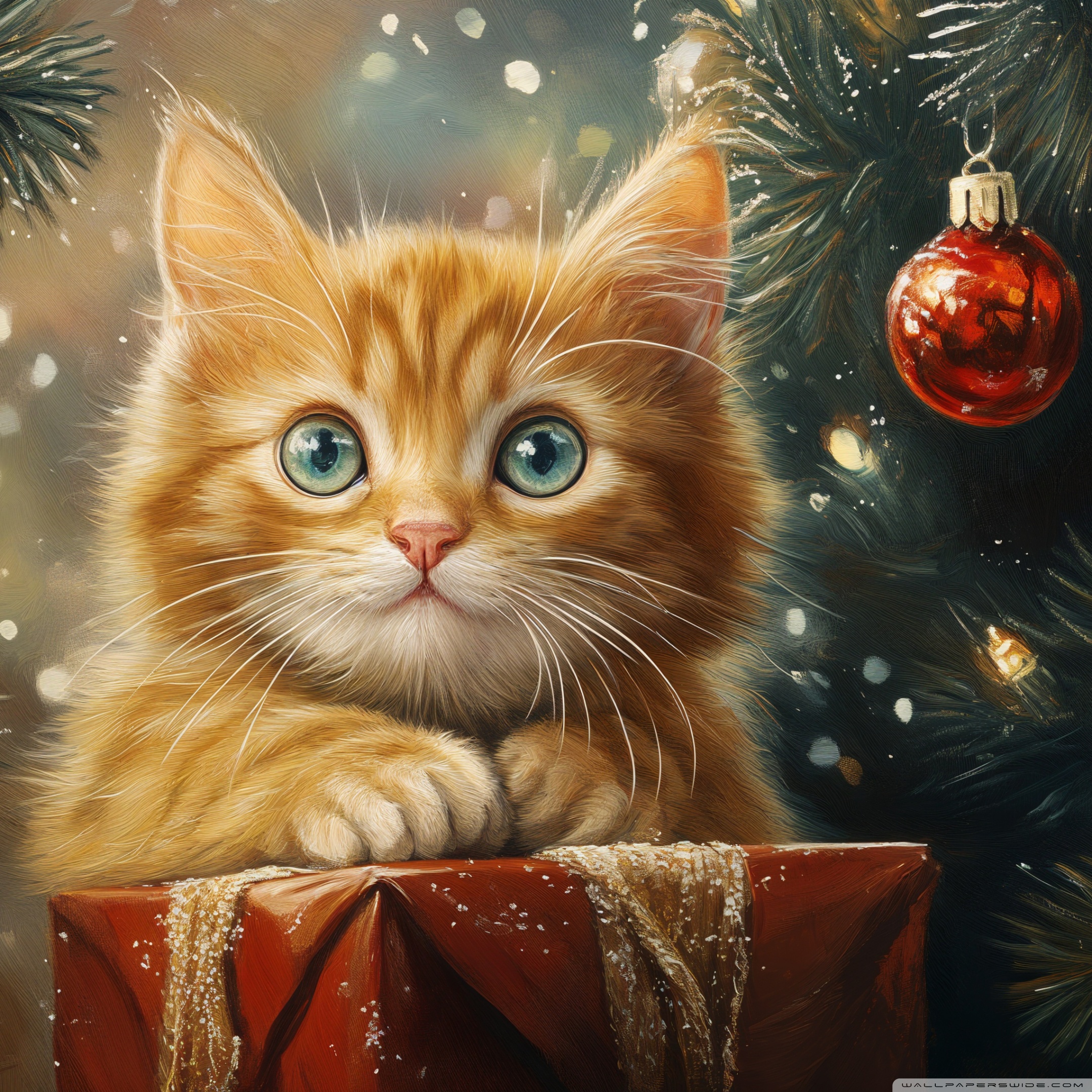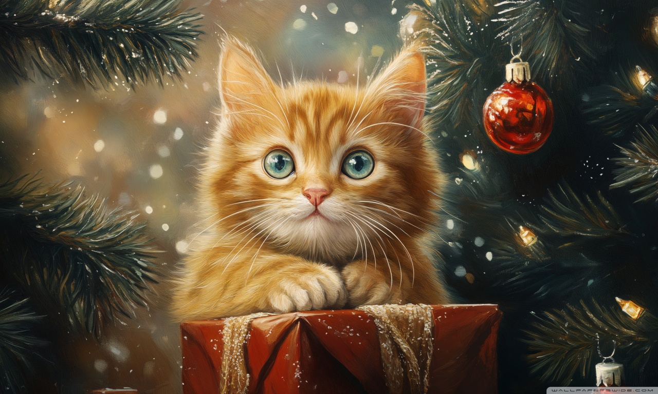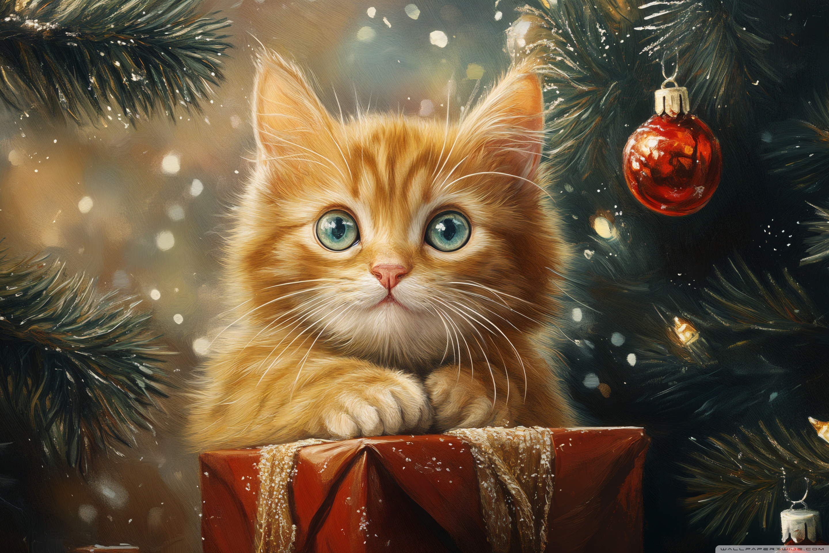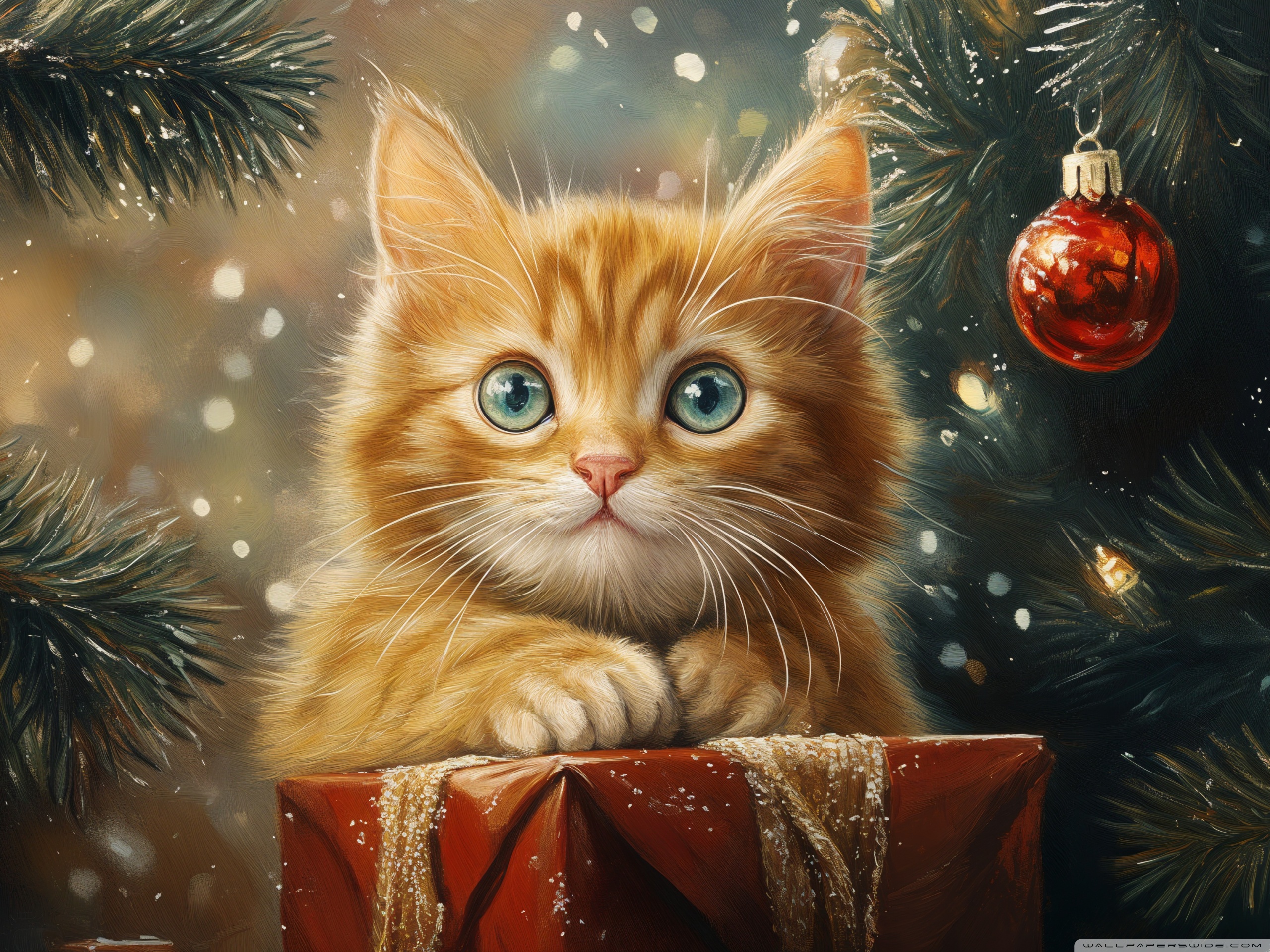 Download Cute Kitten Under Christmas Tree 4K UHD Wallpaper