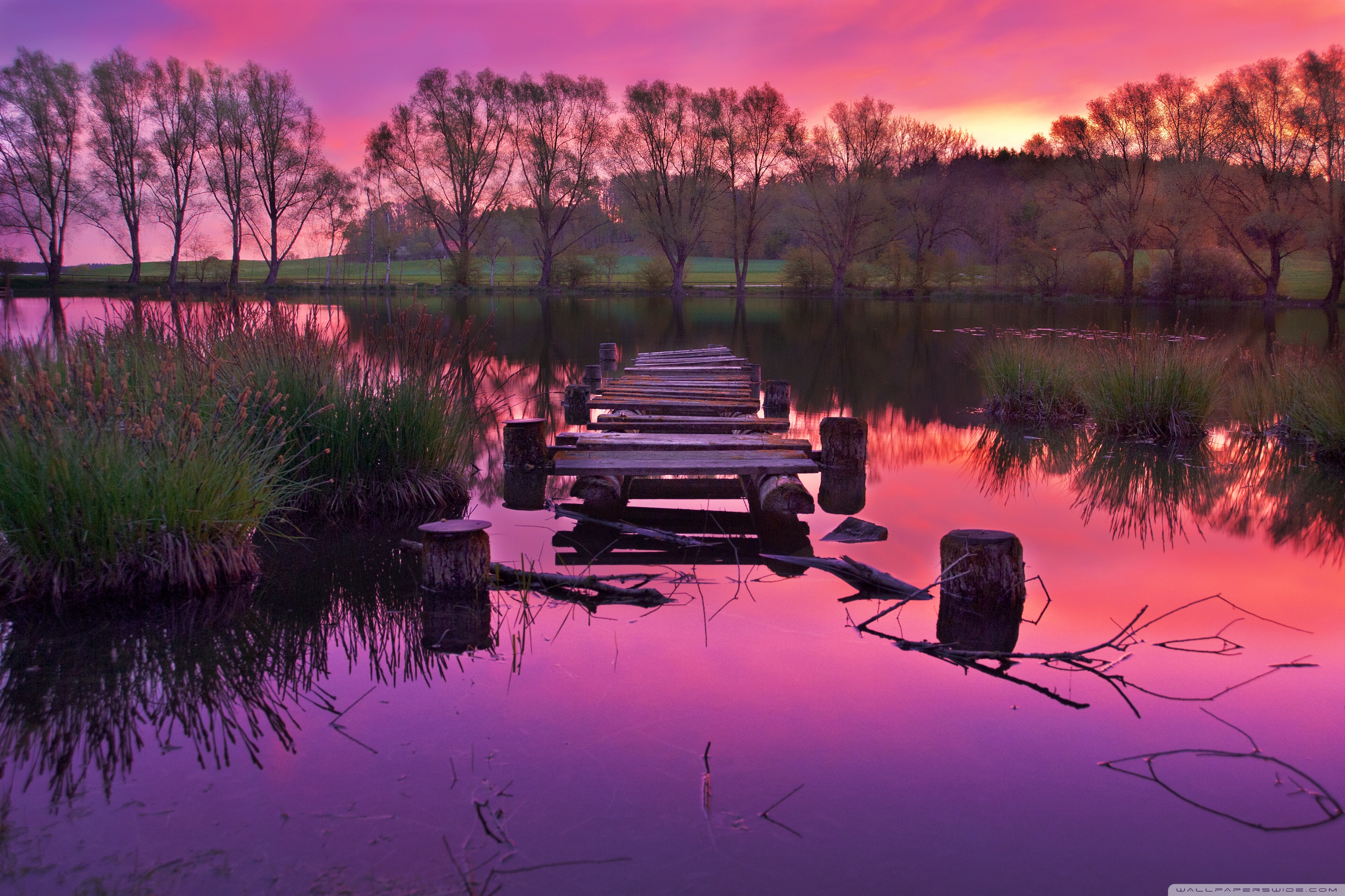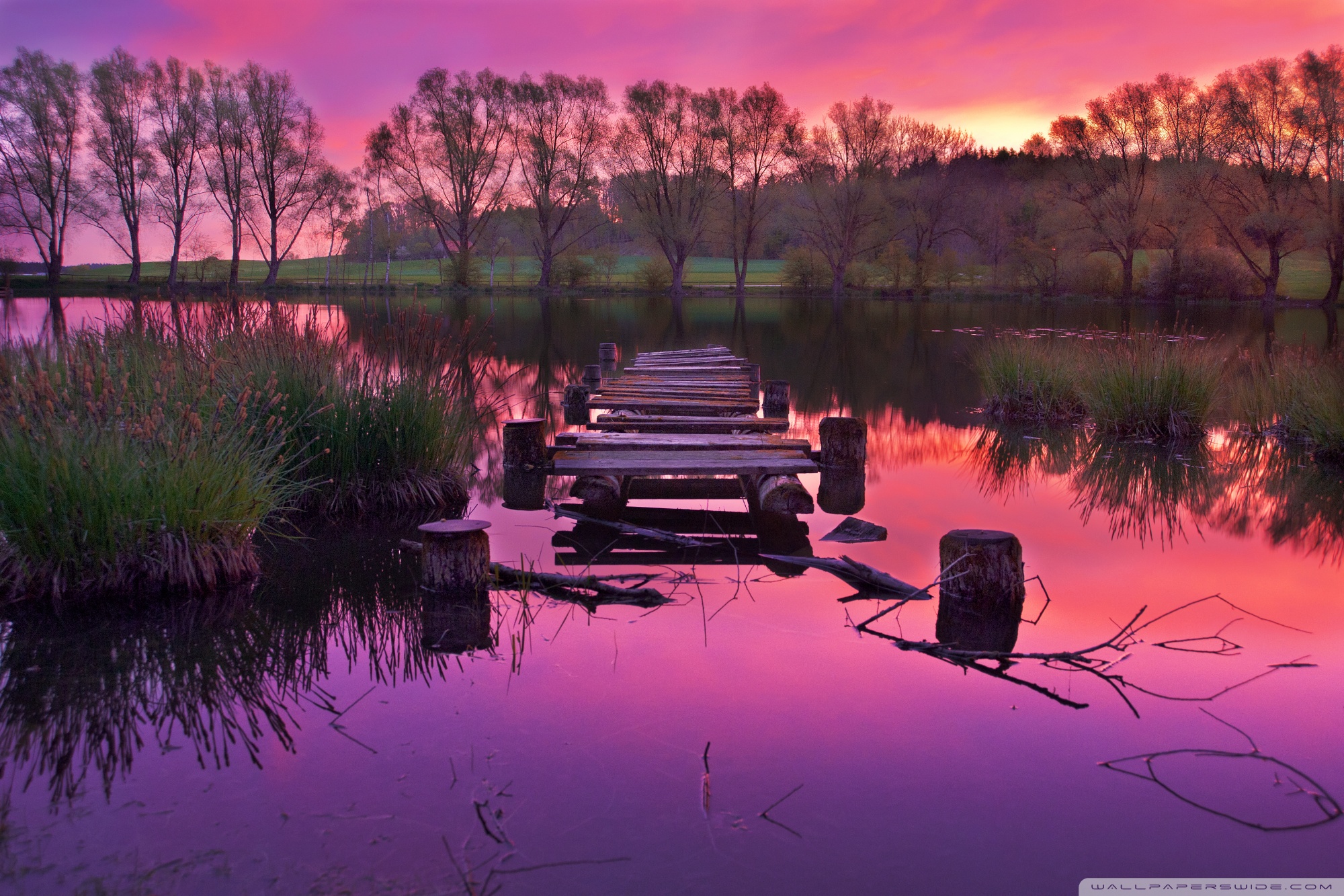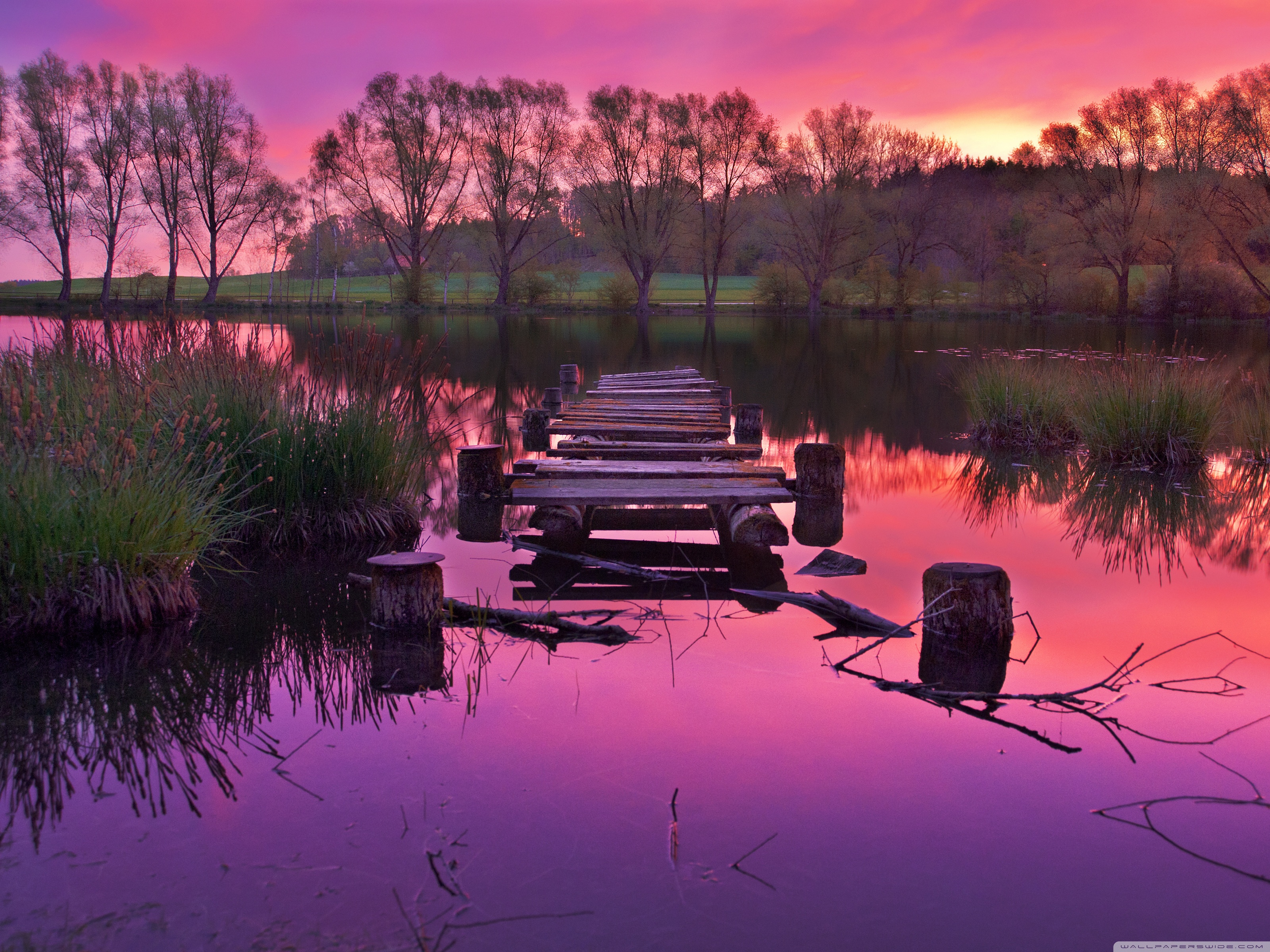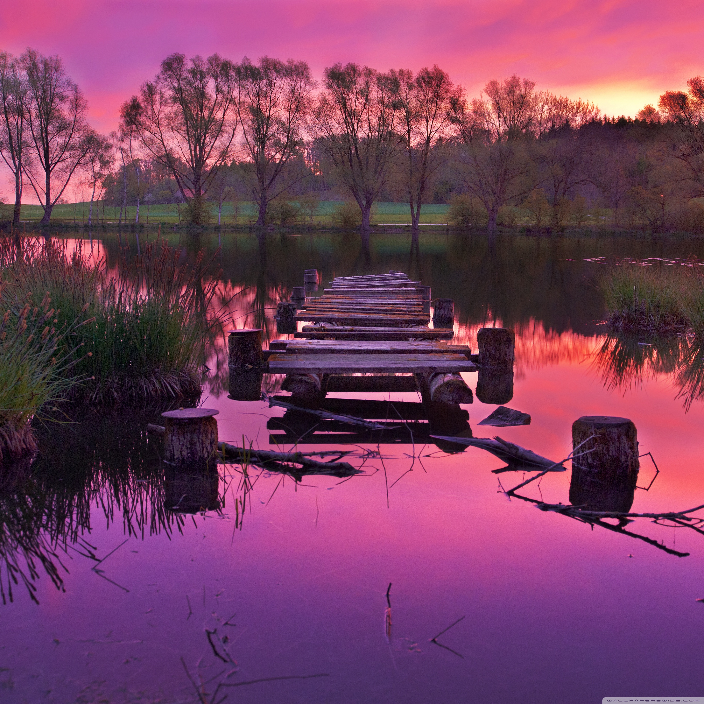 Download Dock, Lake, Purple Sunset Scenery 4K UHD Wallpaper