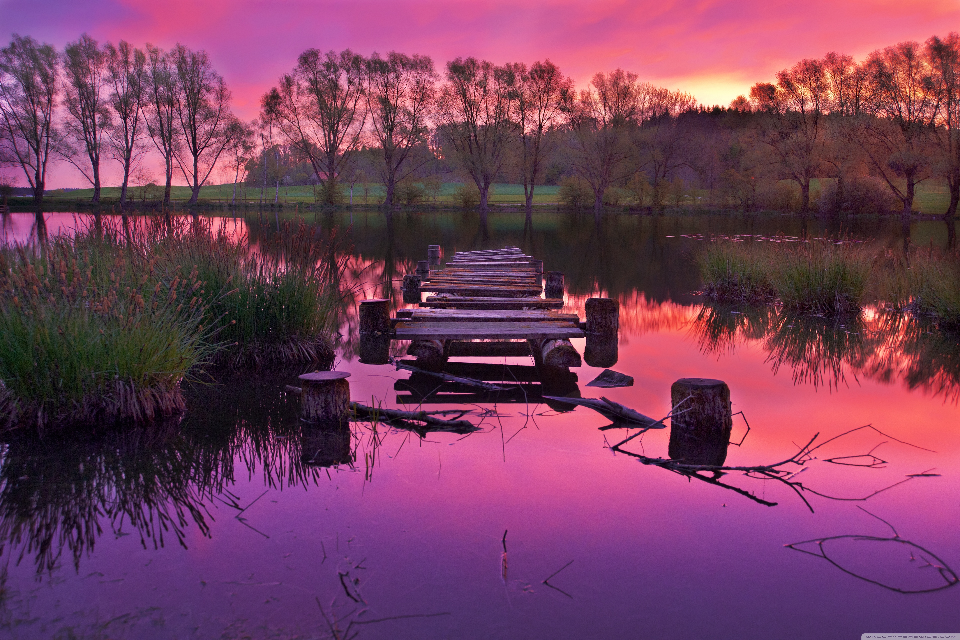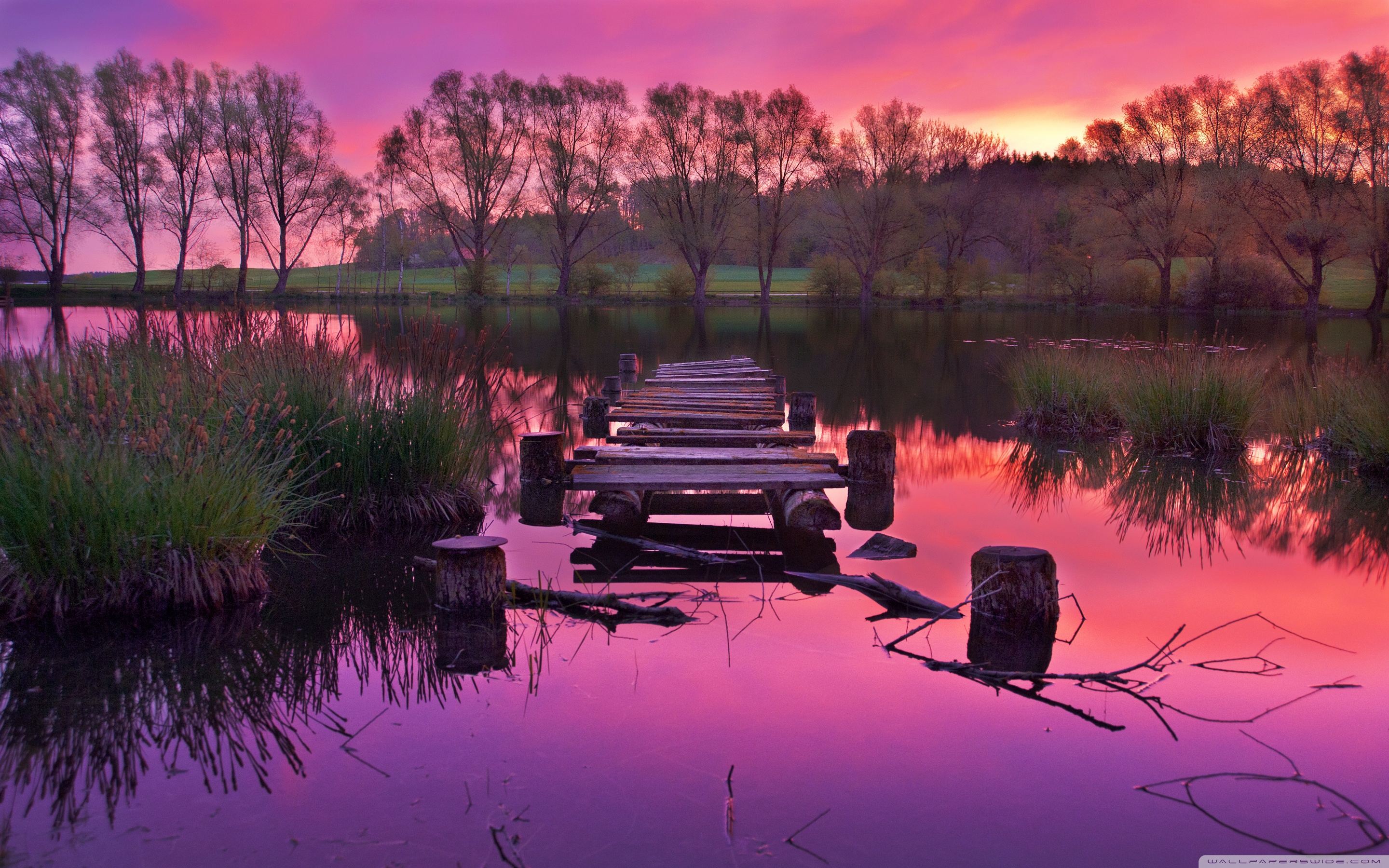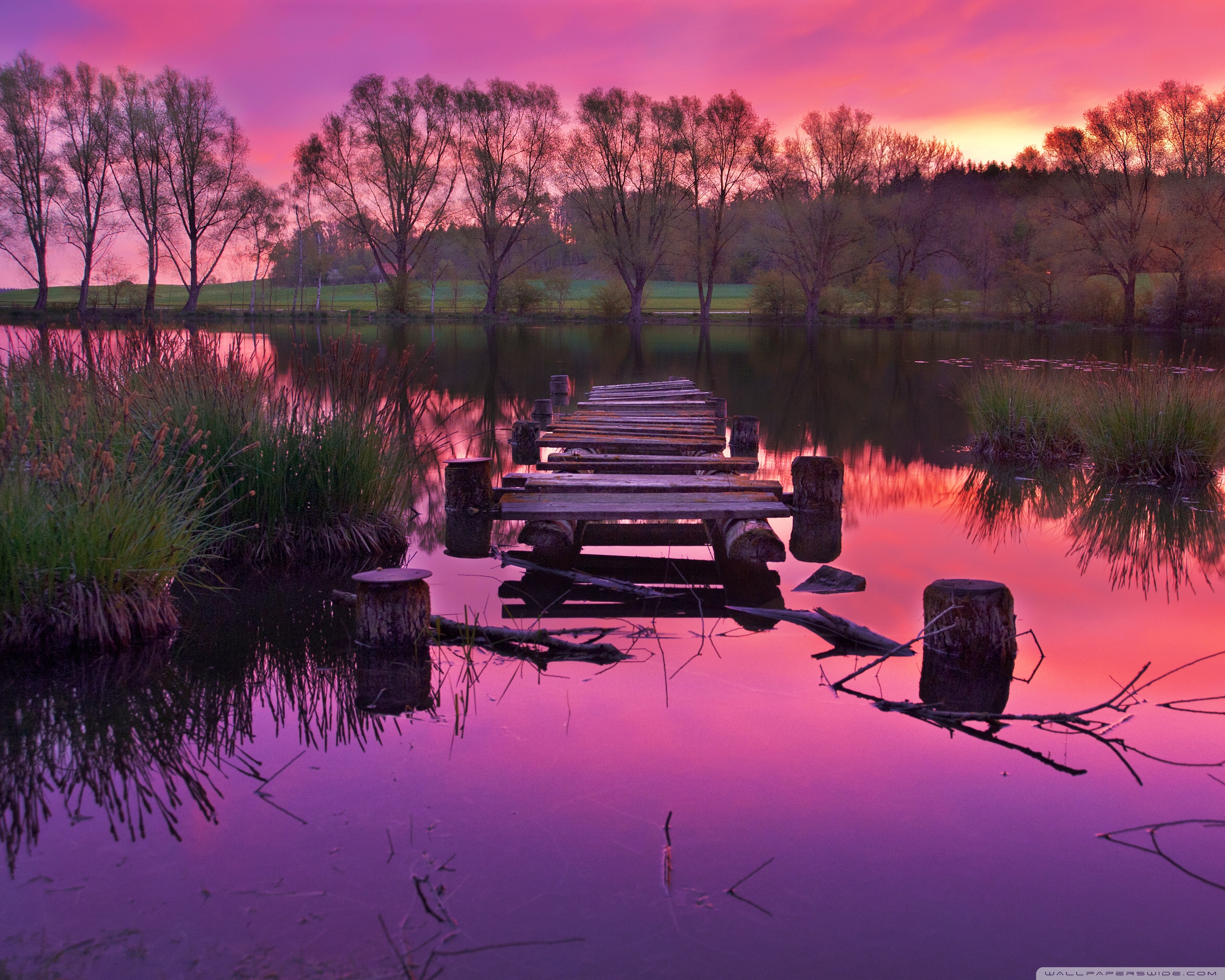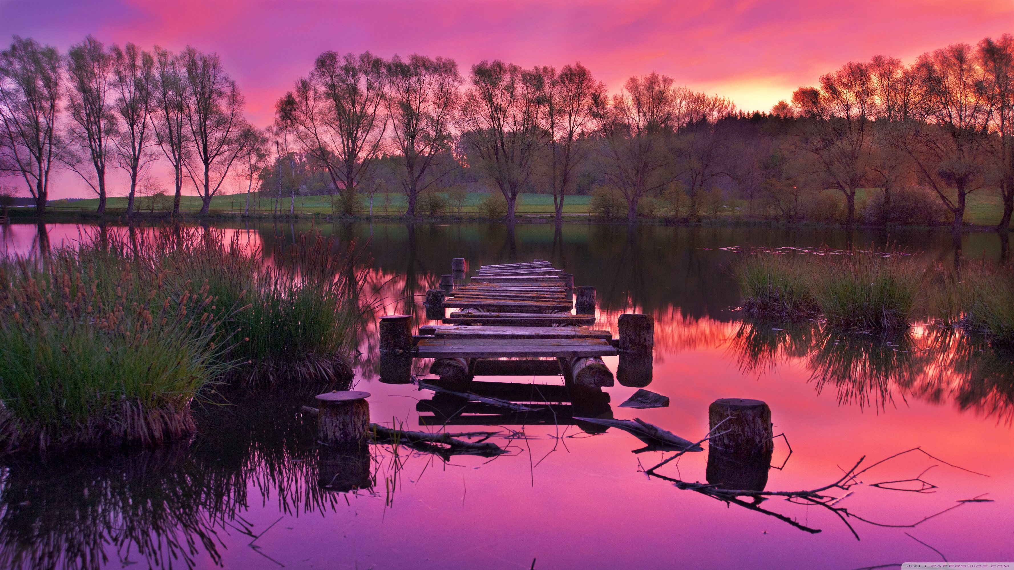 Download Dock, Lake, Purple Sunset Scenery 4K UHD Wallpaper