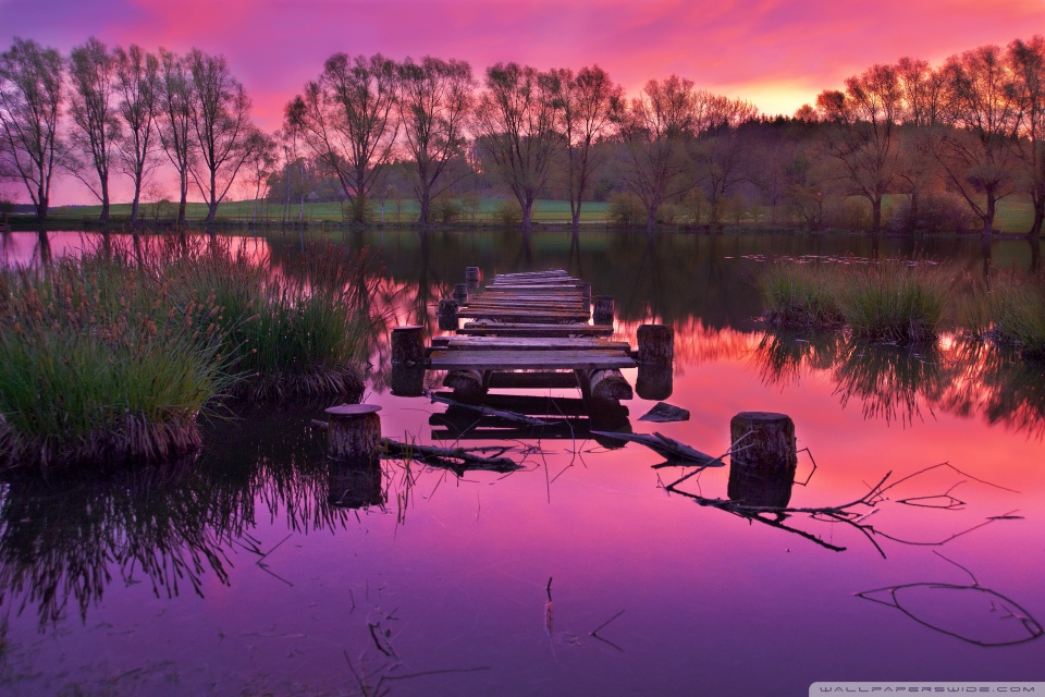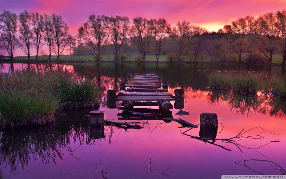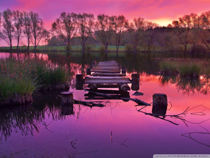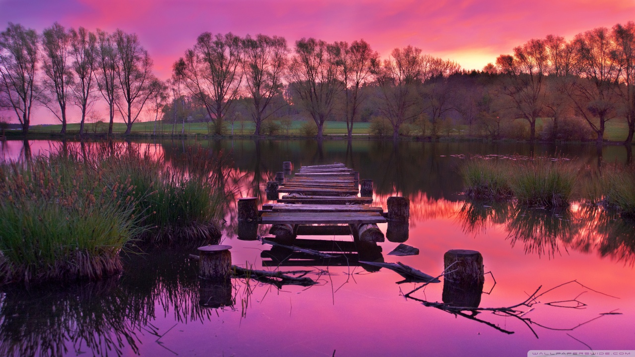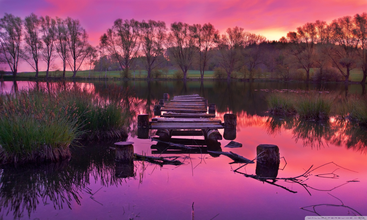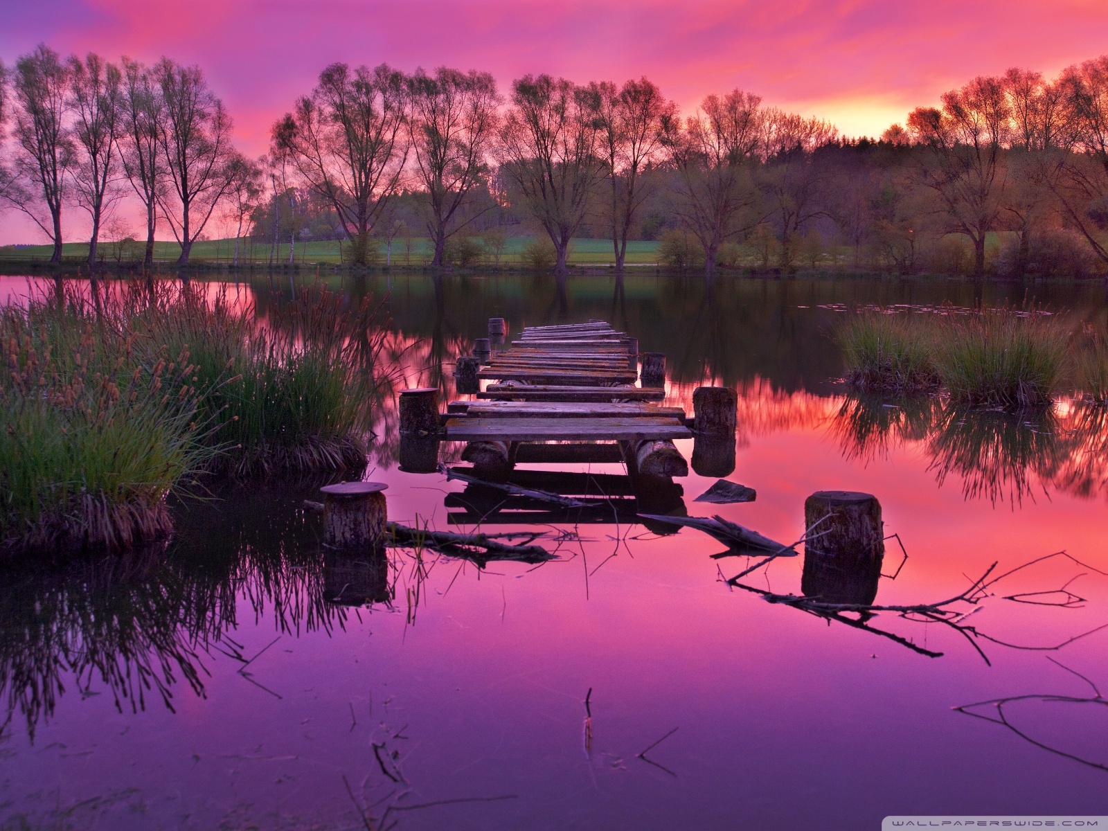 Download Dock, Lake, Purple Sunset Scenery 4K UHD Wallpaper