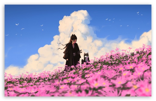 Download Drawing, Samurai Girl, Dog, Pink Flowers,... 4K UHD Wallpaper