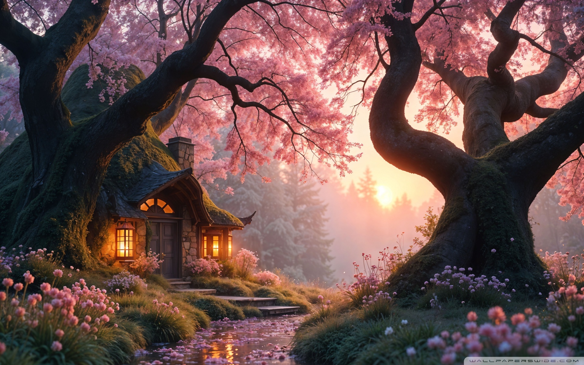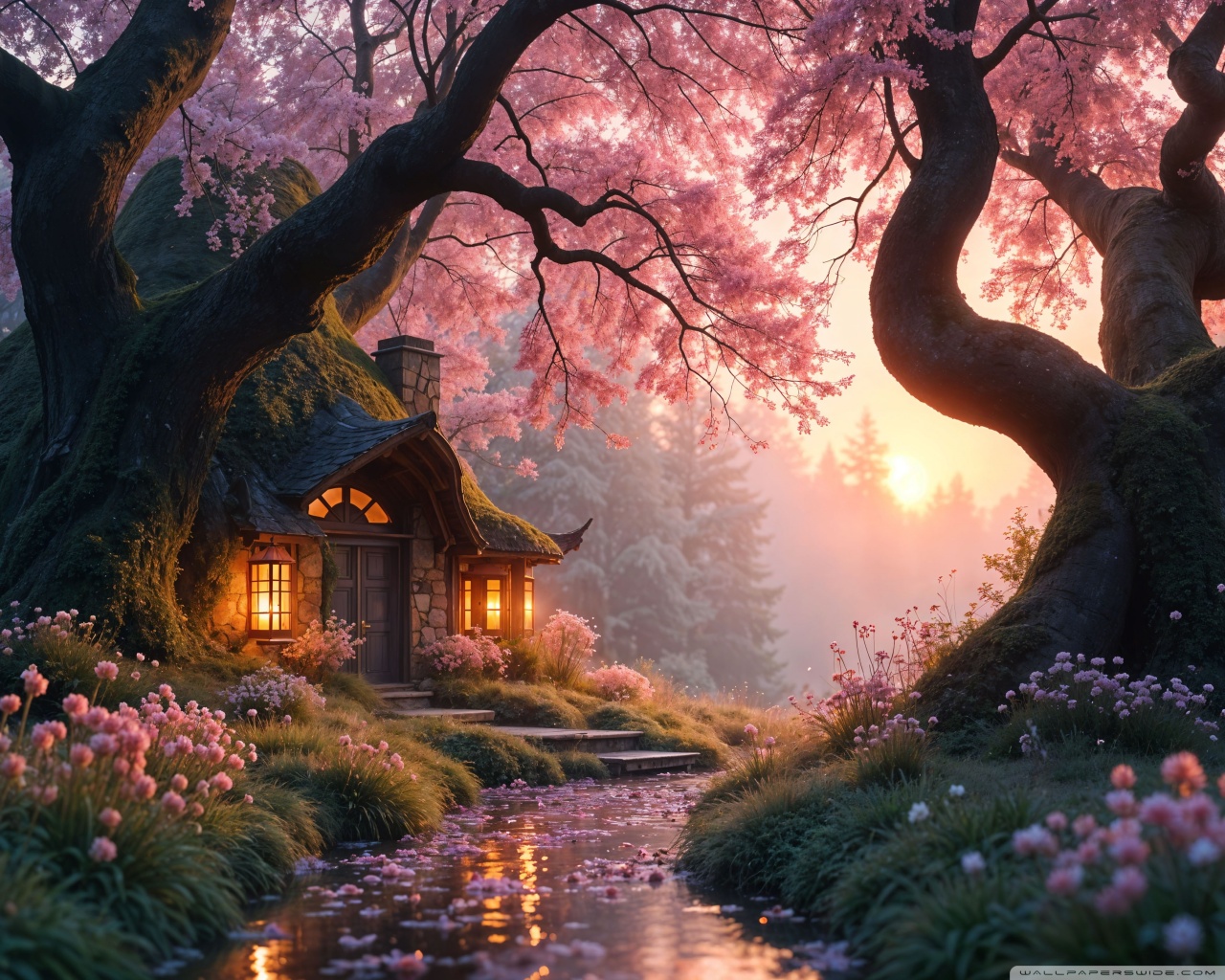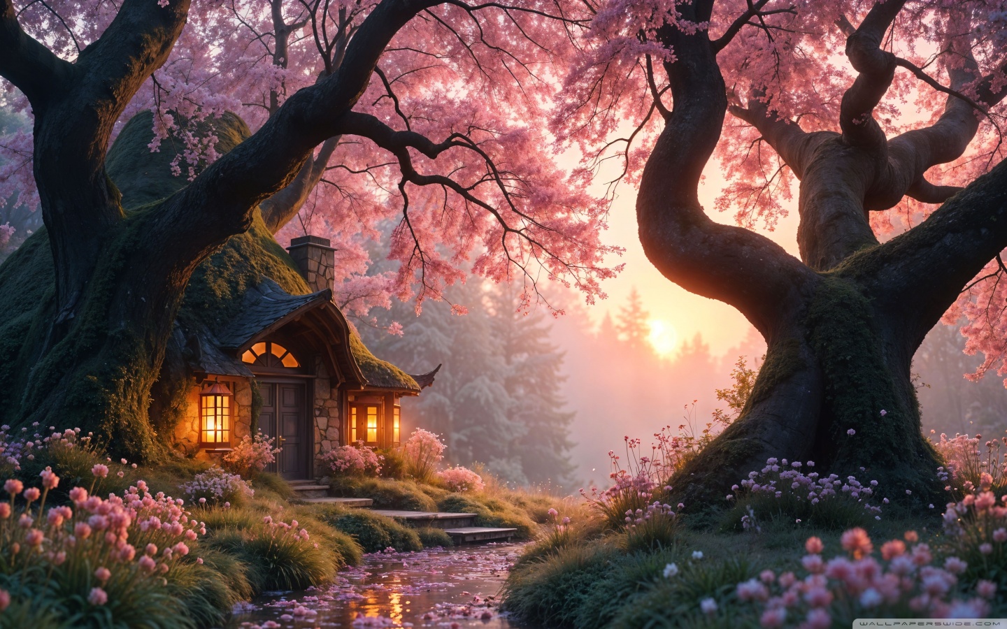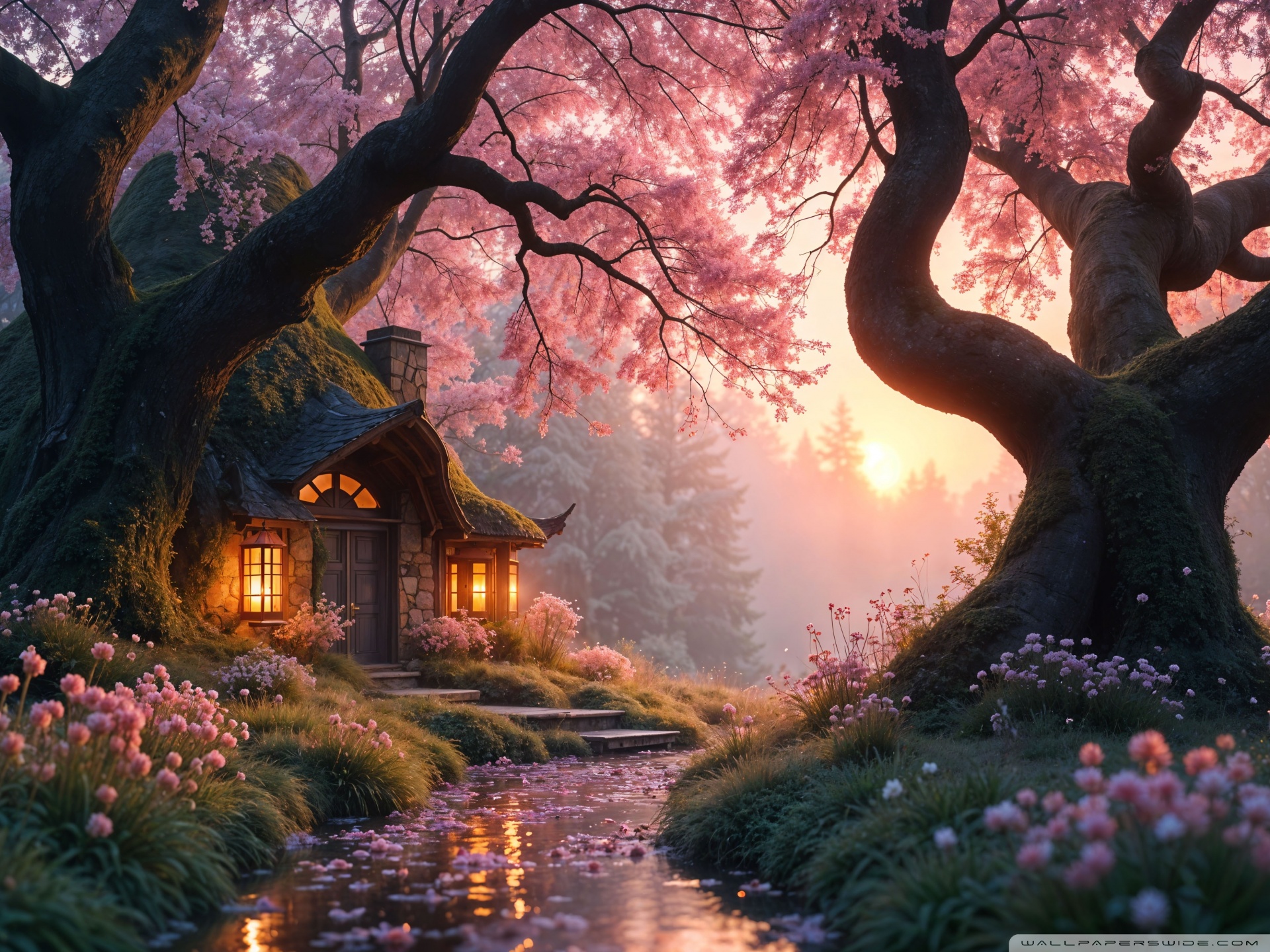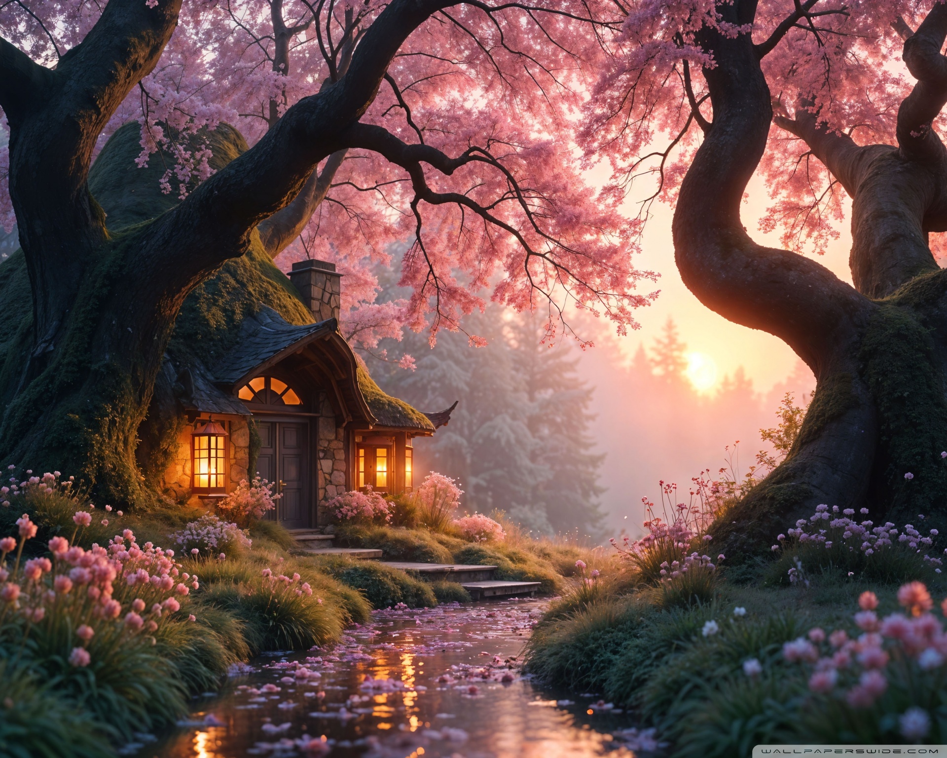 Download Forest Hut, Spring Scene, Artistic 4K UHD Wallpaper