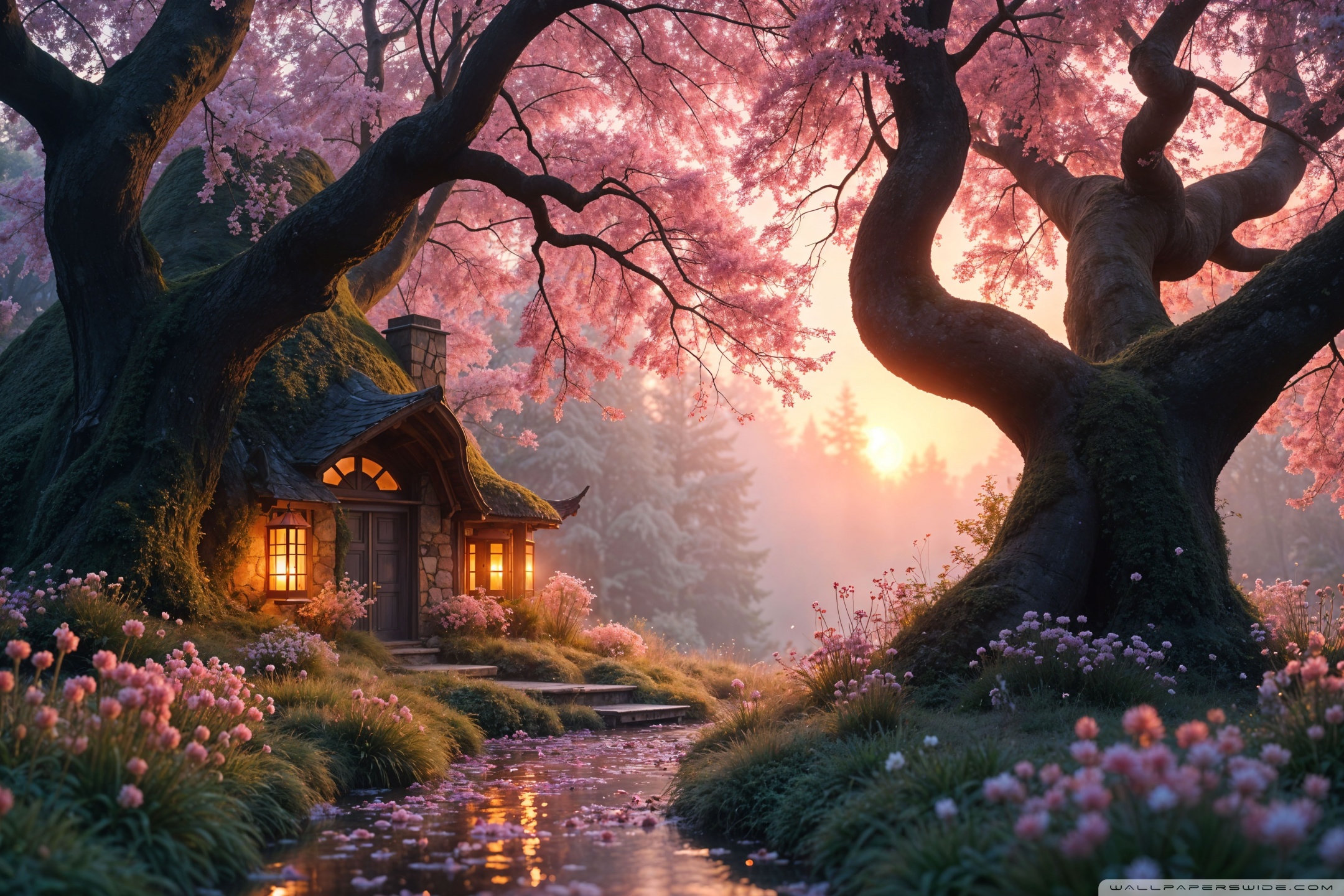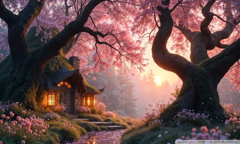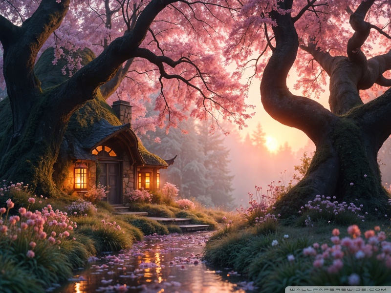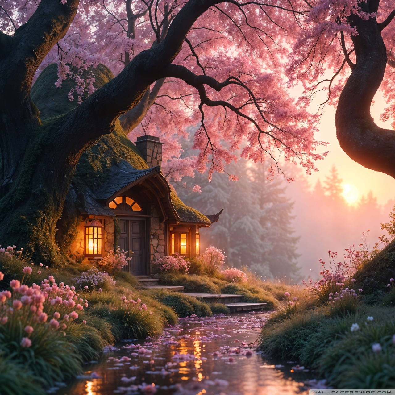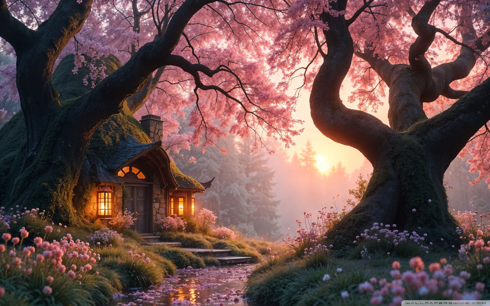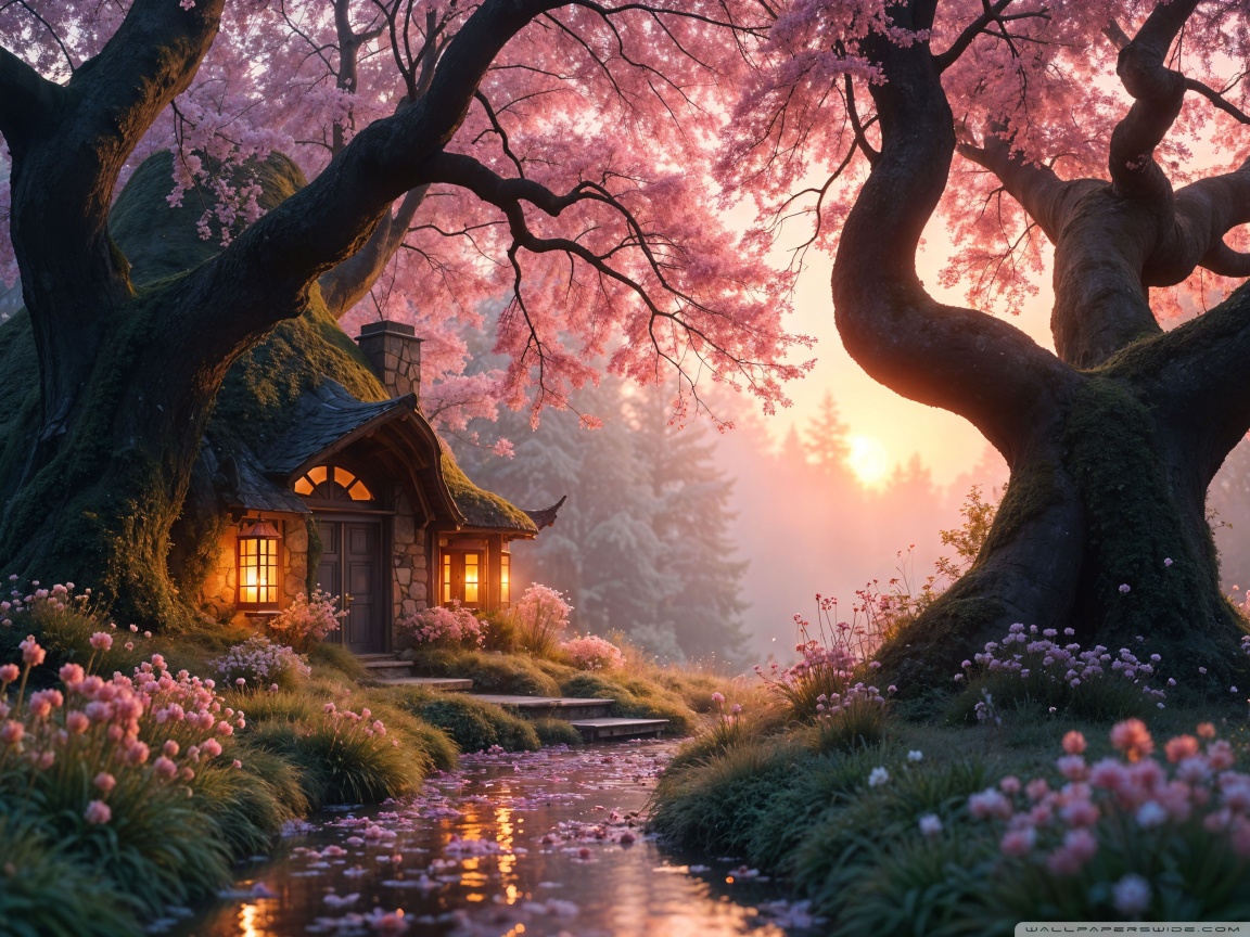 Download Forest Hut, Spring Scene, Artistic 4K UHD Wallpaper