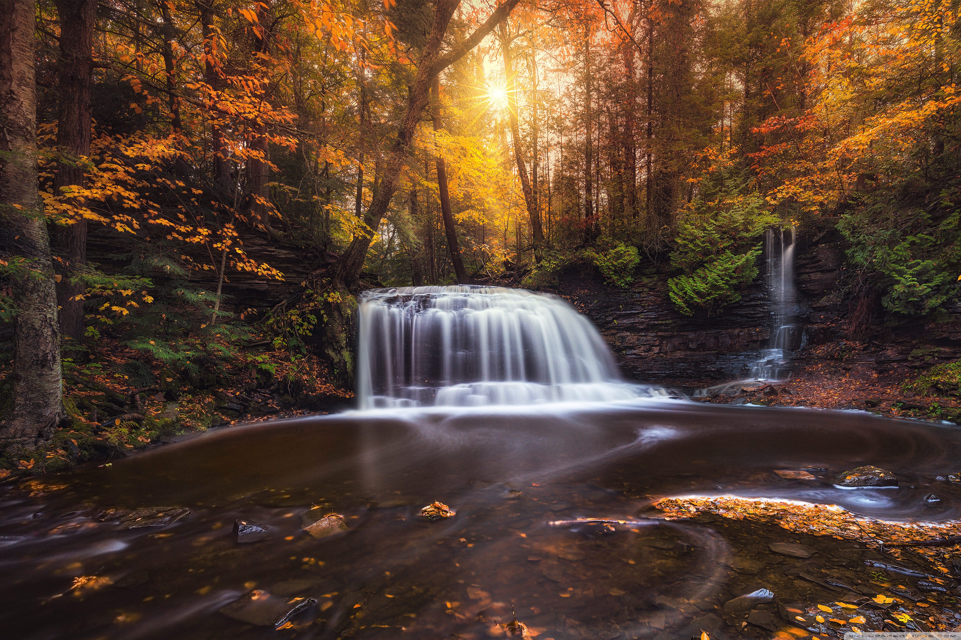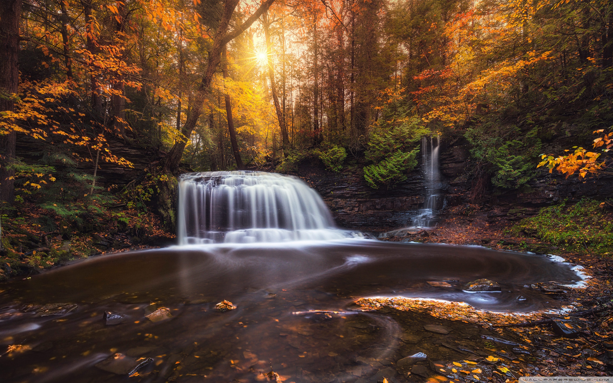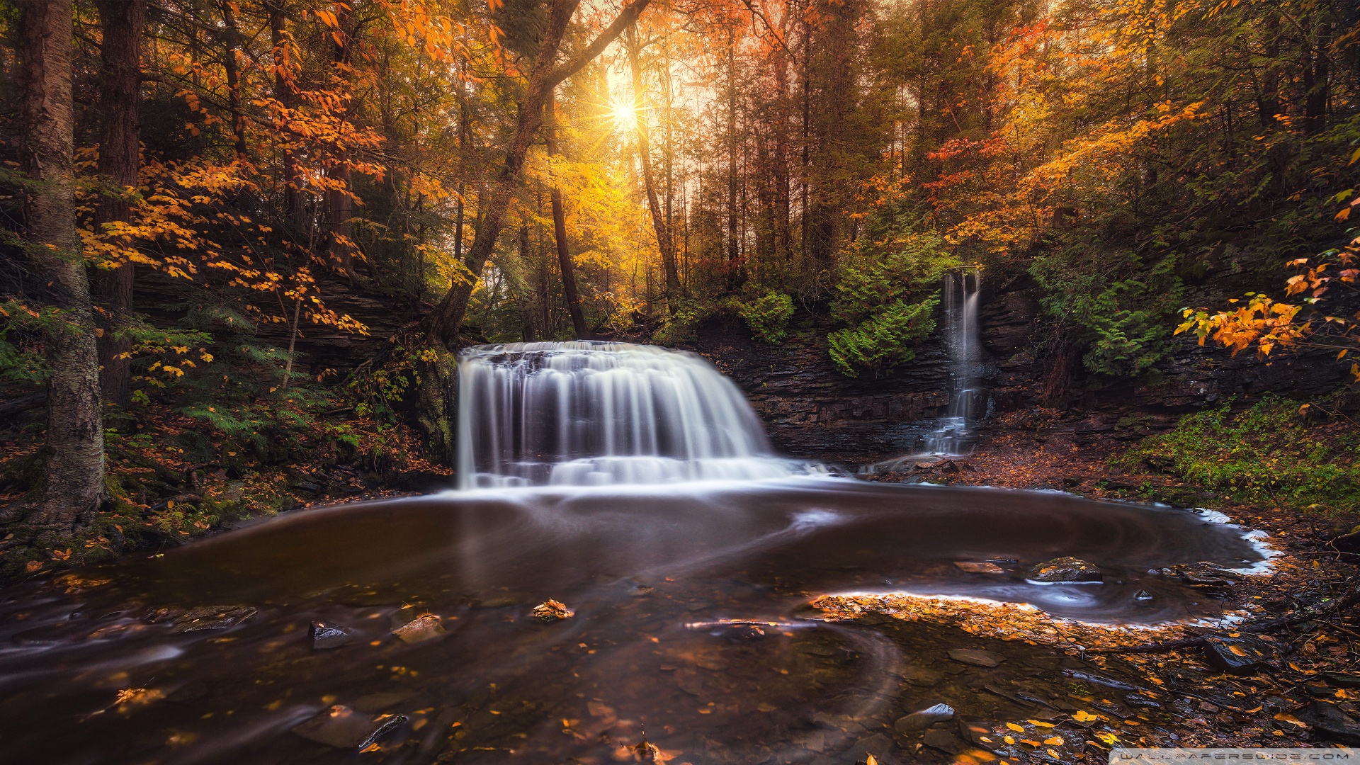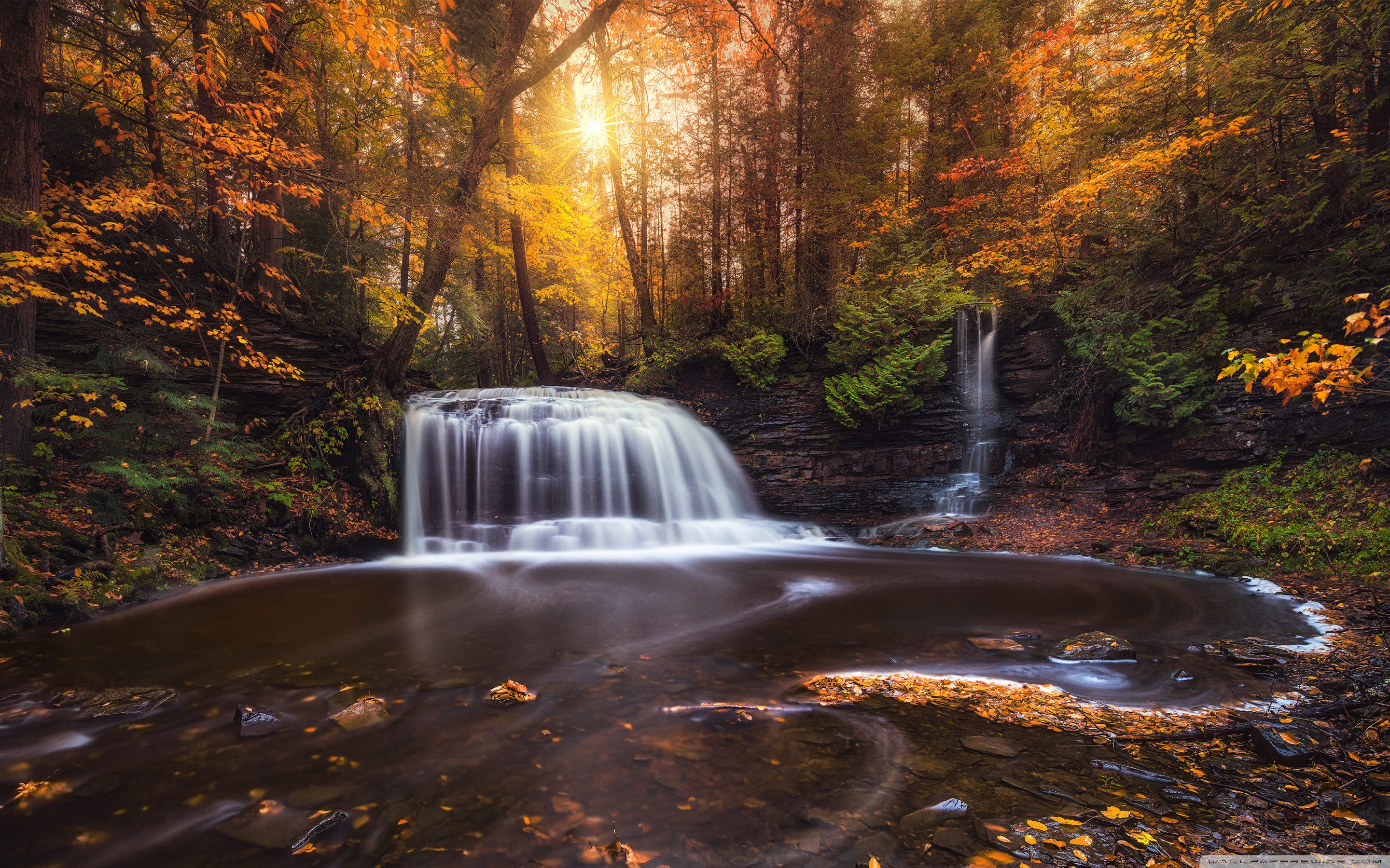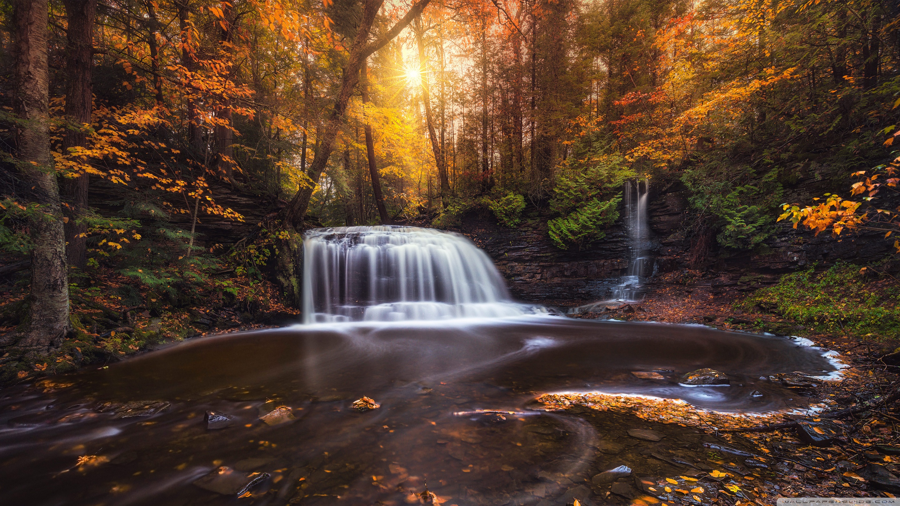 Download Forest Waterfall on a Sunny Autumn Day 4K UHD Wallpaper