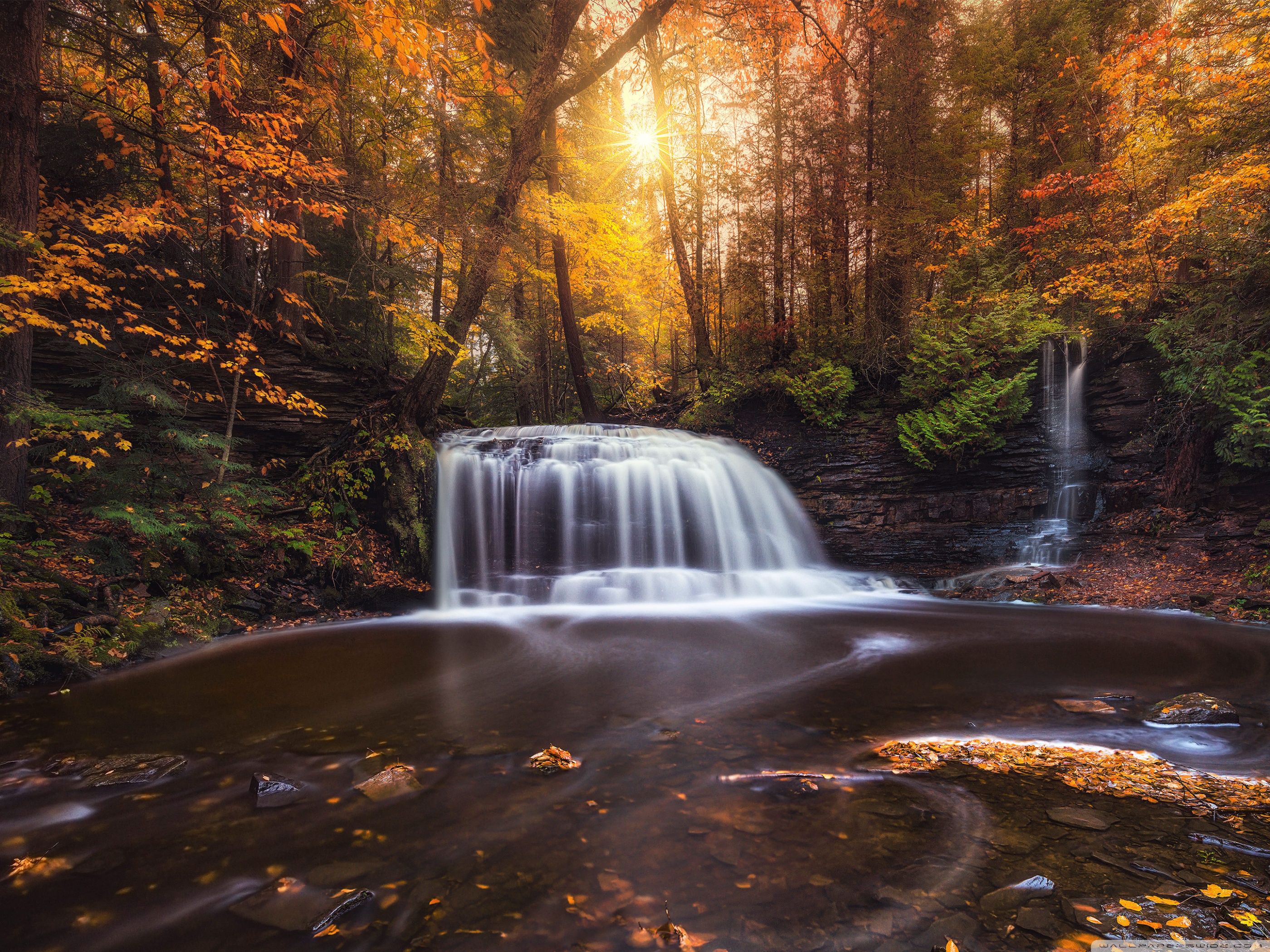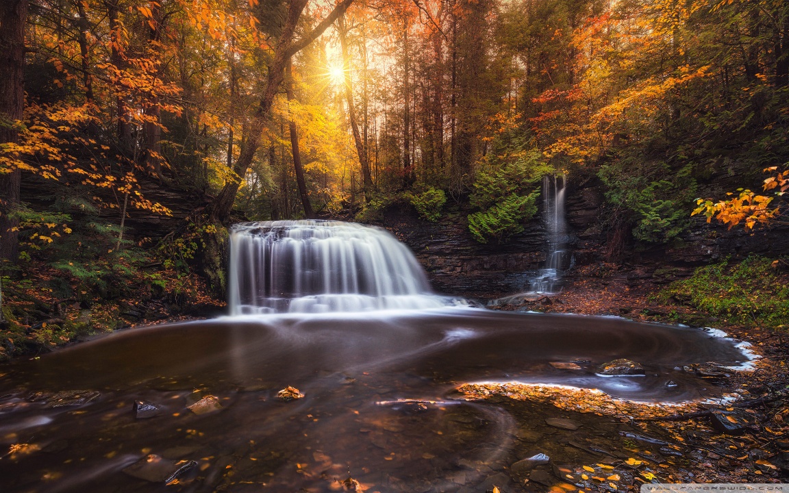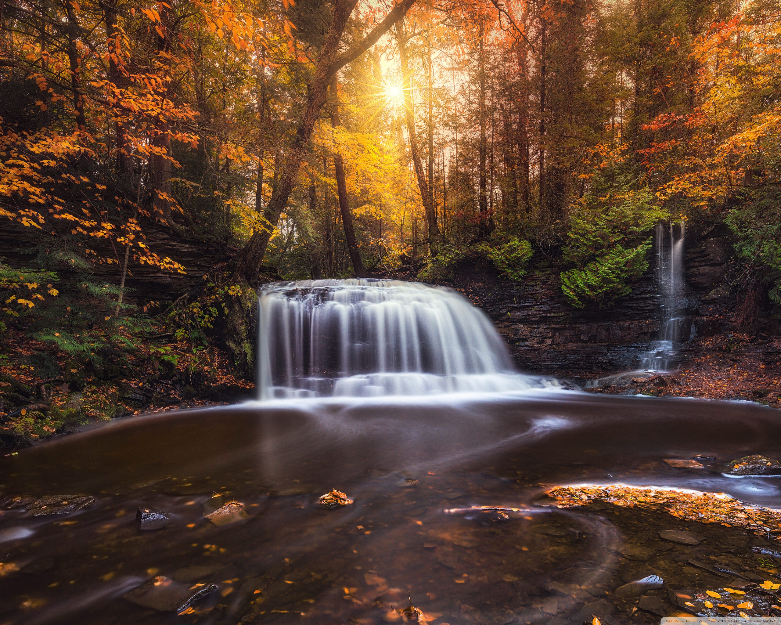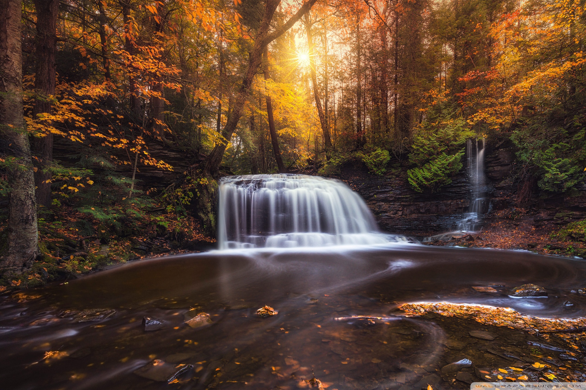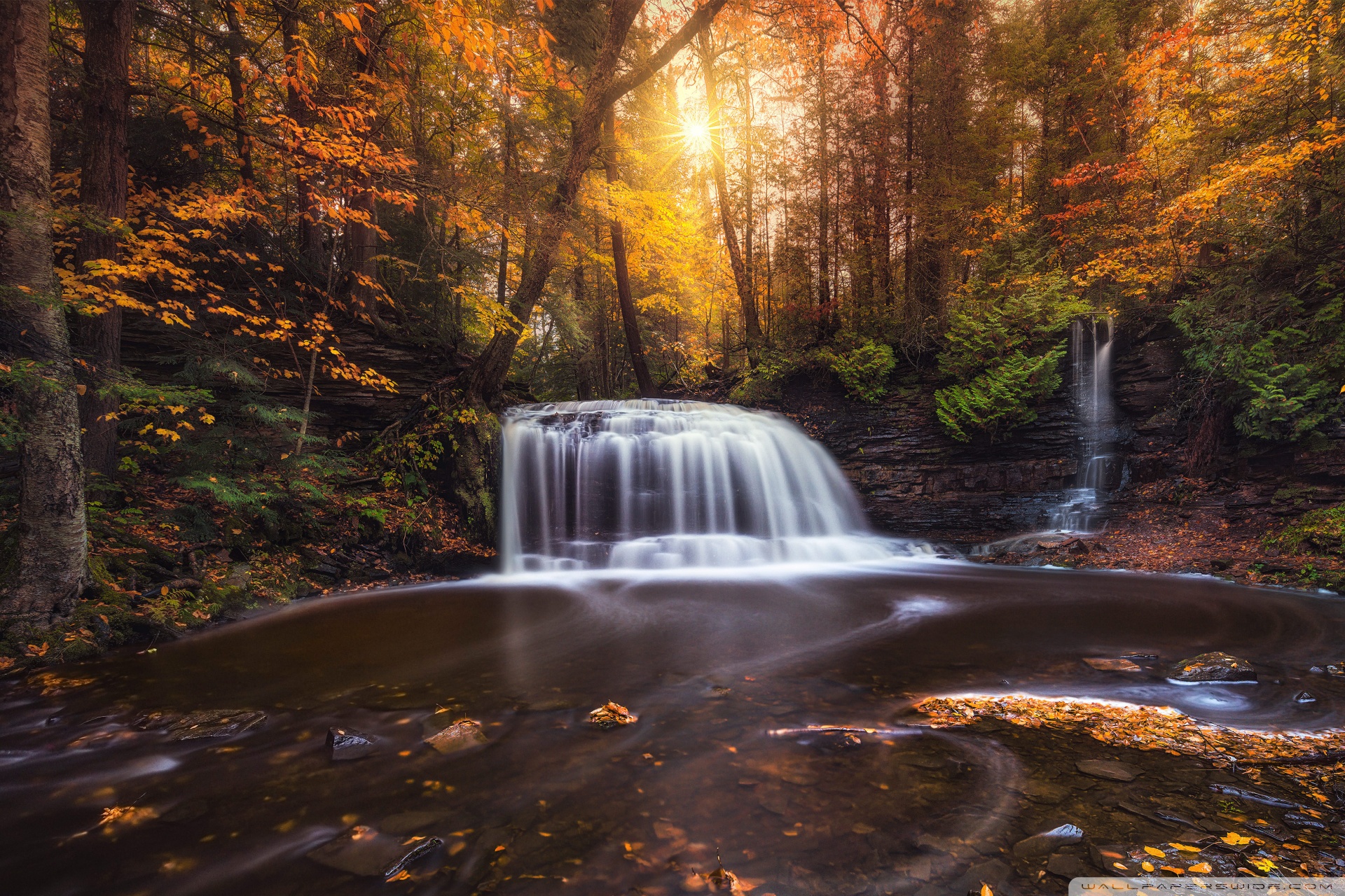 Download Forest Waterfall on a Sunny Autumn Day 4K UHD Wallpaper